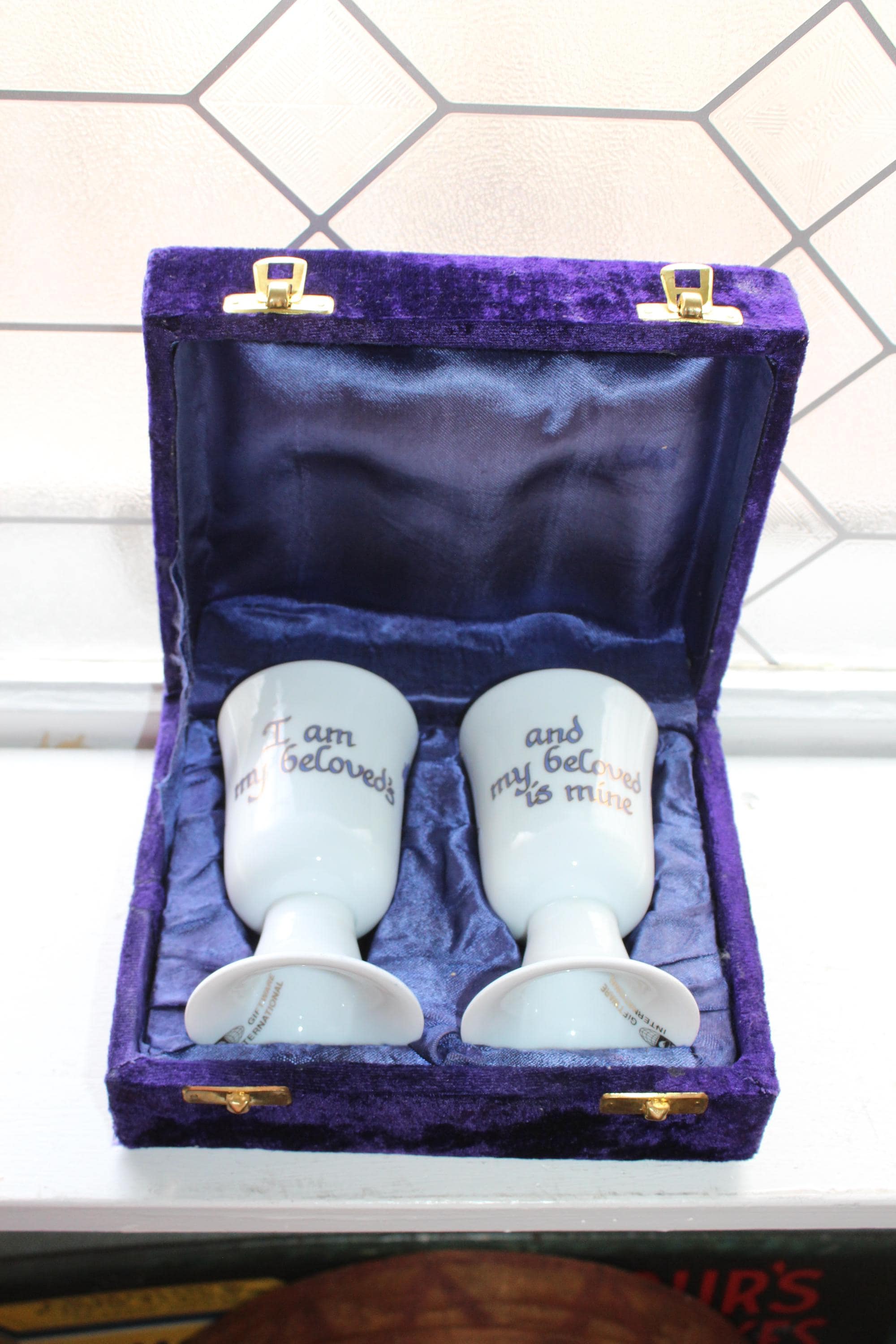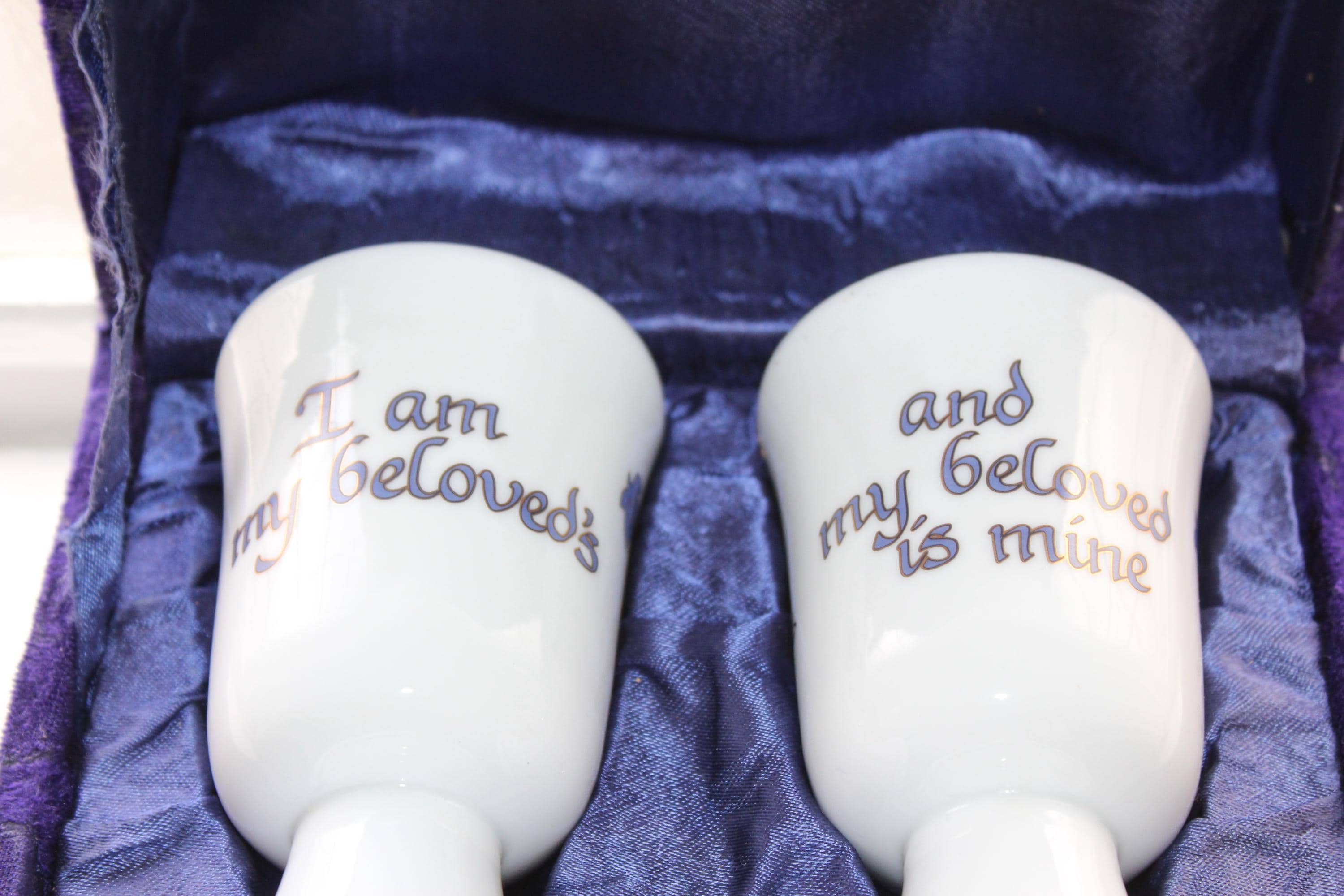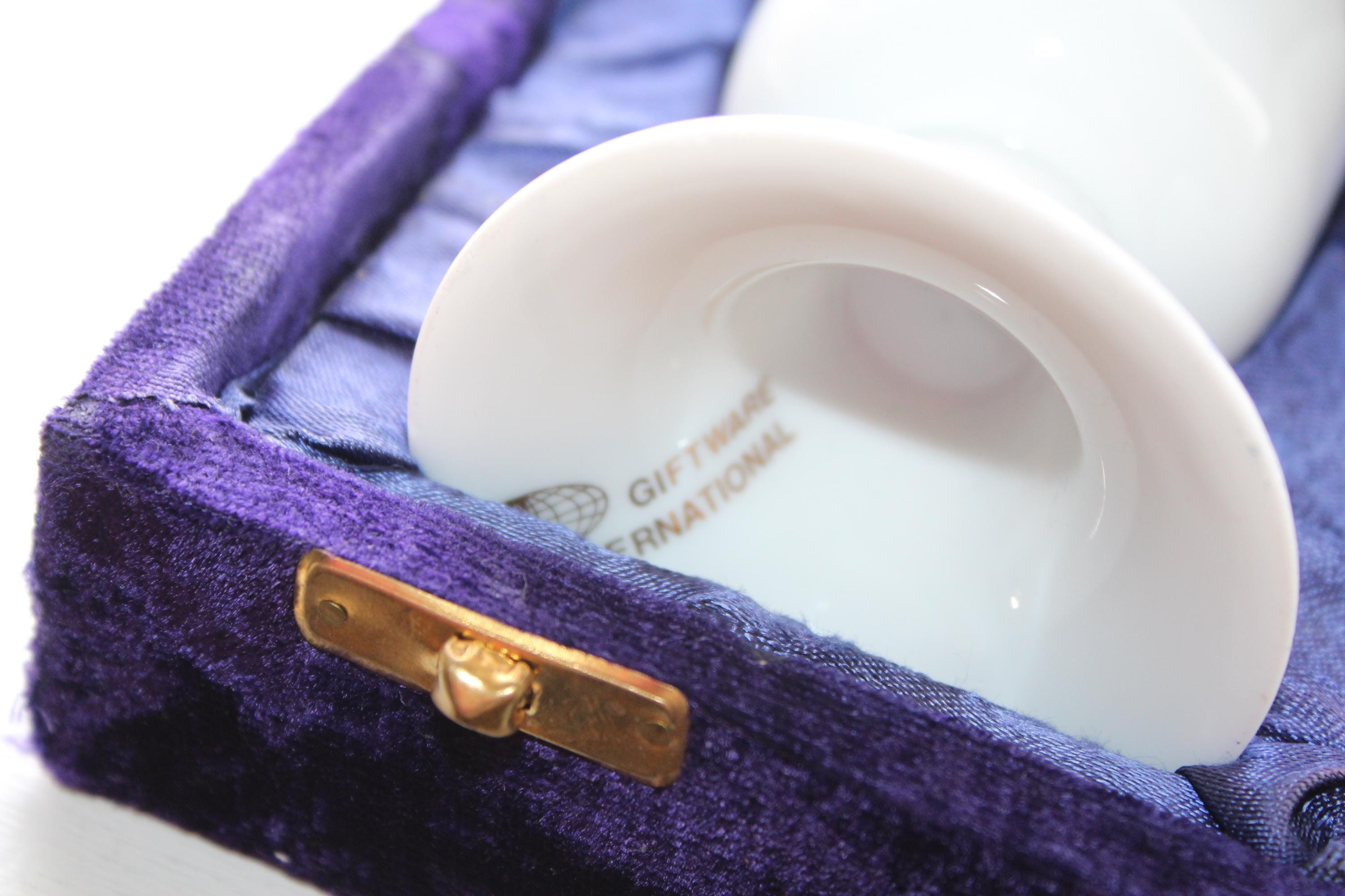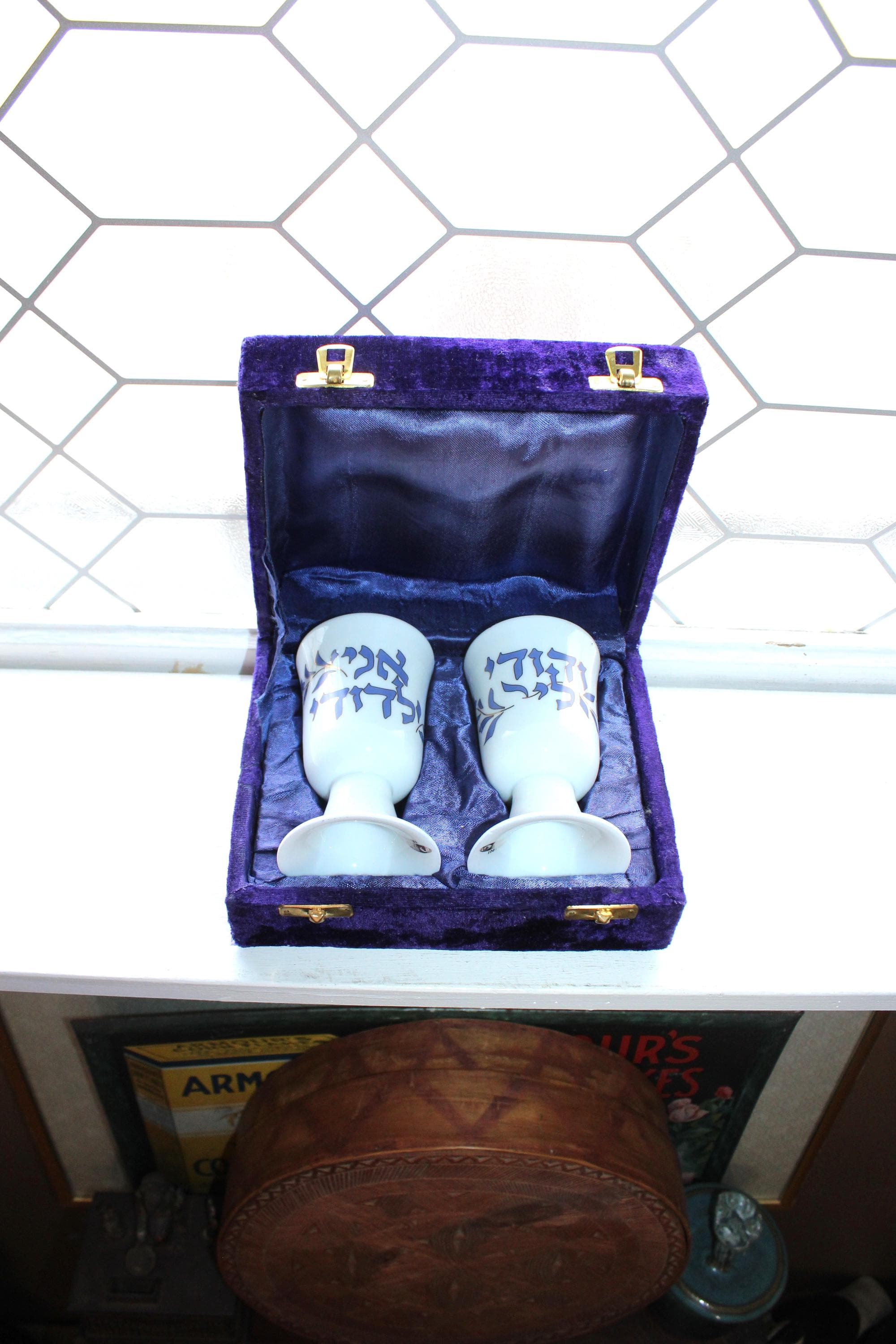 Vintage Jewish porcelain Kiddush cups pair in purple velvet presentation box, in excellent condition. They are decorated with Hebrew script, featuring the phrase "Ani L'dodi V'dodi Li," which translates to "I am my beloved's and my beloved is mine". The cups are presented in a velvet-lined purple case. Each cup measures 4 3/4" high. L'chaim!
