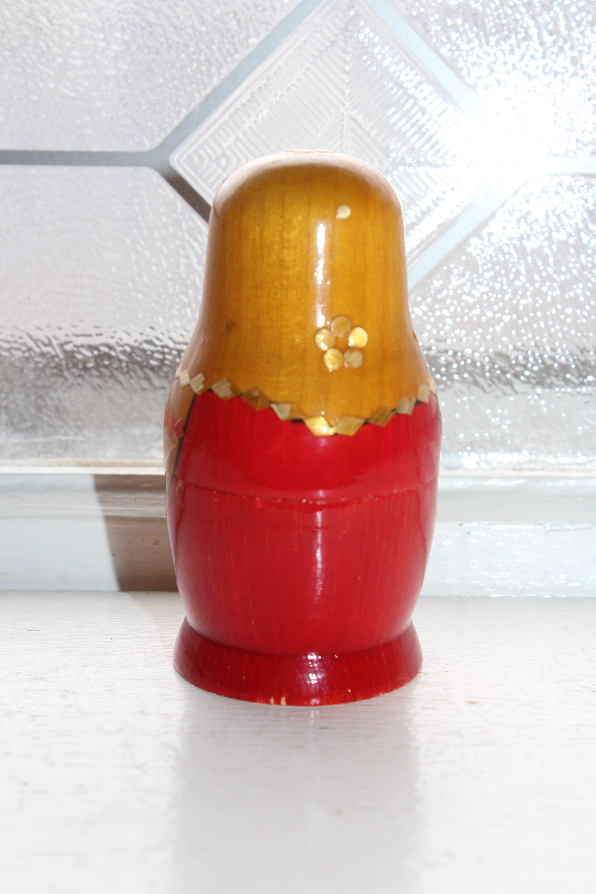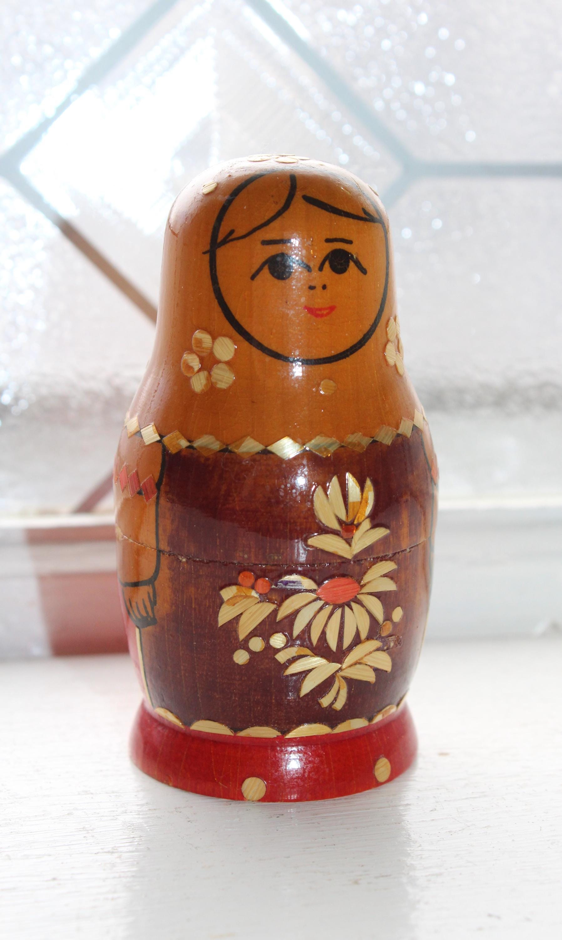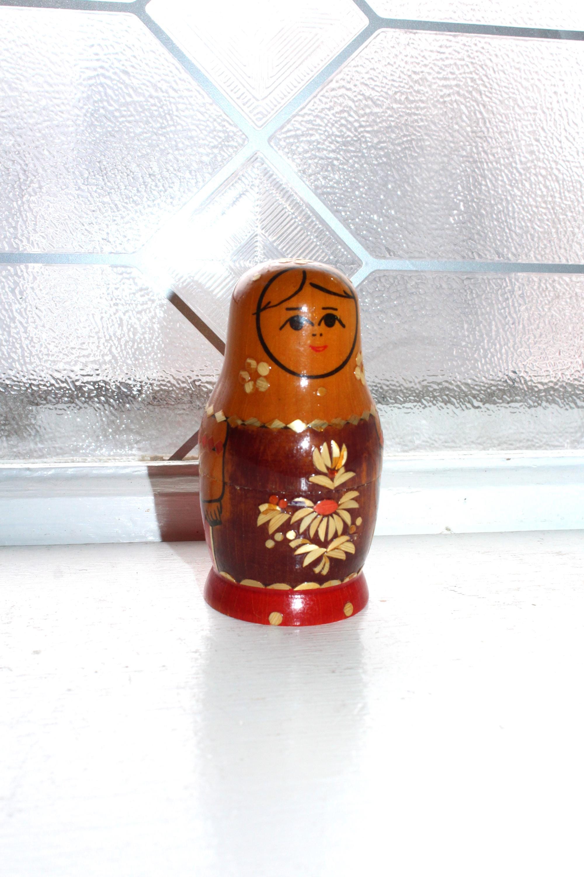 Vintage handmade 2 piece wooden Russian Matryoshka nesting doll. The largest doll measures 3 1/2" high. No damage, age appropriate light wear. Enjoy!