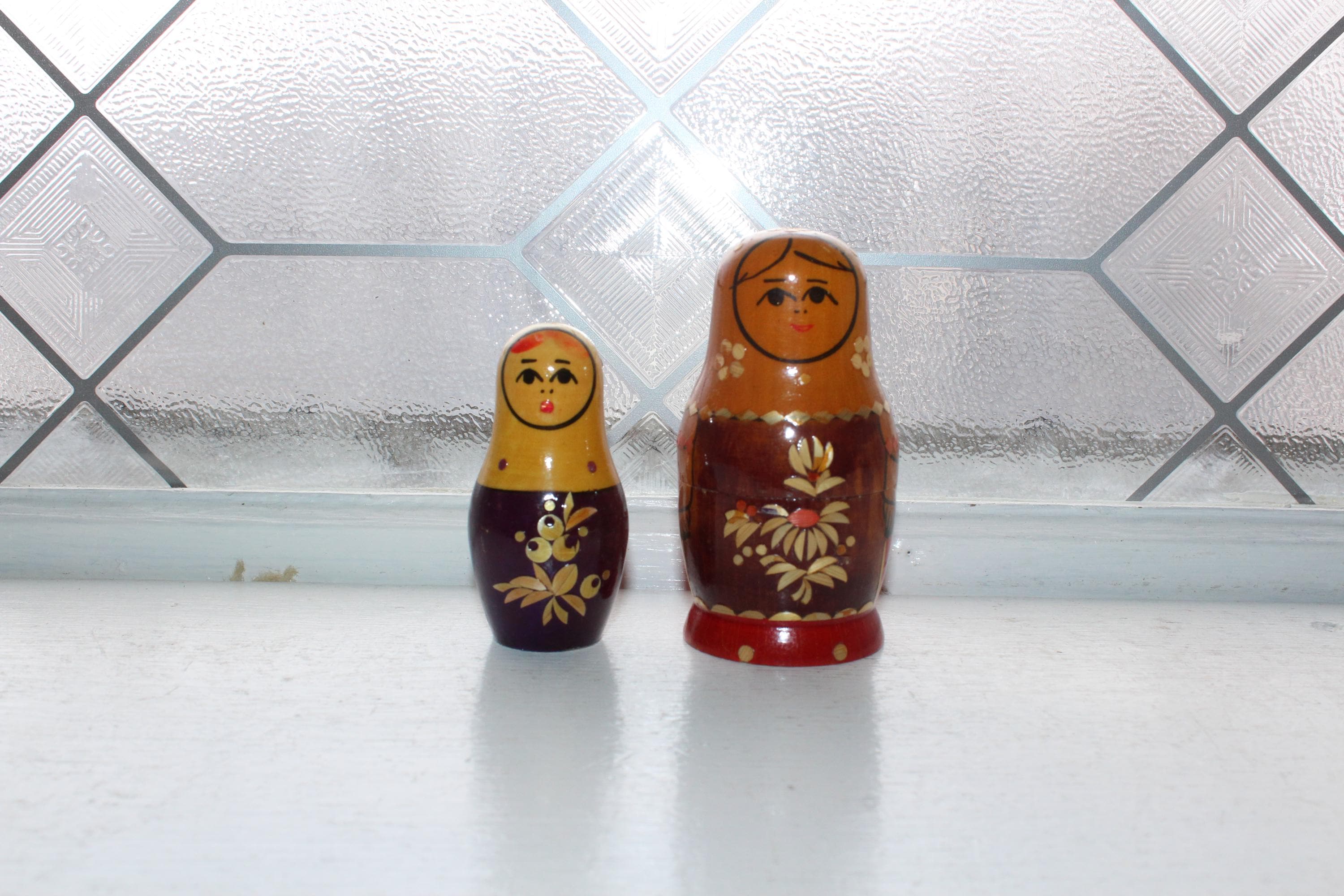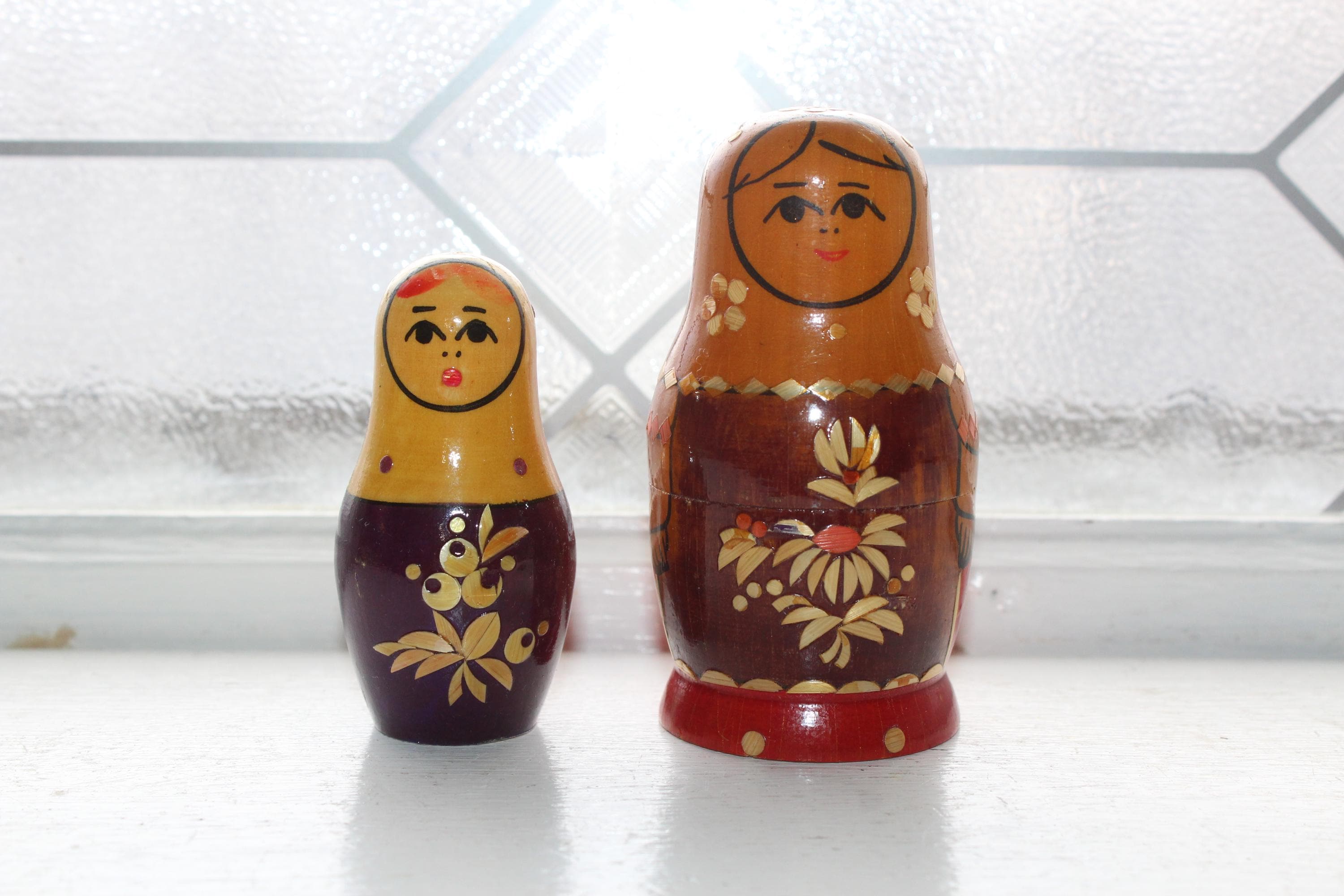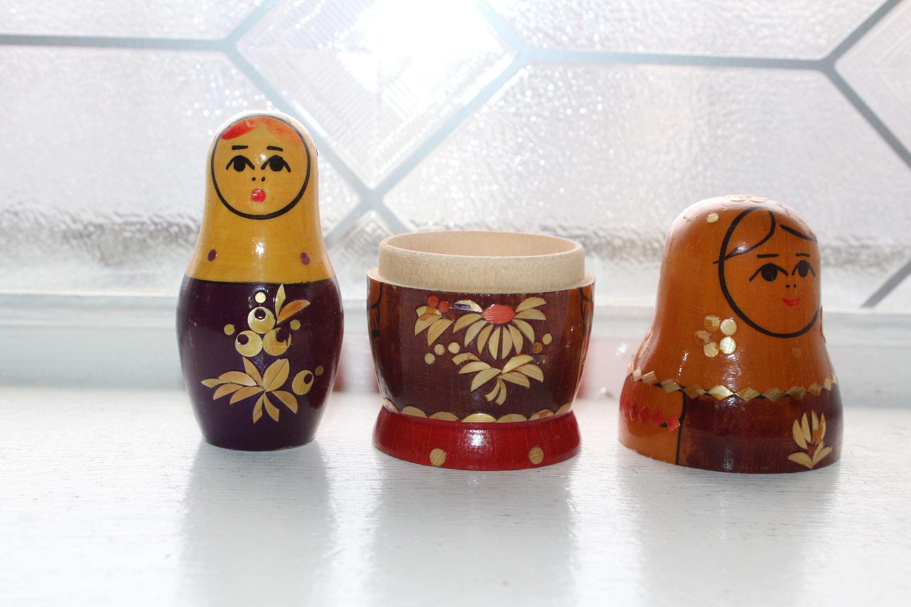 Vintage handmade 2 piece wooden Russian Matryoshka nesting doll. The largest doll measures 3 1/2" high. No damage, age appropriate light wear. Enjoy!