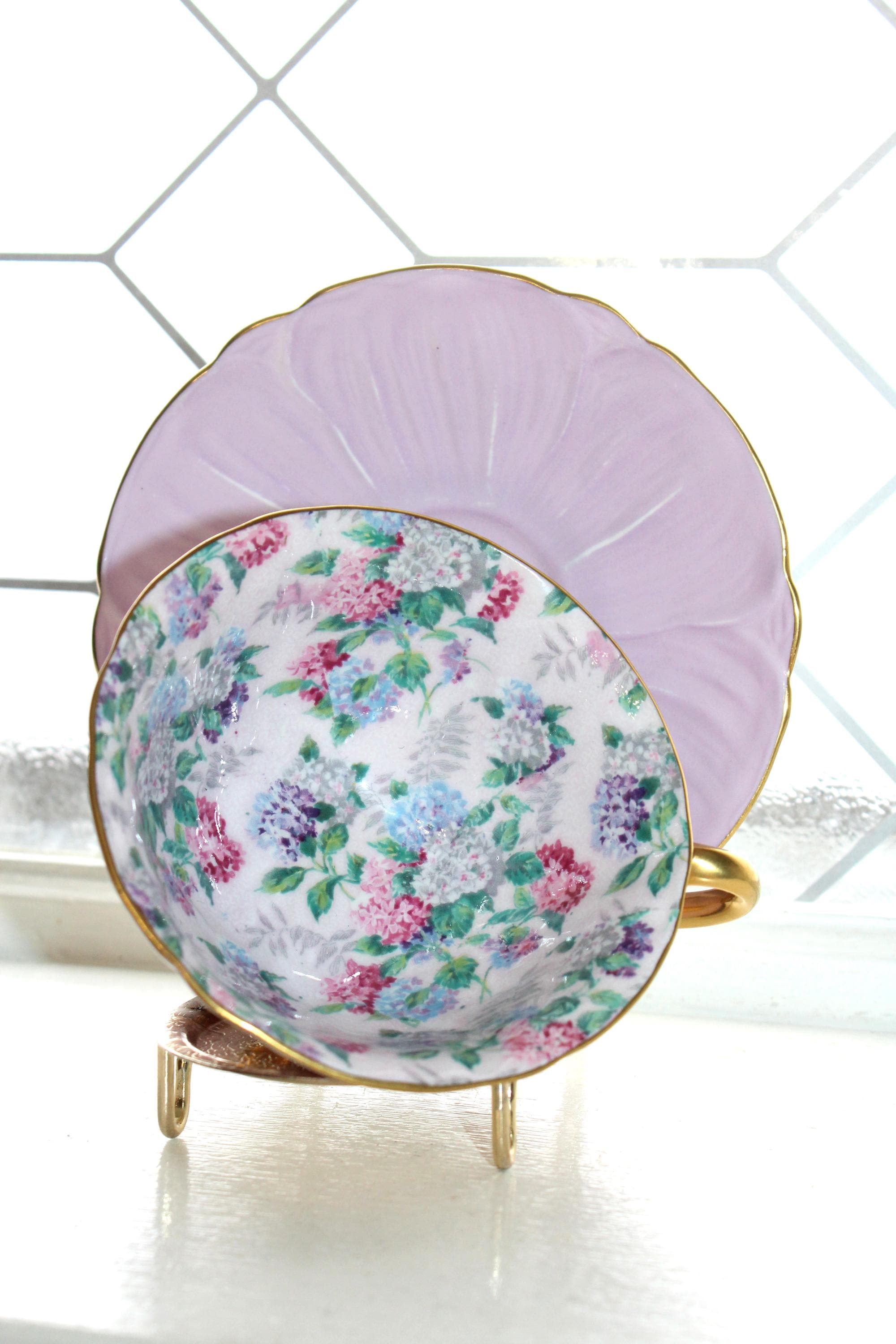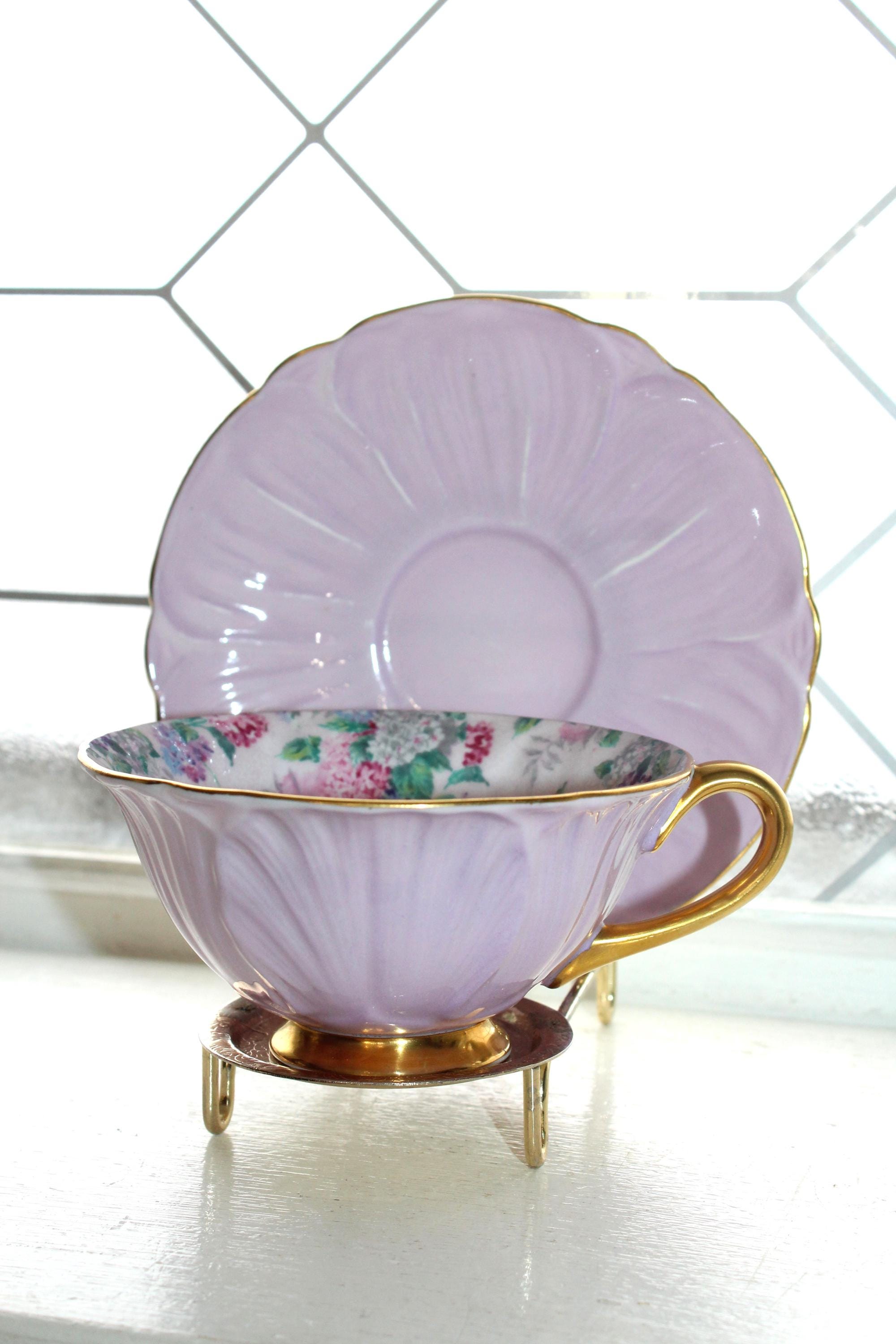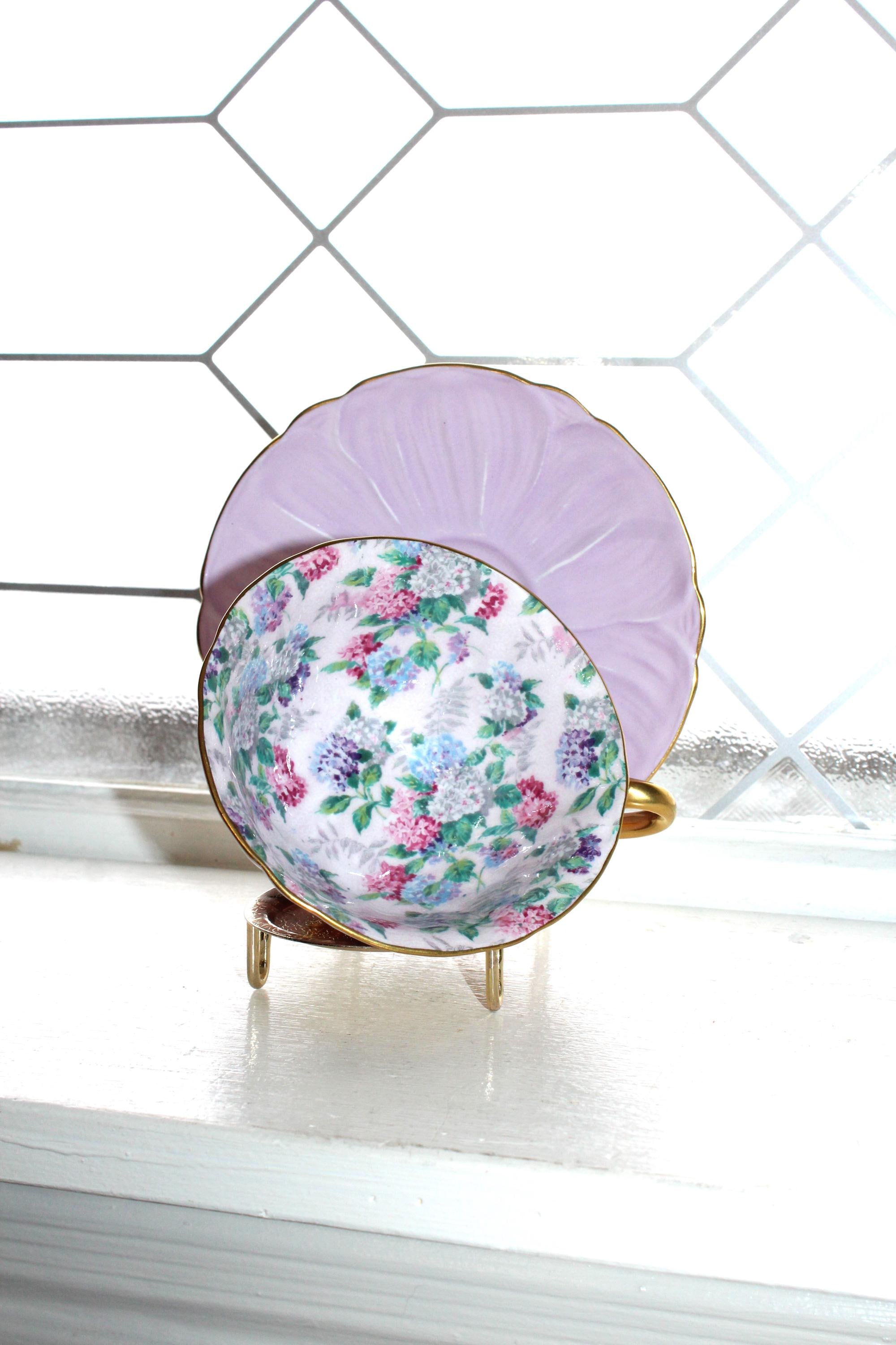 Vintage Shelley bone china teacup and saucer in the lilac Summer Glory chintz pattern, Oleander shape, in good condition. The cup measures 4 1/4" wide x 2" high and the saucer measures 5 1/2" wide. No chips or cracks but he saucer has light wear as shown in the photos, great for use or display. Enjoy!