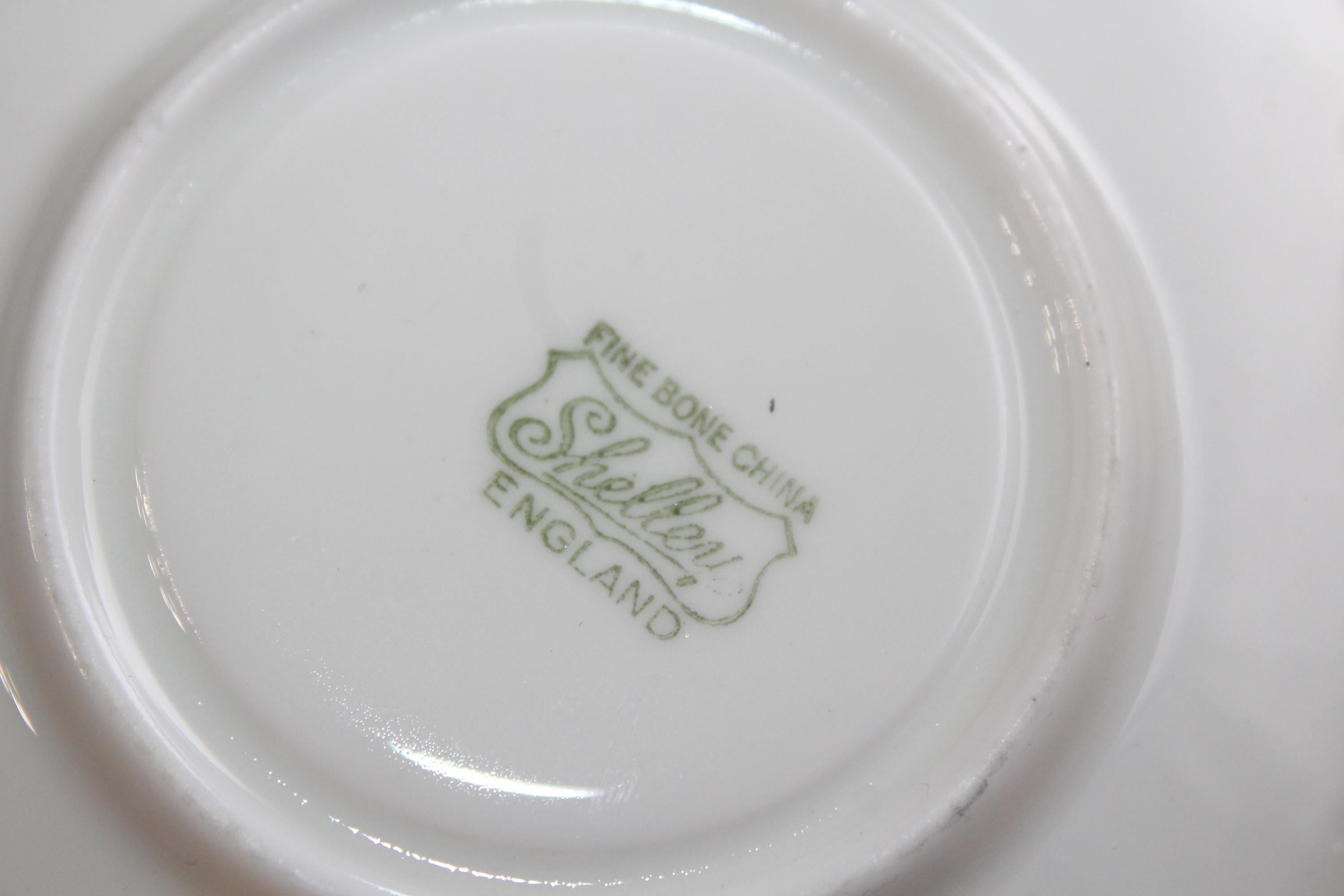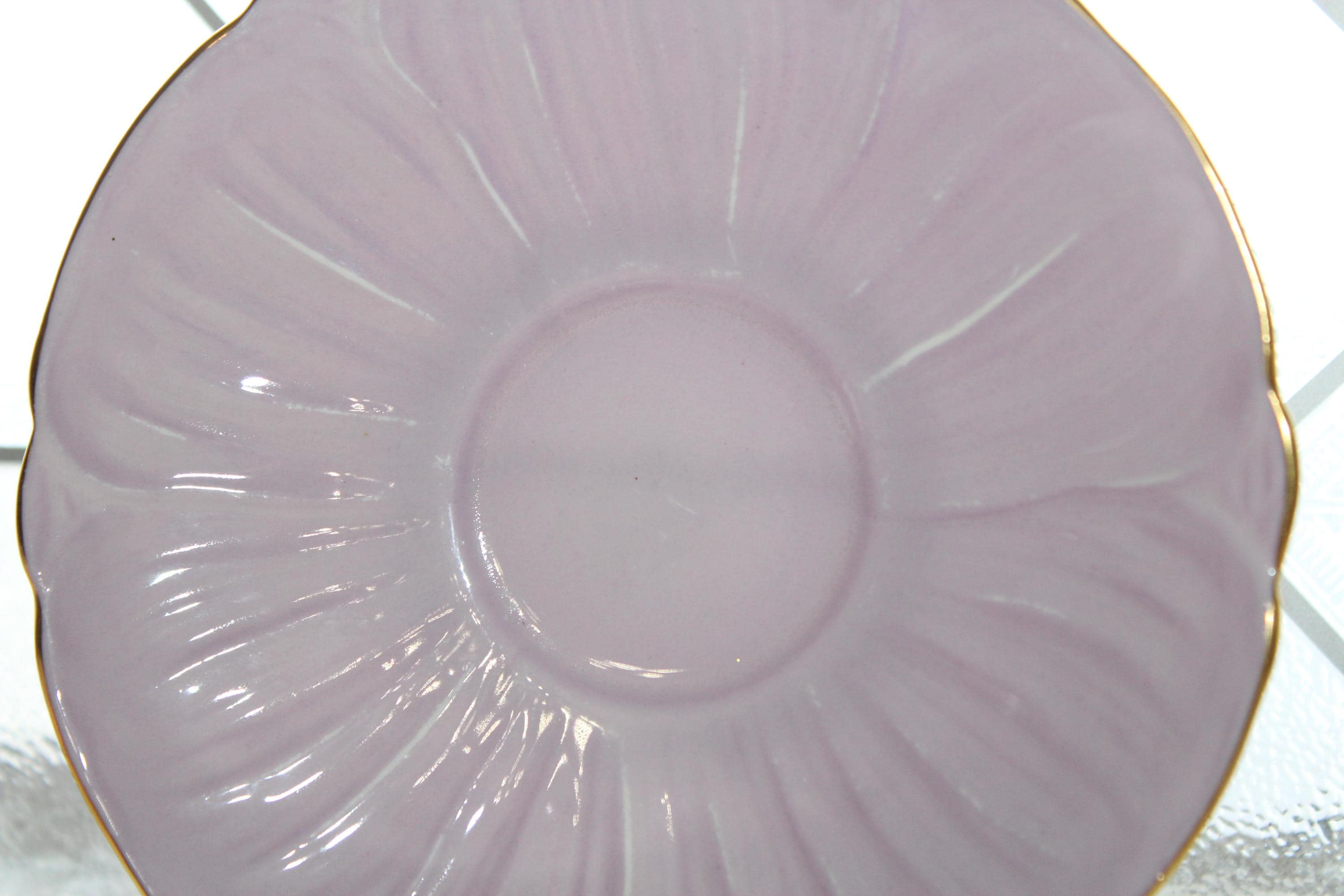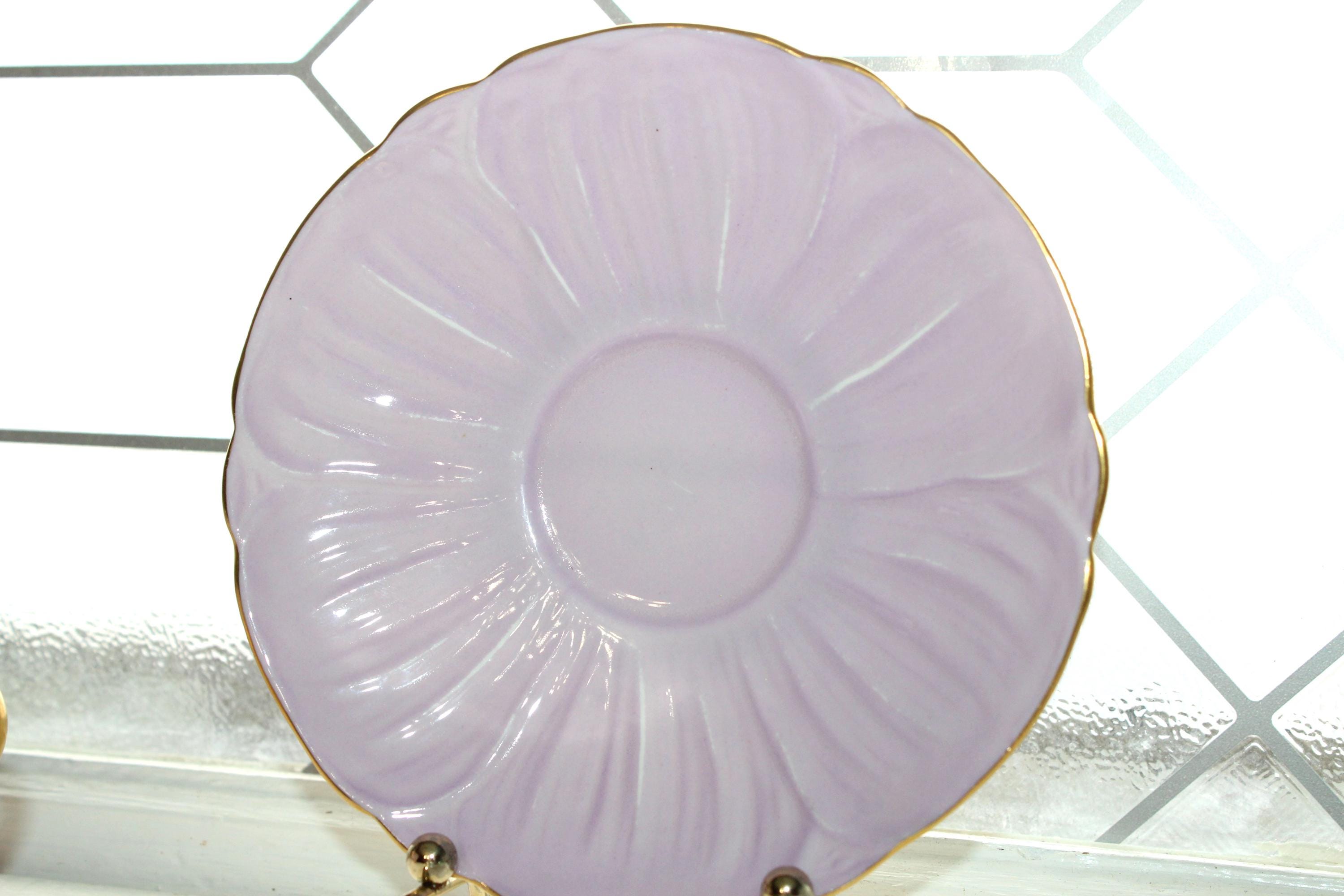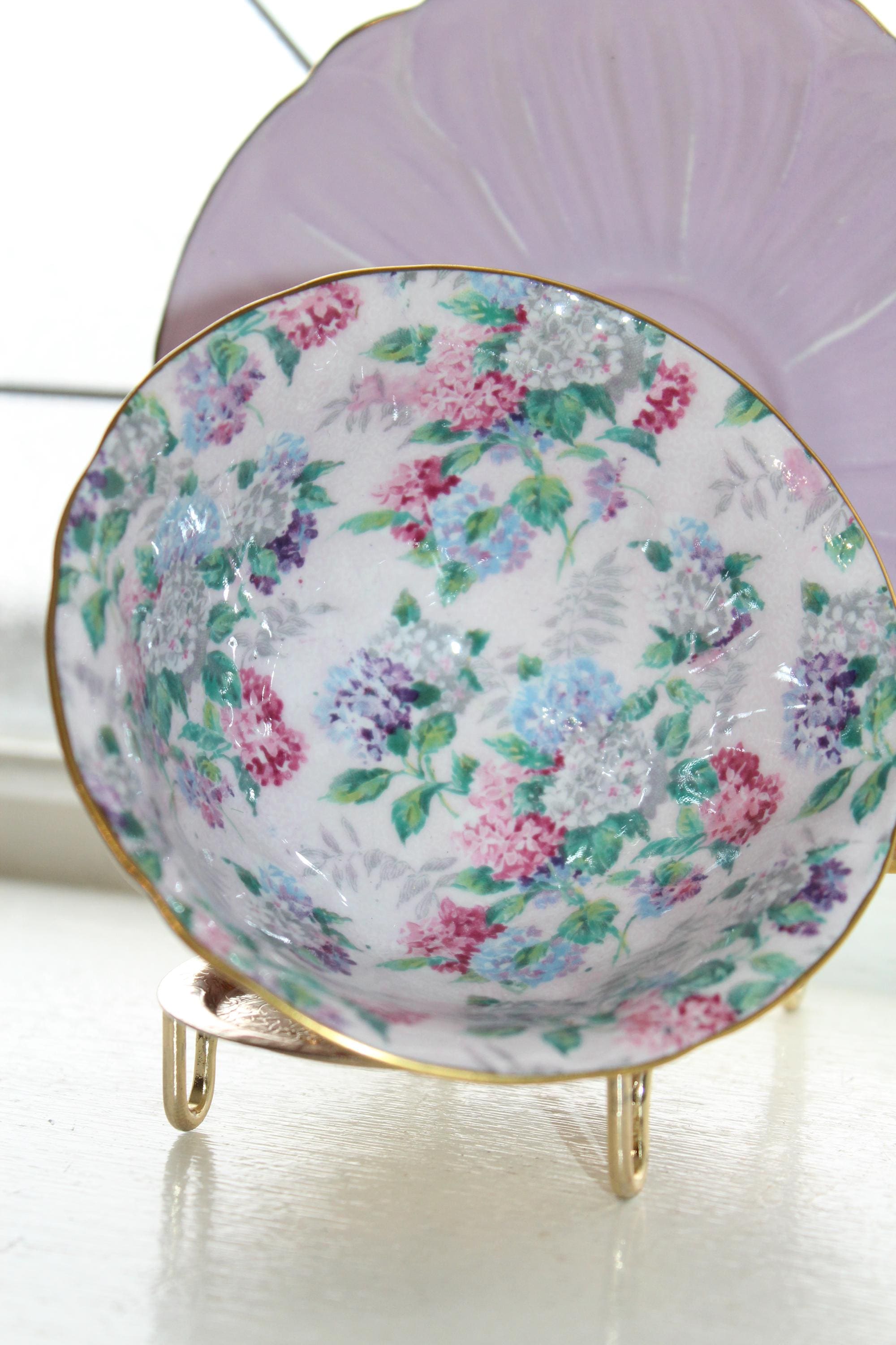 Vintage Shelley bone china teacup and saucer in the lilac Summer Glory chintz pattern, Oleander shape, in good condition. The cup measures 4 1/4" wide x 2" high and the saucer measures 5 1/2" wide. No chips or cracks but he saucer has light wear as shown in the photos, great for use or display. Enjoy!