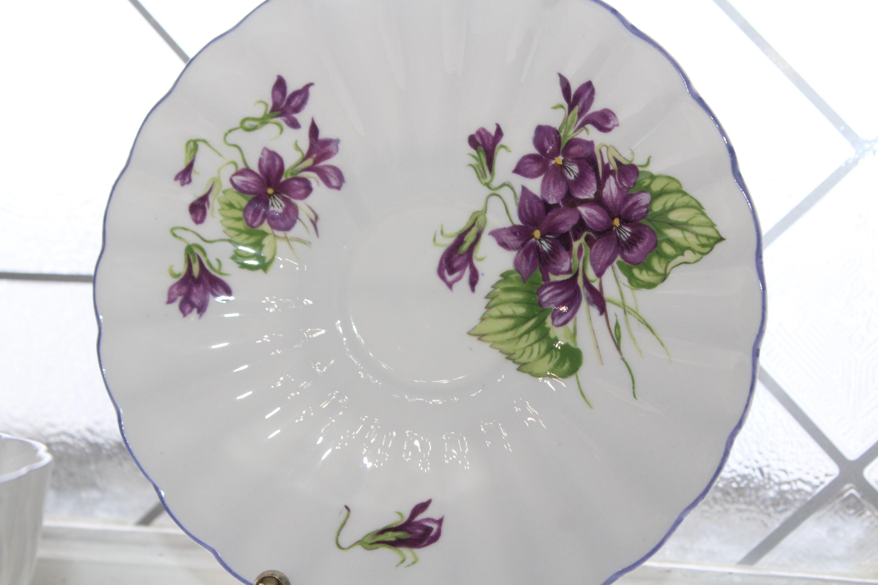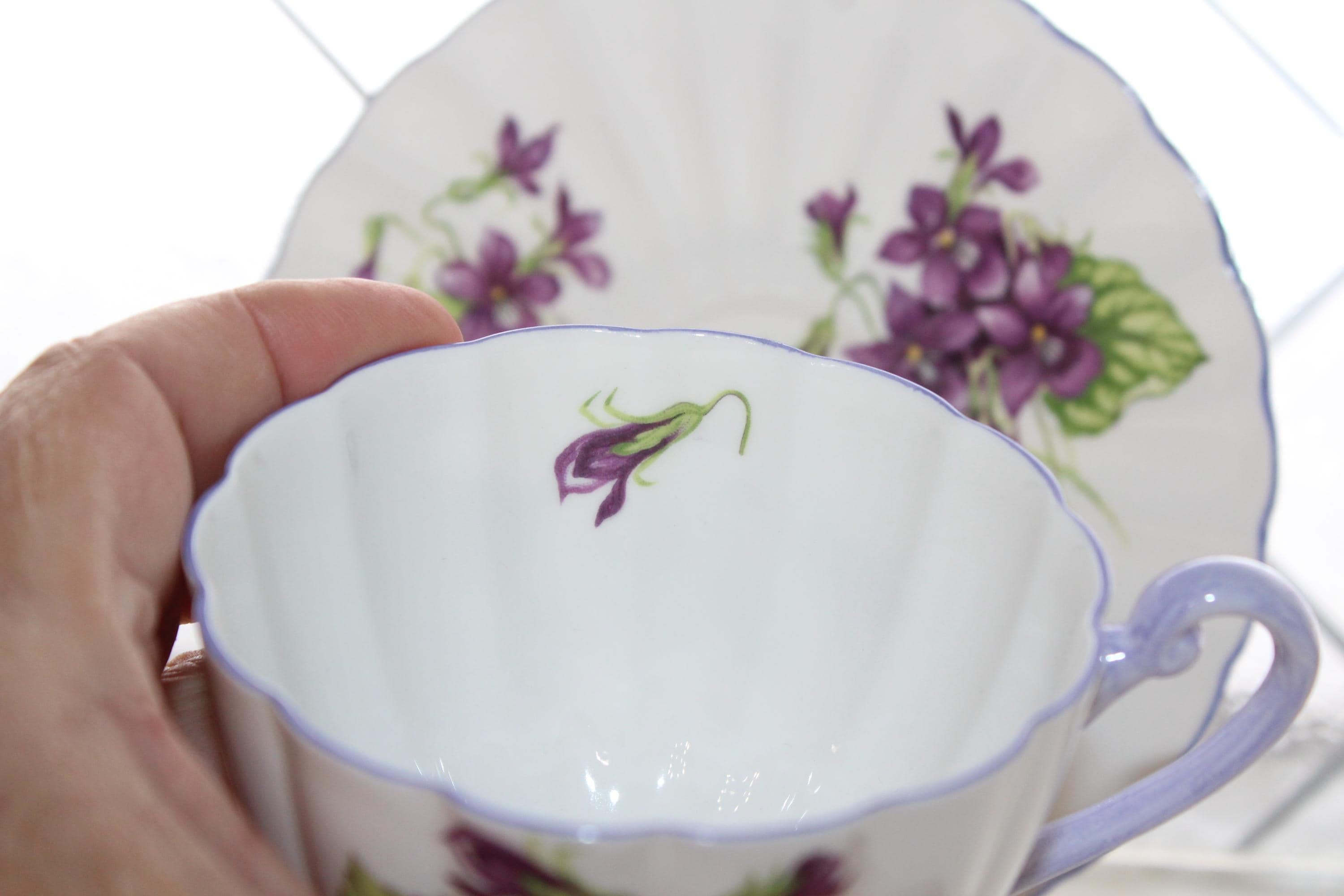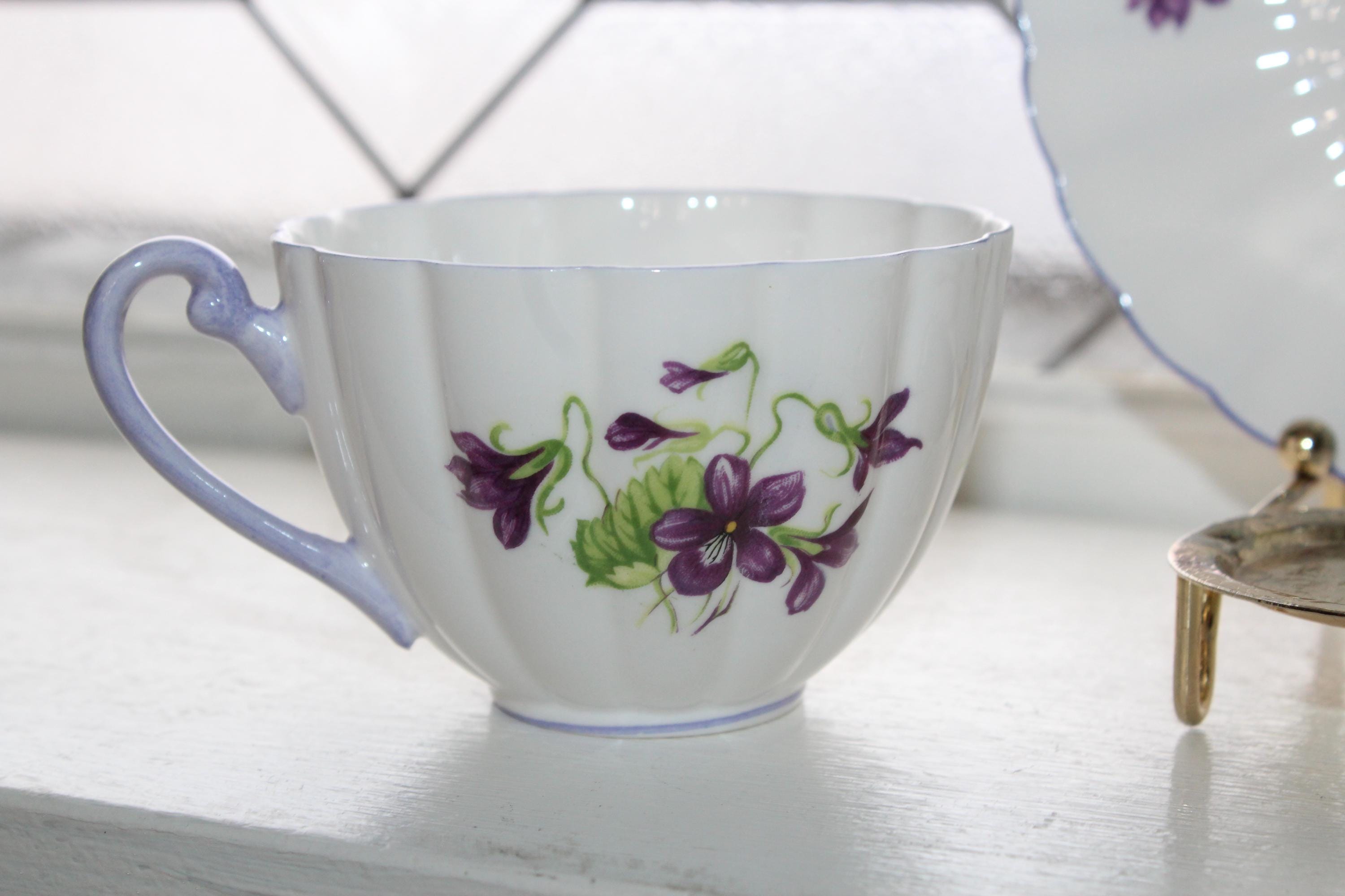 Vintage Shelley bone china teacup and saucer in the Ludlow shape Violets pattern, in excellent condition. The cup measures 3 1/2" wide x 2 1/4" high and the saucer measures 5 5/8" wide. No chips or cracks, perfect for use or display. Enjoy!