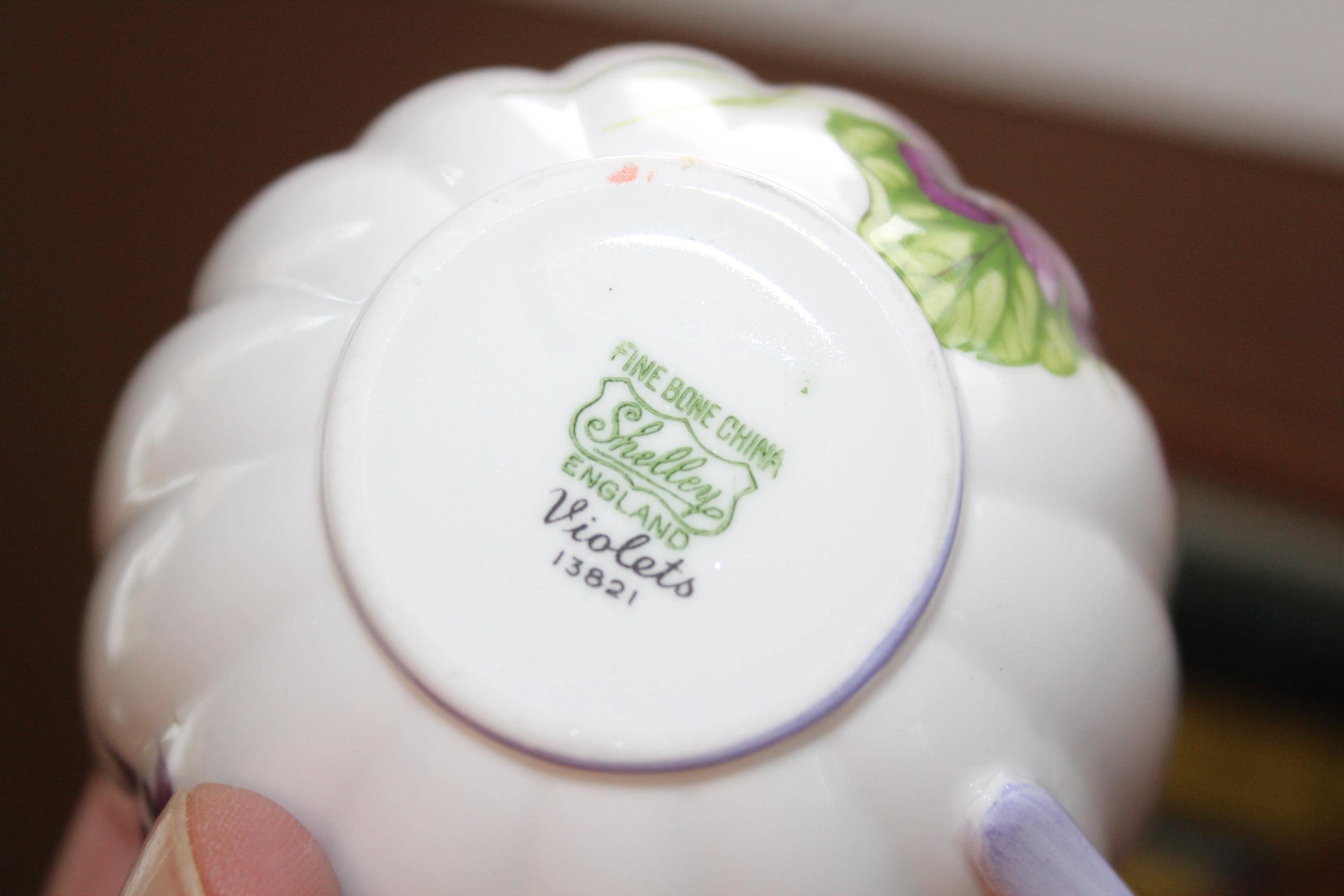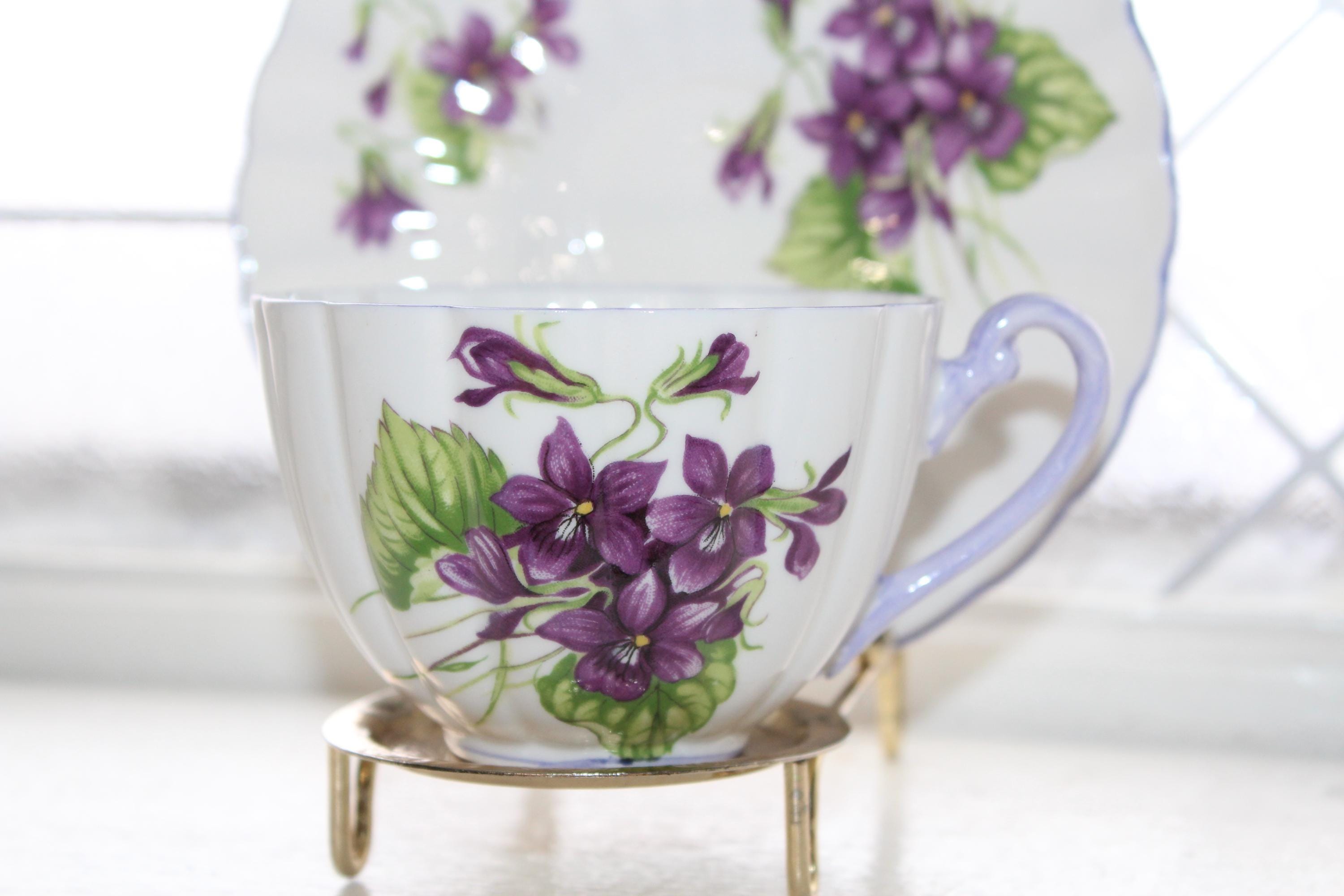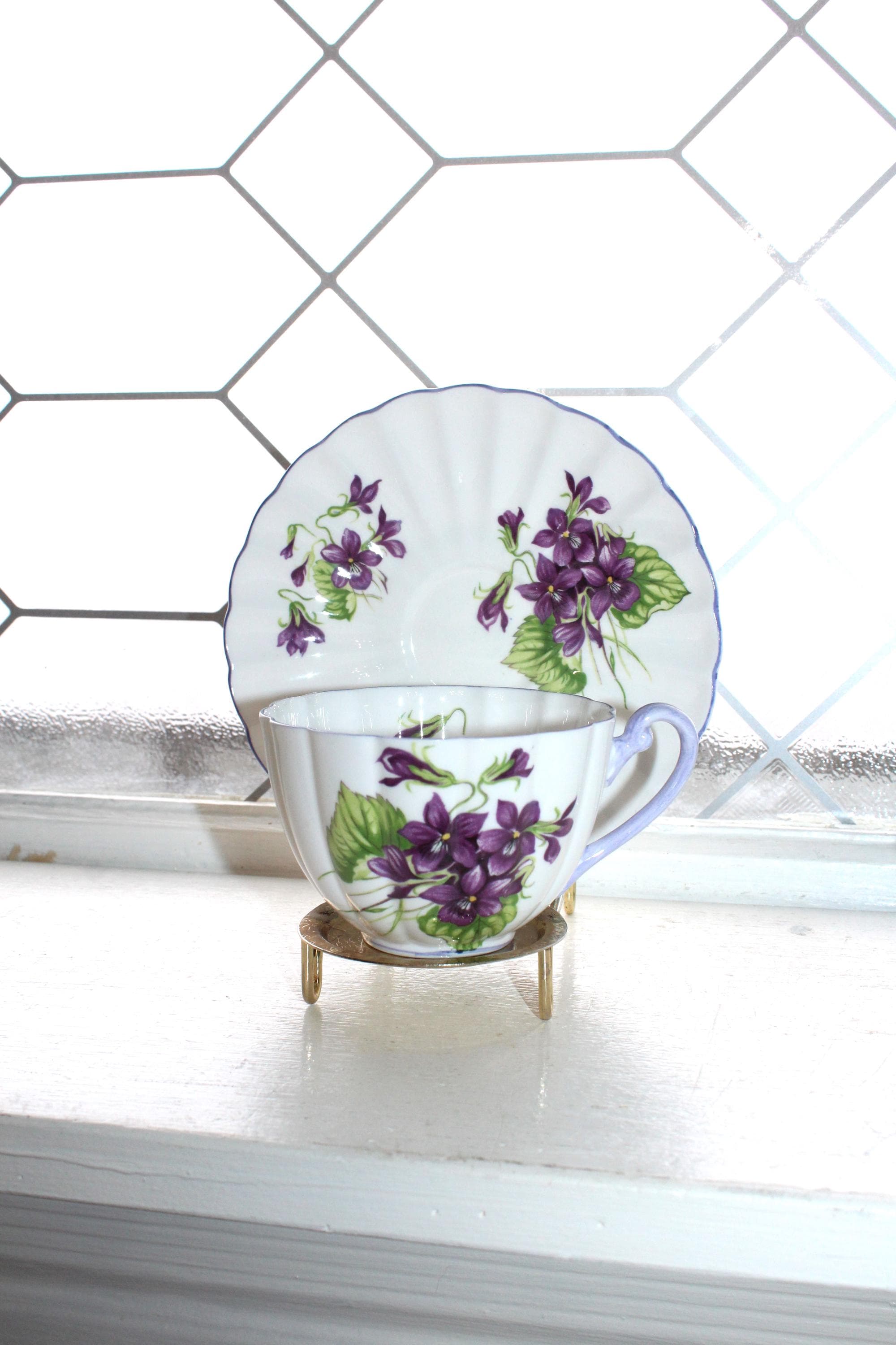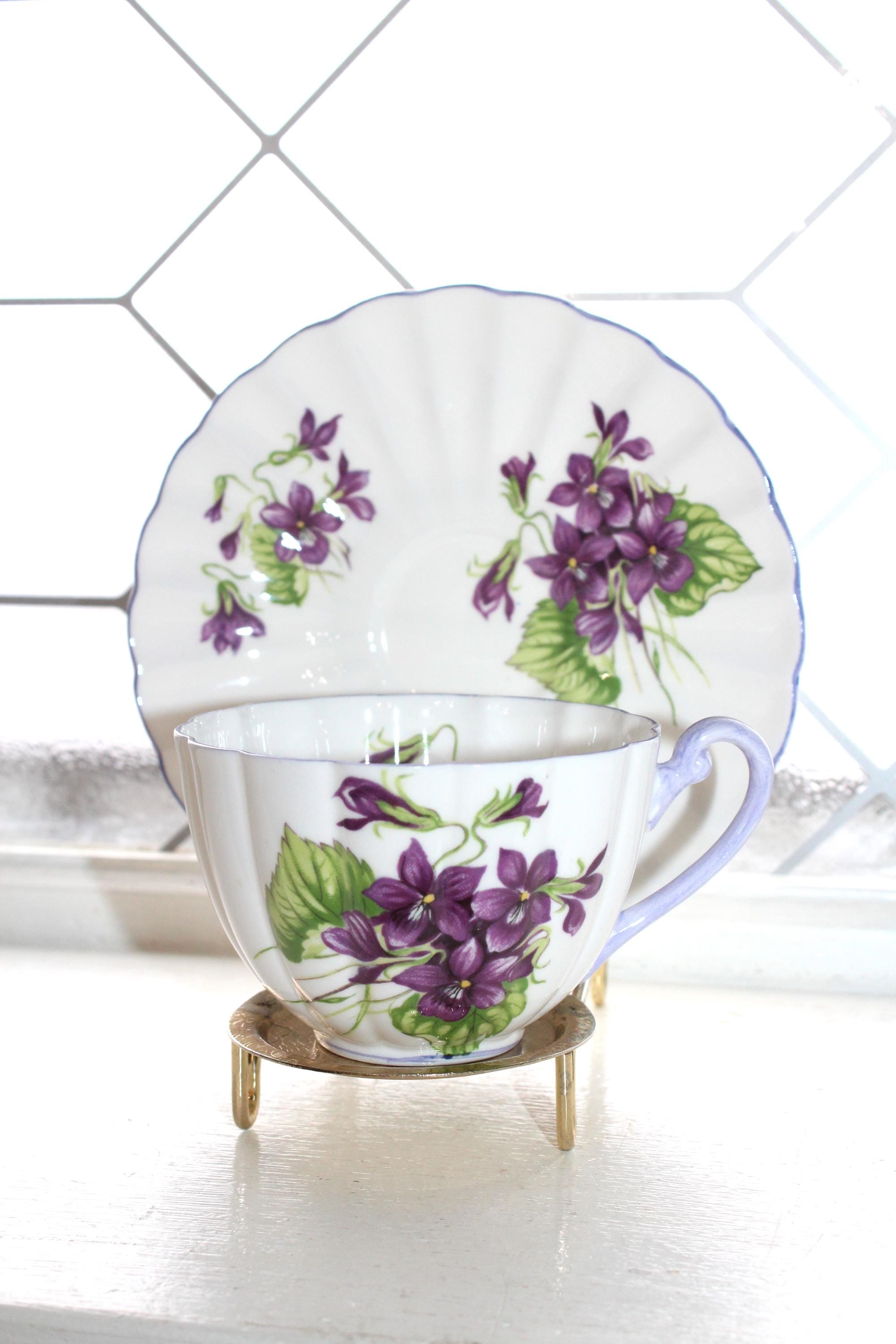 Vintage Shelley bone china teacup and saucer in the Ludlow shape Violets pattern, in excellent condition. The cup measures 3 1/2" wide x 2 1/4" high and the saucer measures 5 5/8" wide. No chips or cracks, perfect for use or display. Enjoy!