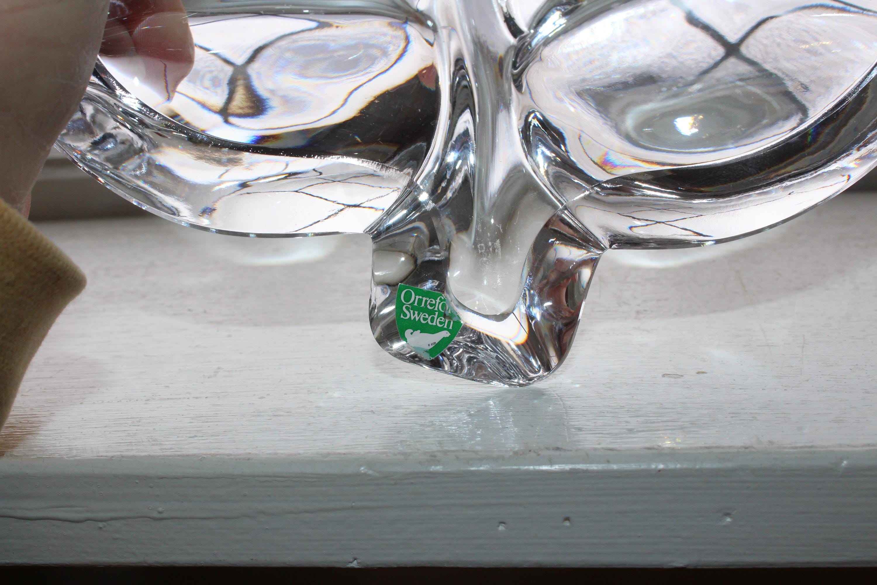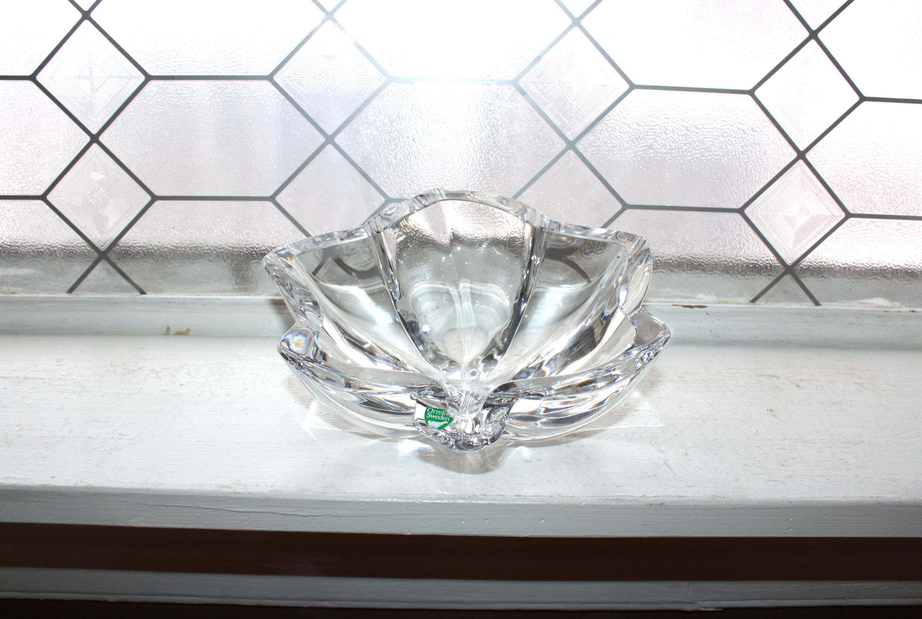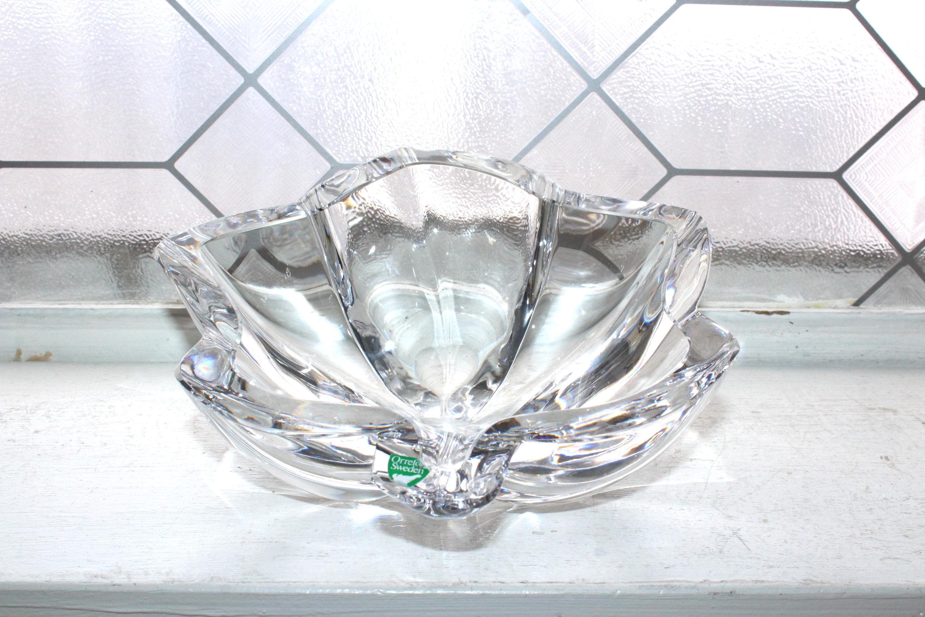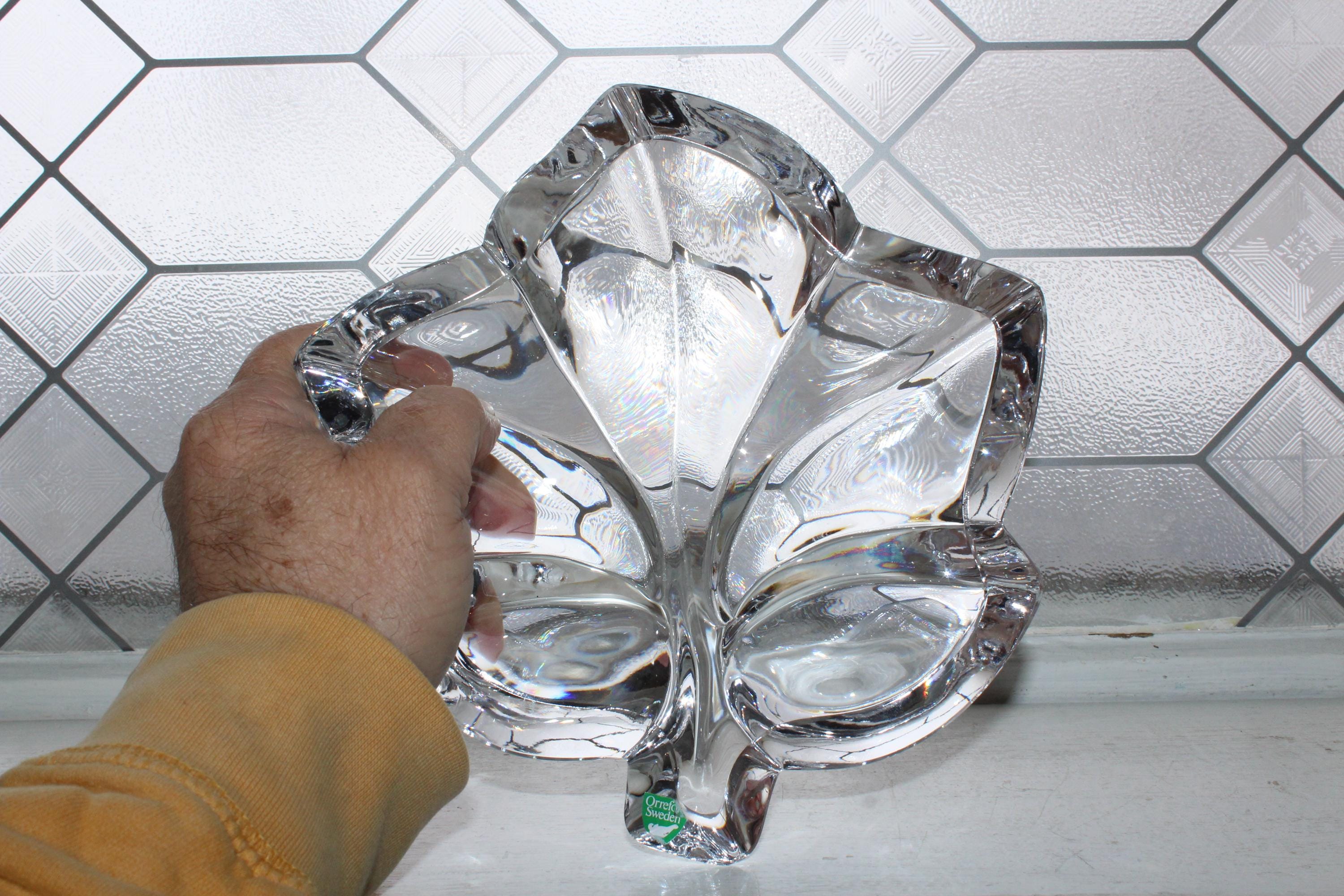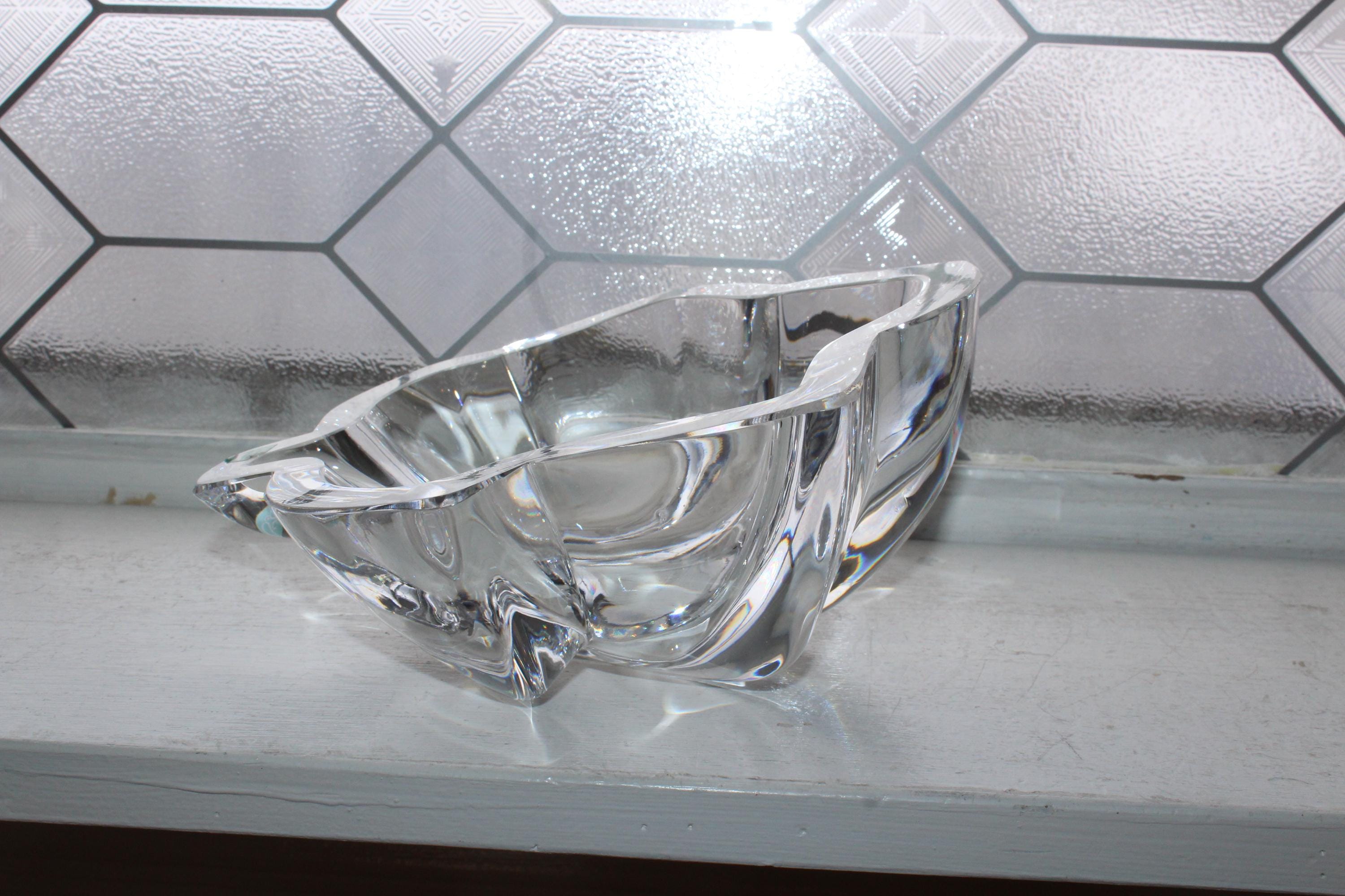 Beautiful Orrefors heavy crystal slanted maple leaf large bowl, in excellent condition. It measures 3 3/4" high x 8 1/8" wide and weighs 4 1/2 lbs. This Scandinavian beauty make a perfect gift or addition to a collection. Enjoy!
