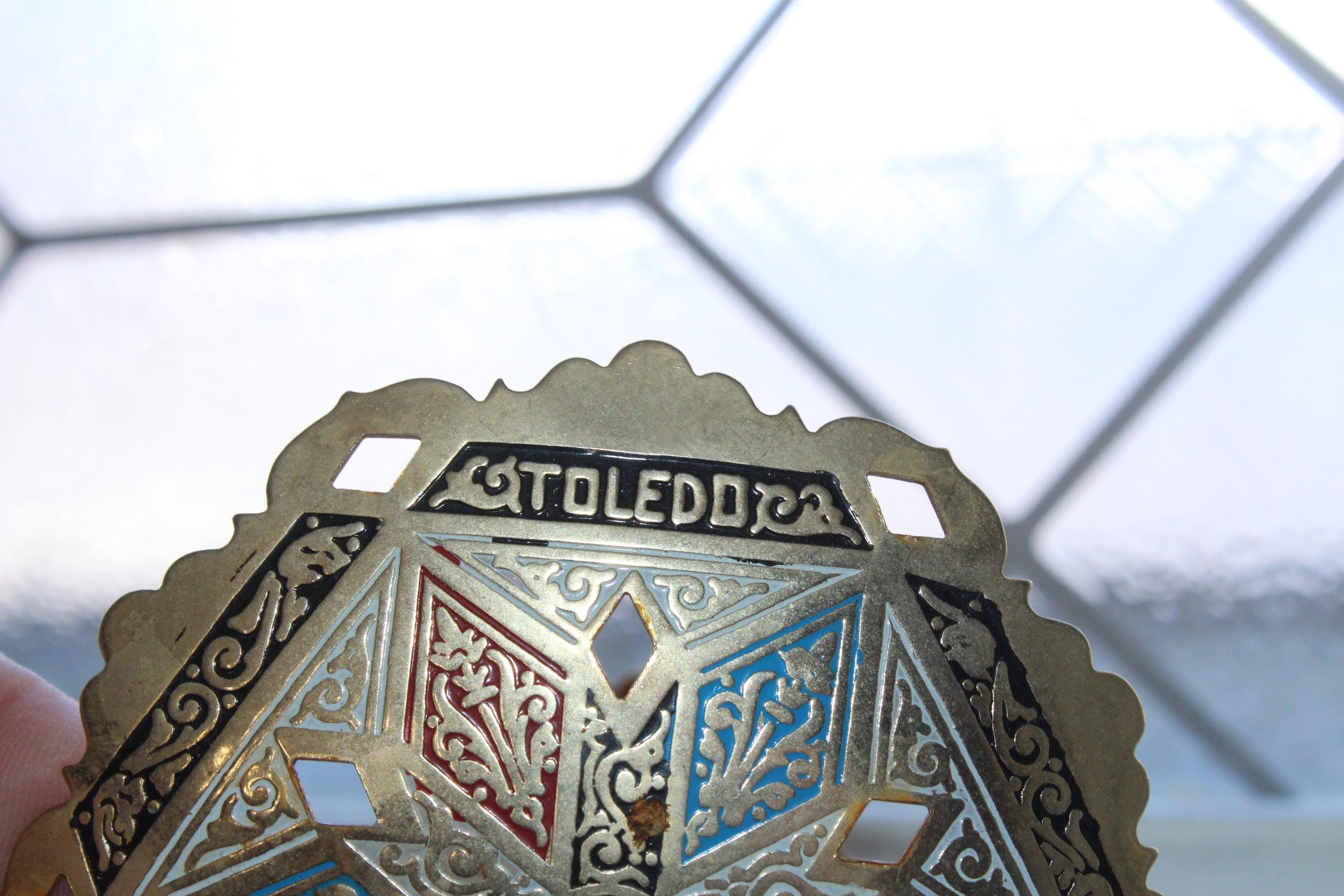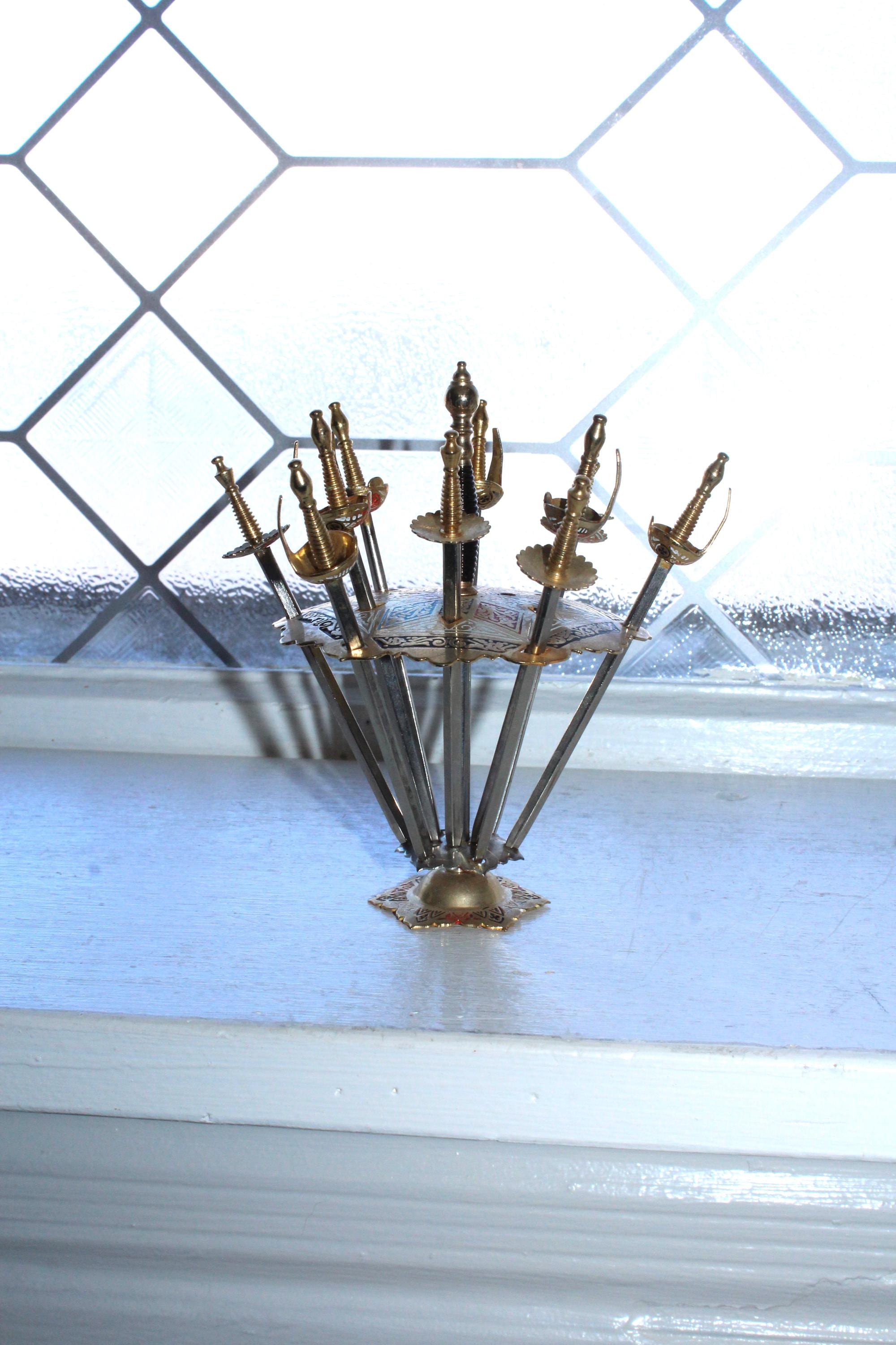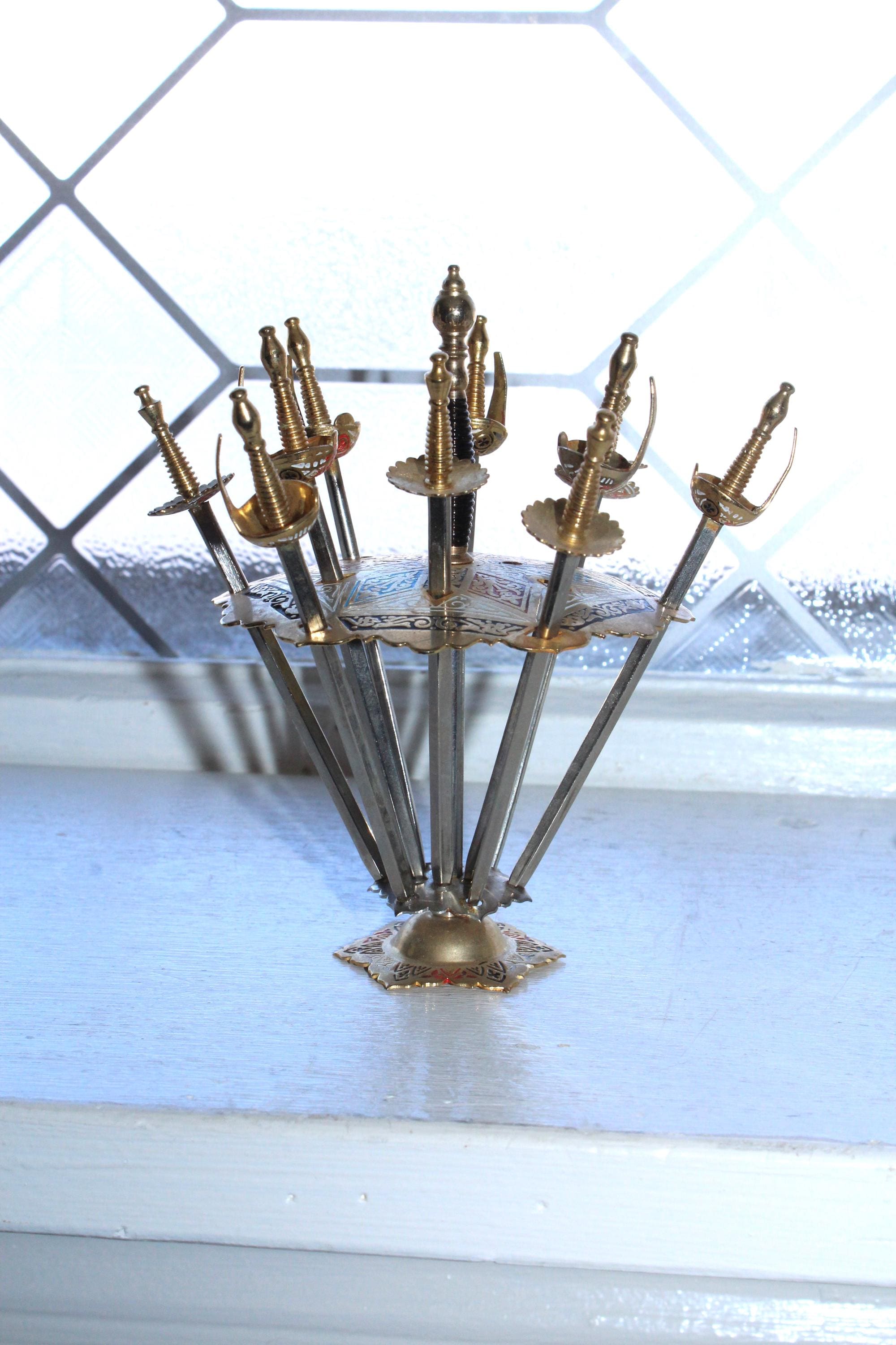This is a vintage Mid Century 1960s Toledo sword cocktail skewers / hors d'oeuvres picks holder with 11 swords (the 12th one is missing), in good condition. It measures 4 1/2" high. No damage. A great display piece or a cute serving piece for your next party. Enjoy!