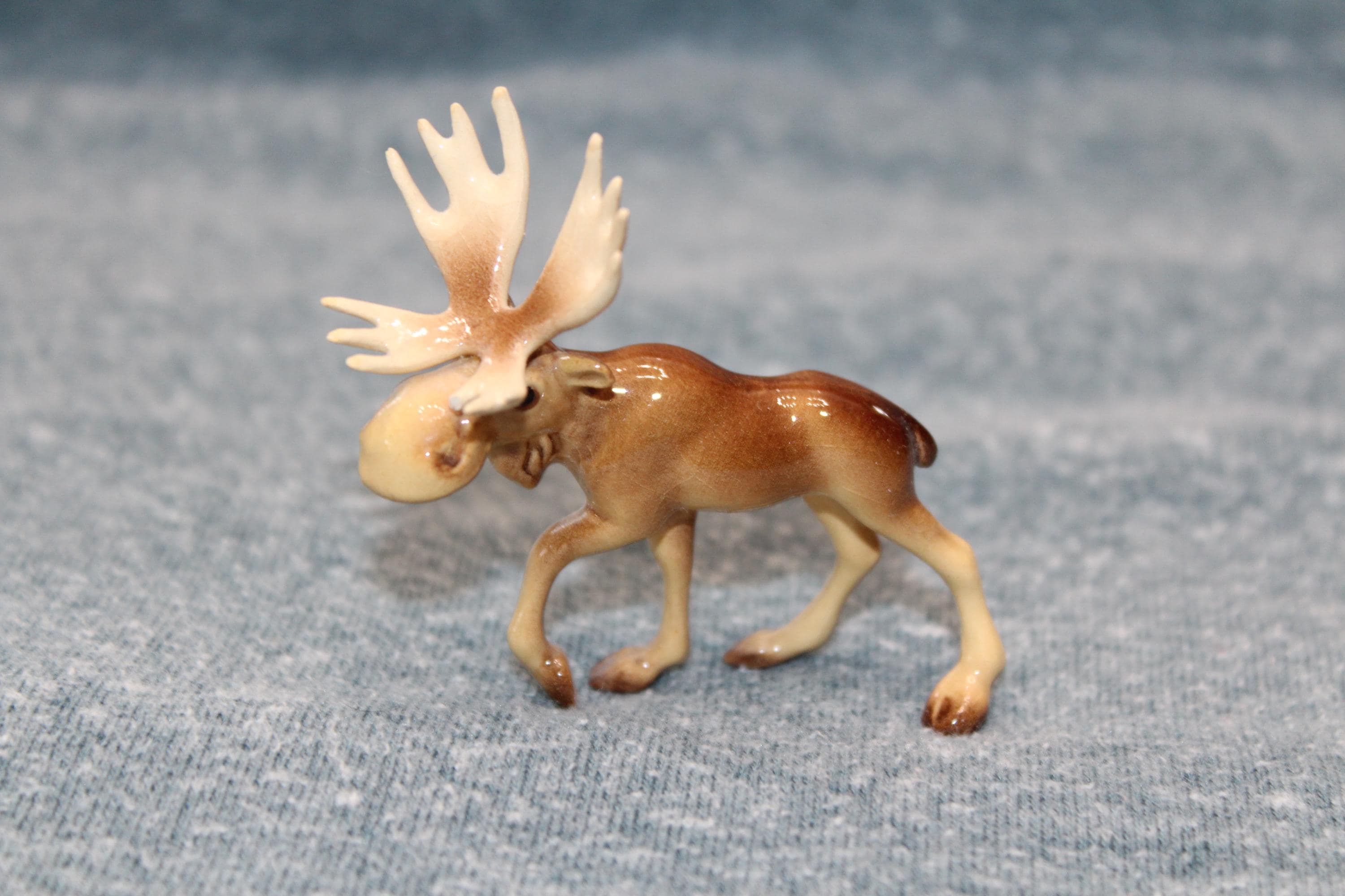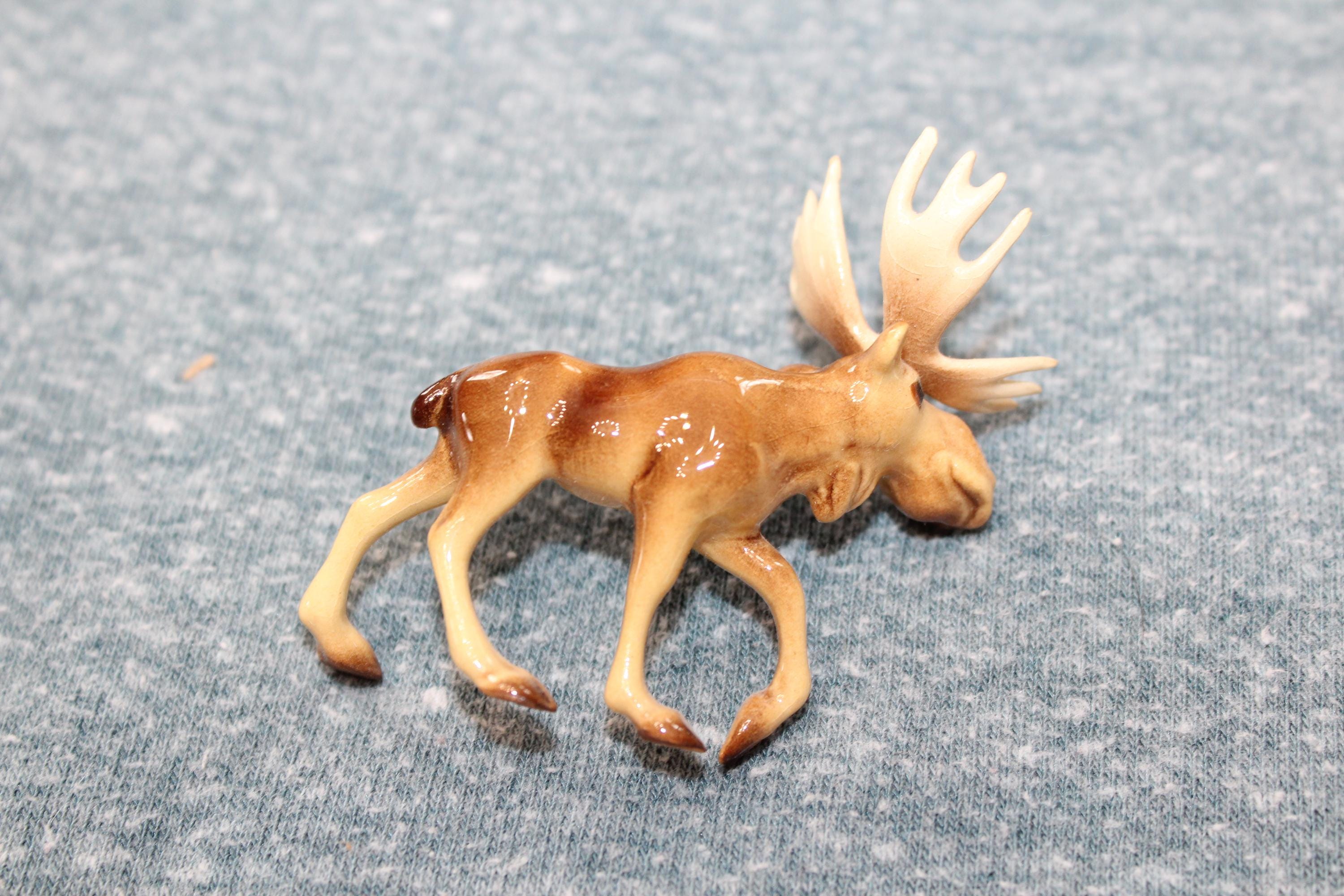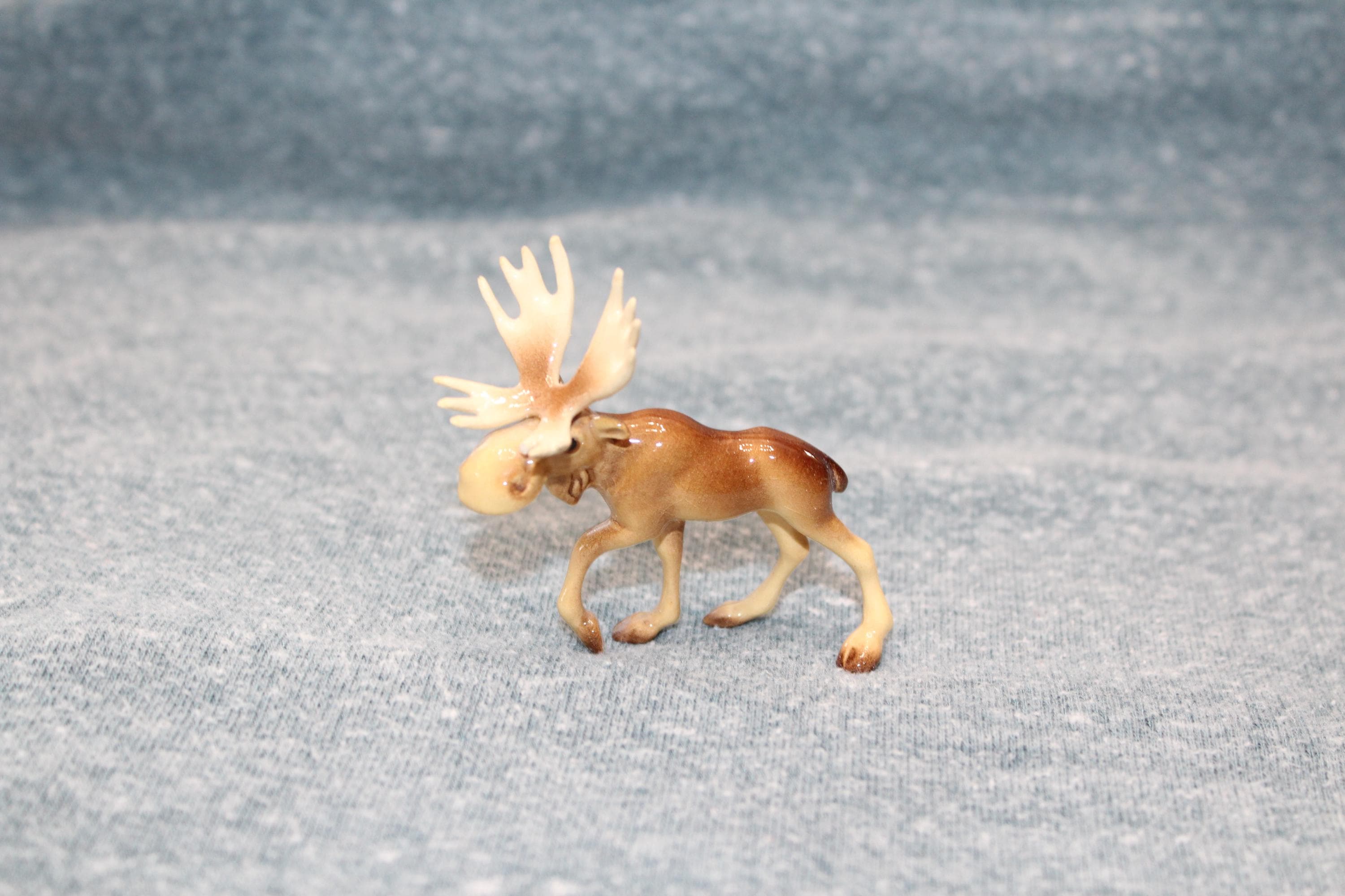 This is a vintage miniature Hagen Renaker moose figurine. It measures 2 1/4" high. It does have a tiny nip on the end of one of the horn prongs, no other chips. Enjoy!