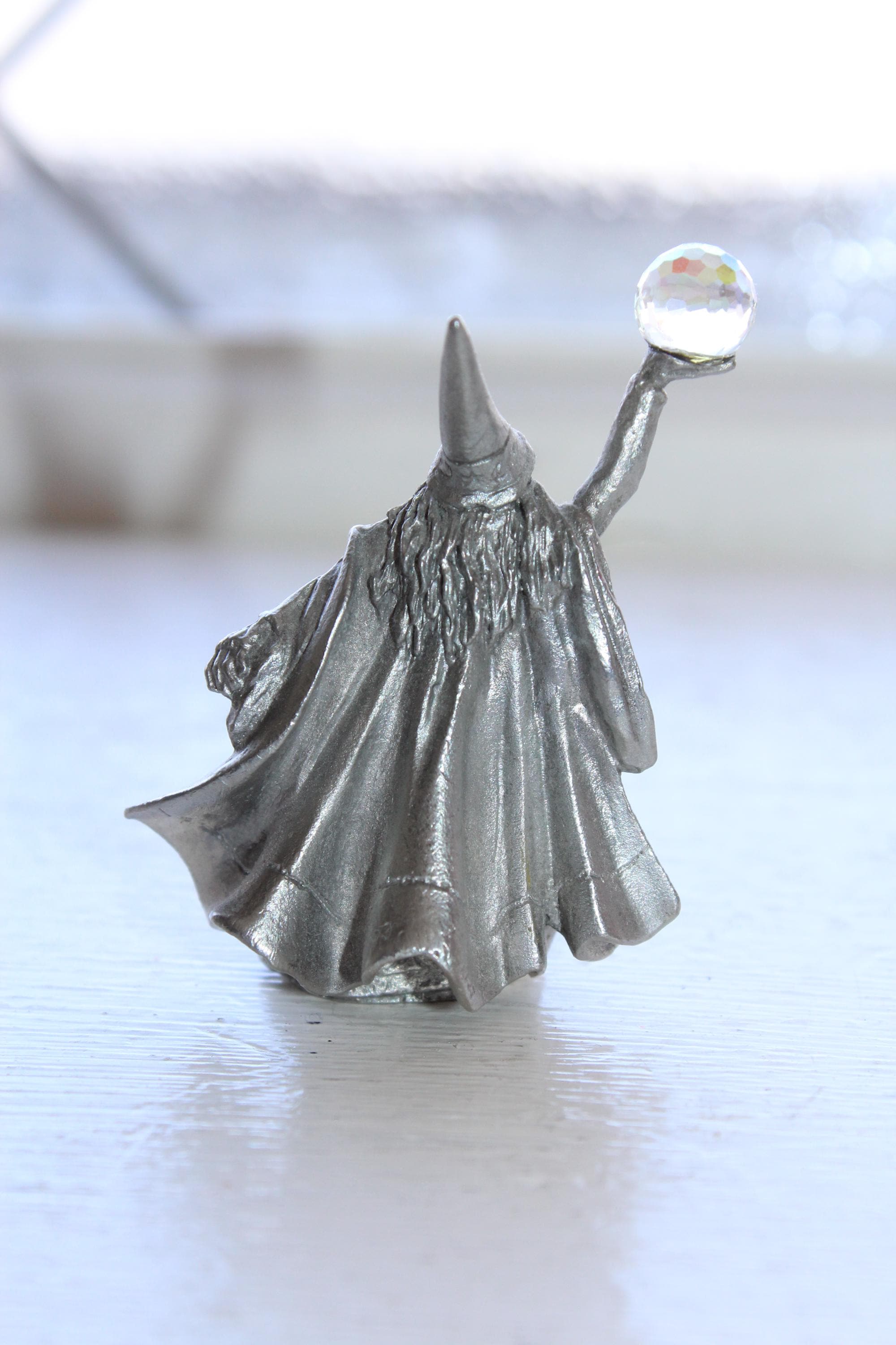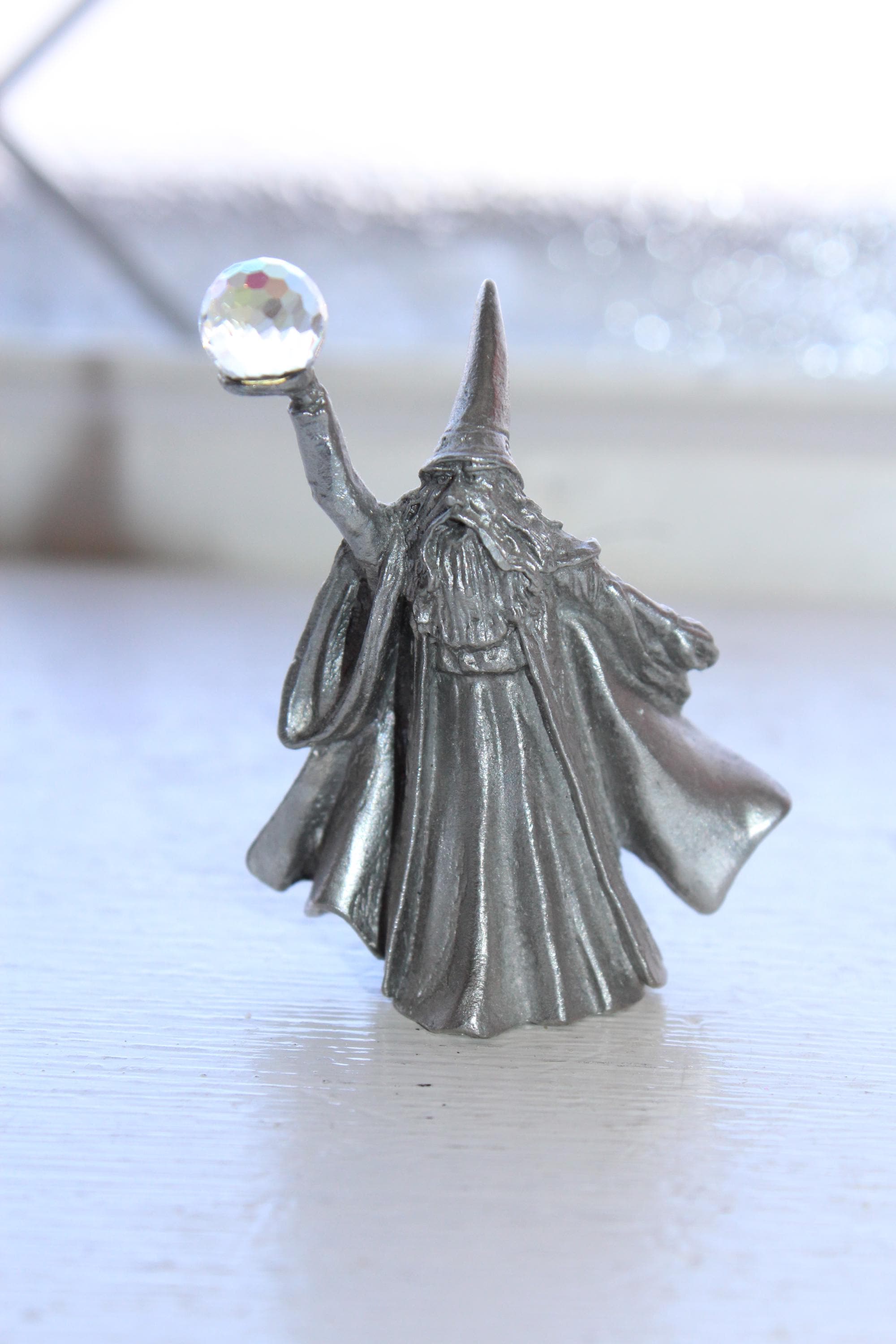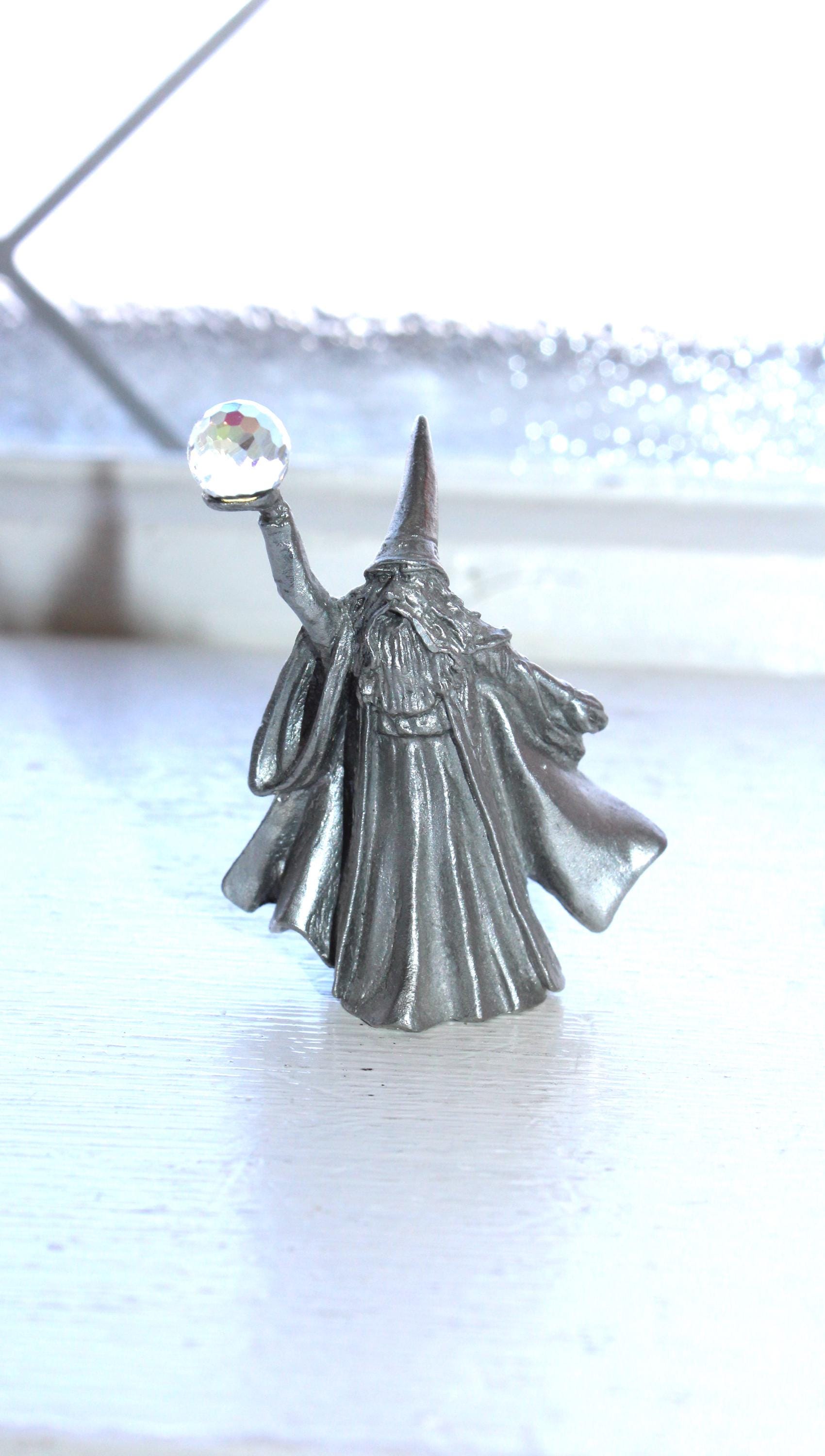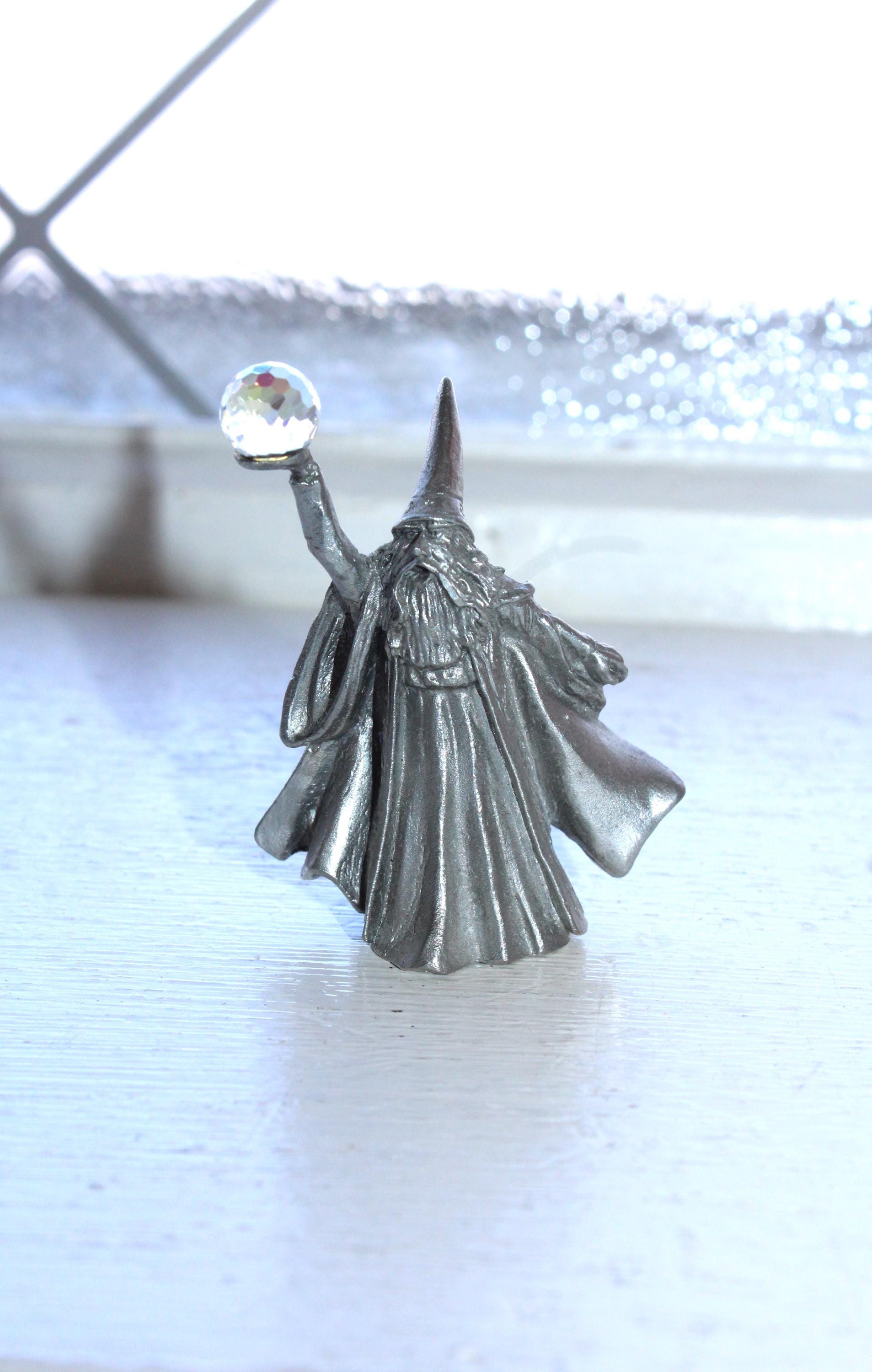 Vintage Perth Pewter sorcerer figurine with faceted crystal ball, highly detailed, in excellent condition. The figure measures 2" high and has no damage, perfect for display. Enjoy!