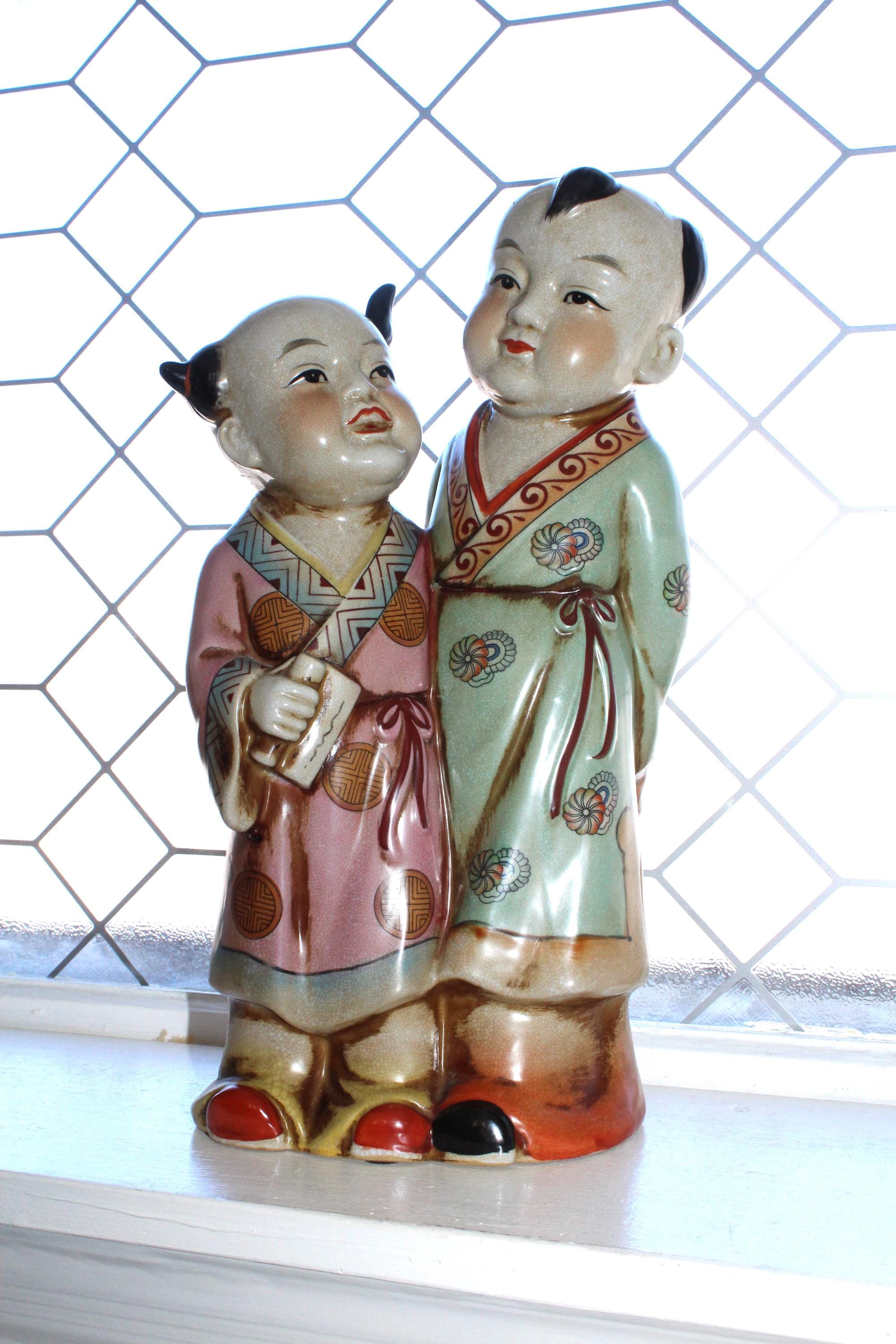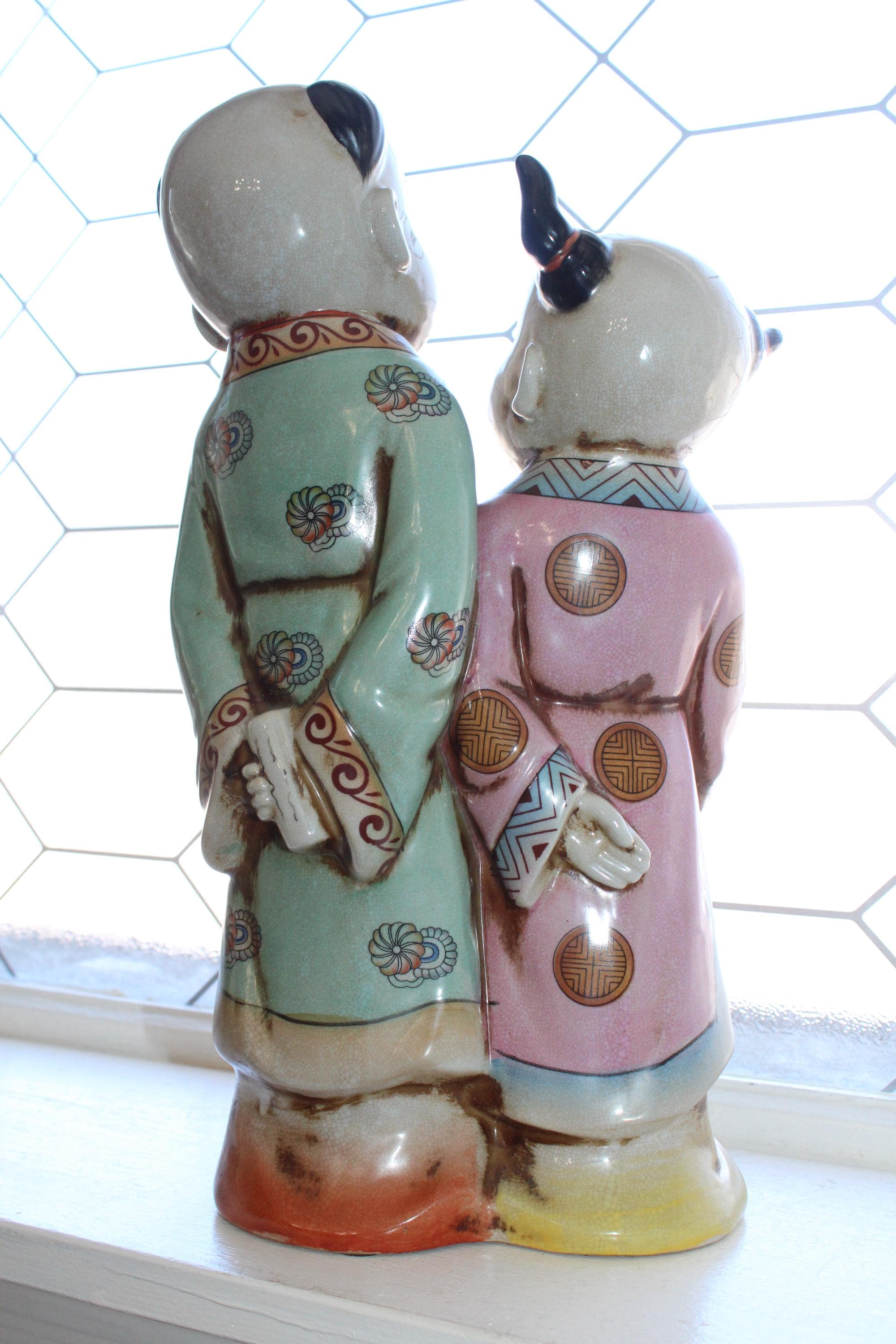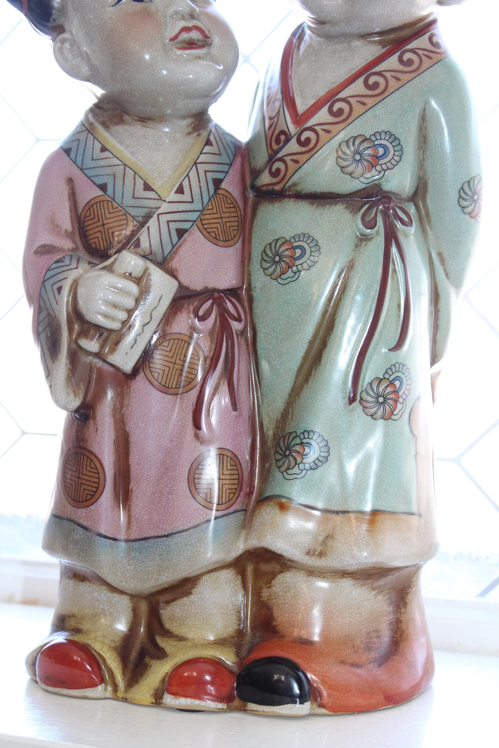This is a large vintage Japanese porcelain polychrome Kutani Imari statue of two people, in excellent condition. It measures 14" high and weighs 3 3/4 lb. No chips or cracks, perfect for display. Enjoy!
