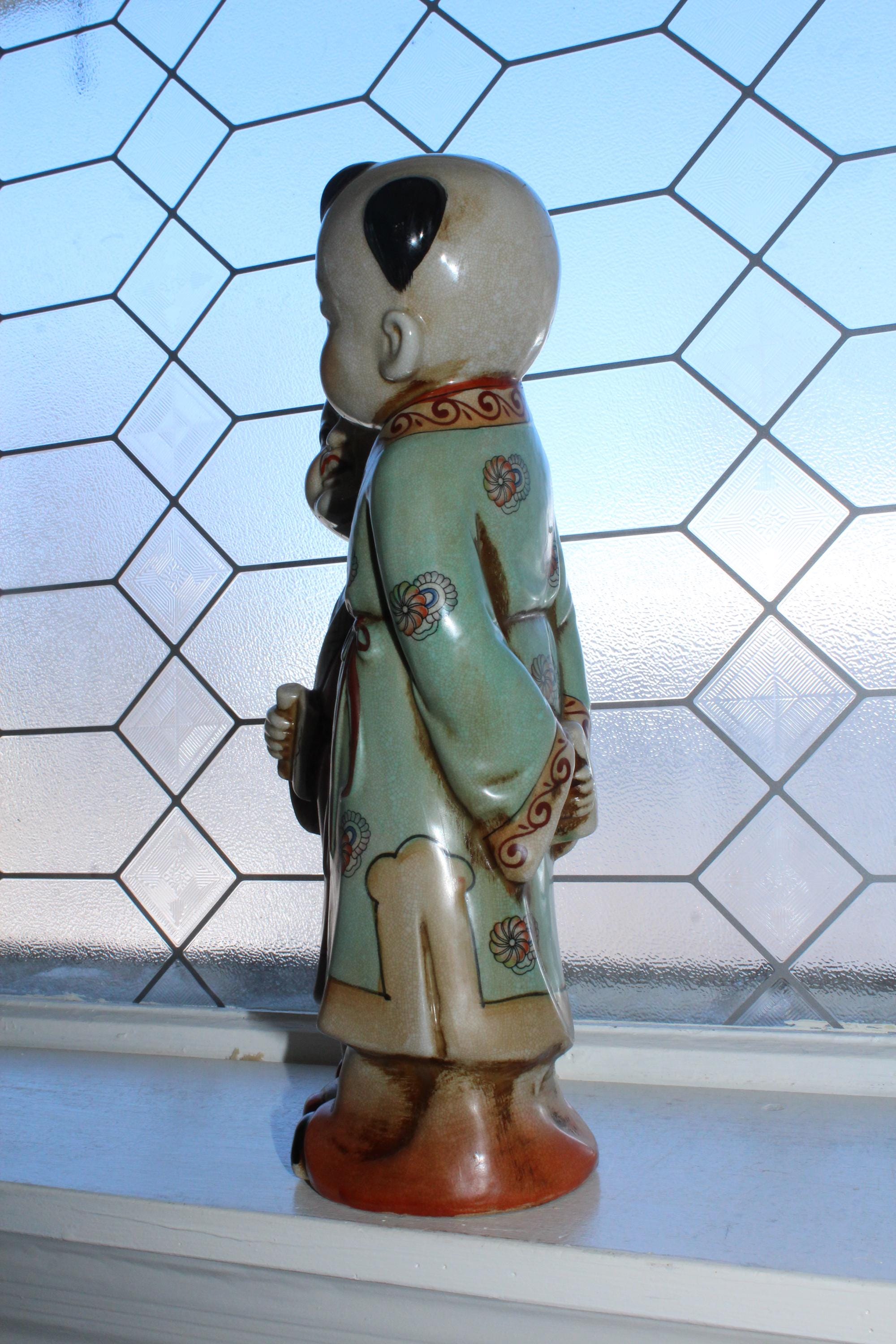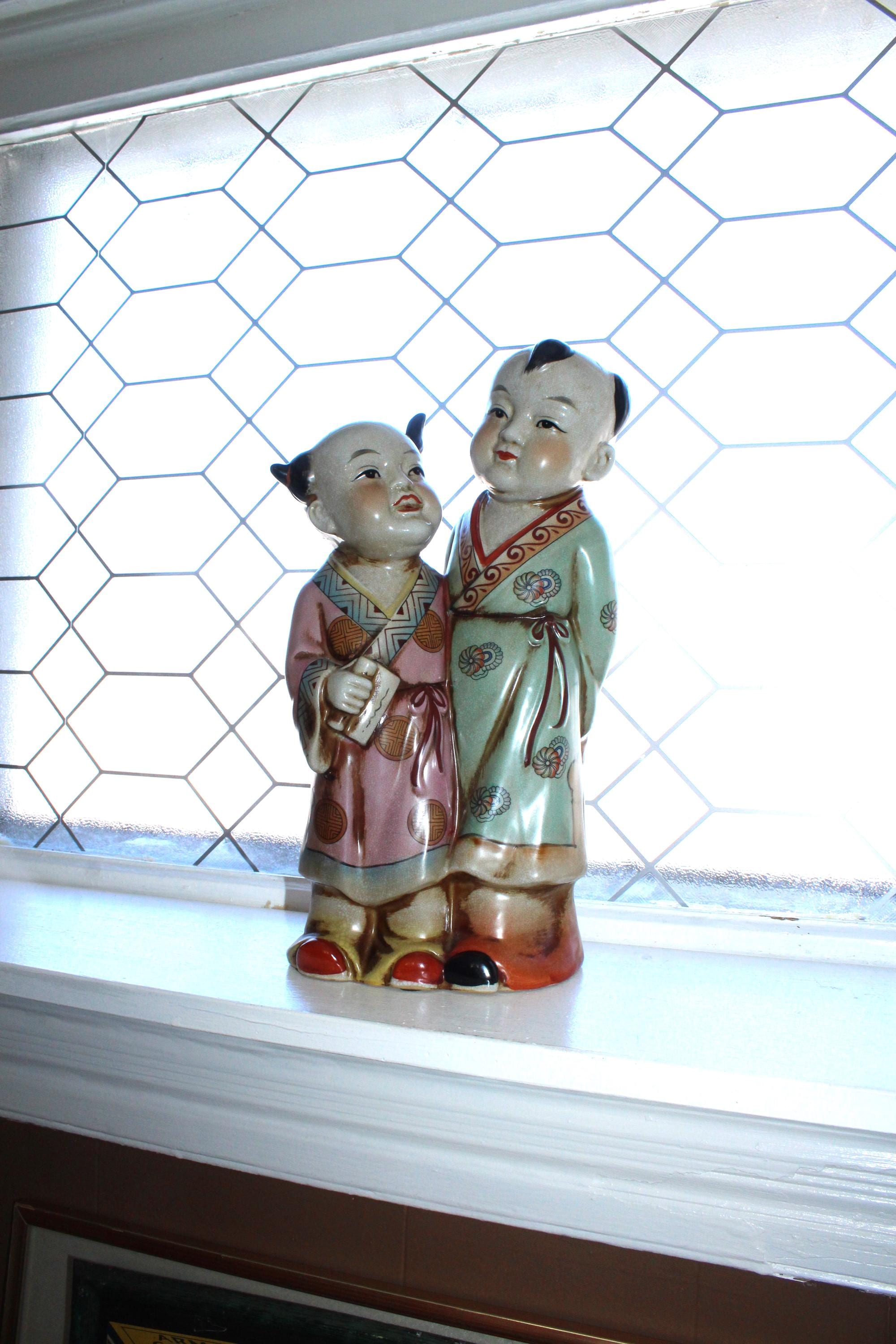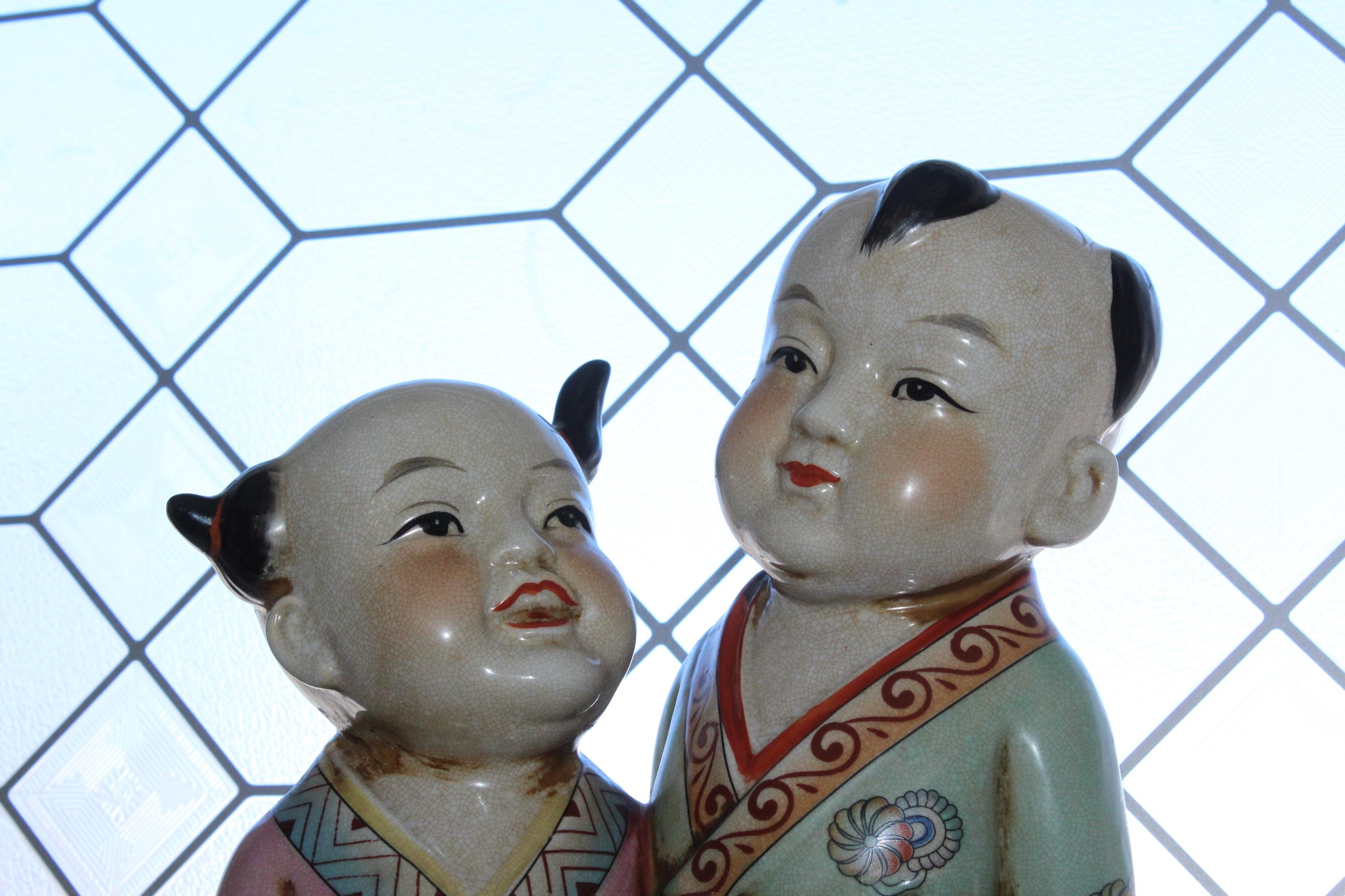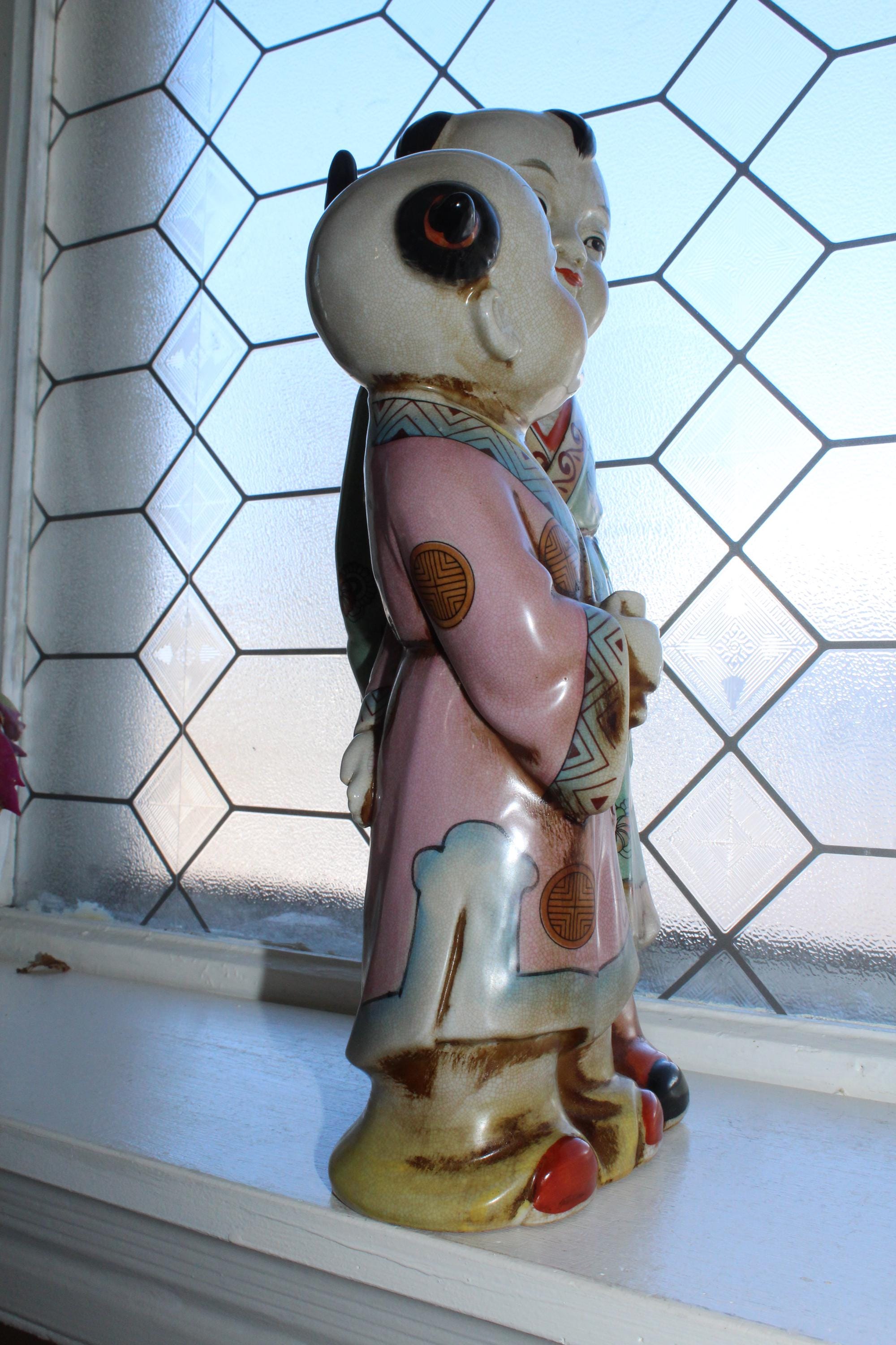 This is a large vintage Japanese porcelain polychrome Kutani Imari statue of two people, in excellent condition. It measures 14" high and weighs 3 3/4 lb. No chips or cracks, perfect for display. Enjoy!