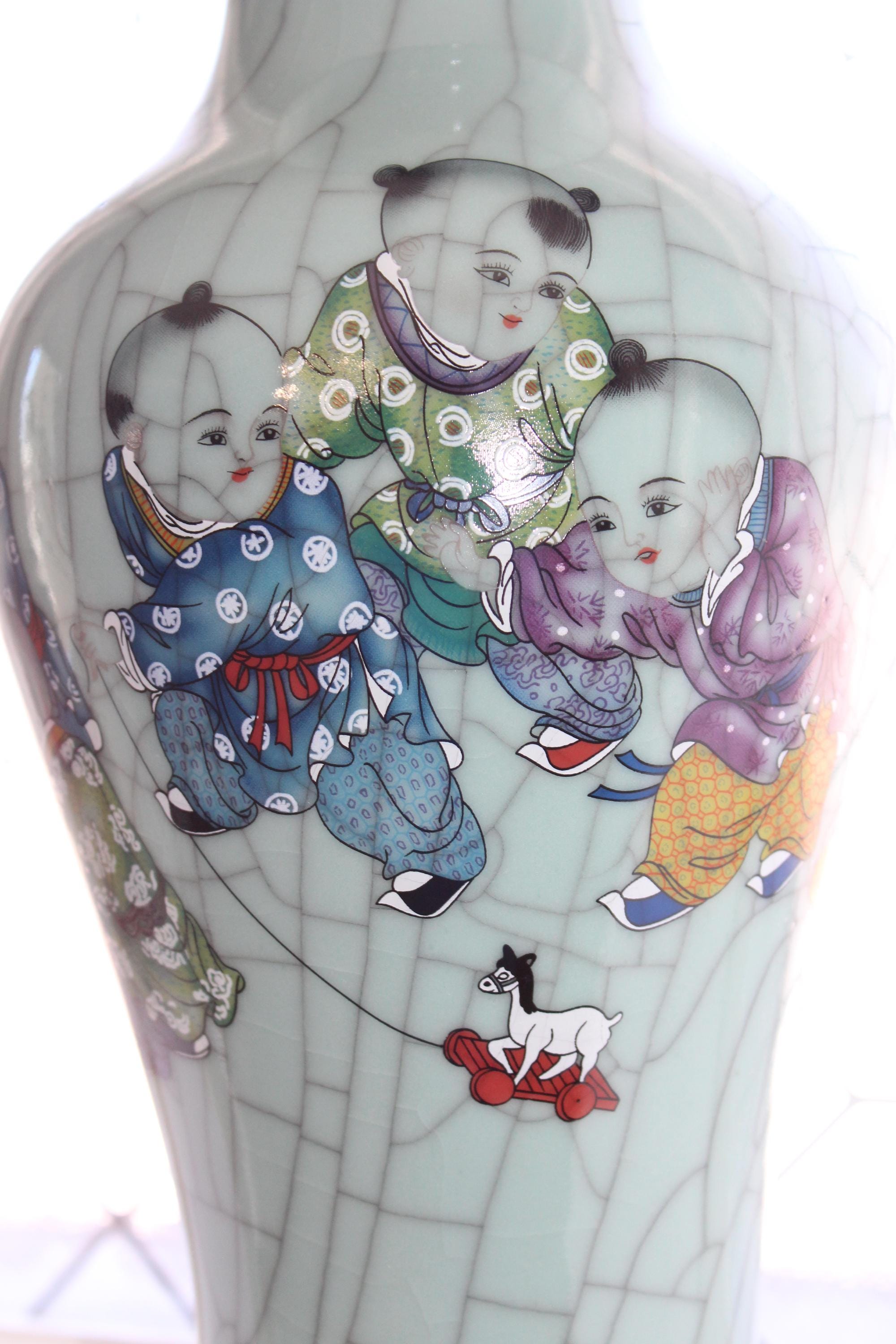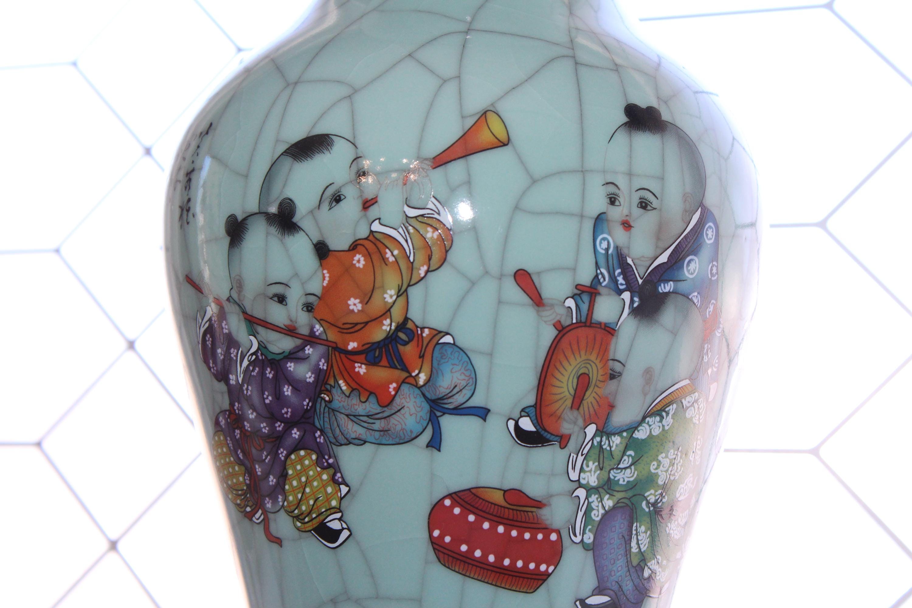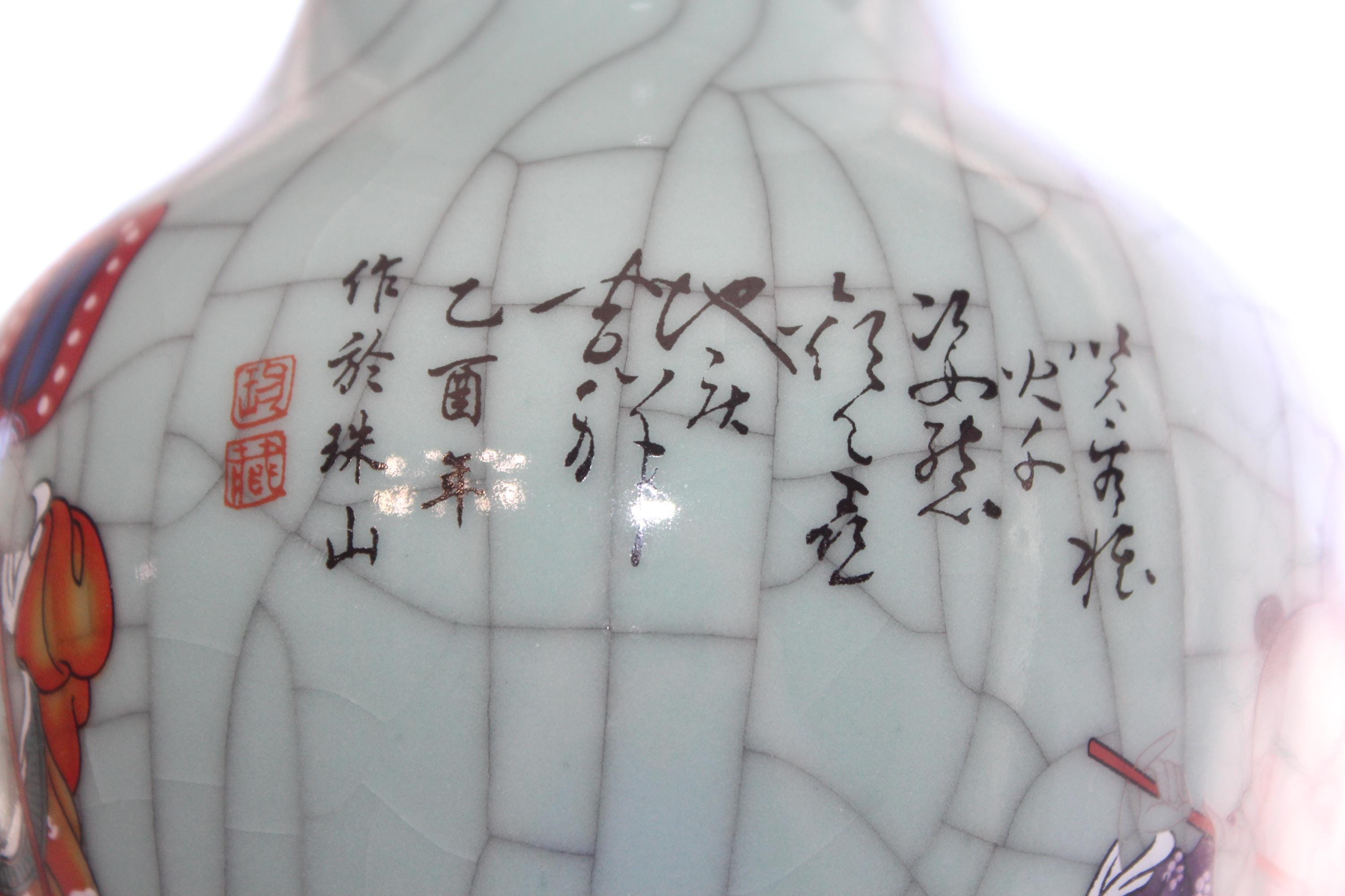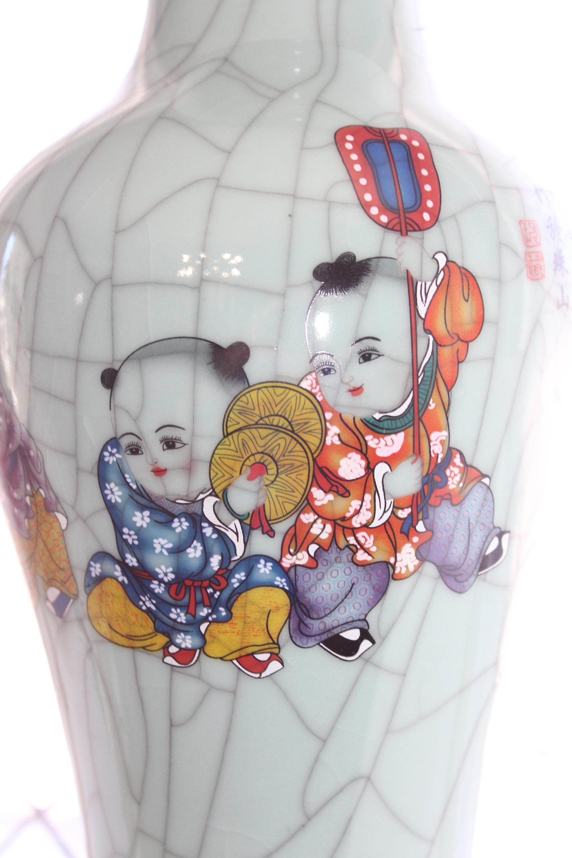 This is a large vintage Chinese Famille Rose celadon green crackle porcelain vase featuring boys at play and Chinese writing, in excellent condition. This high quality Ge kiln style ware vase measures 14" high and weighs 6 3/4 lbs. Part of the inscription says it was made in the year of Yiyou (2005) at Zhushan (likely referring to Jingdezhen). The vertical columns of text on the right and center are typically poetry or a descriptive colophon, followed by the dating and artist's signature on the left.