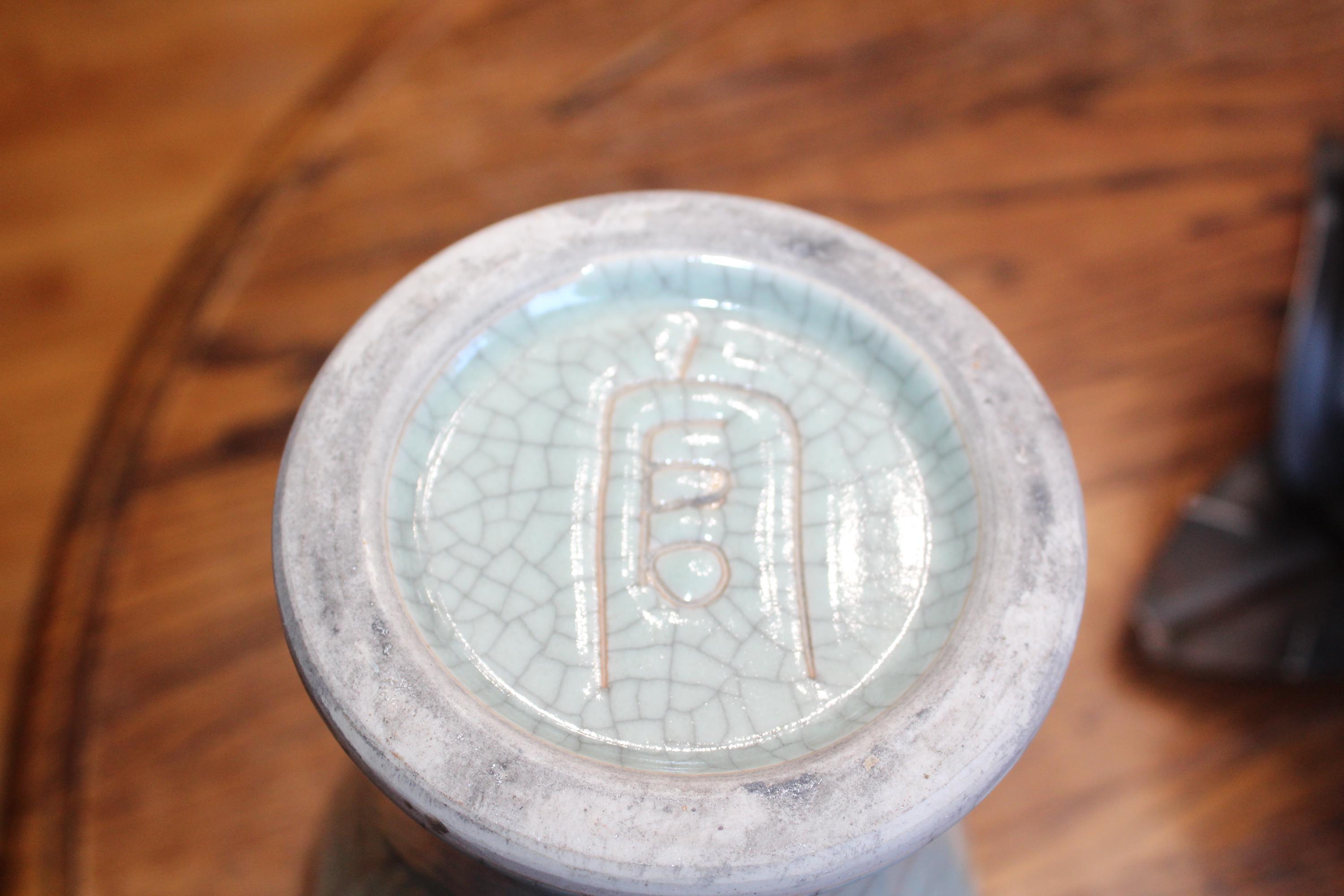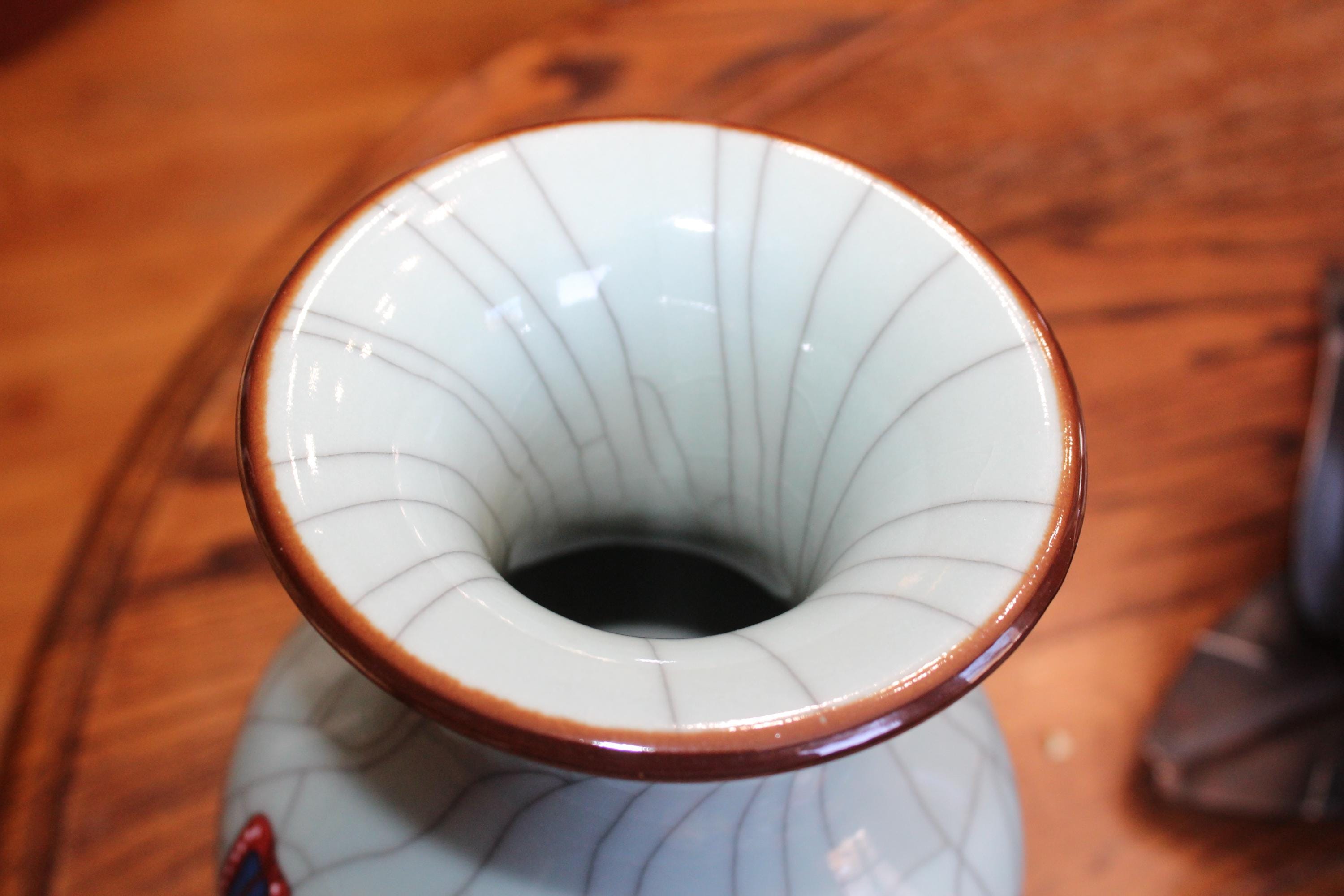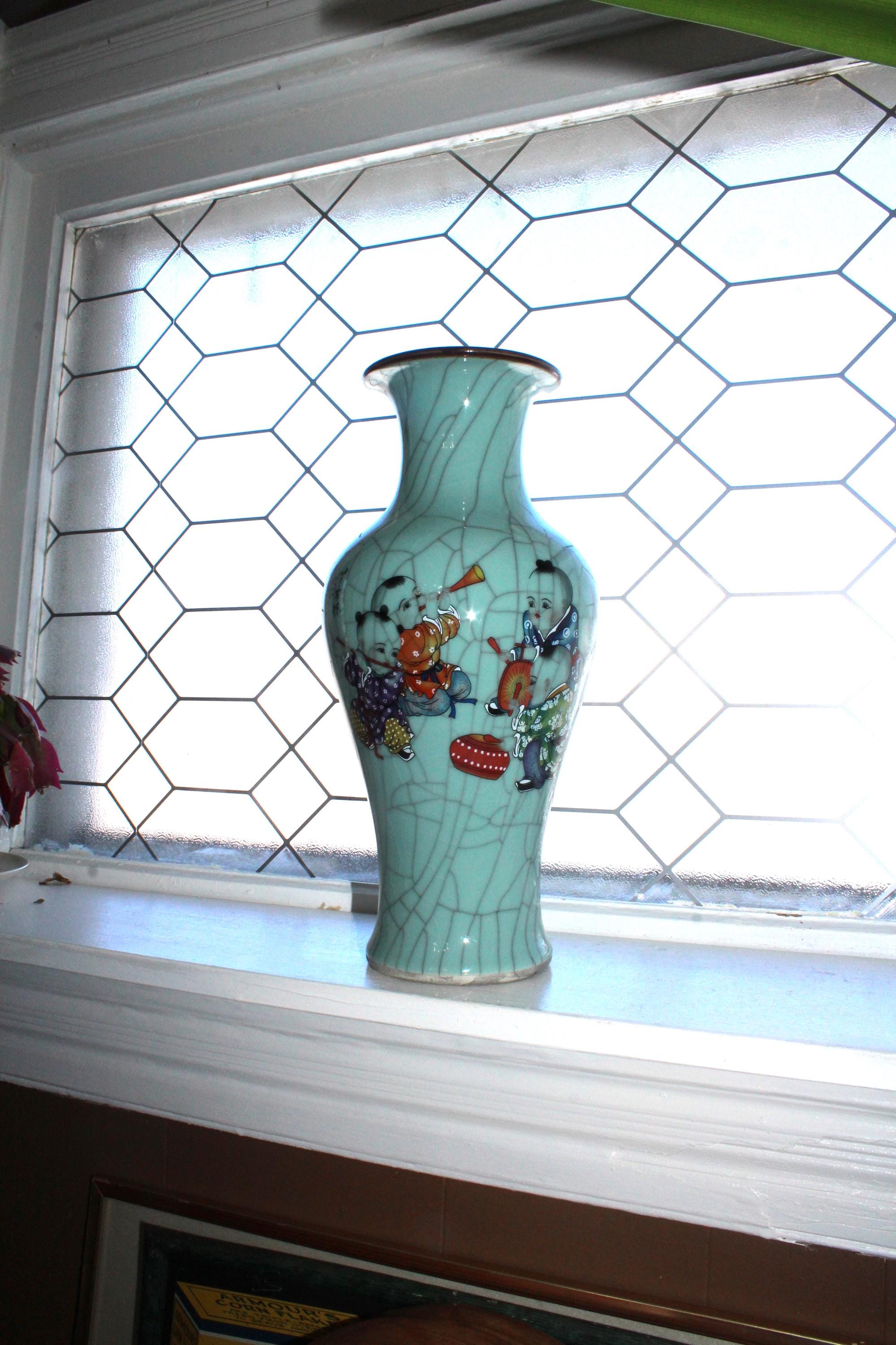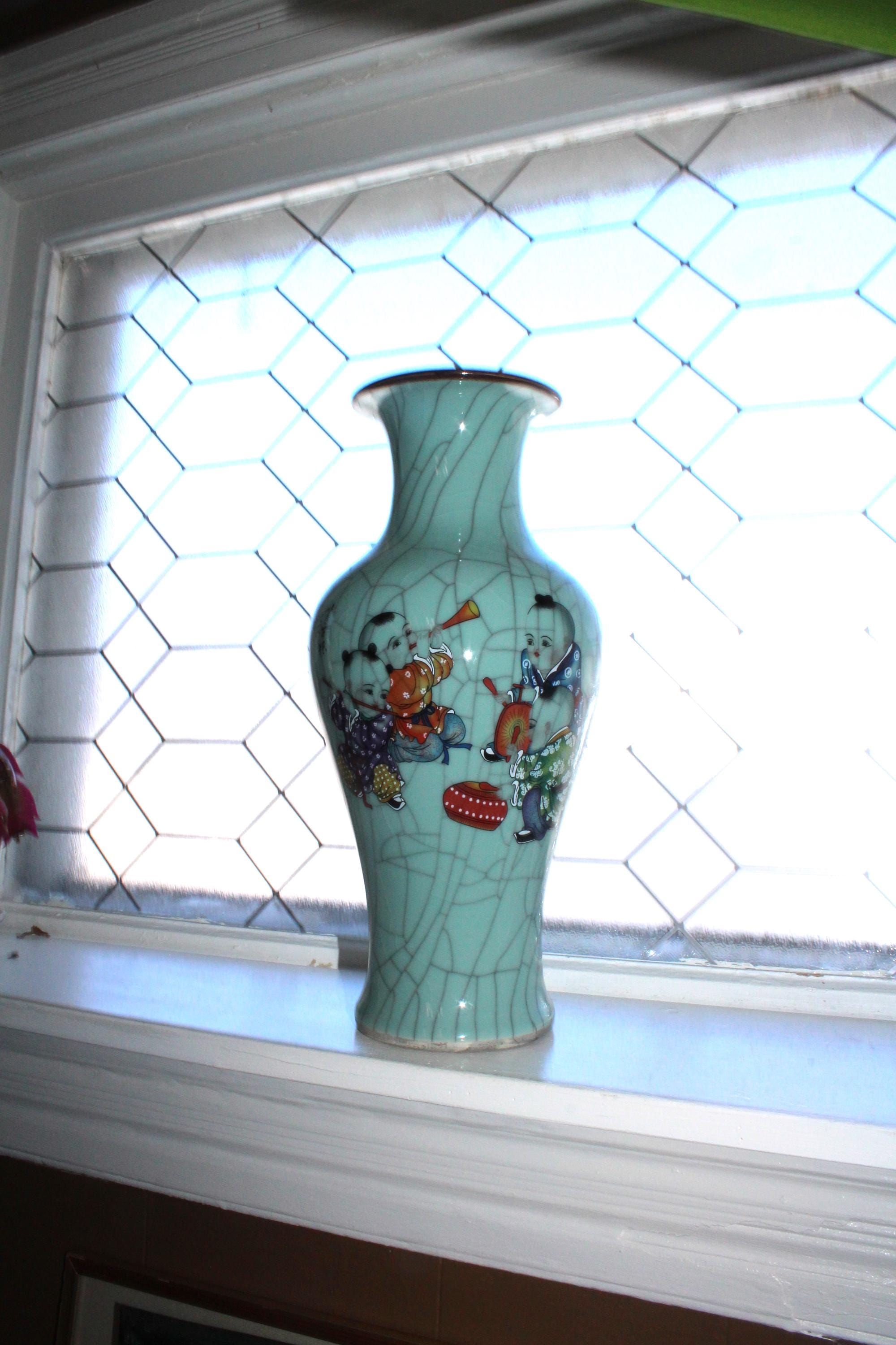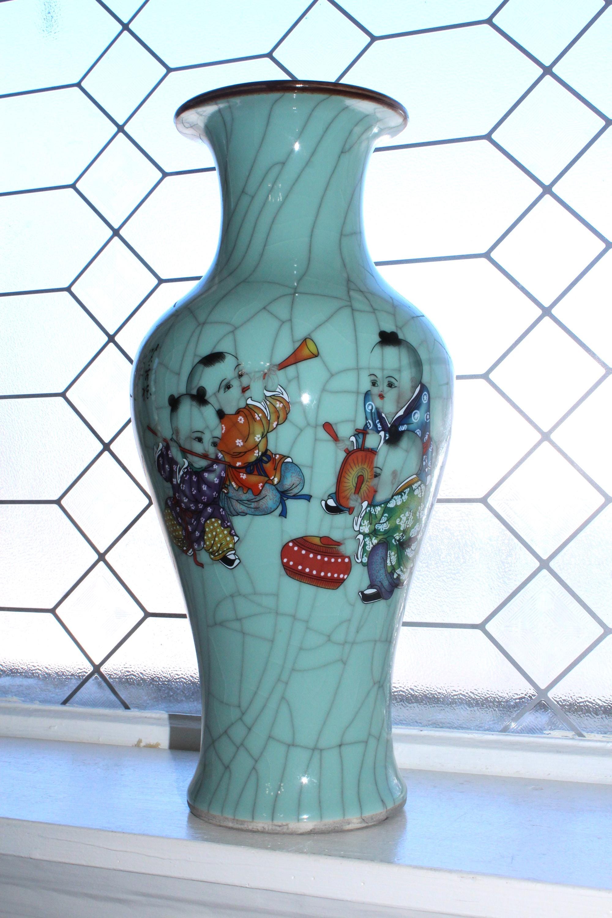 This is a large vintage Chinese Famille Rose celadon green crackle porcelain vase featuring boys at play and Chinese writing, in excellent condition. This high quality Ge kiln style ware vase measures 14" high and weighs 6 3/4 lbs. Part of the inscription says it was made in the year of Yiyou (2005) at Zhushan (likely referring to Jingdezhen). The vertical columns of text on the right and center are typically poetry or a descriptive colophon, followed by the dating and artist's signature on the left.