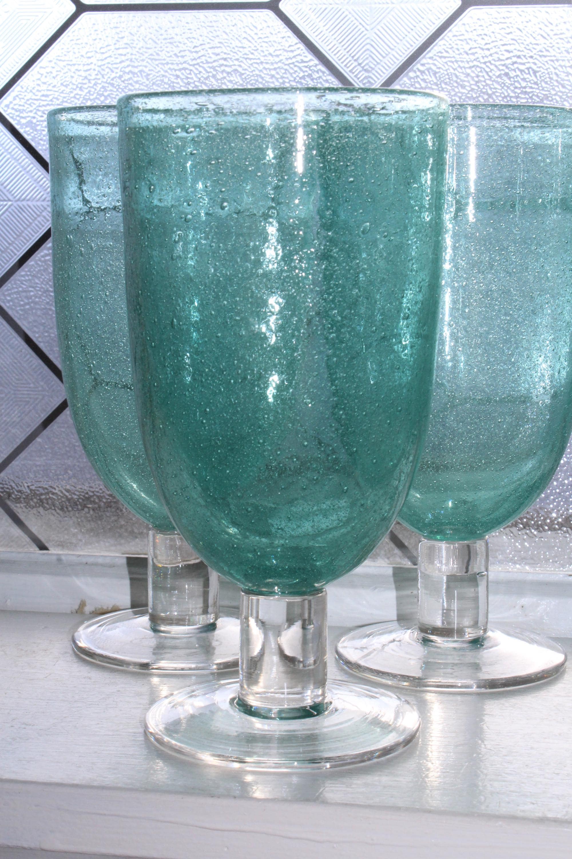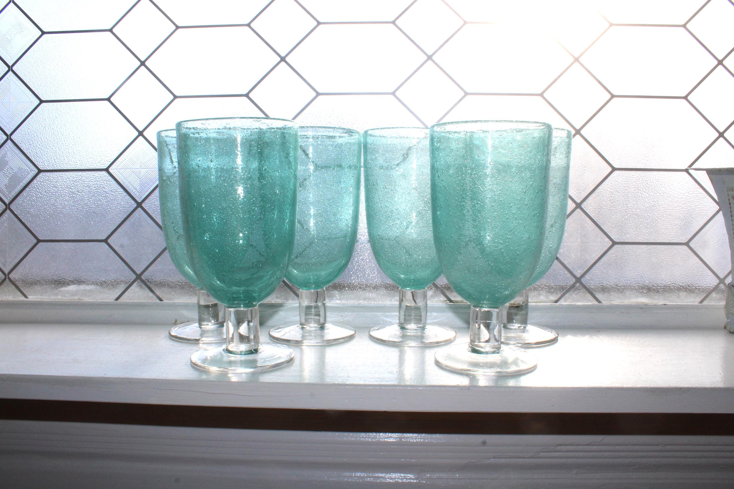 6 vintage Home Studio Shoreline collection aqua blue large stemmed iced tea glasses featuring seeded bubble glass, in excellent condition. These are perfect for a beach or nautical theme table. Each one measures 7 1/4" high x 3 3/4" wide at the top. I HAVE SEVERAL OTHER MATCHING PIECES AVAILABLE IN SEPARATE LISTINGS. Enjoy!