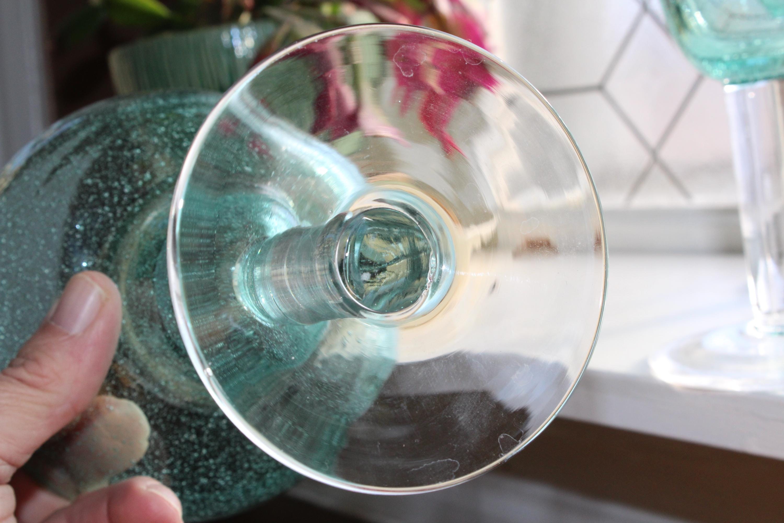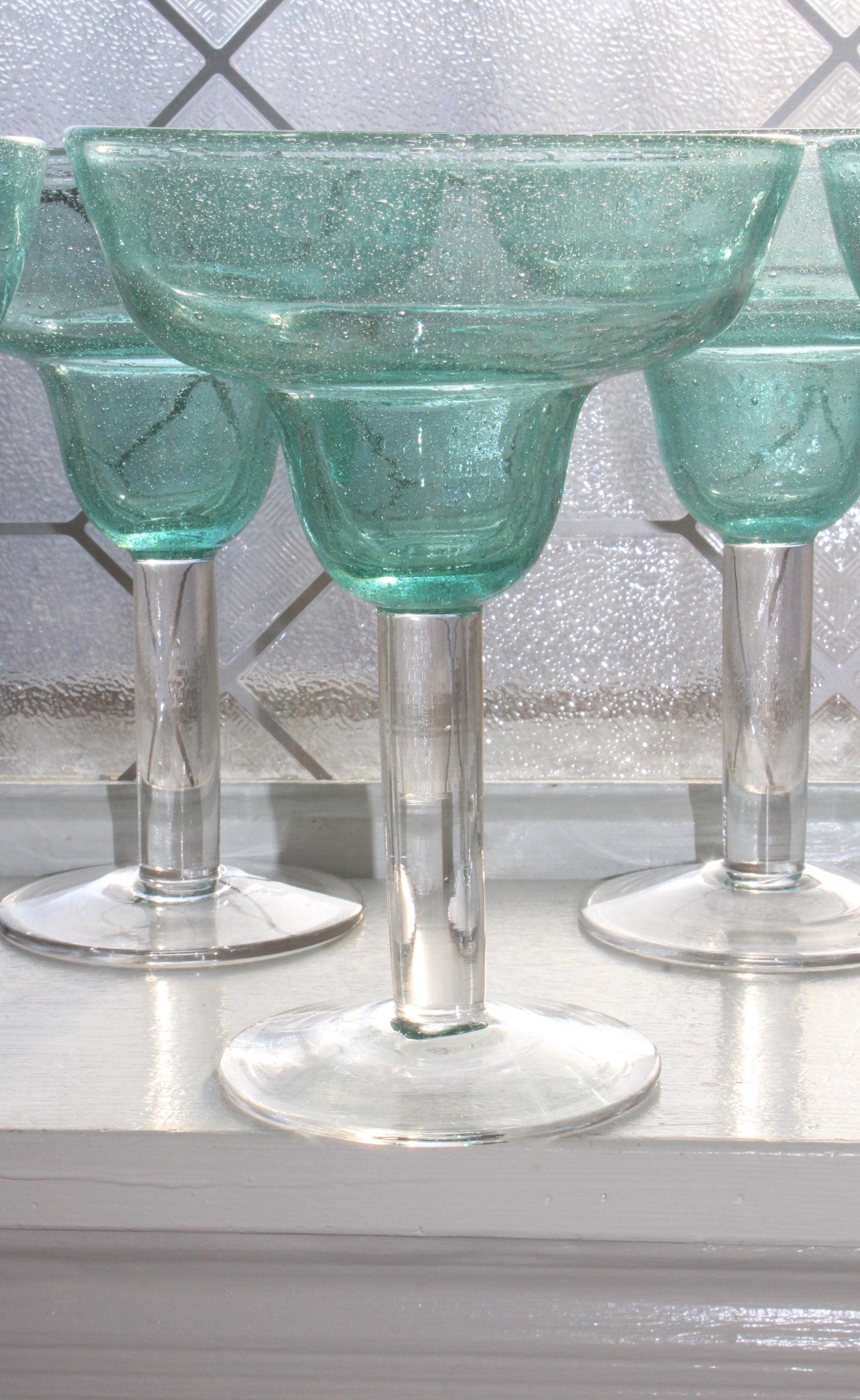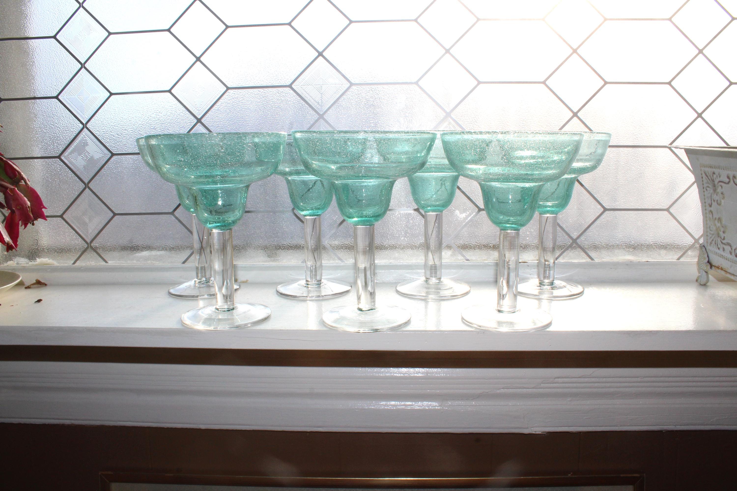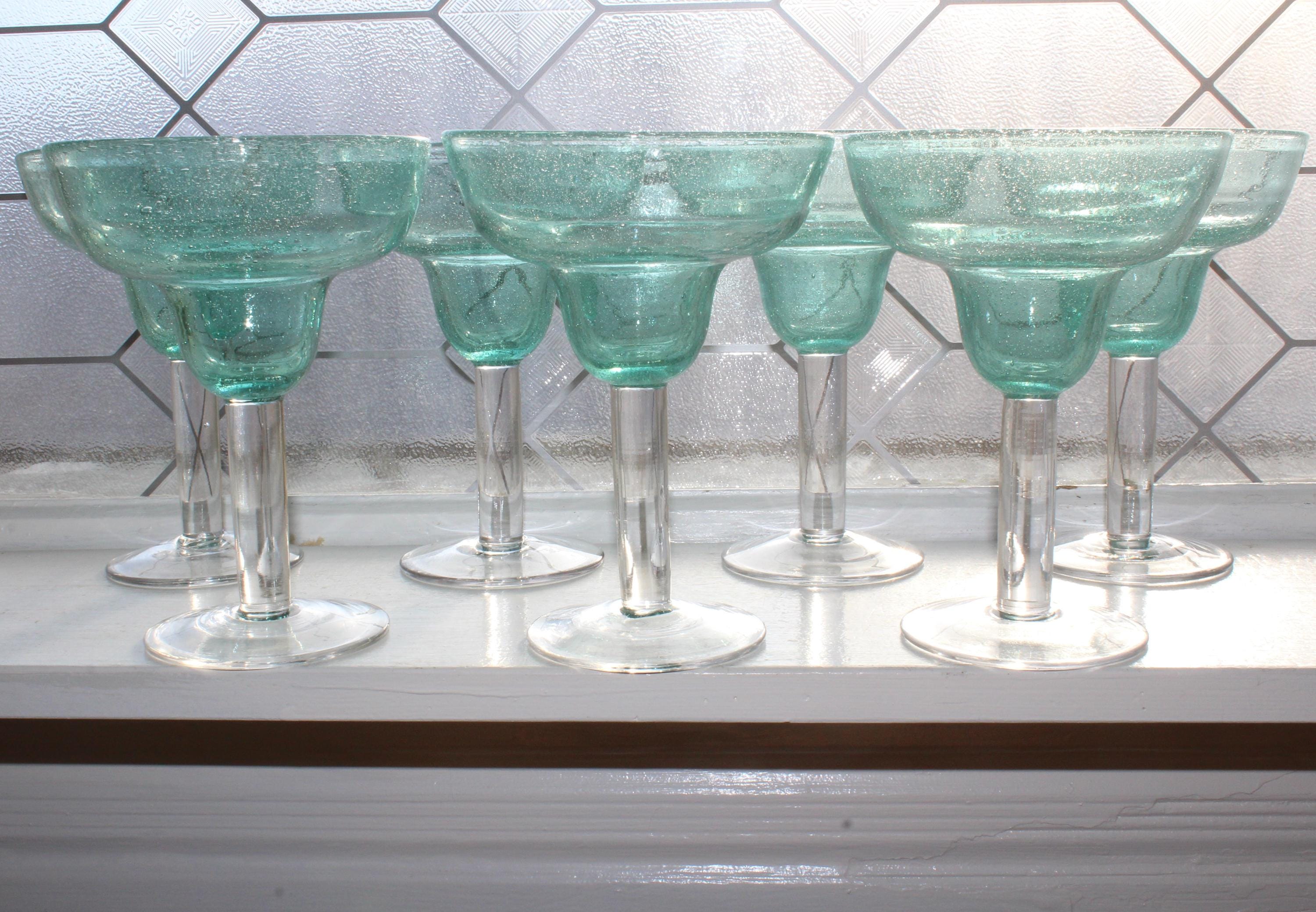 7 vintage Home Studio Shoreline collection aqua blue margarita glasses featuring seeded bubble glass, in excellent condition. These are perfect for a beach or nautical theme table. Each one measures 6 3/4" high x 5" wide at the top. I HAVE SEVERAL OTHER MATCHING PIECES AVAILABLE IN SEPARATE LISTINGS. Enjoy!