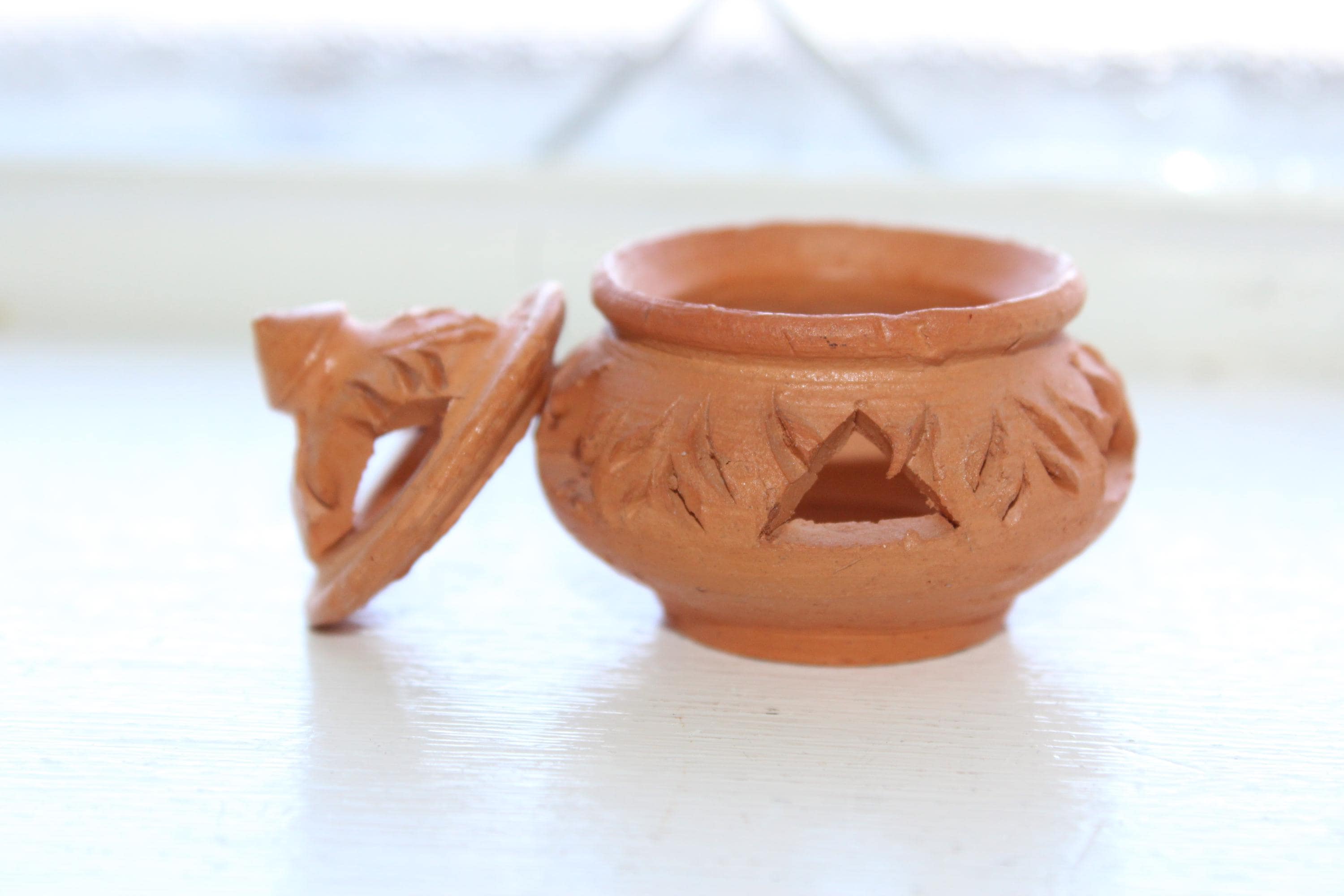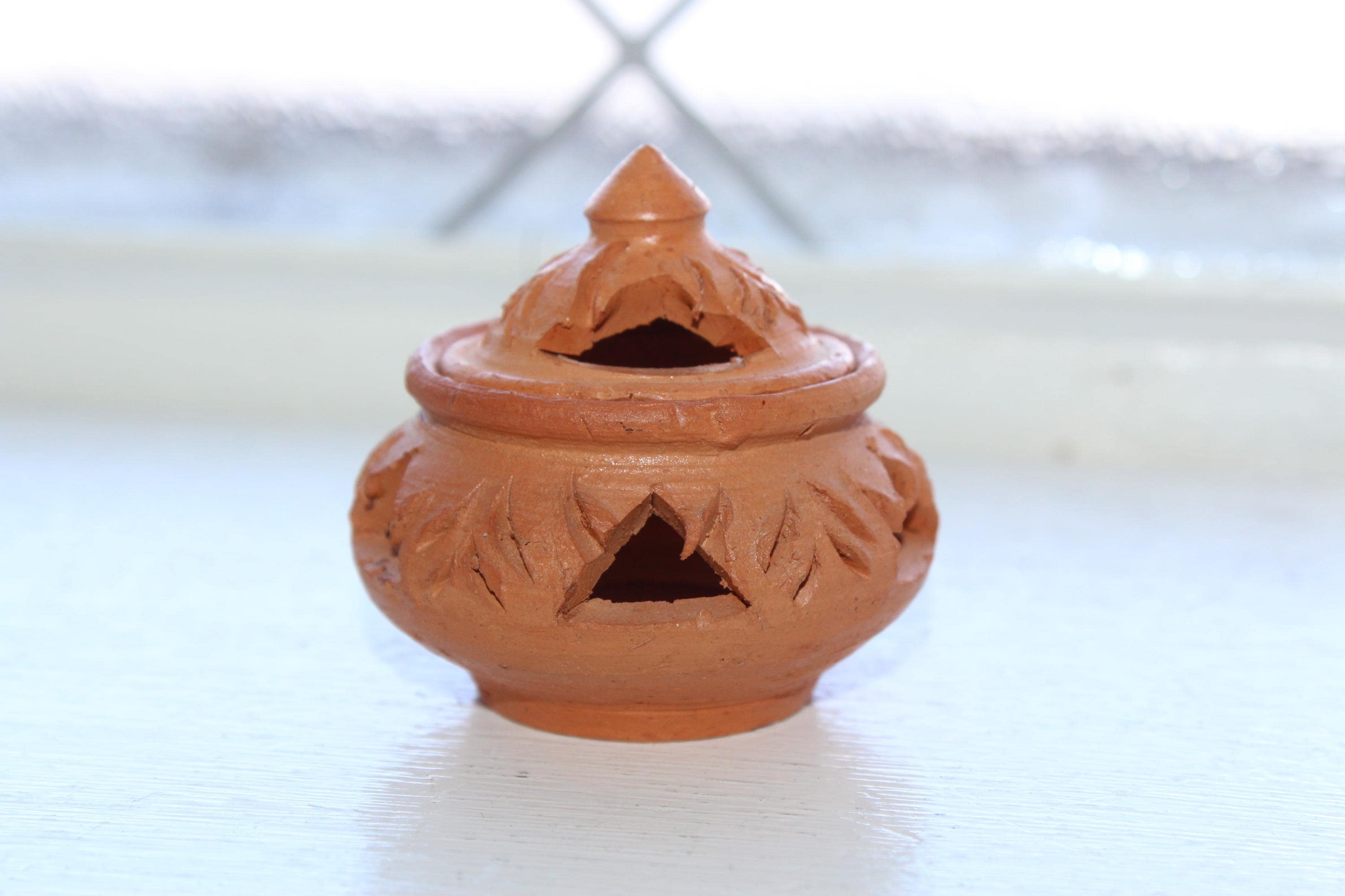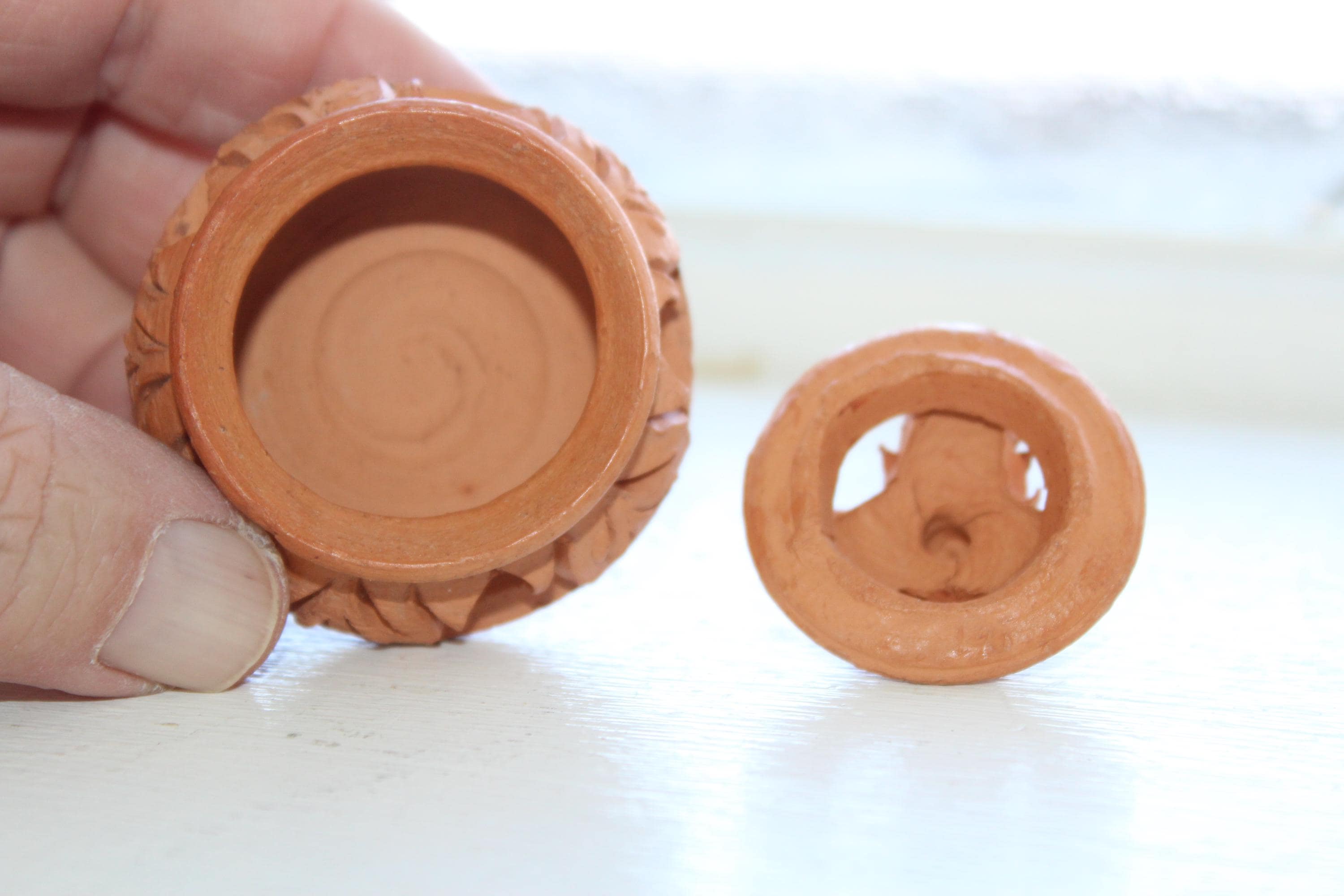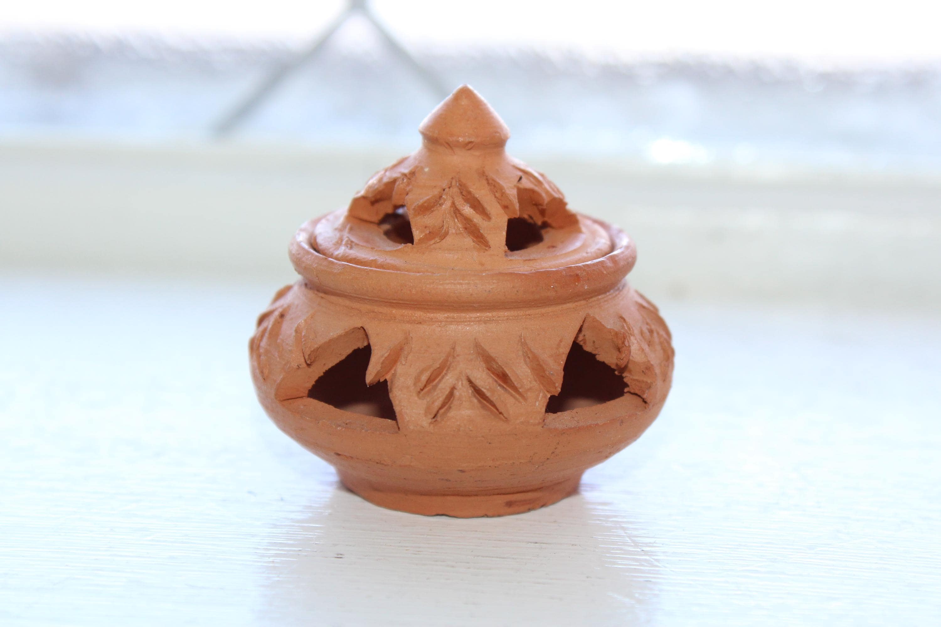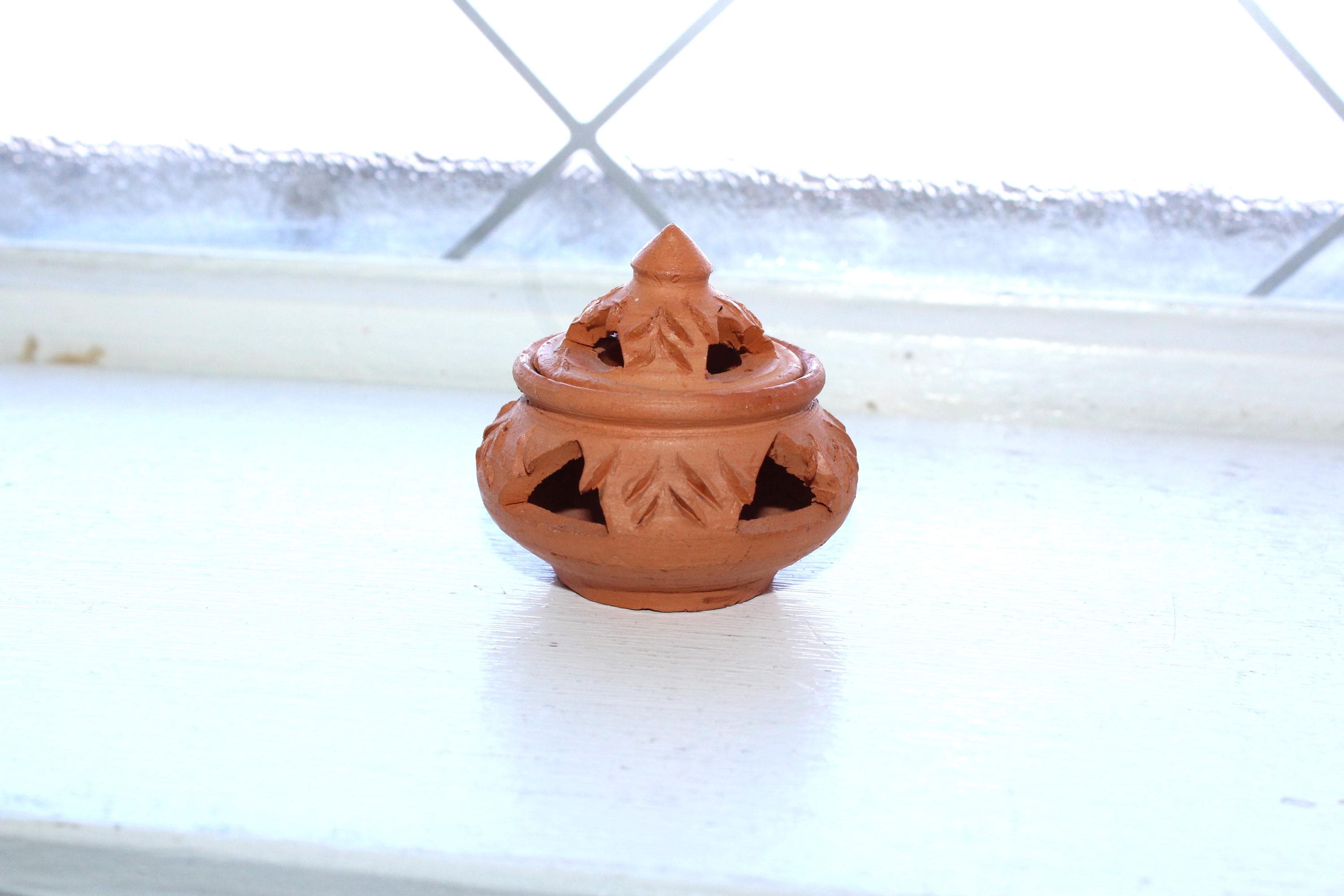 Vintage handmade clay incense burner with lid, from Koh Kret Island, Thailand, in excellent condition. It measures 2" high . No chips or cracks, perfect for use or display. Enjoy!