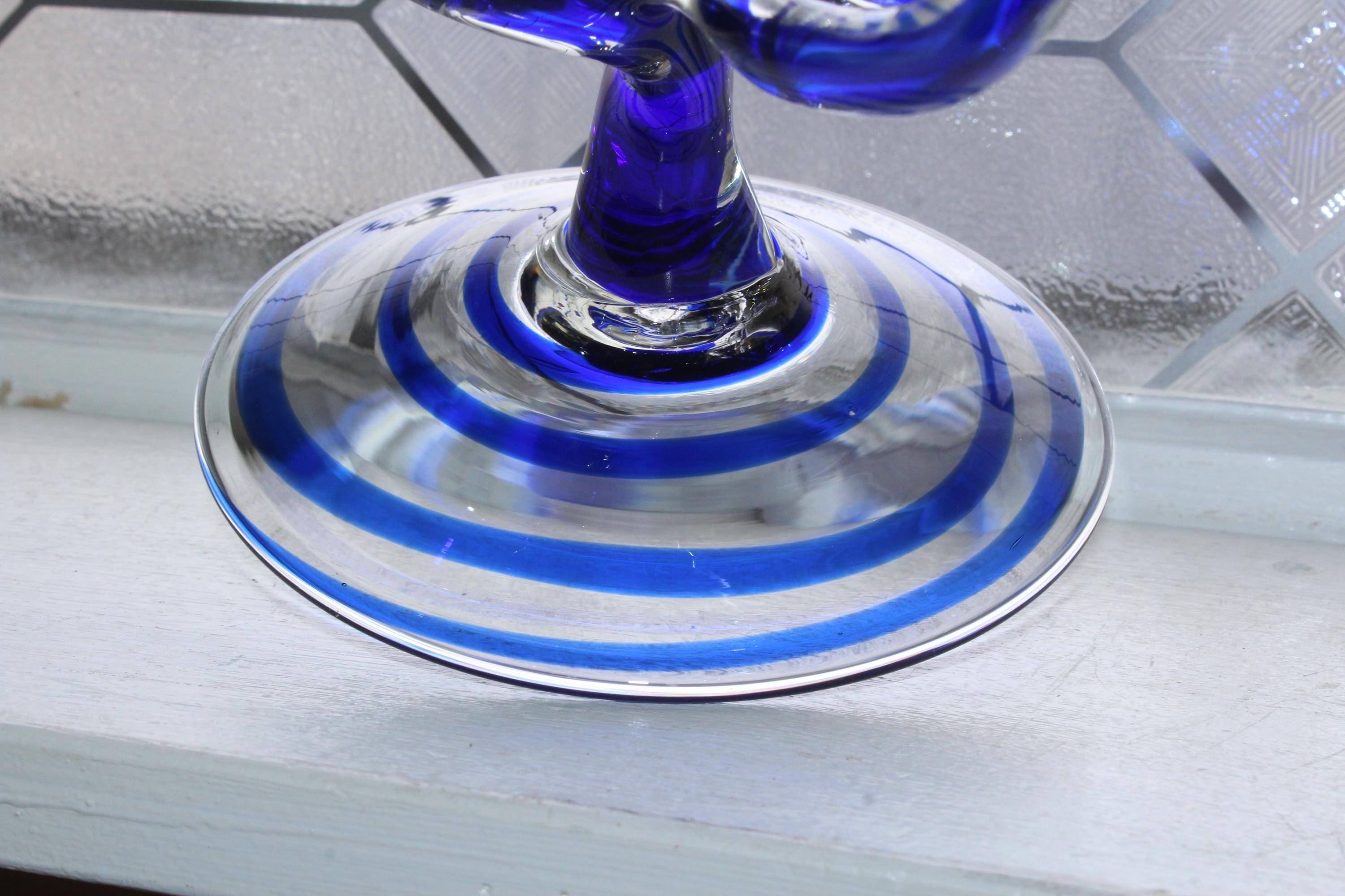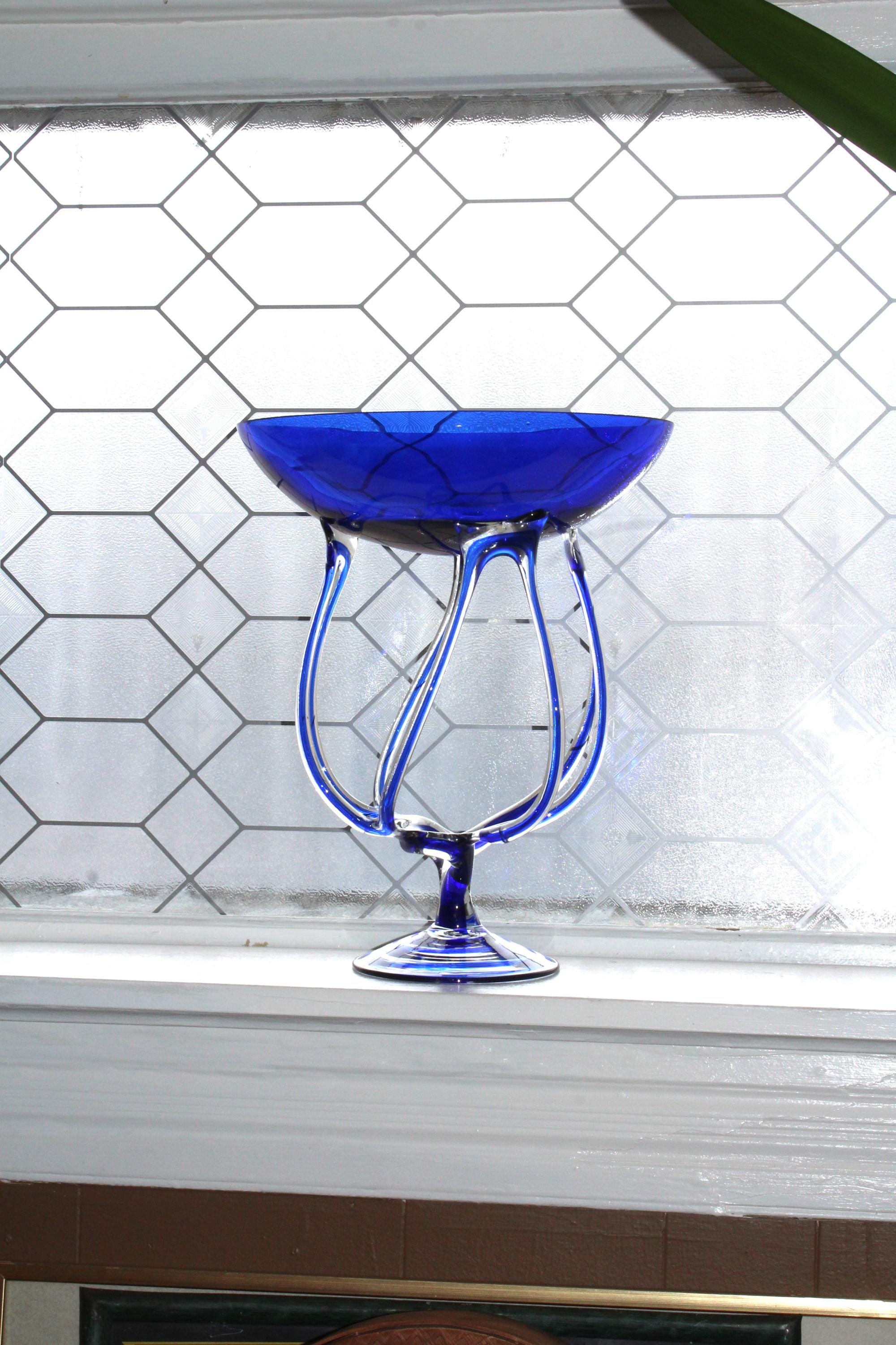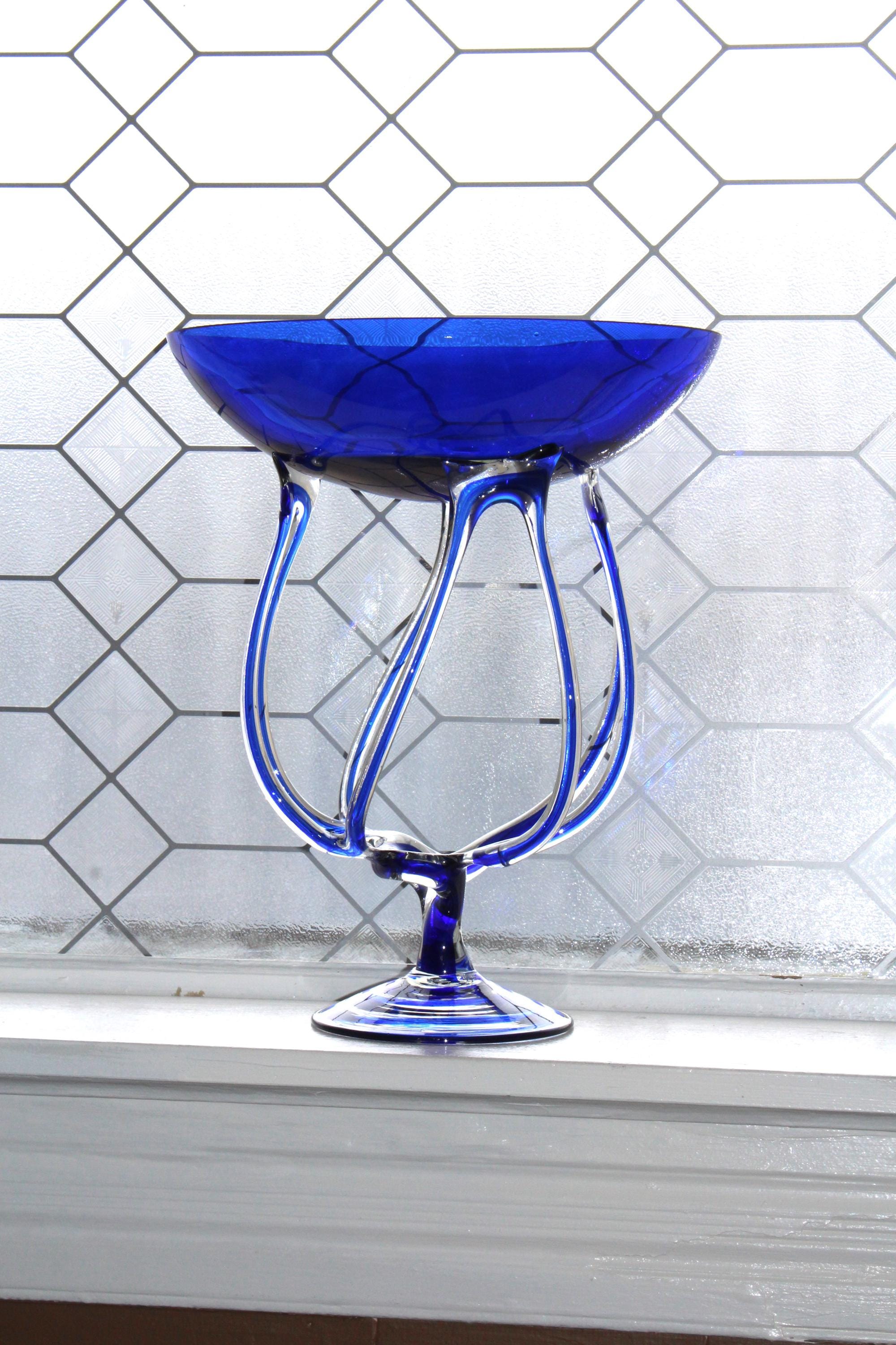 Large vintage blue and clear art glass compote/pedestal bowl, styled after a jellyfish and titled Jelly, made in Poland by Makora Krosno for Jozefina, in excellent condition. It measures 14 1/4" high x 11 1/2" wide, has no damage and looks fabulous. Enjoy!
