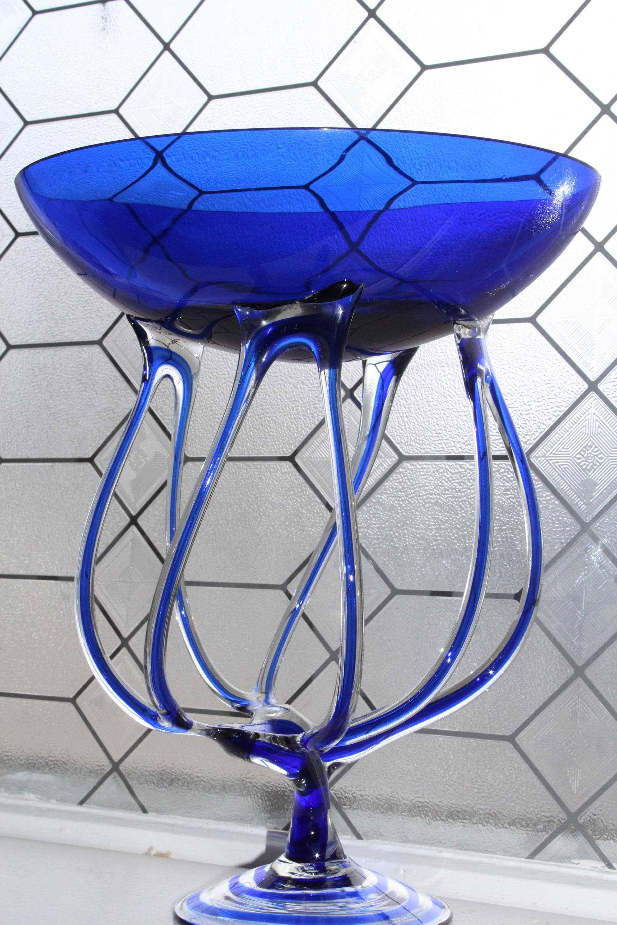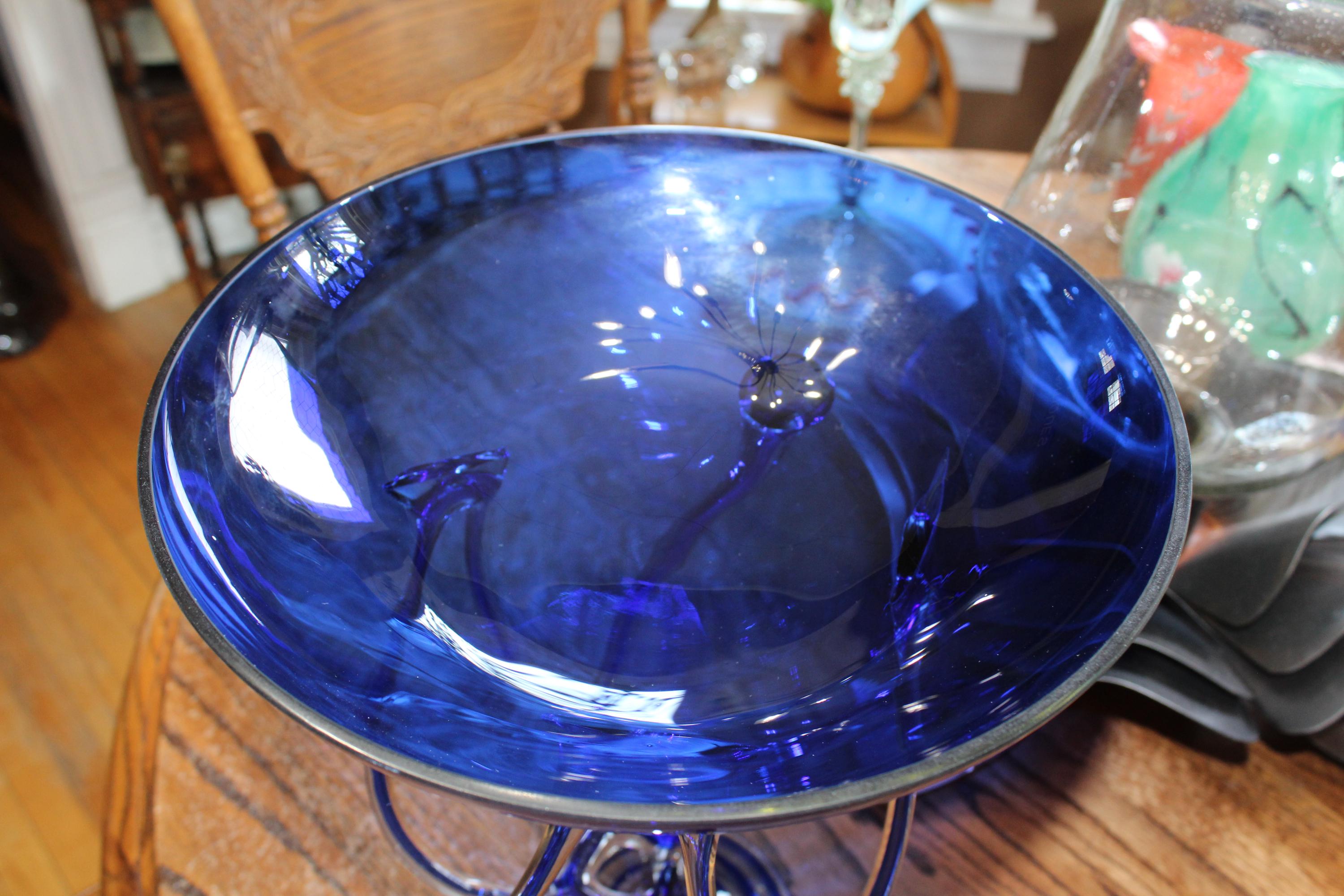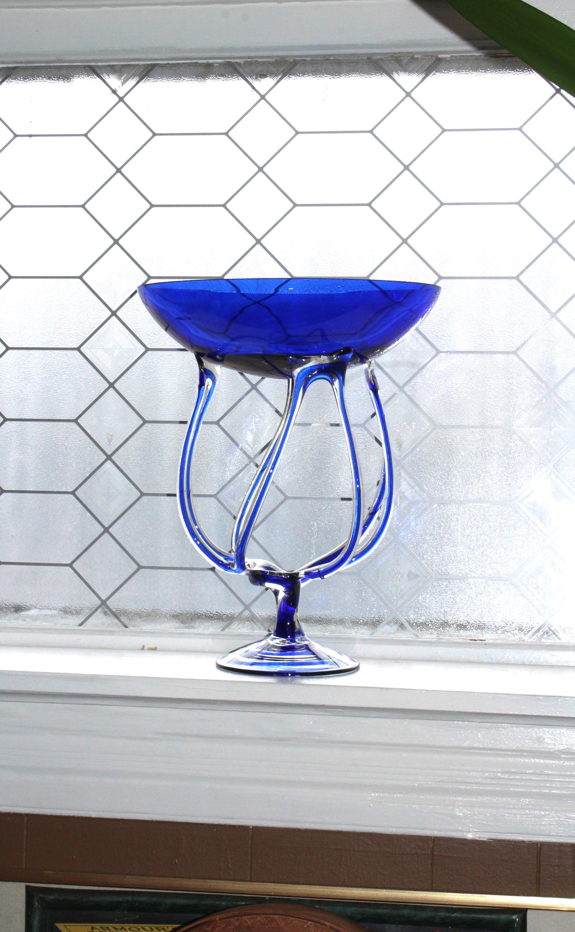 Large vintage blue and clear art glass compote/pedestal bowl, styled after a jellyfish and titled Jelly, made in Poland by Makora Krosno for Jozefina, in excellent condition. It measures 14 1/4" high x 11 1/2" wide, has no damage and looks fabulous. Enjoy!