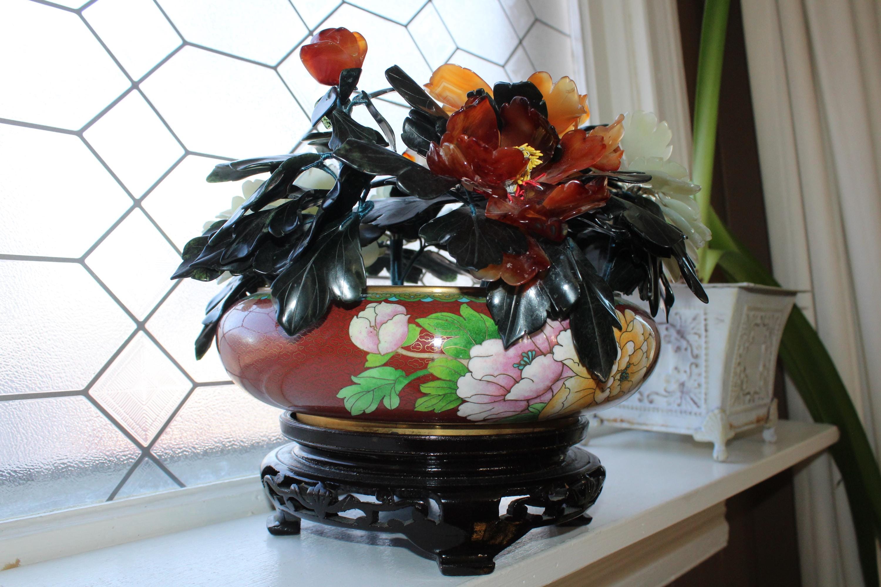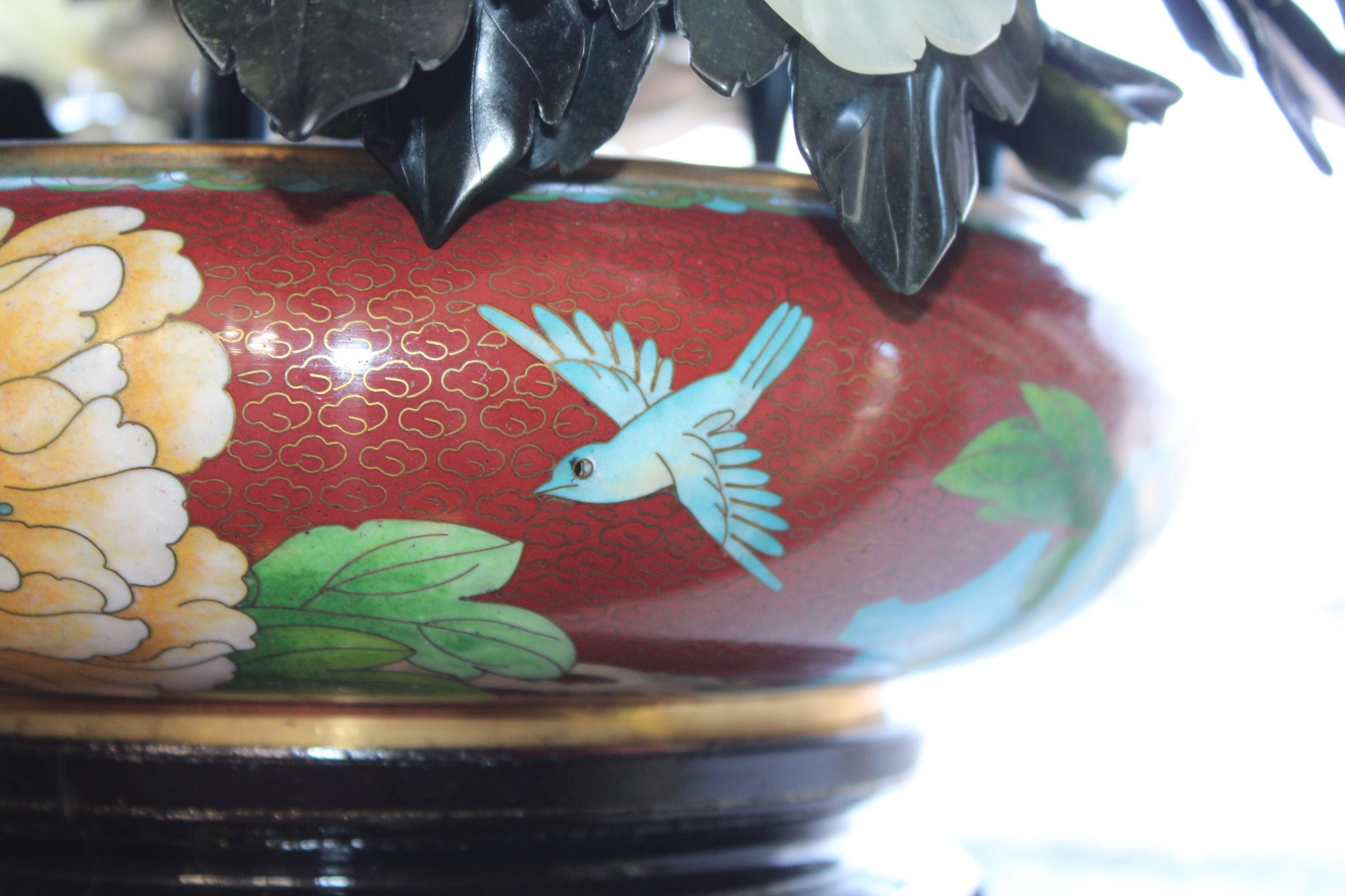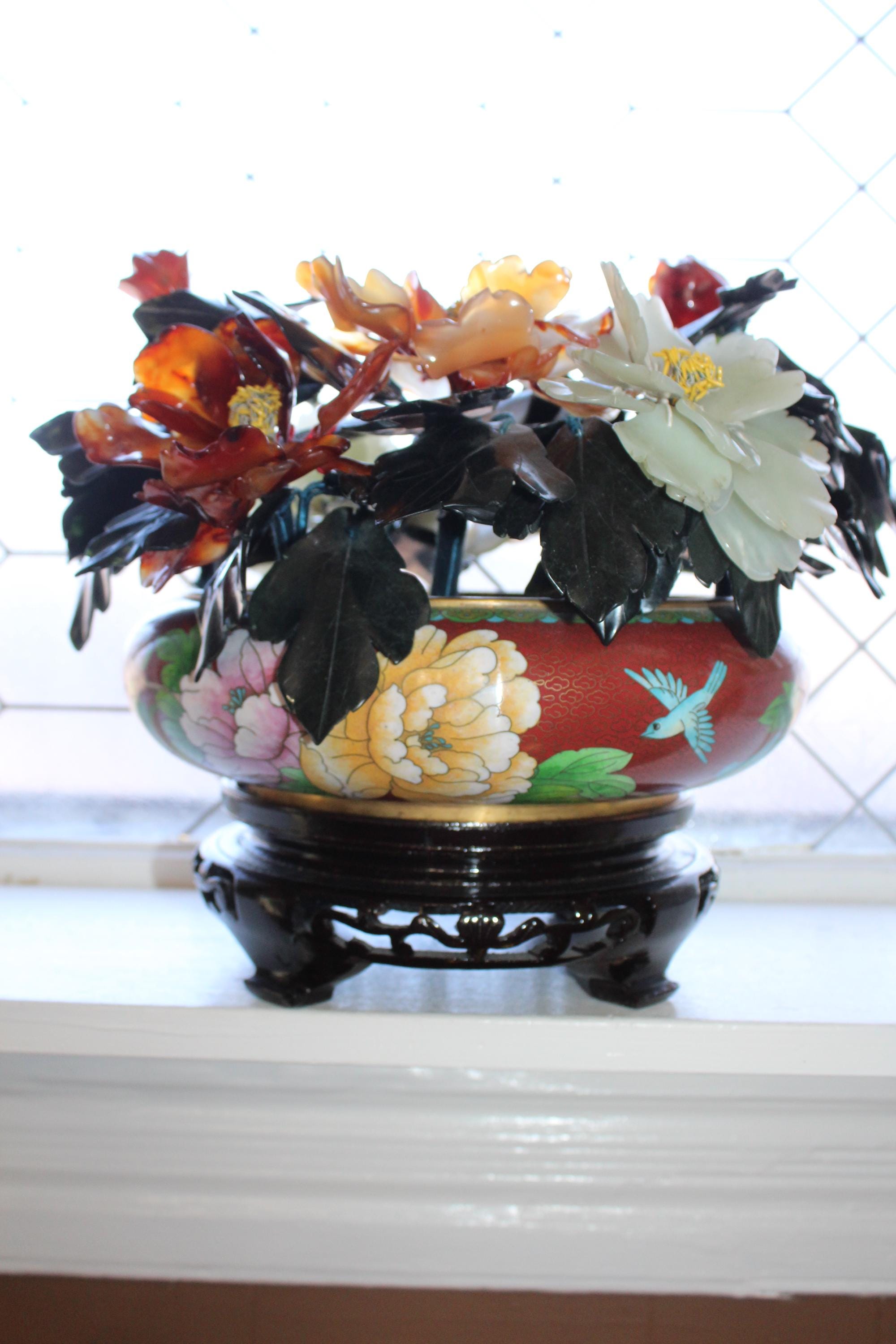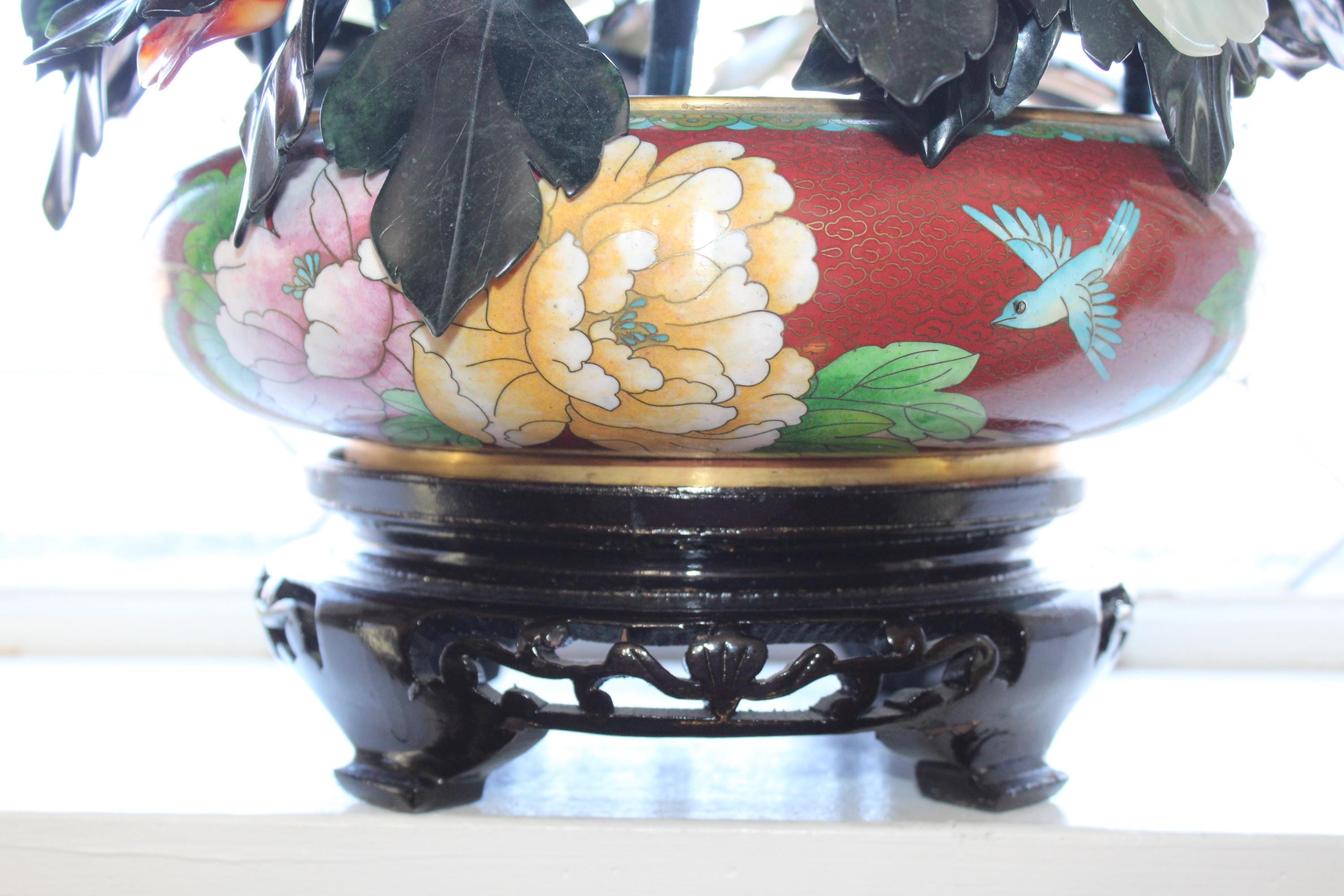 Large vintage Chinese cloisonné planter on a wood stand with a beautiful bonsai carved stone floral arrangement, in excellent condition. It measures 13" wide x 11" high including the stand. No damage. Enjoy!