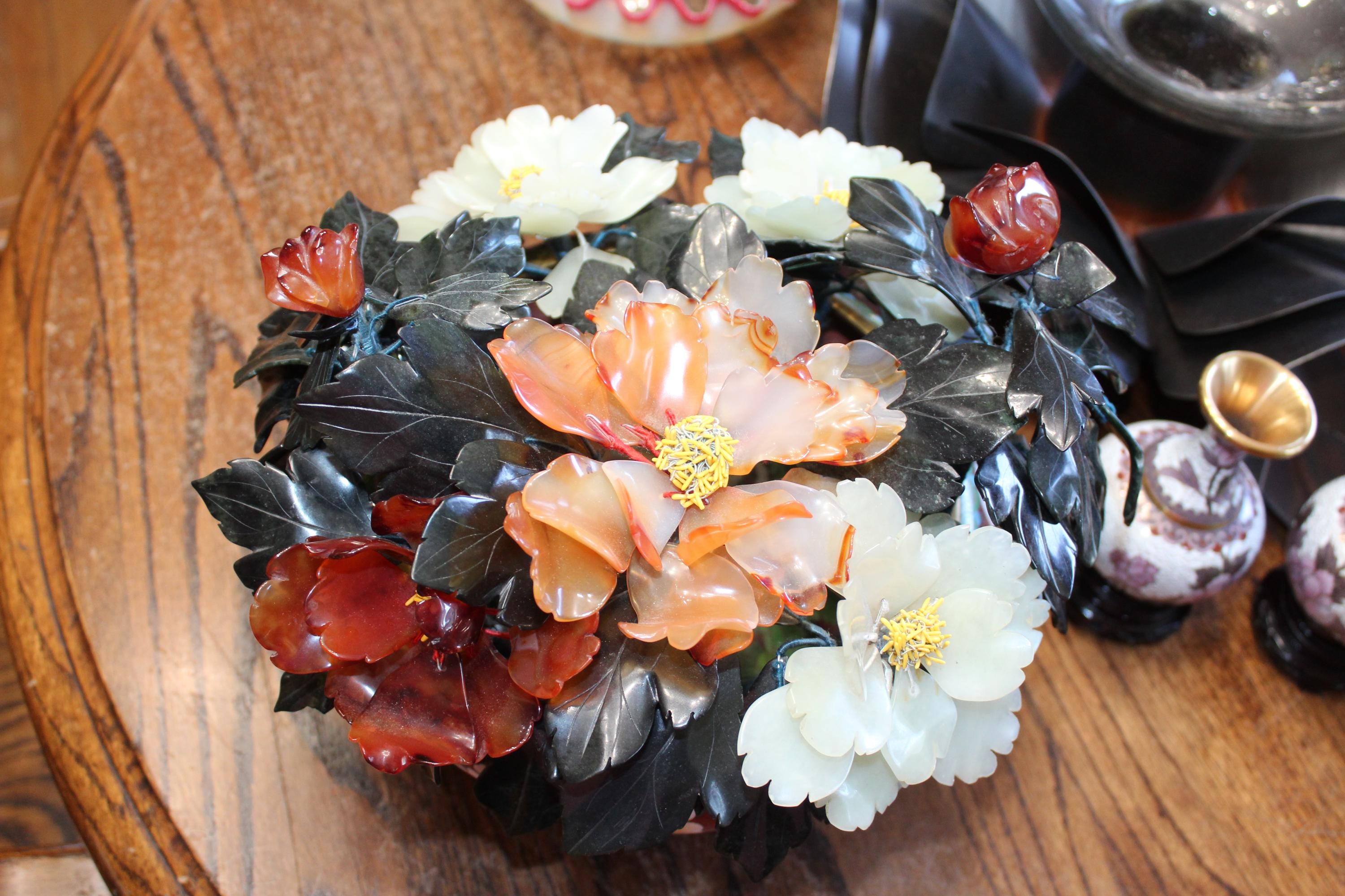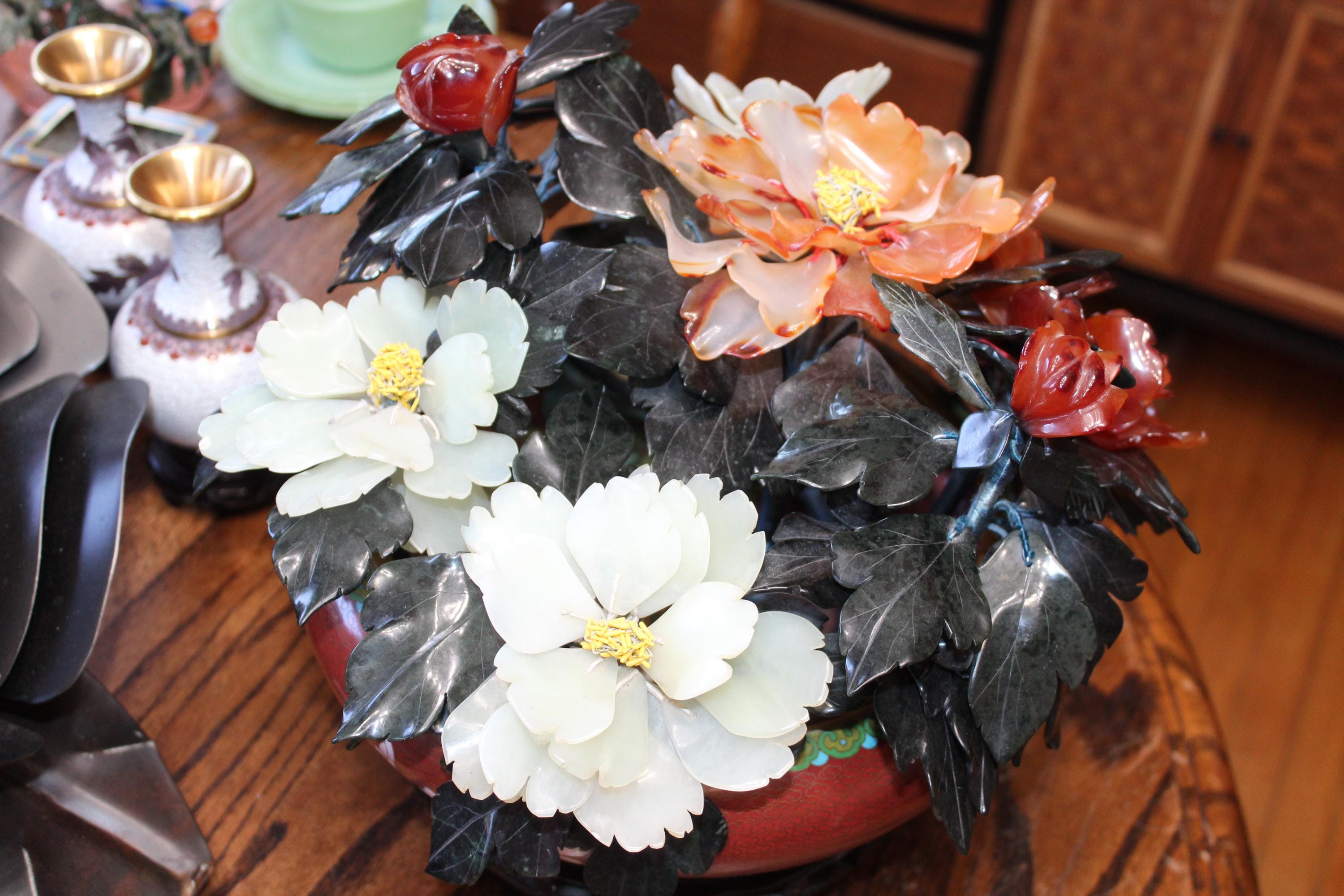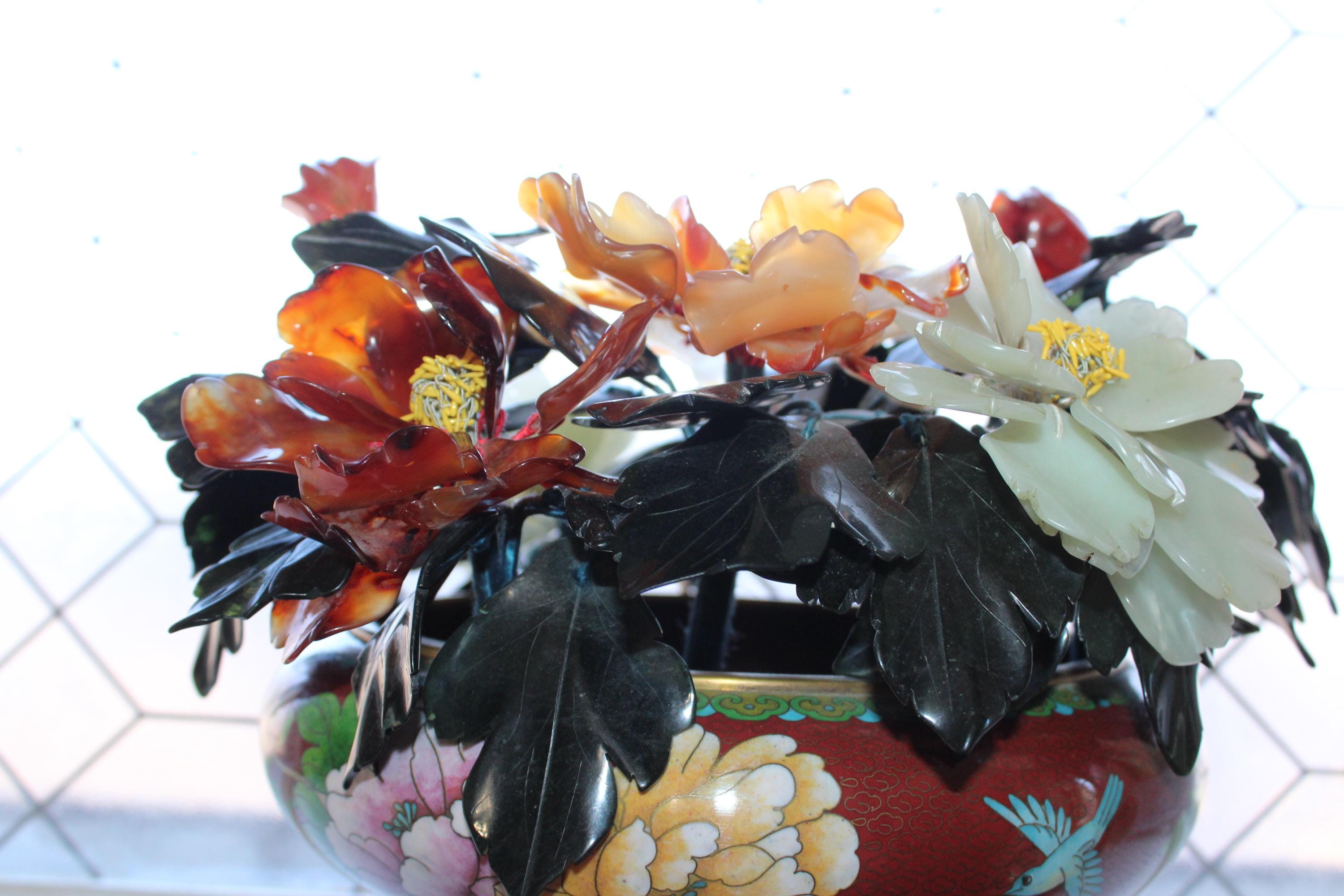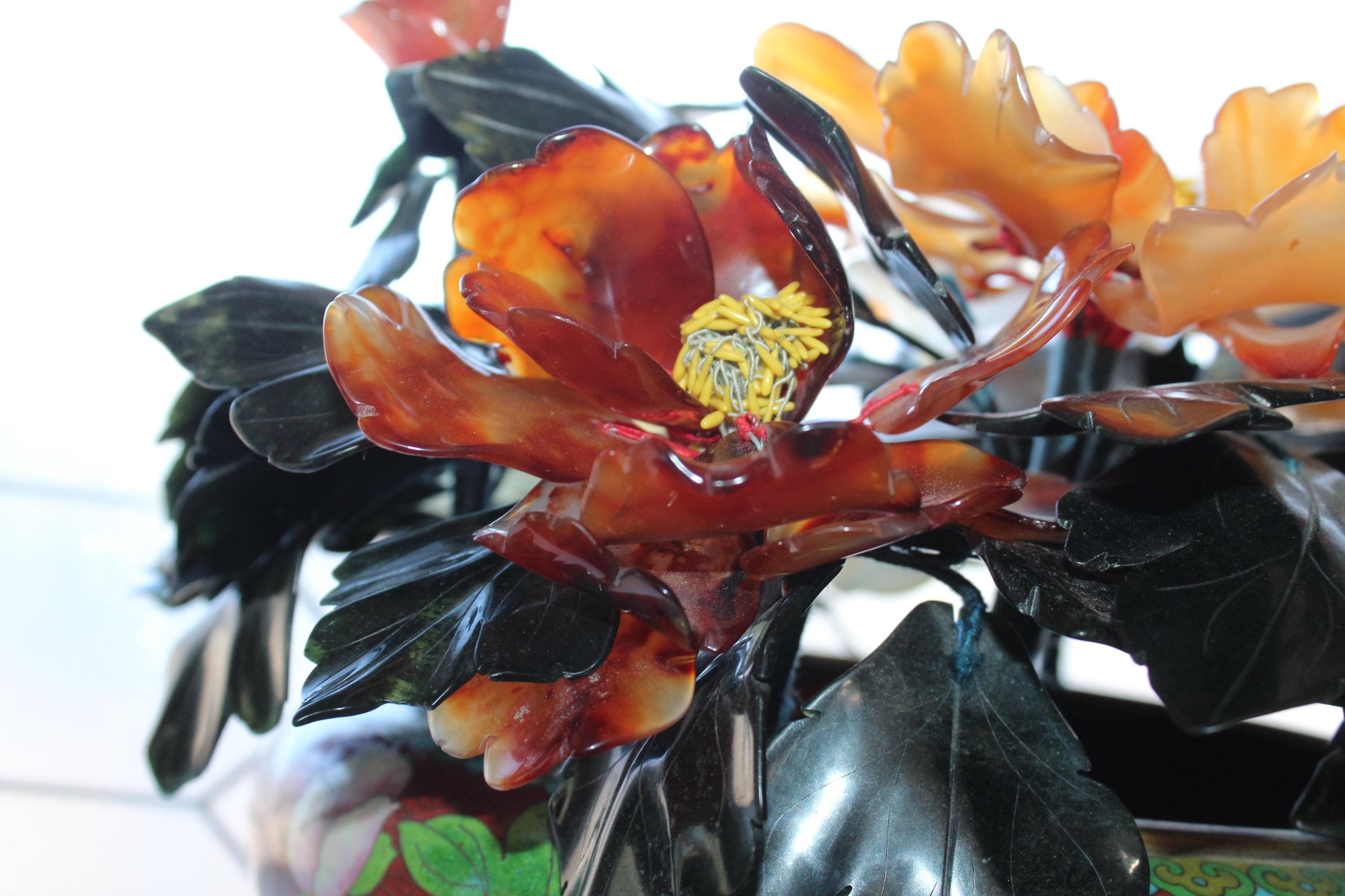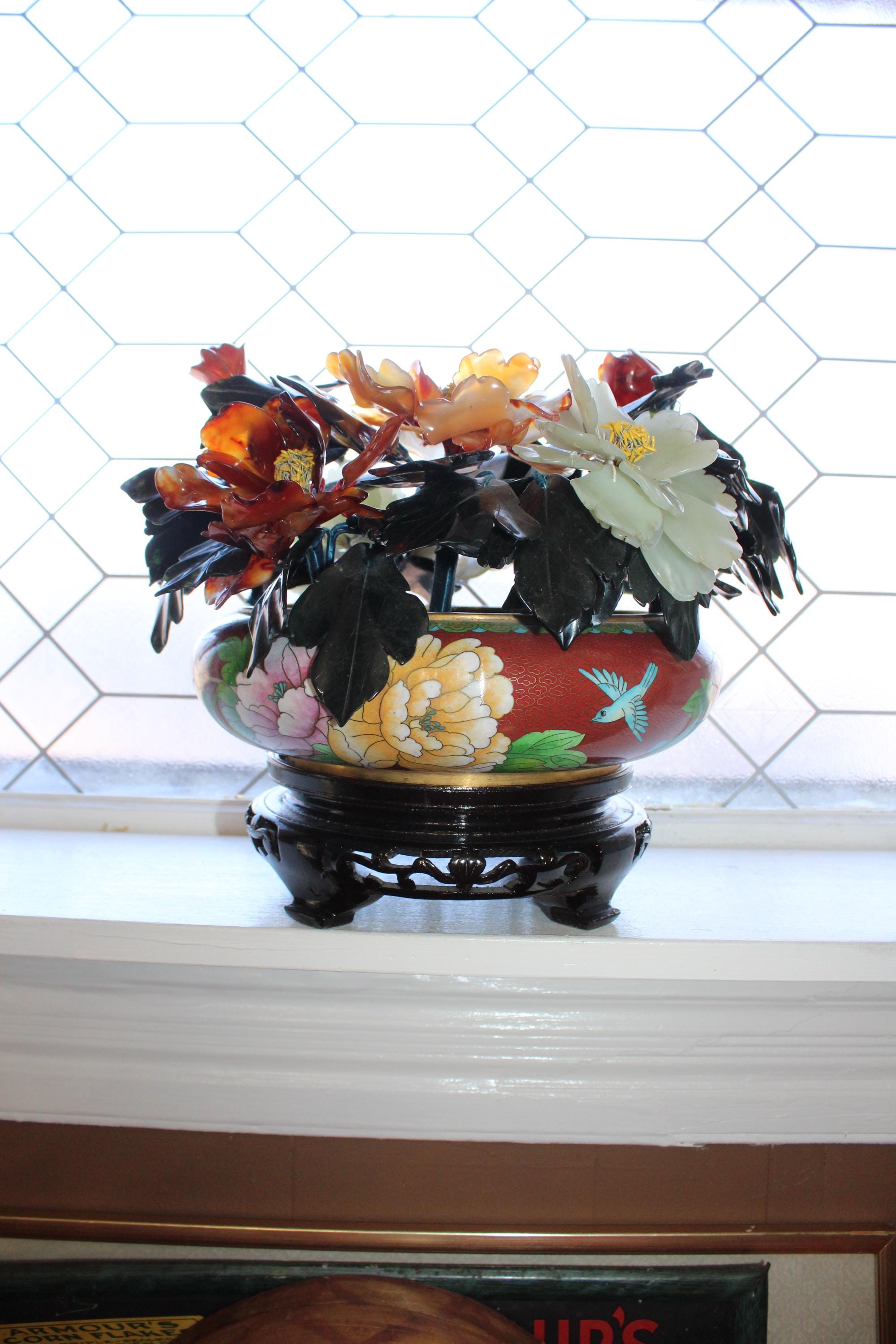 Large vintage Chinese cloisonné planter on a wood stand with a beautiful bonsai carved stone floral arrangement, in excellent condition. It measures 13" wide x 11" high including the stand. No damage. Enjoy!