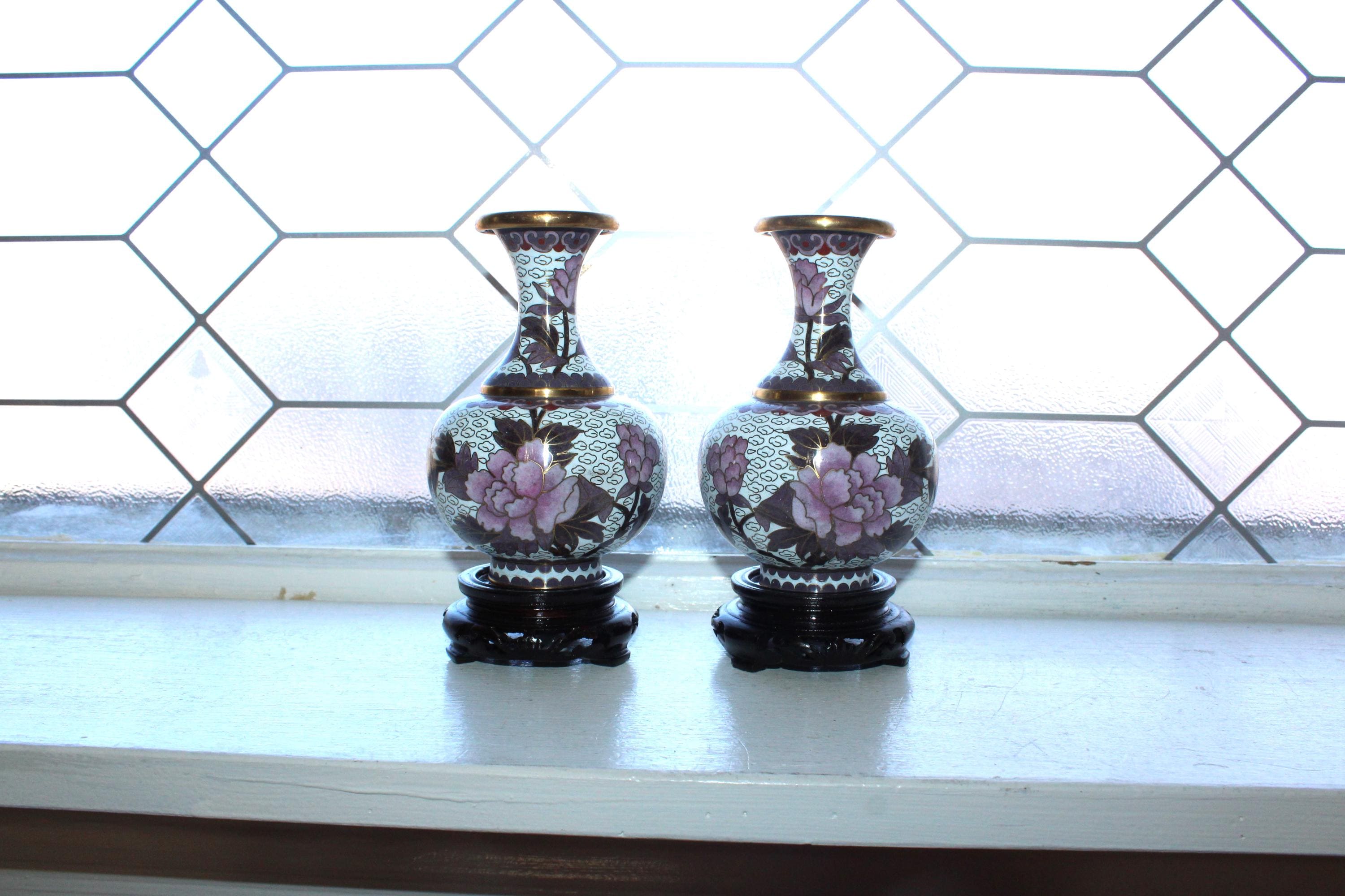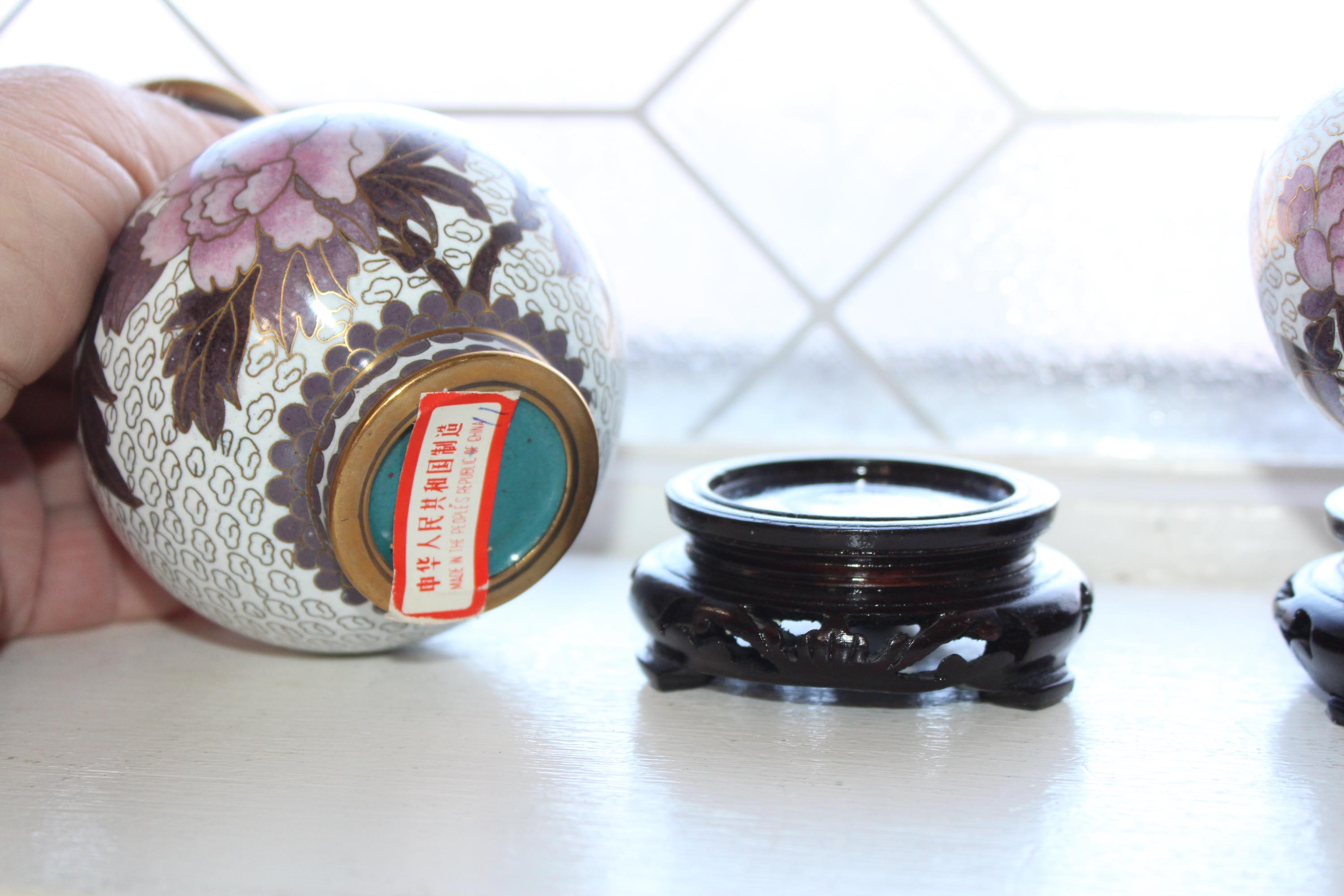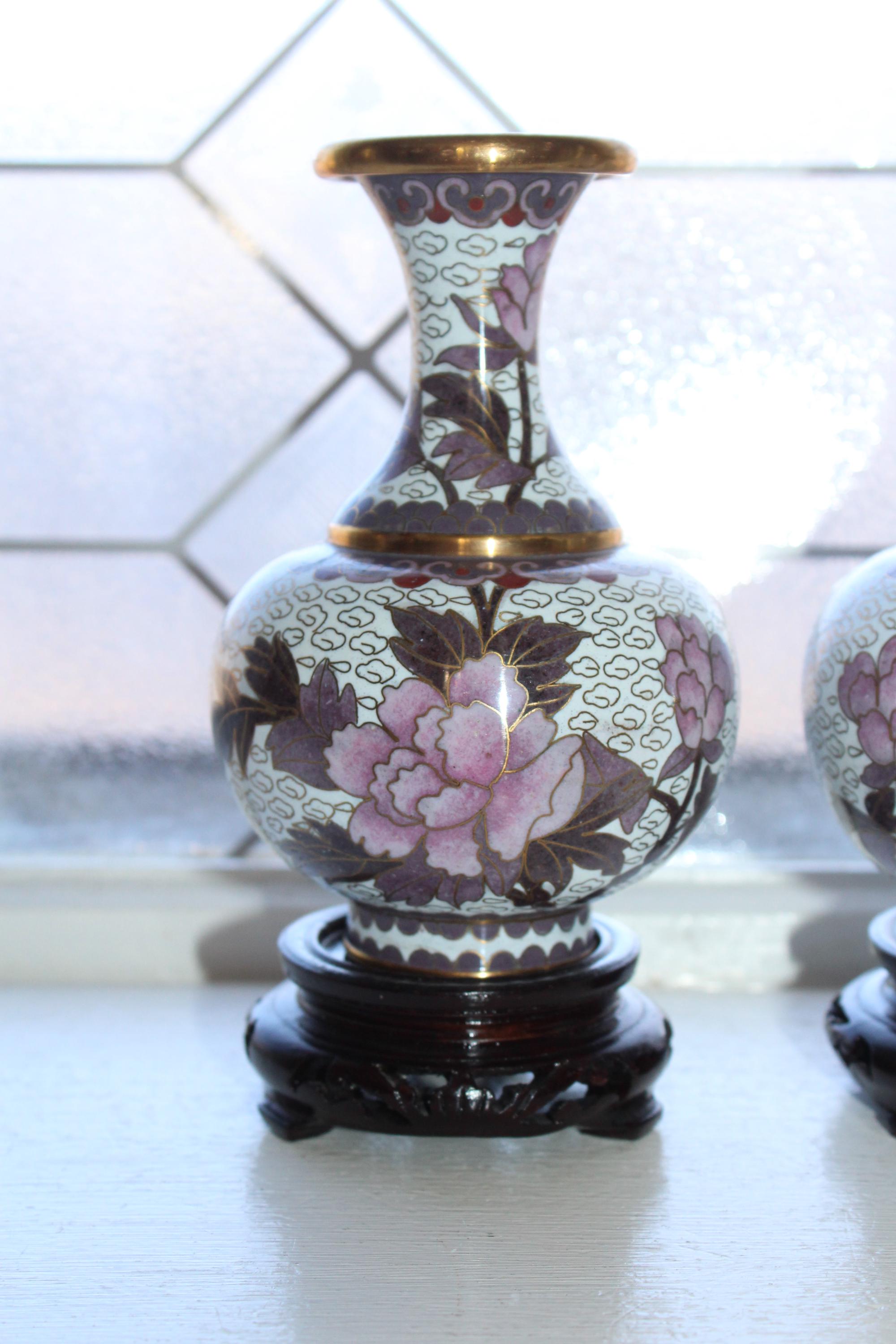 Pair of vintage Chinese cloisonné white and mauve vases with wooden stands, in excellent condition. The vases measure 6" high with the stands. Enjoy!
