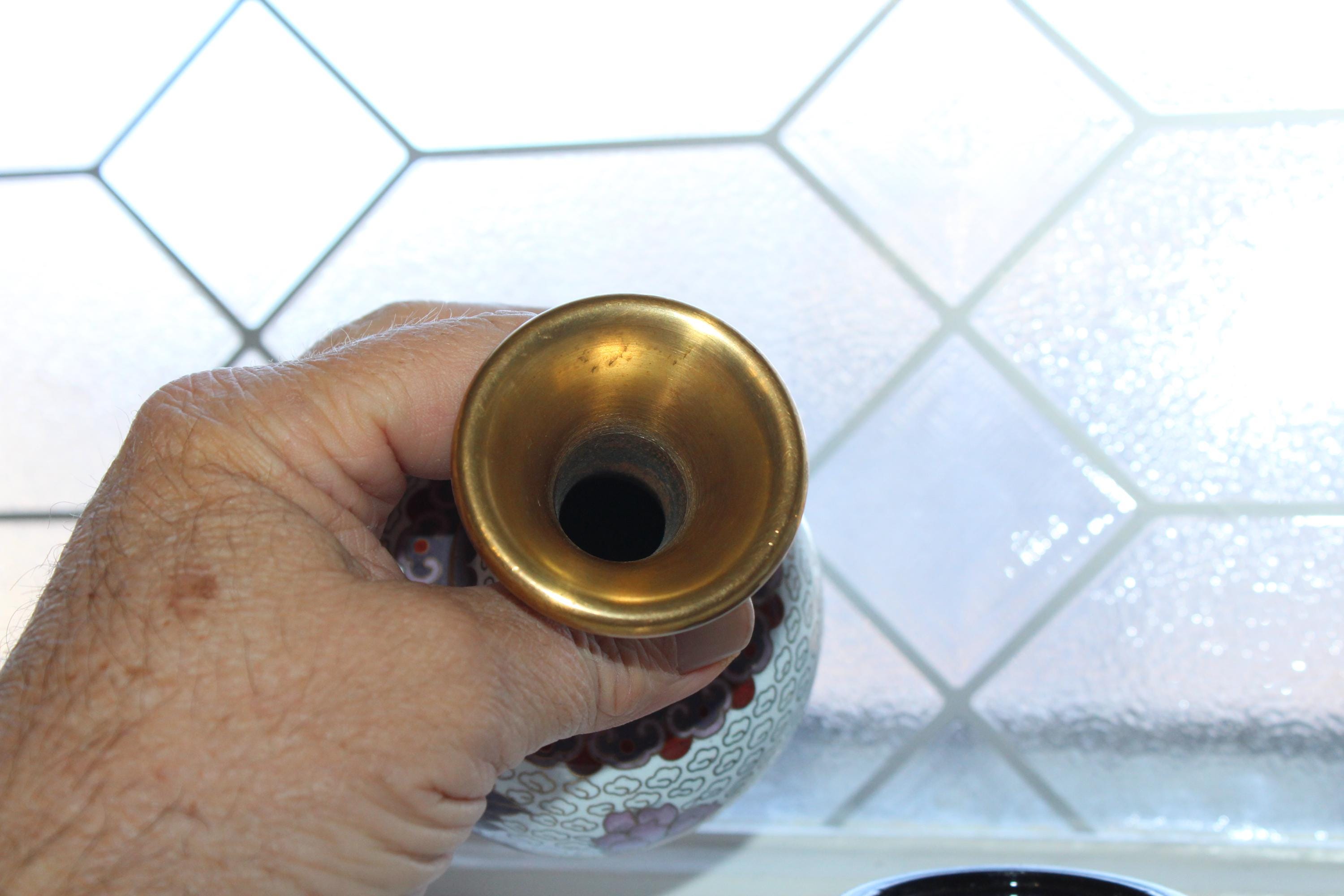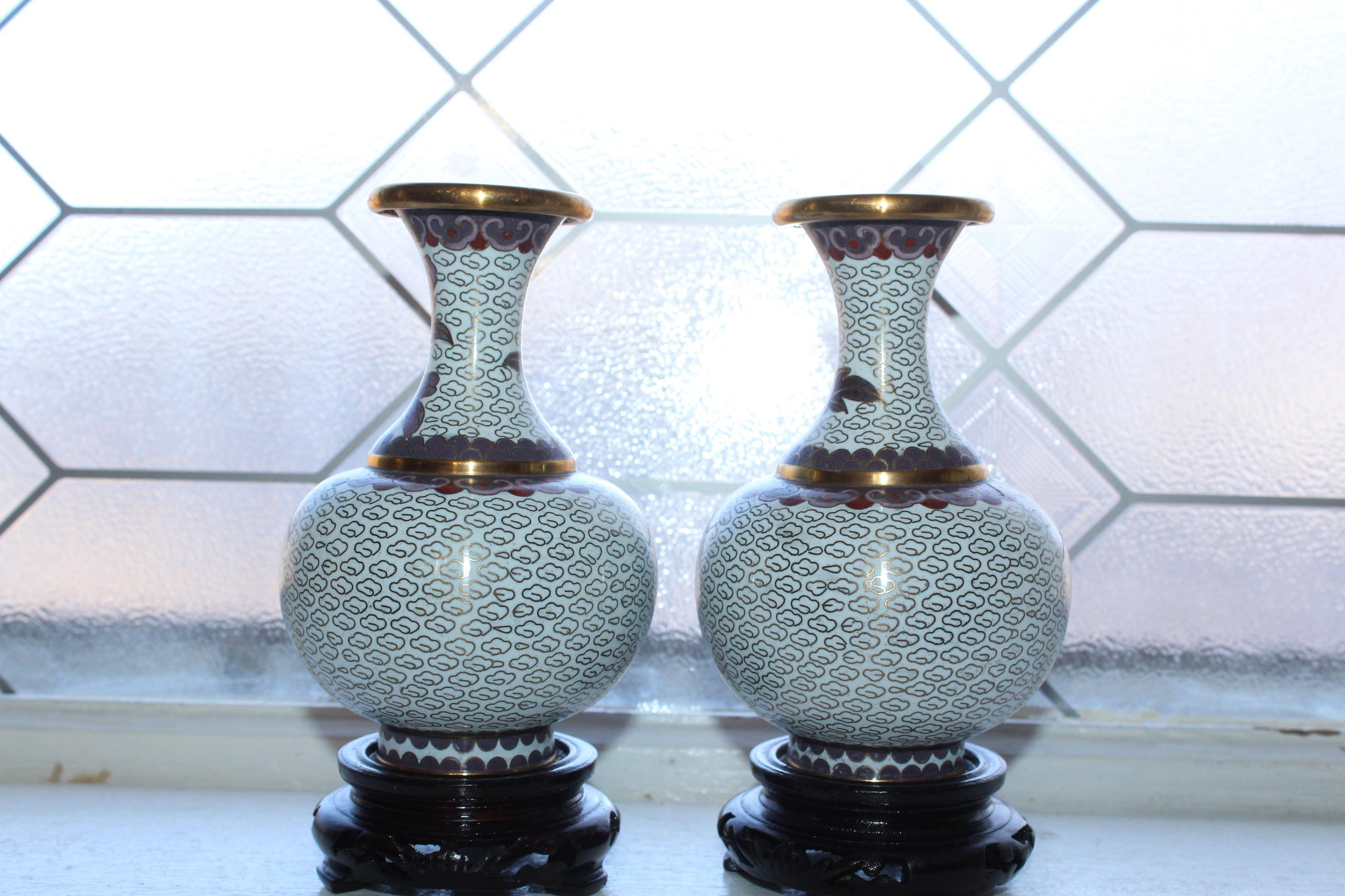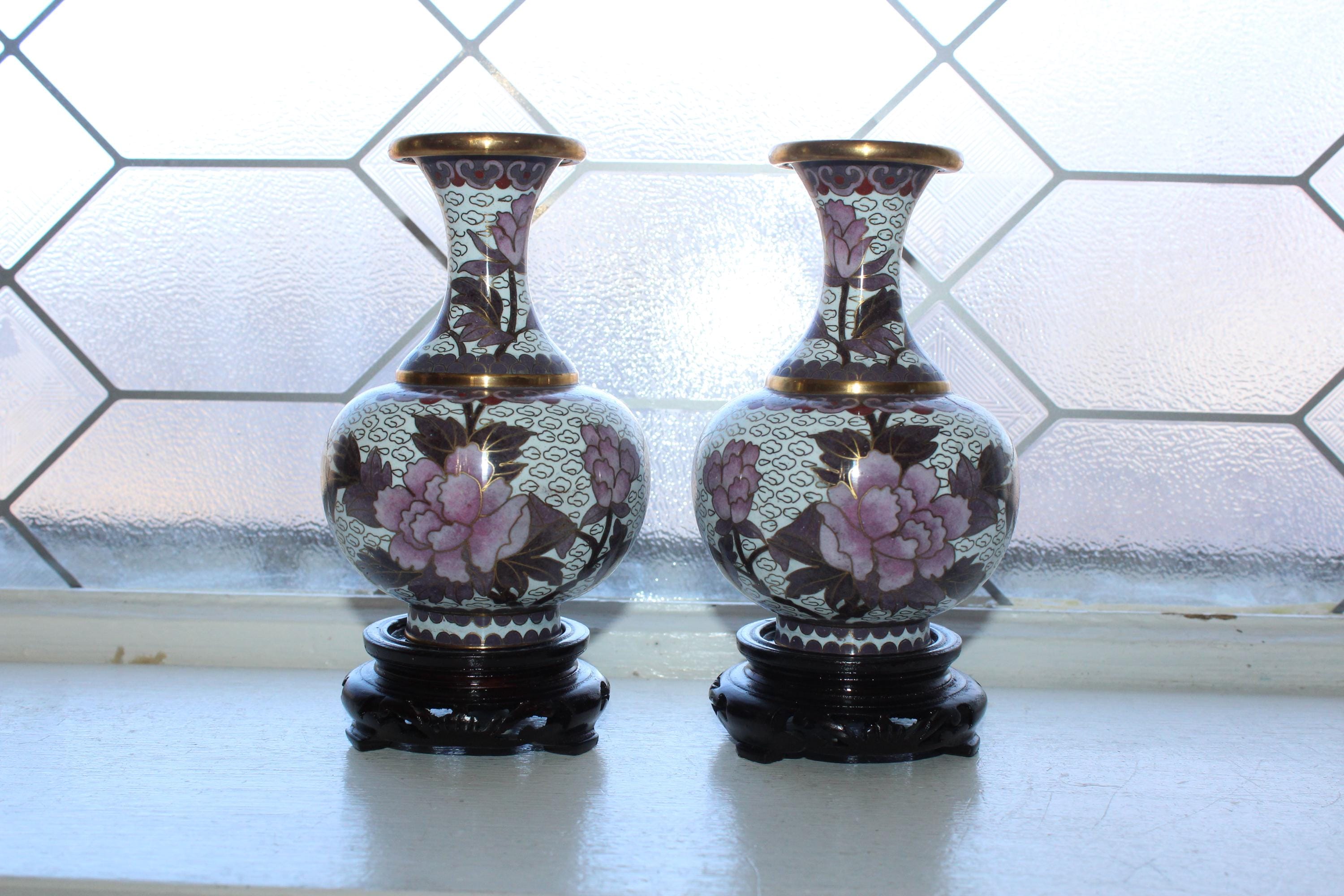 Pair of vintage Chinese cloisonné white and mauve vases with wooden stands, in excellent condition. The vases measure 6" high with the stands. Enjoy!