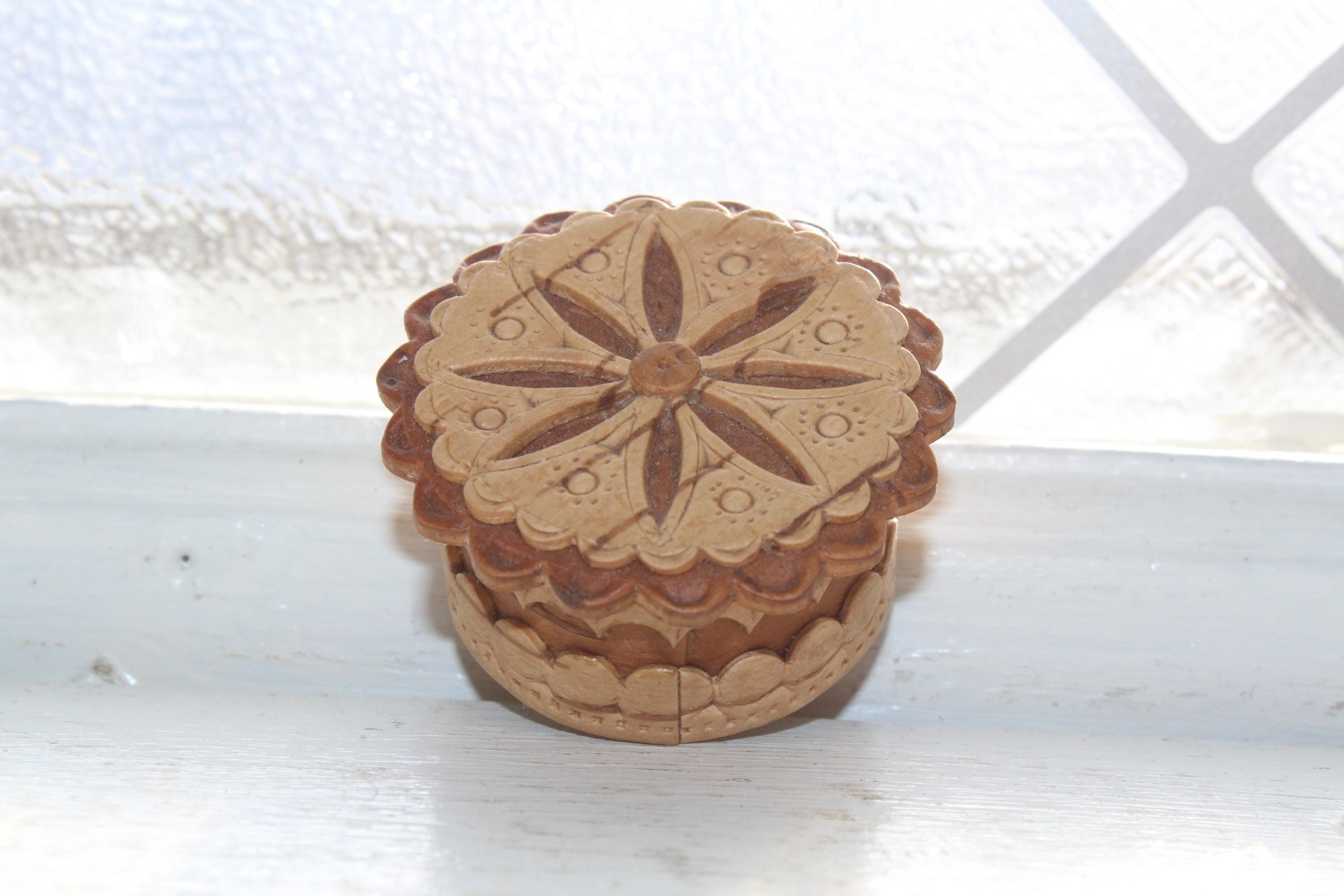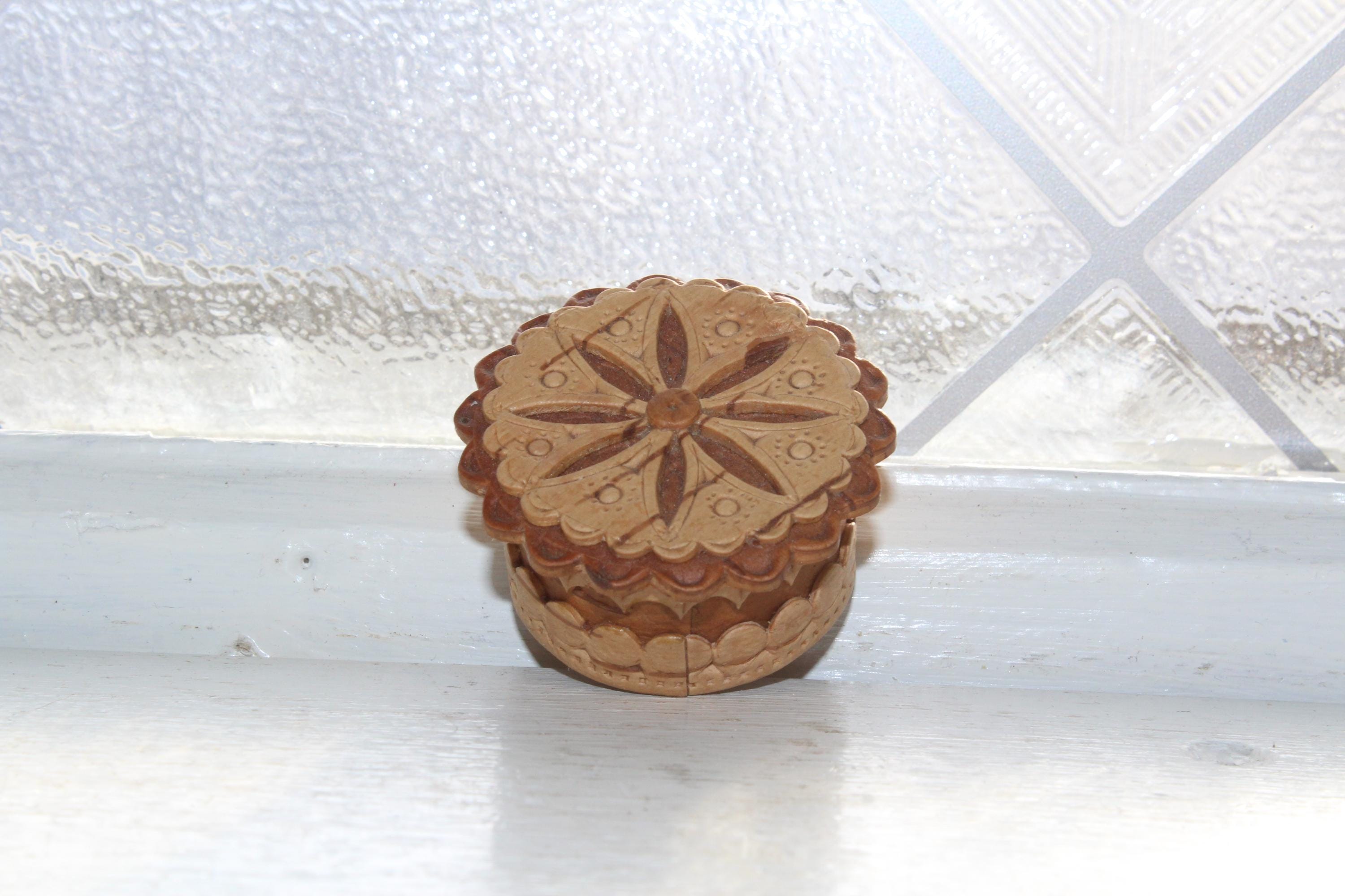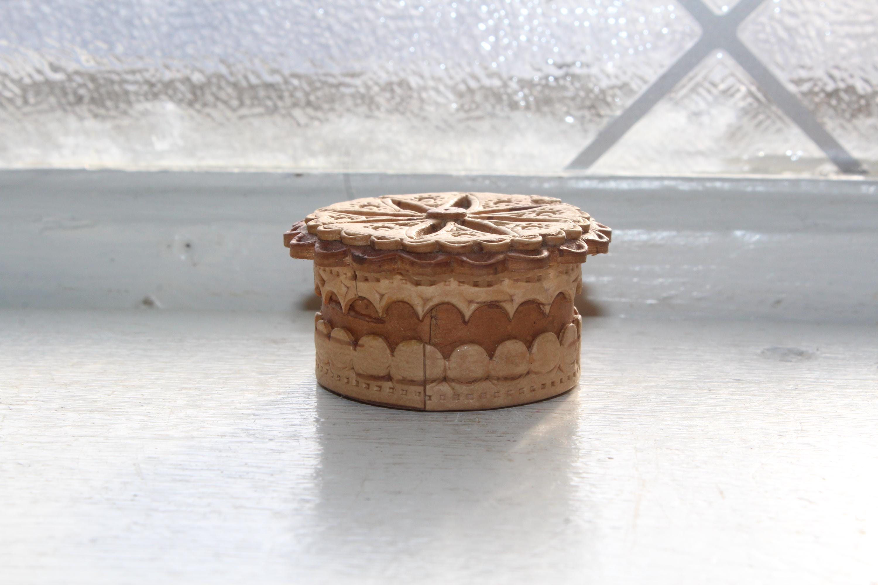 Vintage Russian handmade birch bark trinket box. It measures 1 3/4" wide x 1" high. Enjoy!