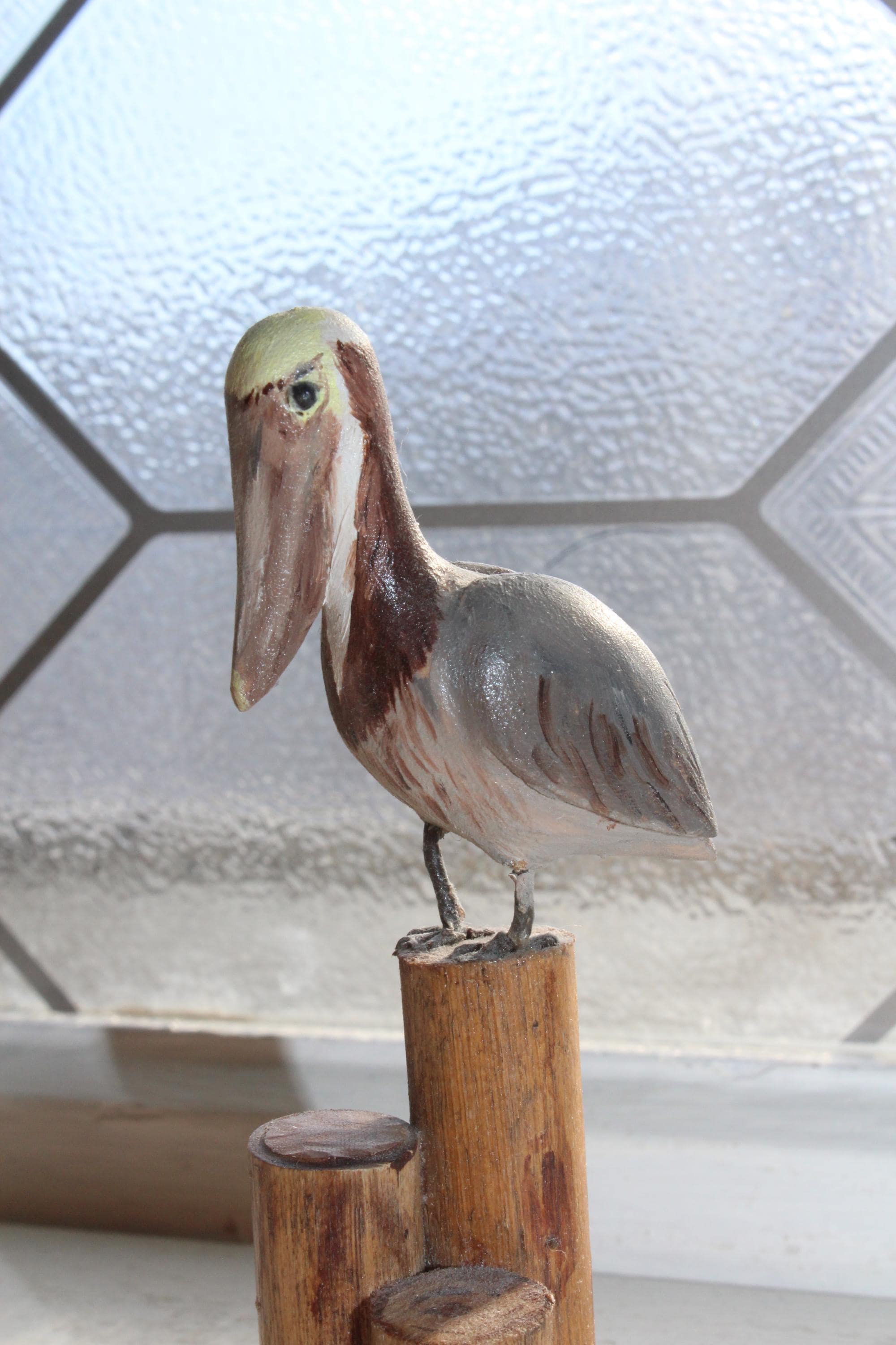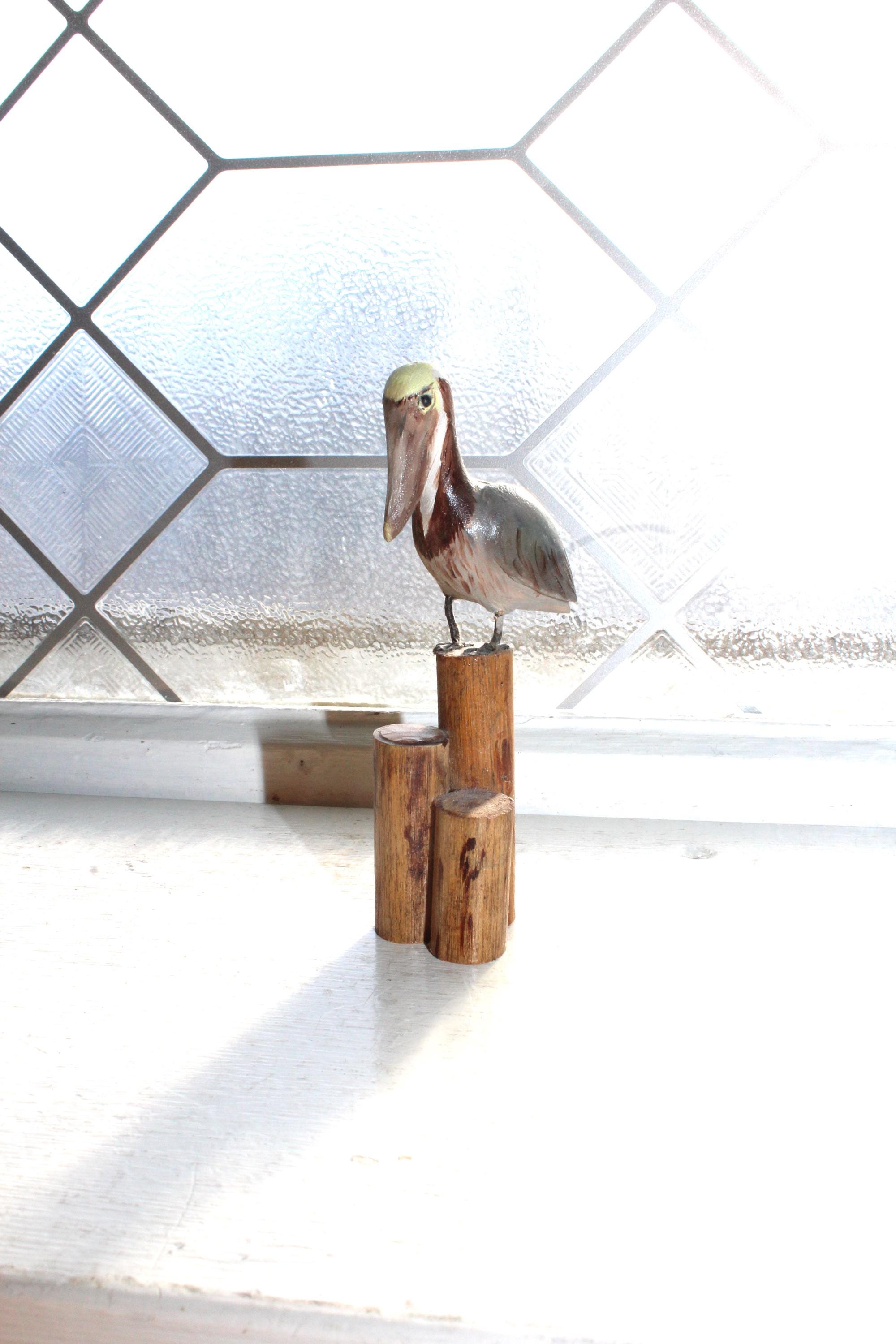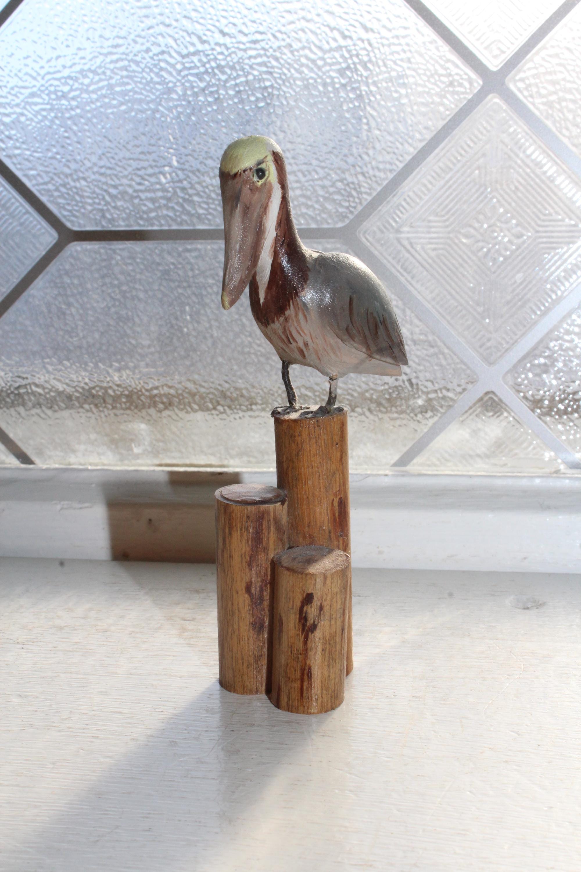 This is a vintage folk art hand carved wood pelican on a stump figurine by Rex Emerson, in excellent condition. It measures 4" high. No chips. Enjoy!