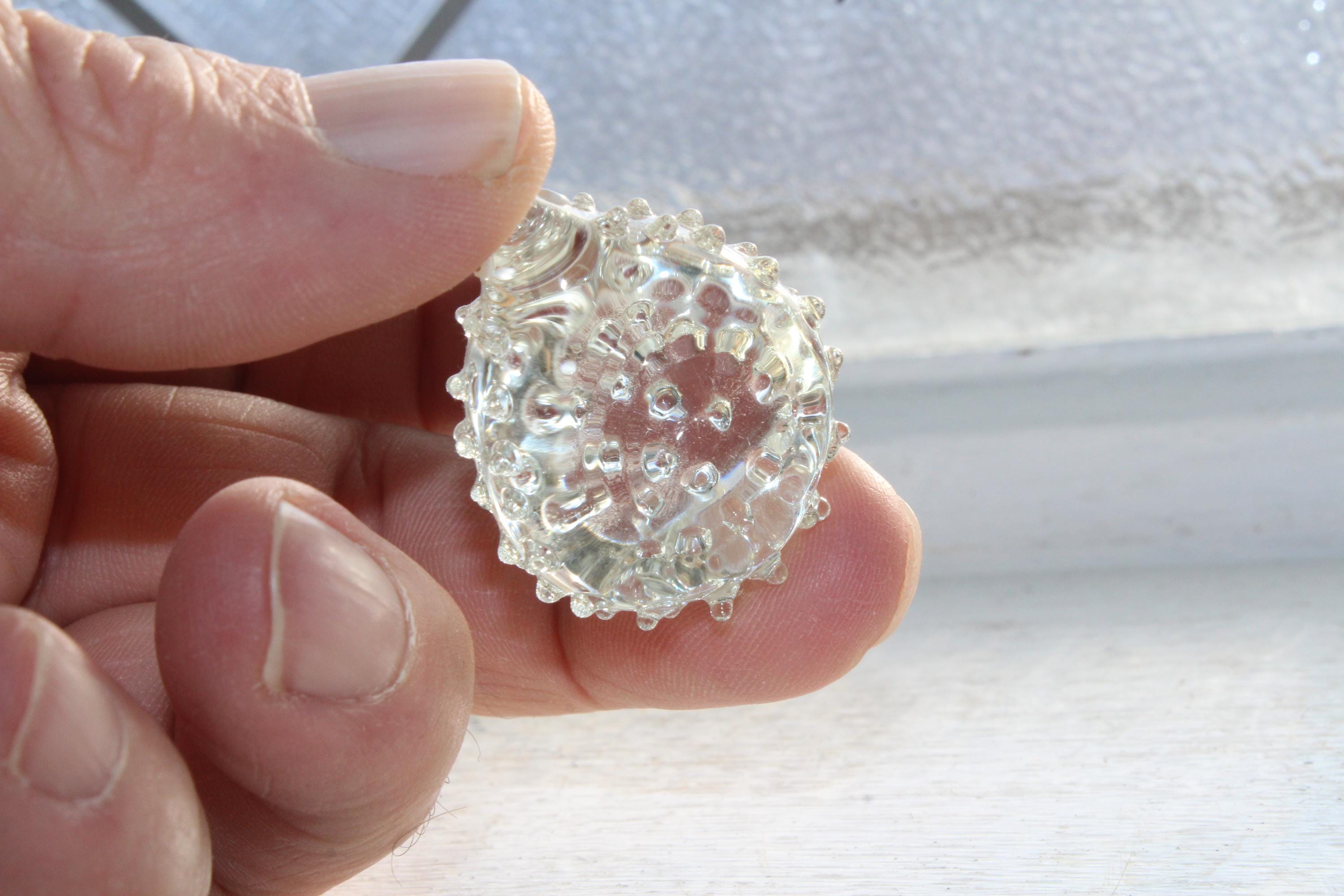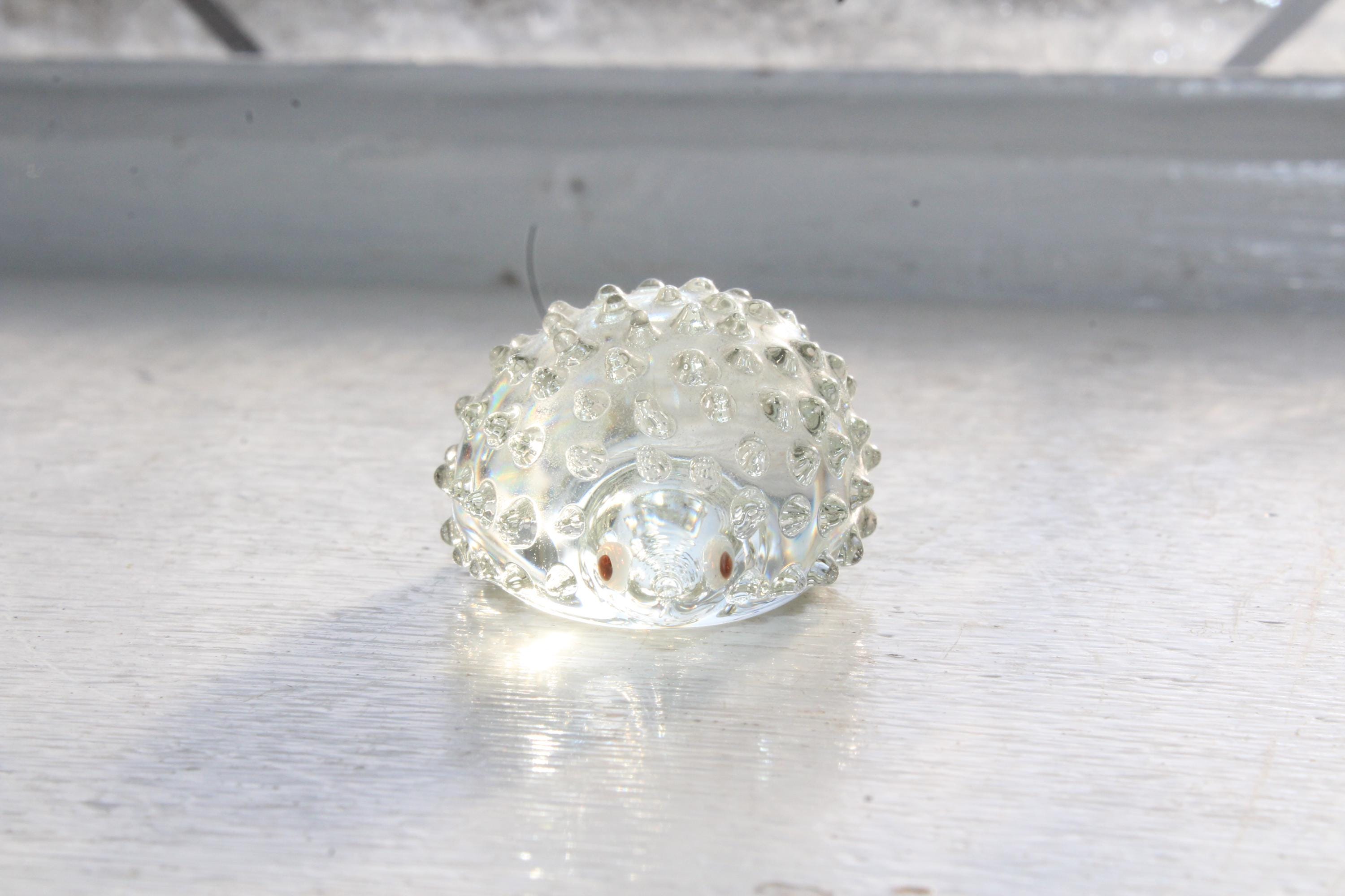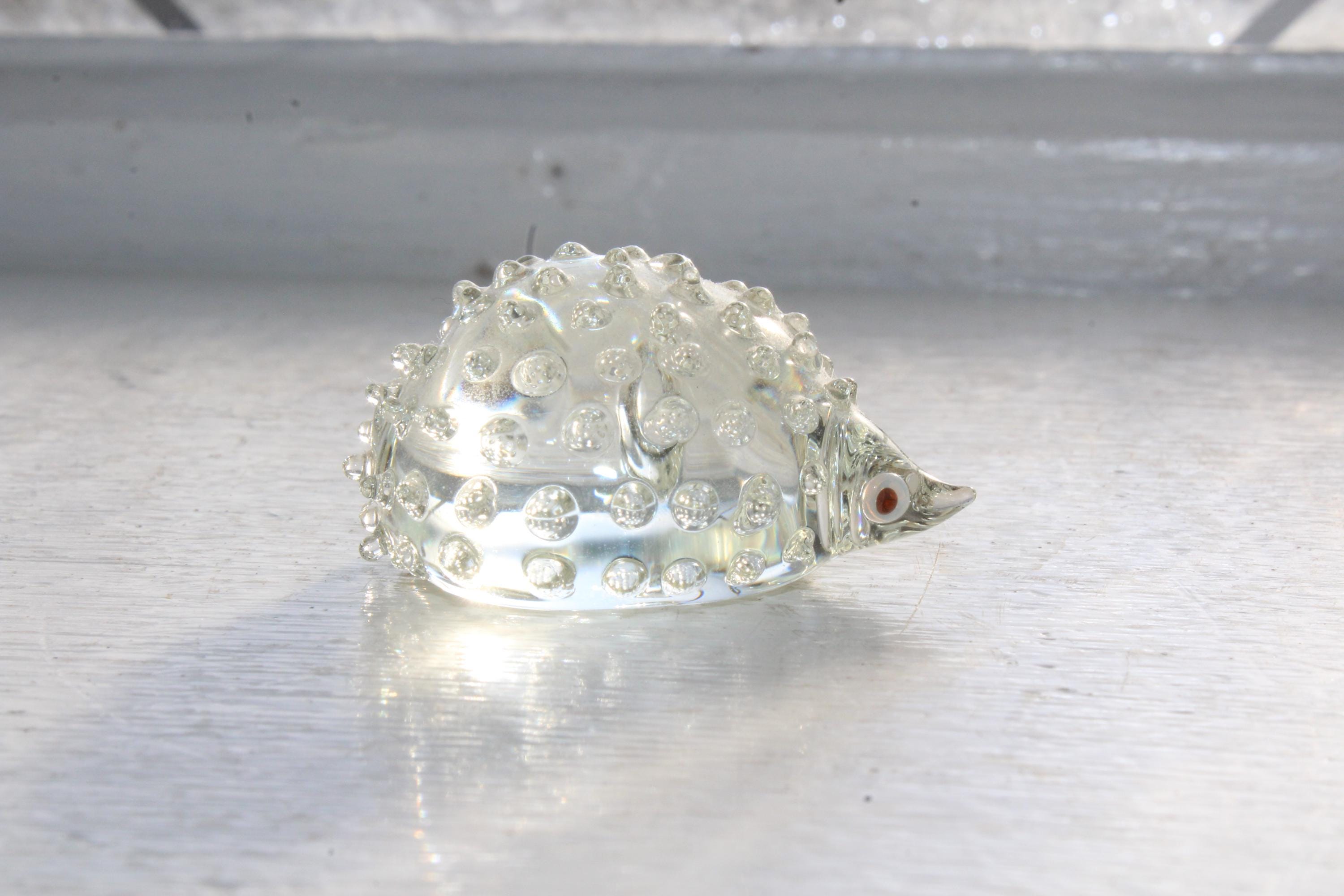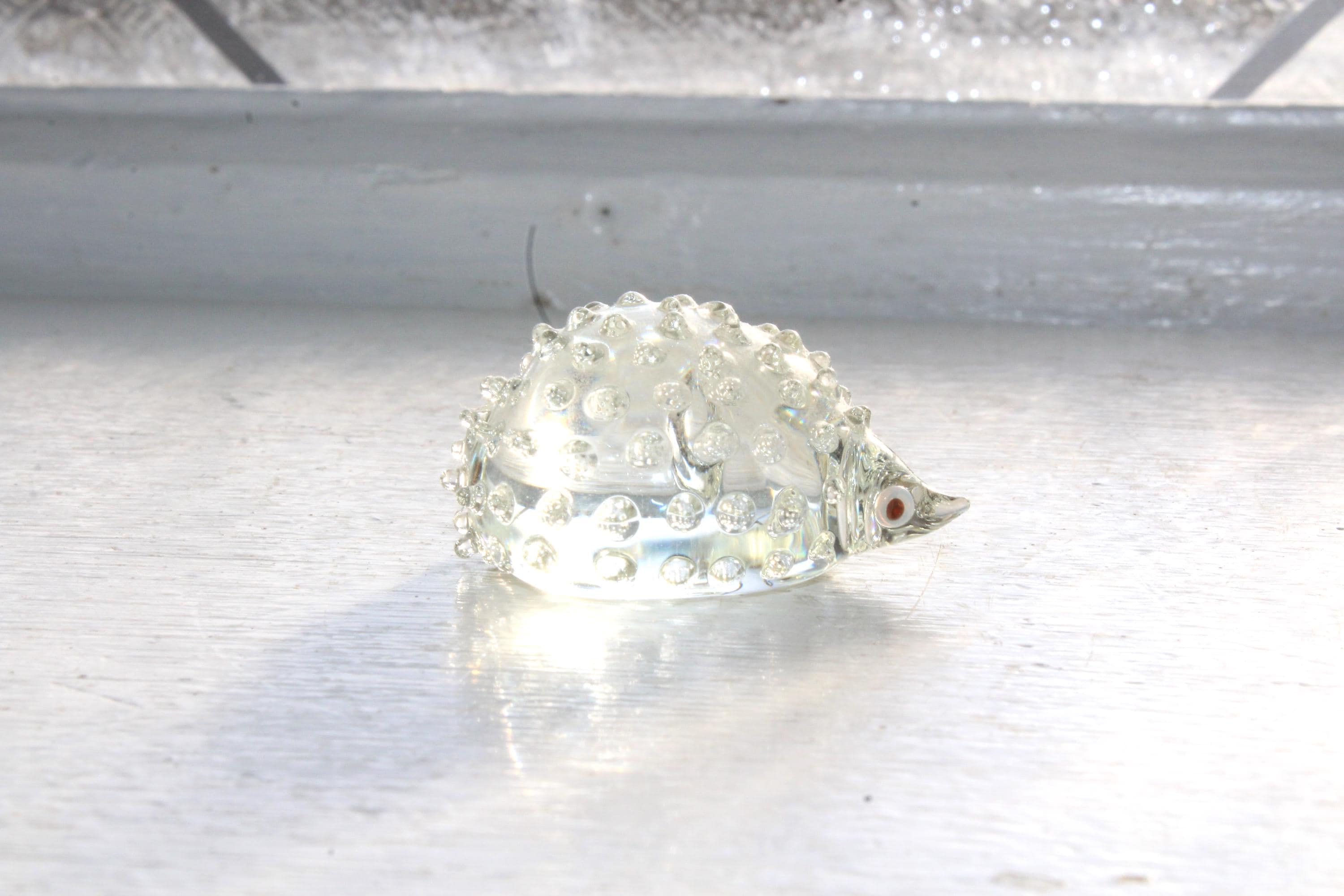 Vintage miniature crystal hedgehog figurine with red eyes, in excellent condition. It measures 1 1/2" long. No chips or cracks, perfect for use or display. Enjoy!