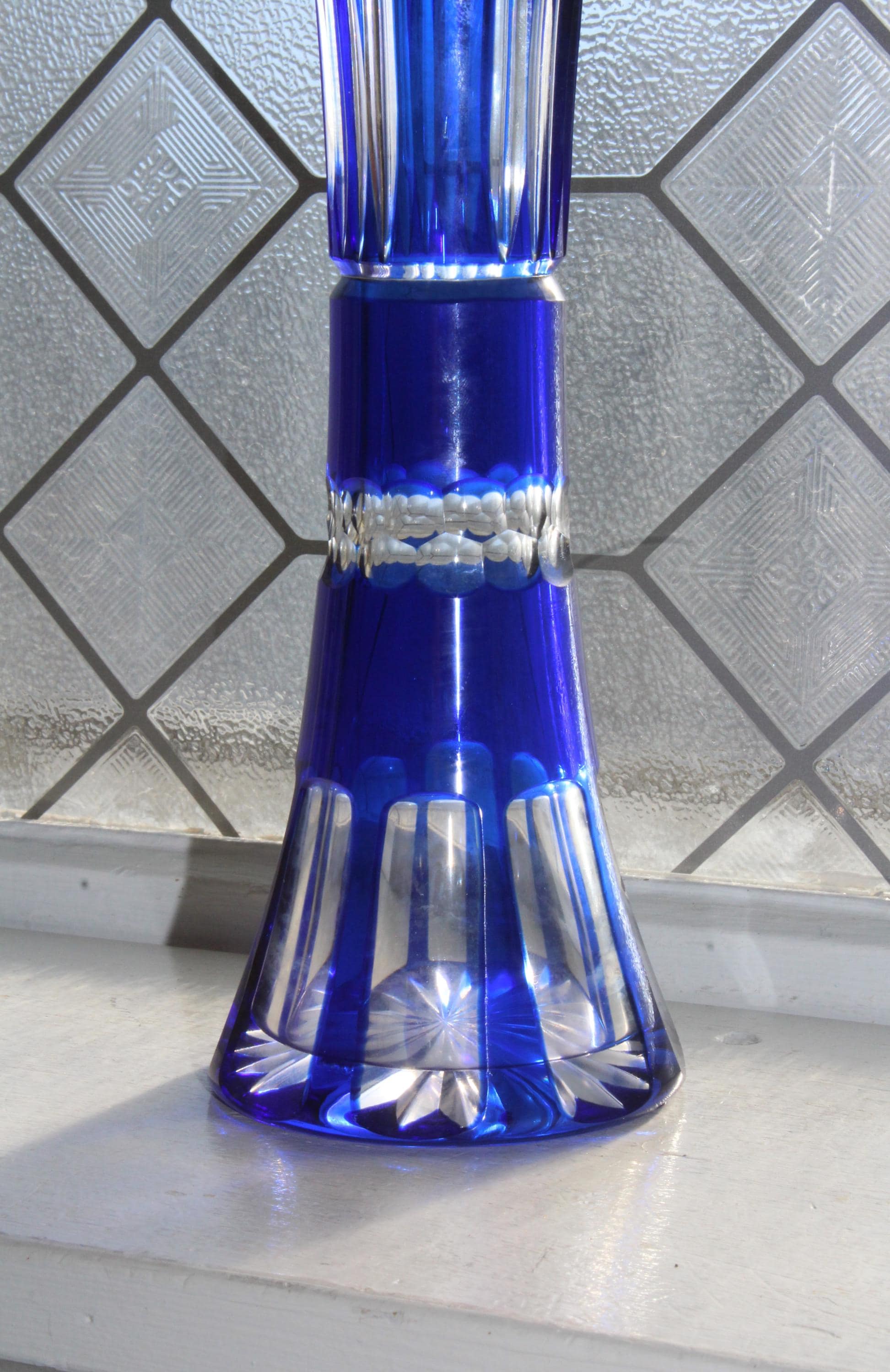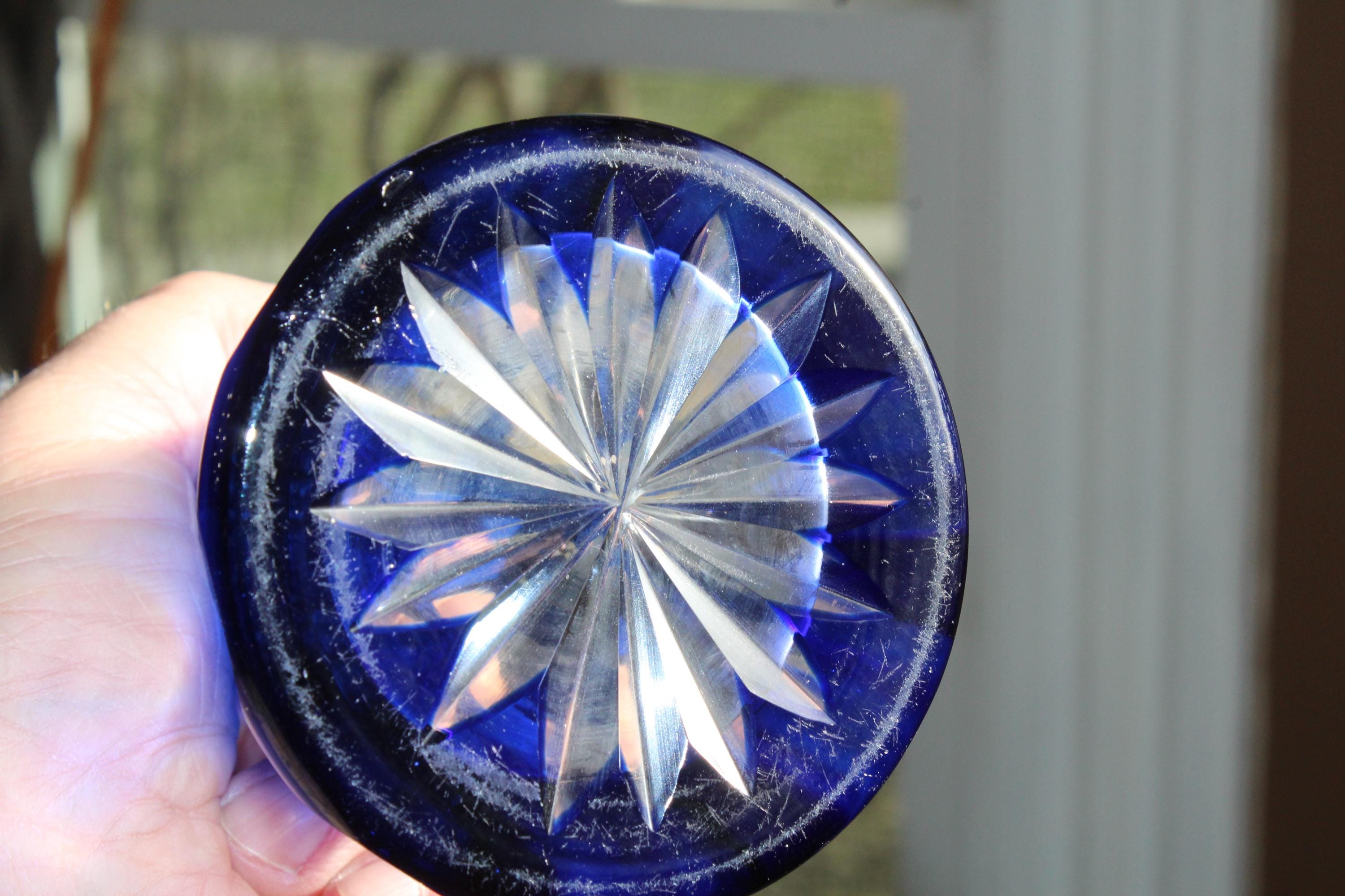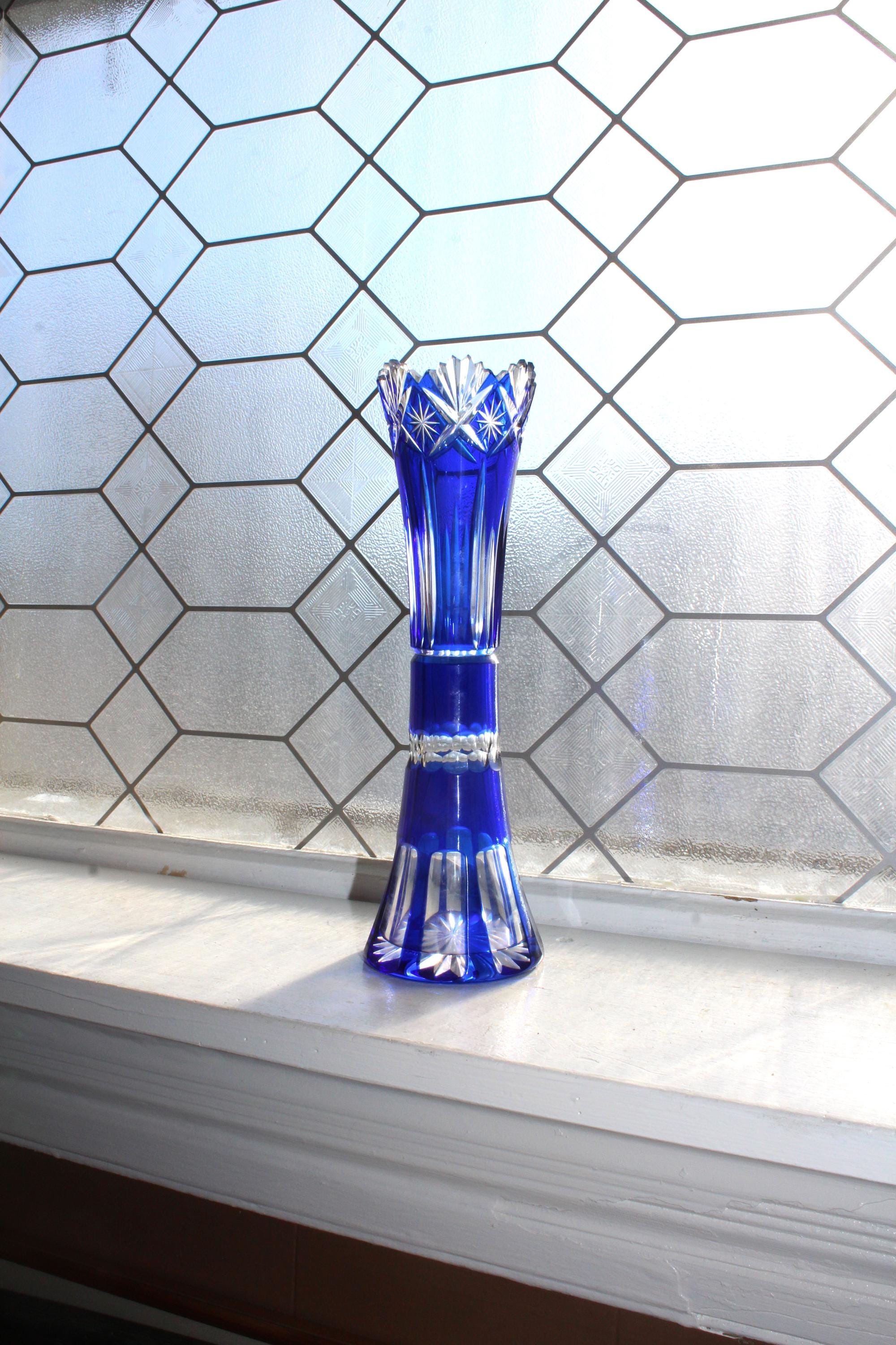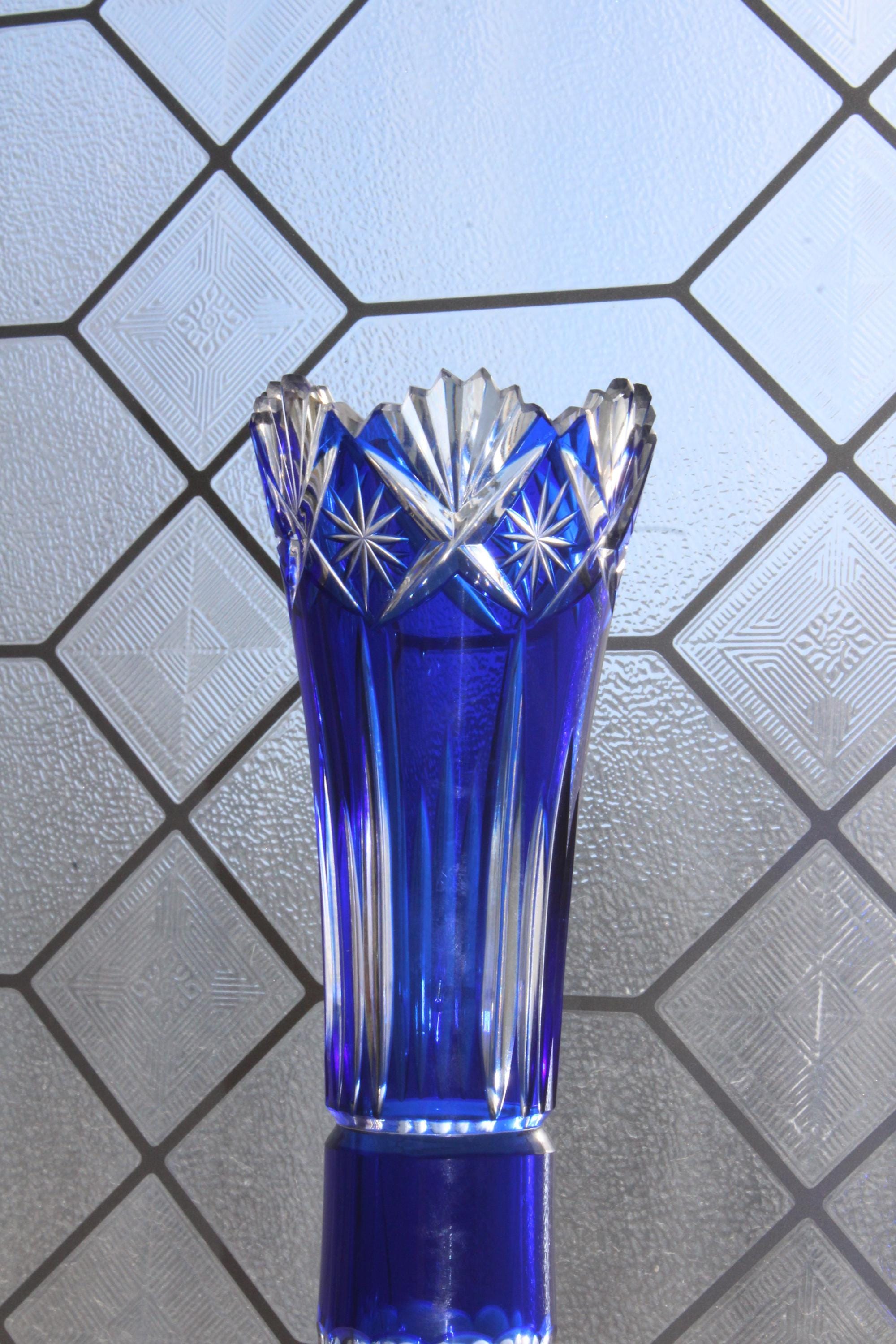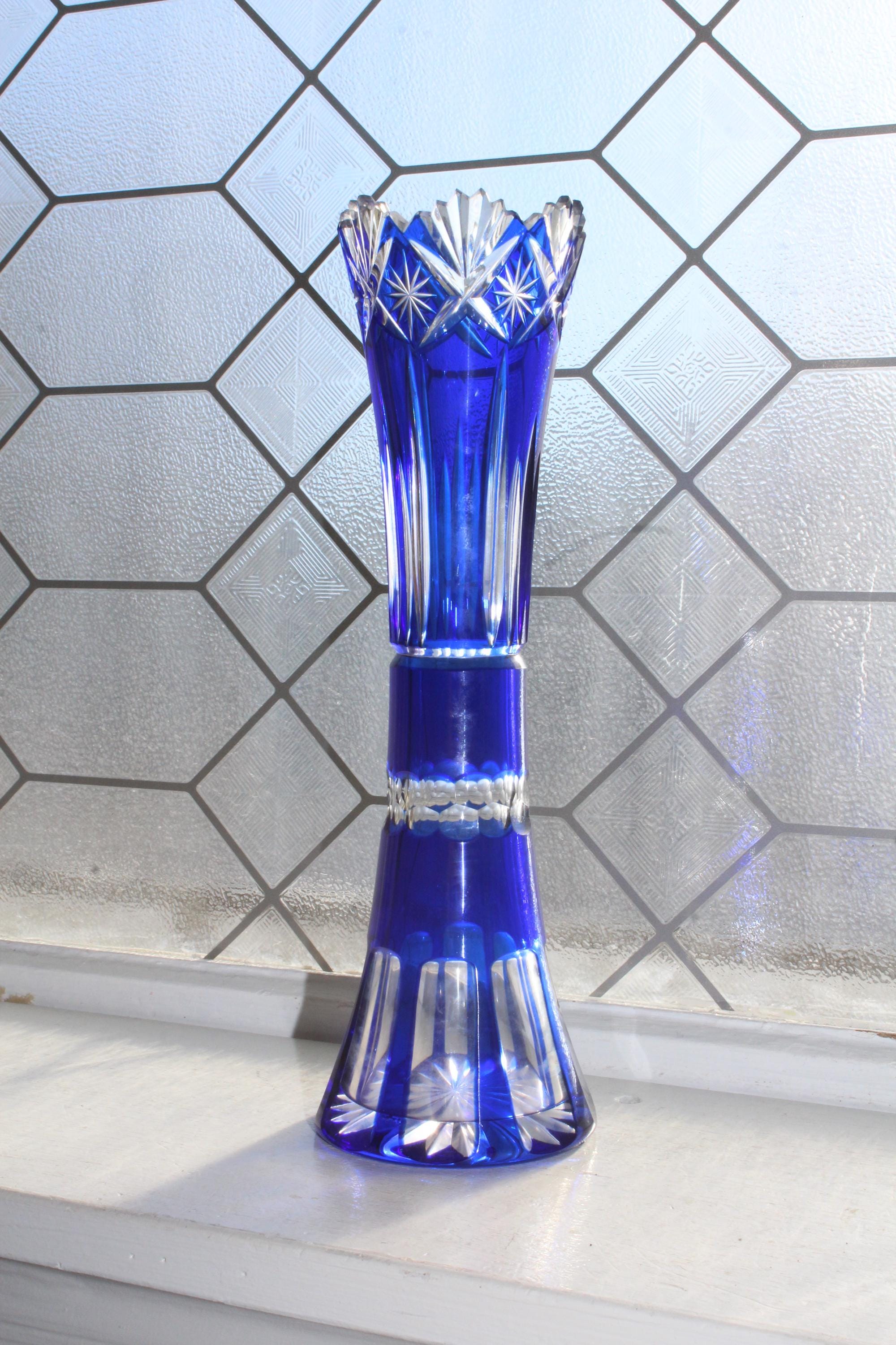 This is a vintage brilliant cobalt blue cut to clear cased Bohemian crystal vase, in excellent condition. This gorgeous piece has no chips or cracks. It measures 10 1/2" high, perfect for use or display. Exquisite, heavy, and balanced. Enjoy!
