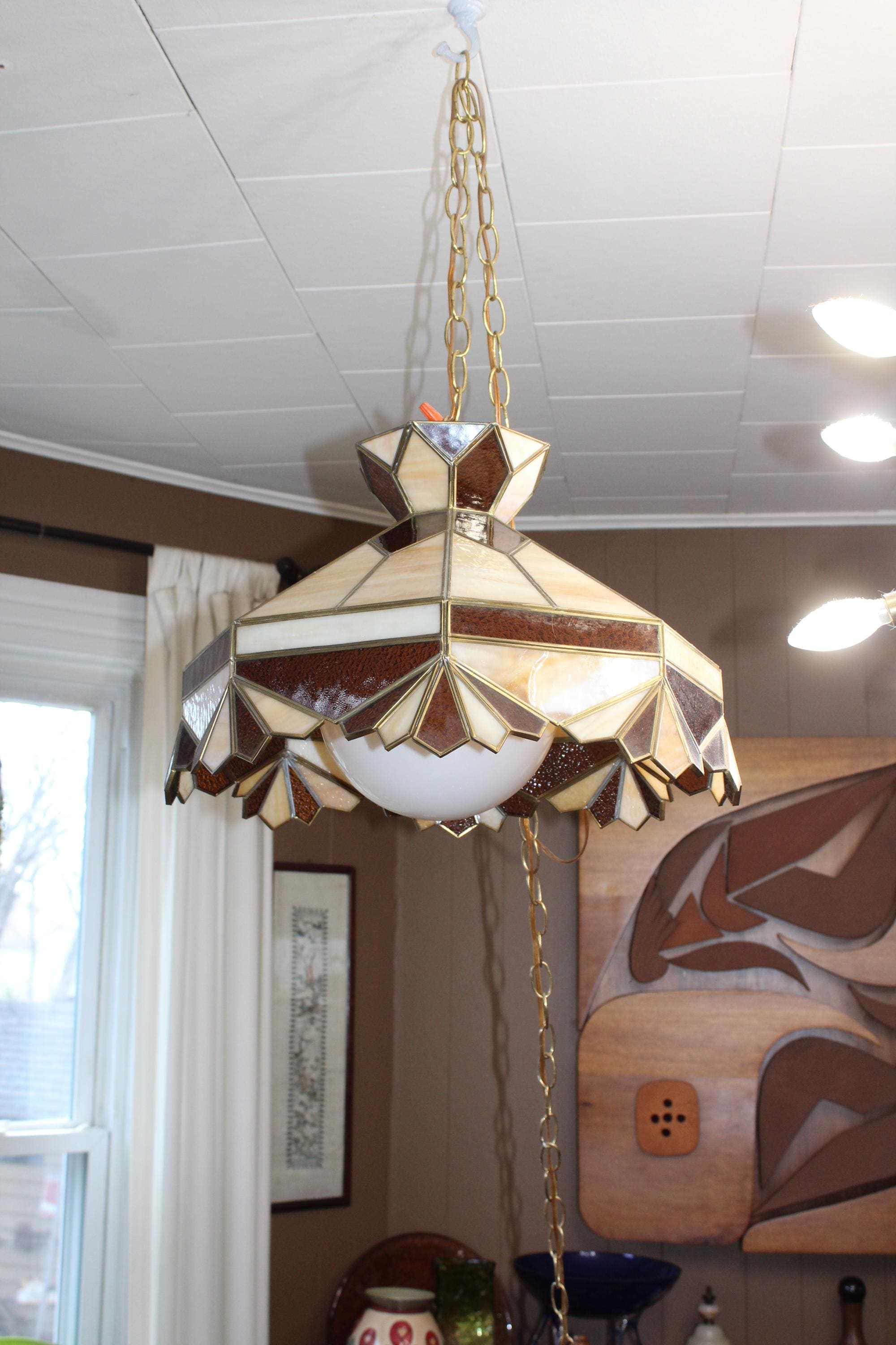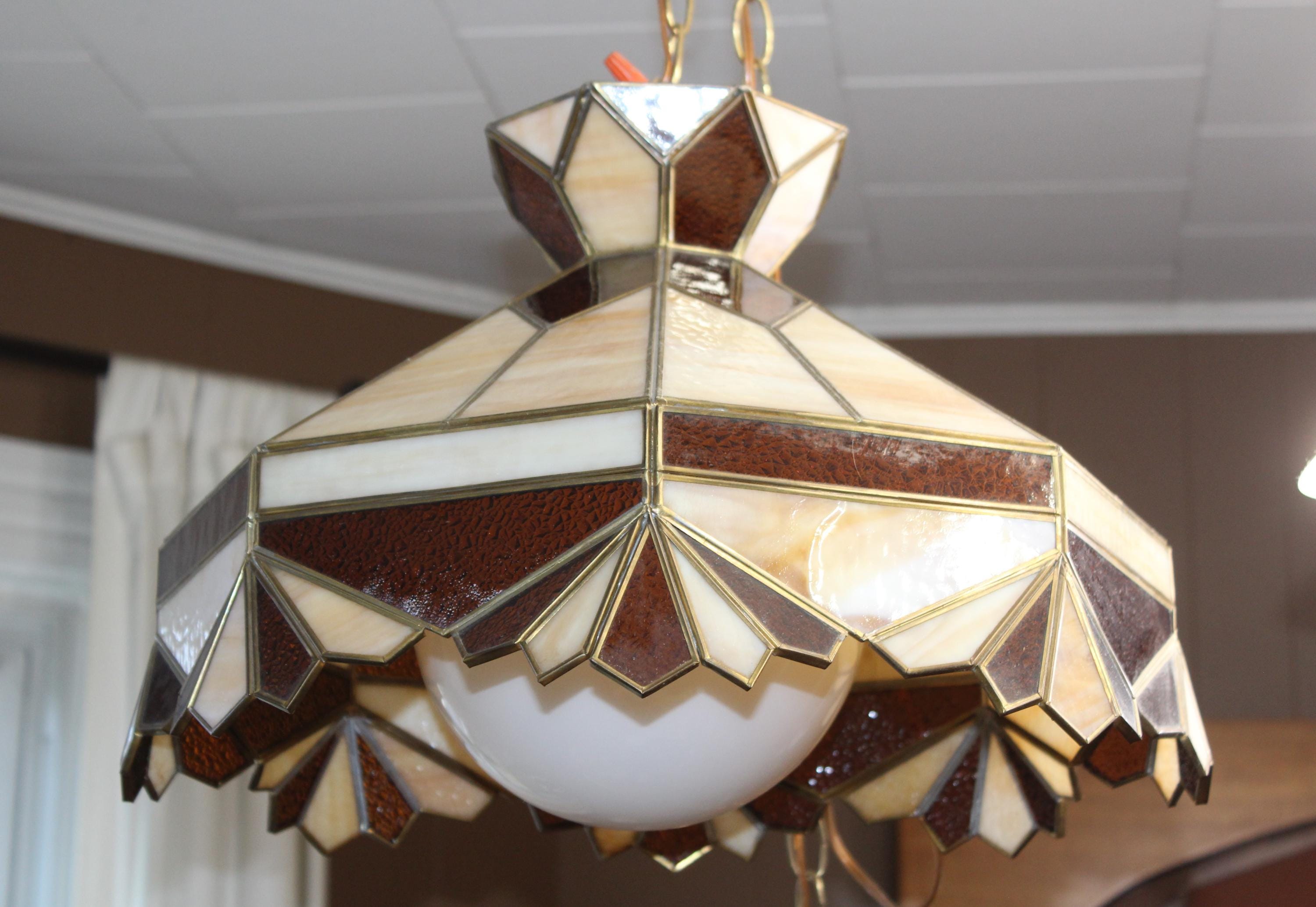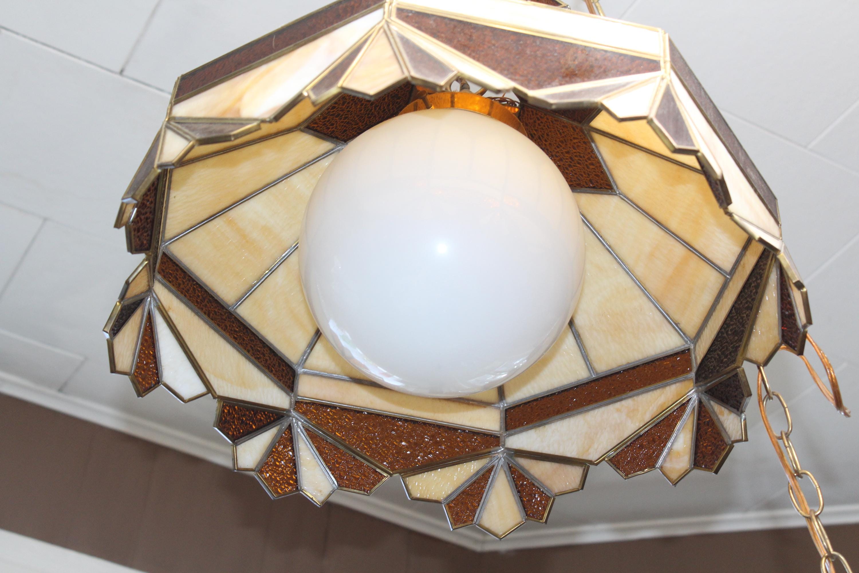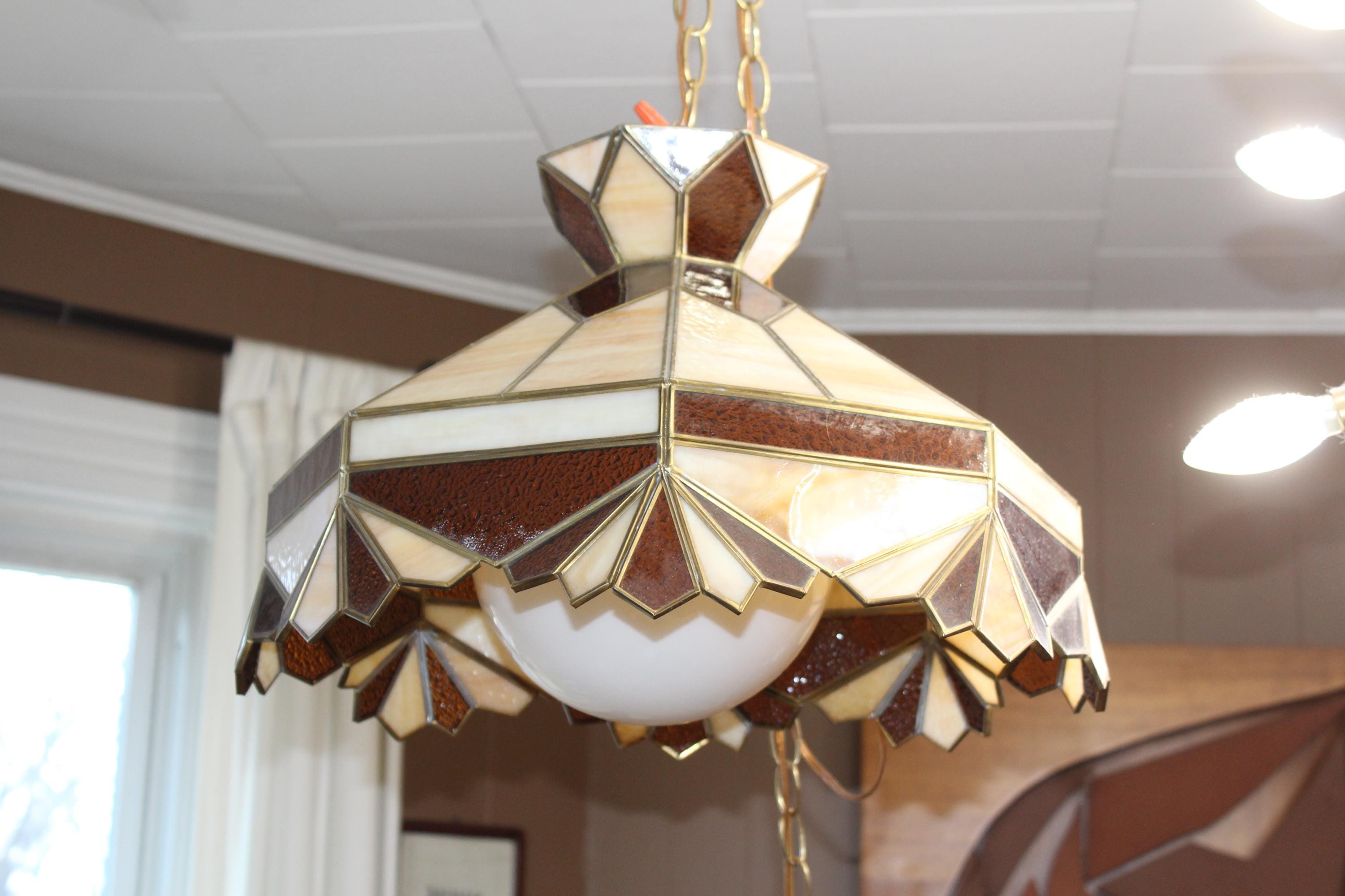 This is a gorgeous large vintage 1970s stained glass Mission style chandelier/hanging light fixture in brown, caramel and white, in very good condition. The octagonal shade measures 18" wide x 12 1/2" high and features shades of brown, caramel and white. It comes with an extra long chain, with on/off switch on the chain. There are no chips or cracks in the glass, the leading is good and sturdy, and it works well. It's ready to install. Enjoy! PLEASE NOTE, THIS ITEM DOESN'T SHIP TO P.O. BOXES.
