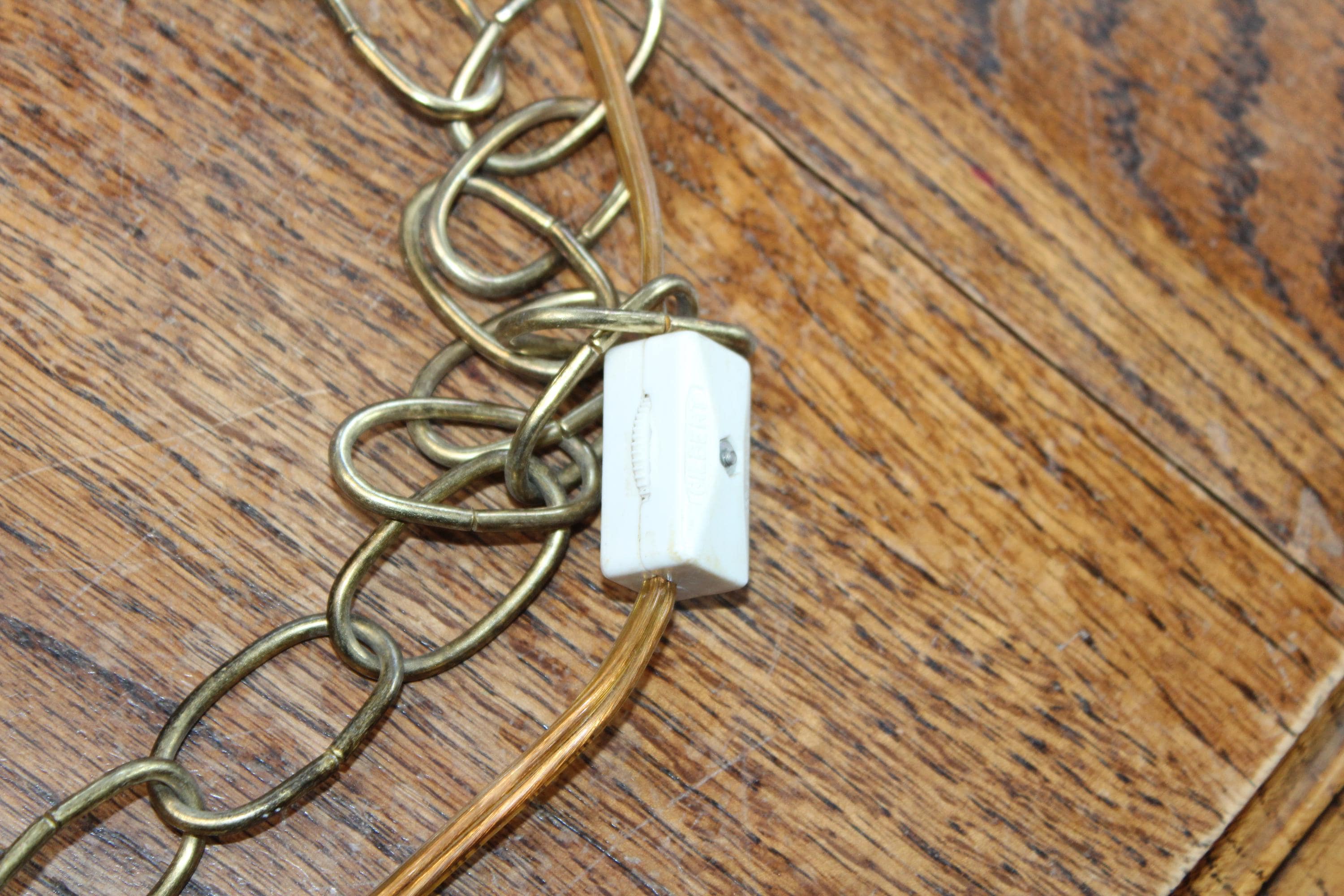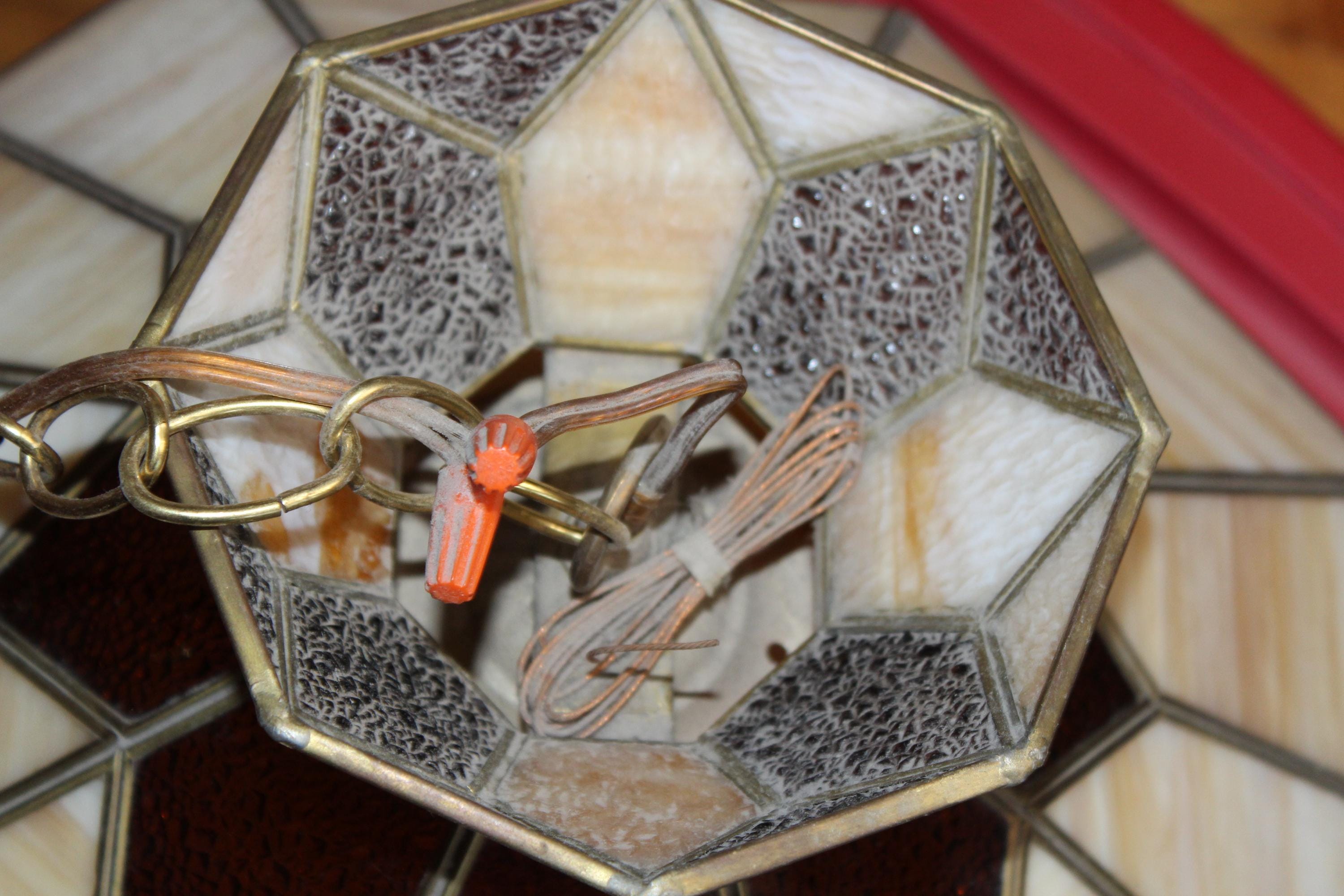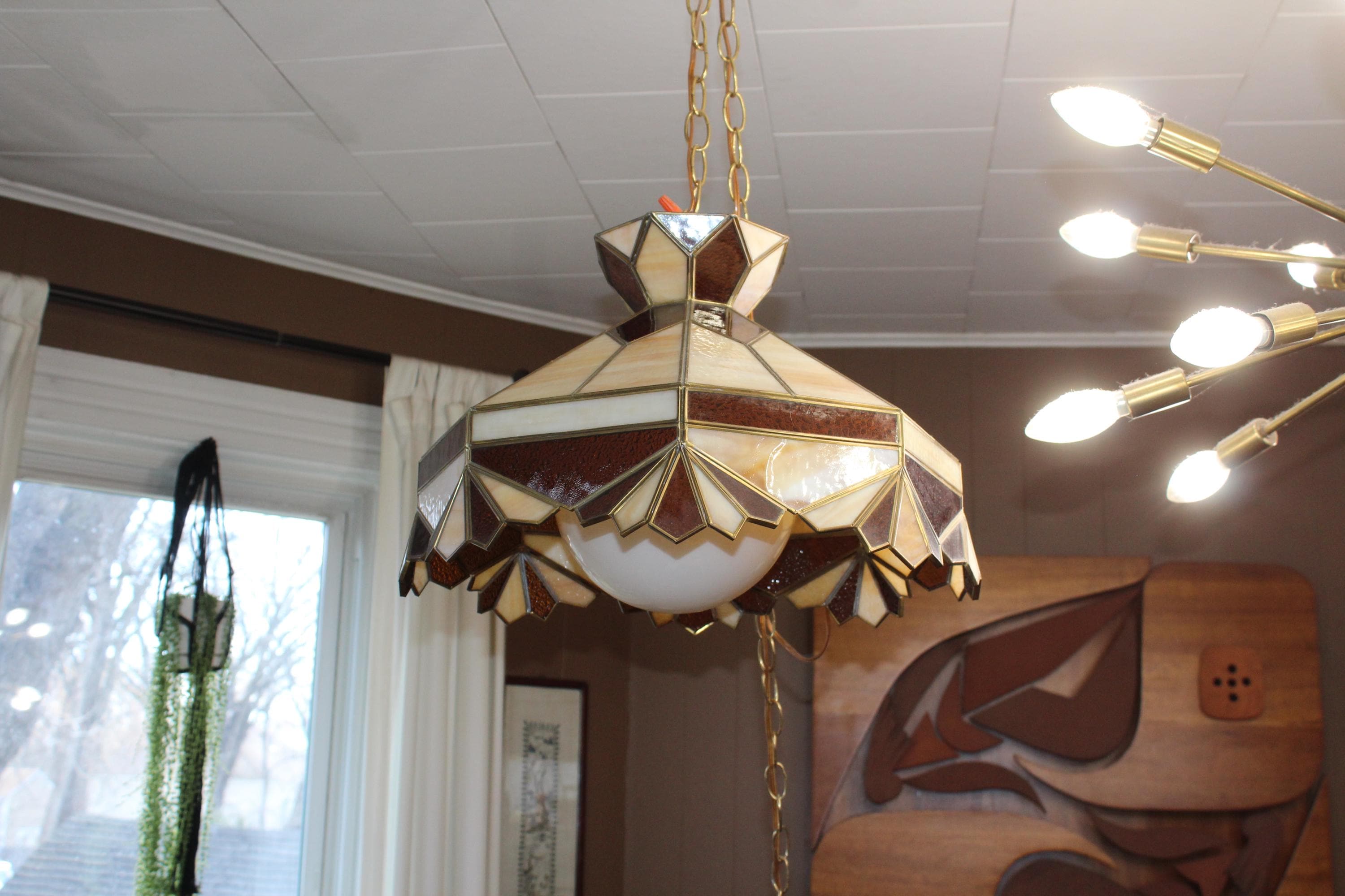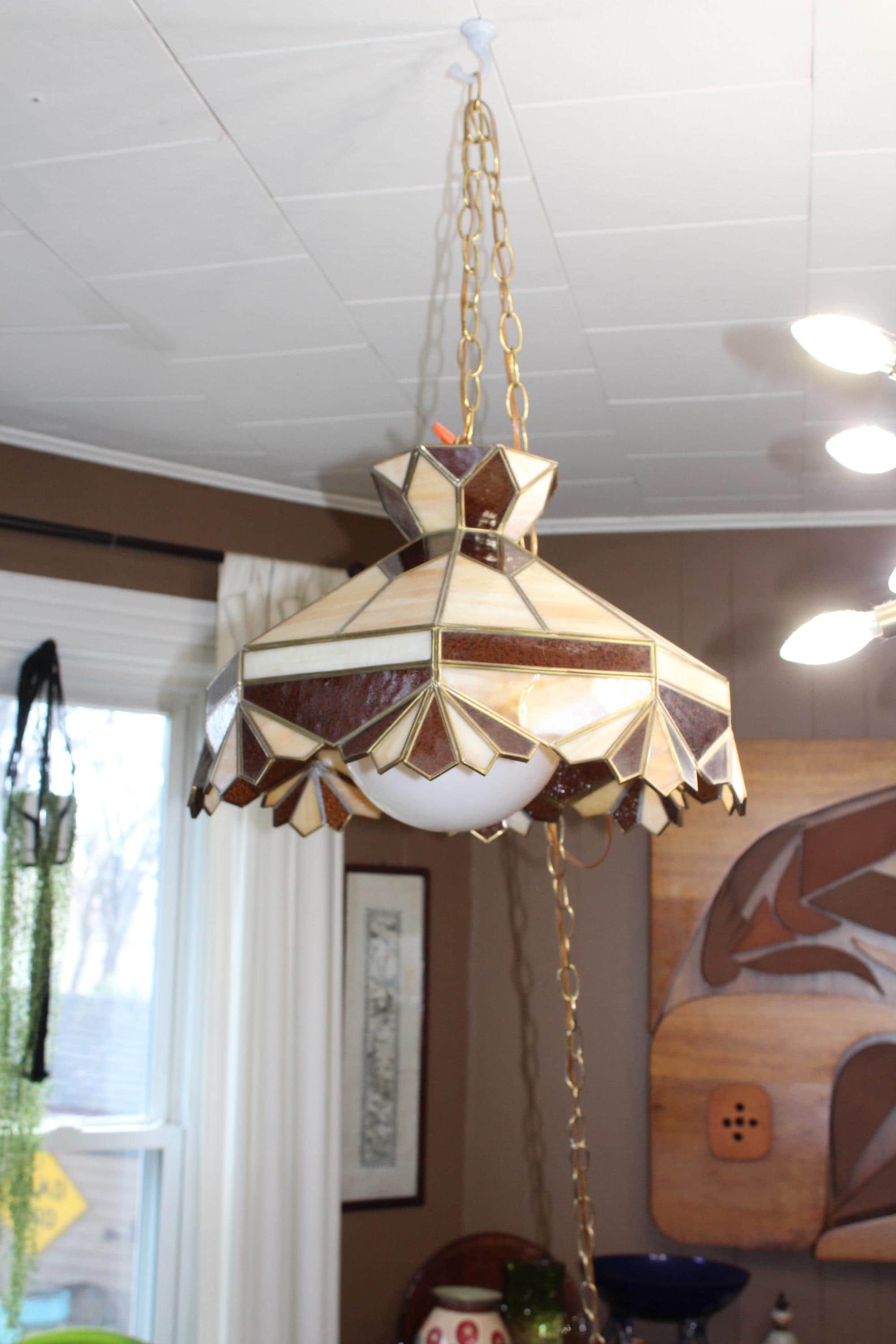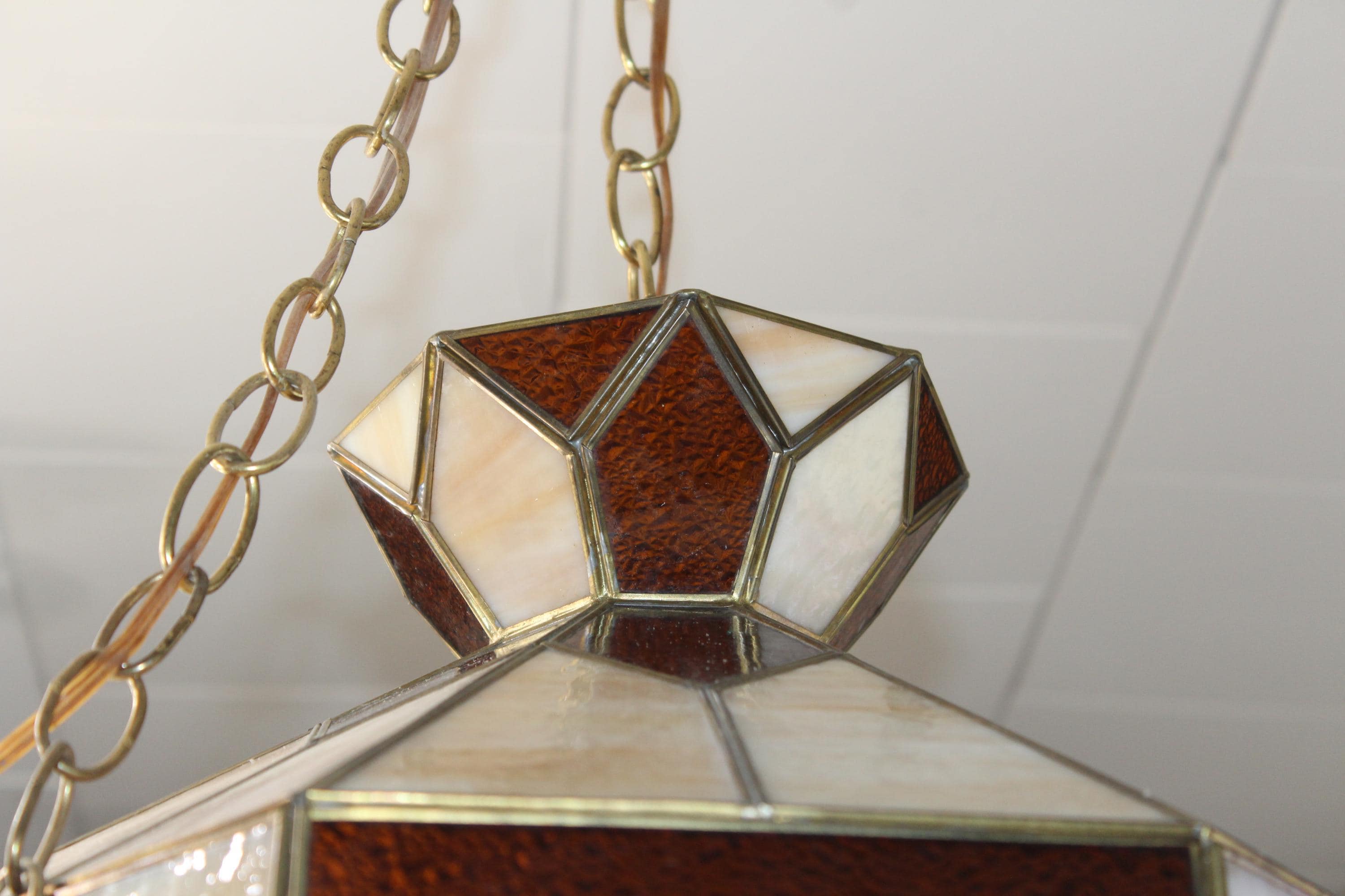 This is a gorgeous large vintage 1970s stained glass Mission style chandelier/hanging light fixture in brown, caramel and white, in very good condition. The octagonal shade measures 18" wide x 12 1/2" high and features shades of brown, caramel and white. It comes with an extra long chain, with on/off switch on the chain. There are no chips or cracks in the glass, the leading is good and sturdy, and it works well. It's ready to install. Enjoy! PLEASE NOTE, THIS ITEM DOESN'T SHIP TO P.O. BOXES.