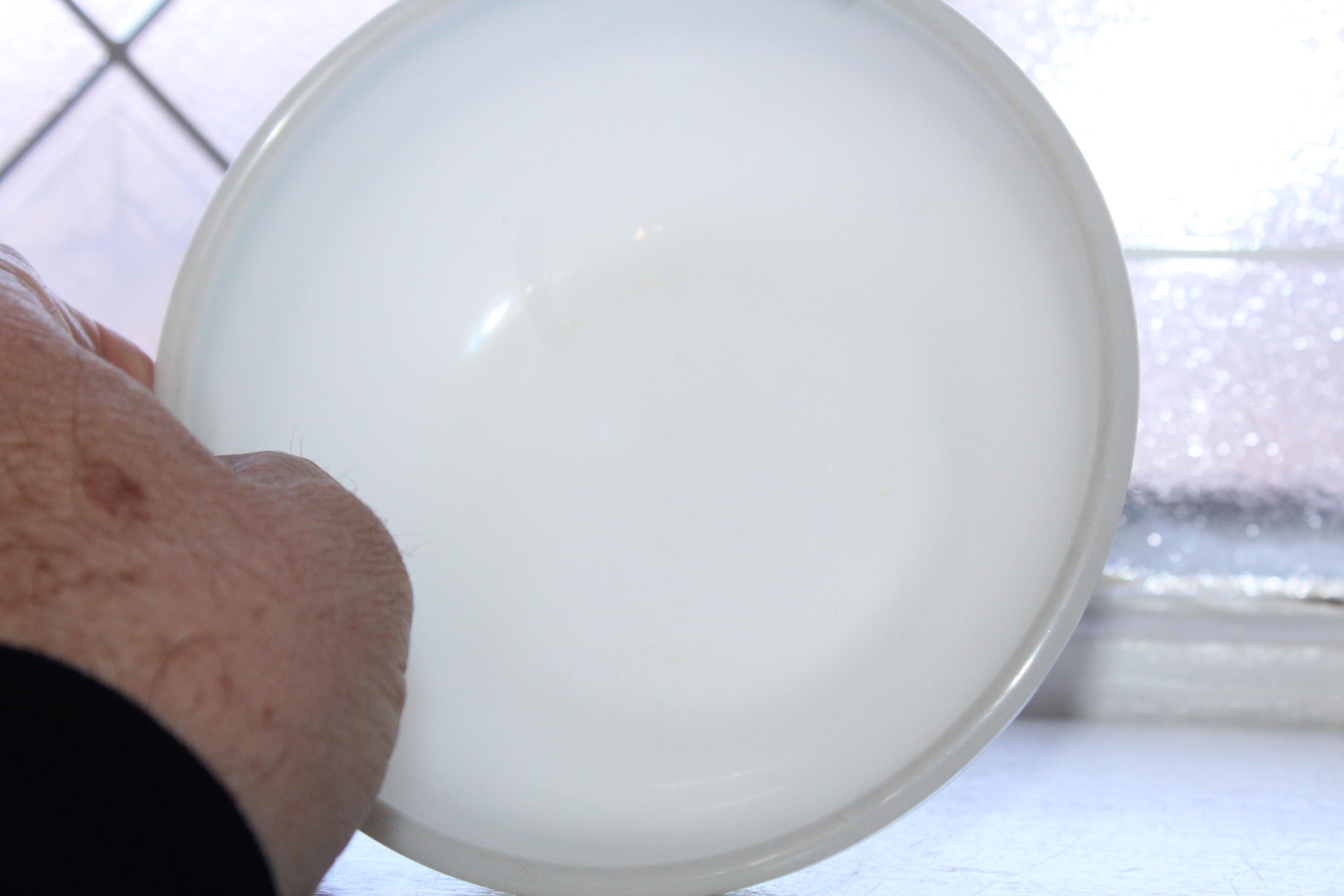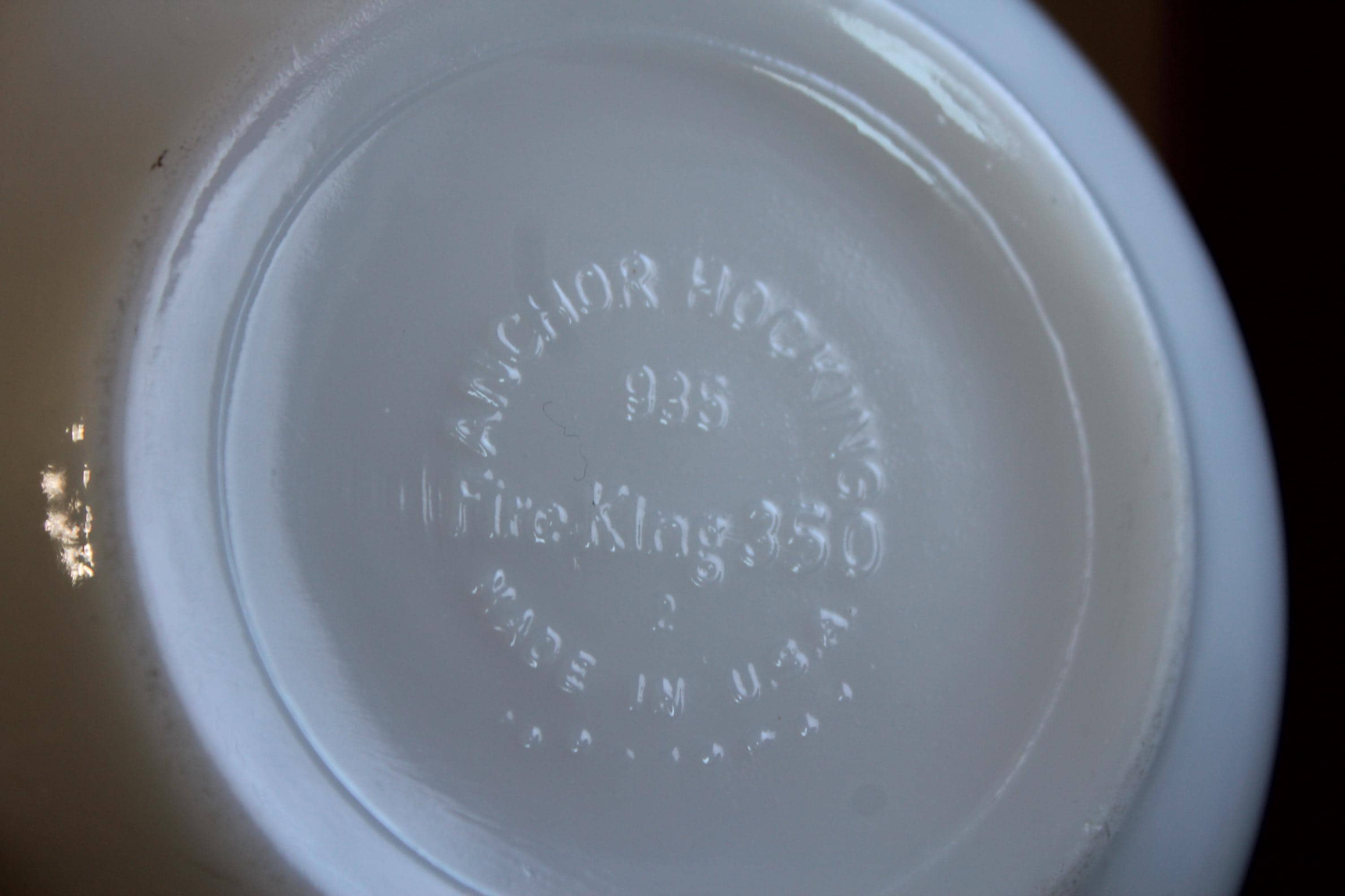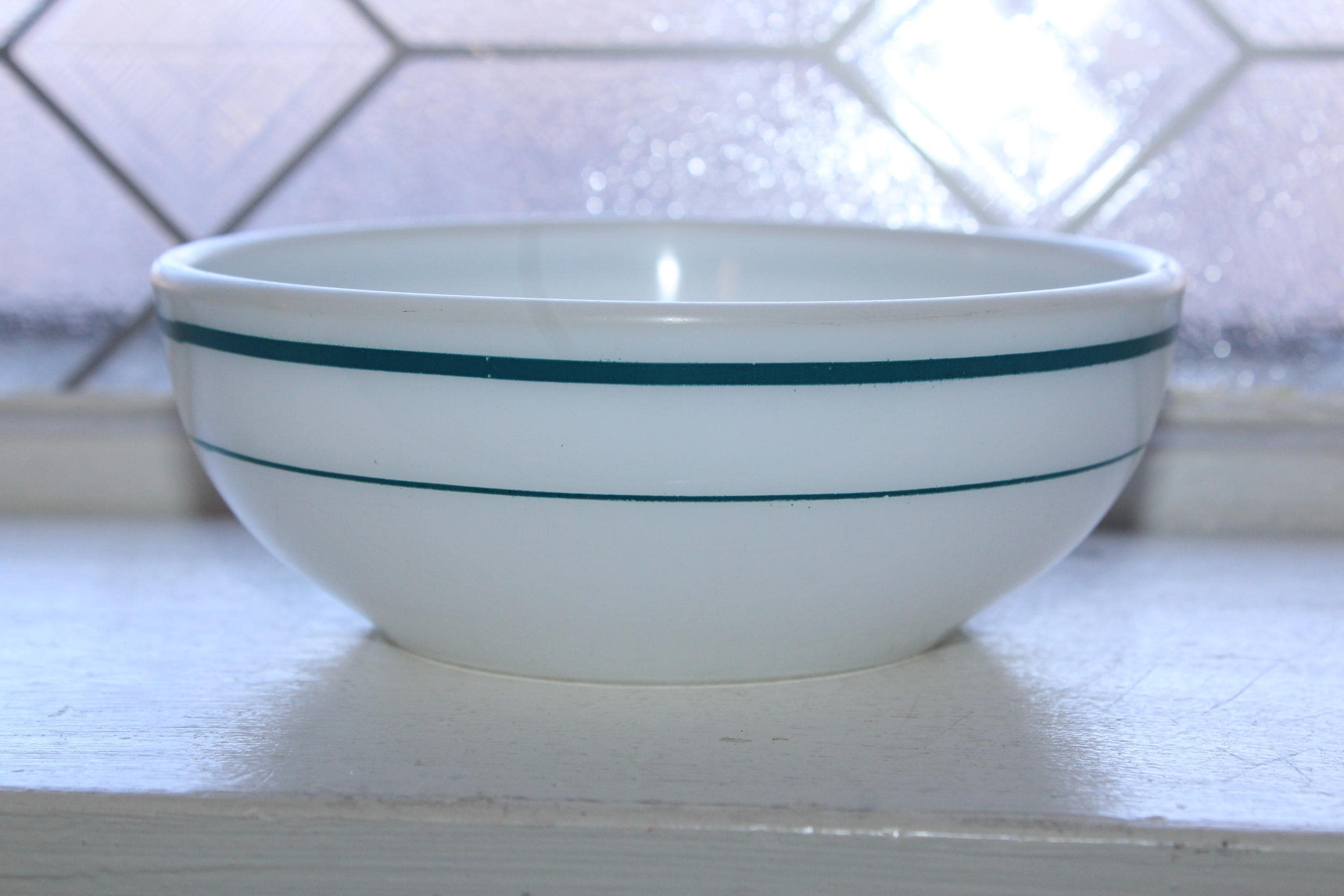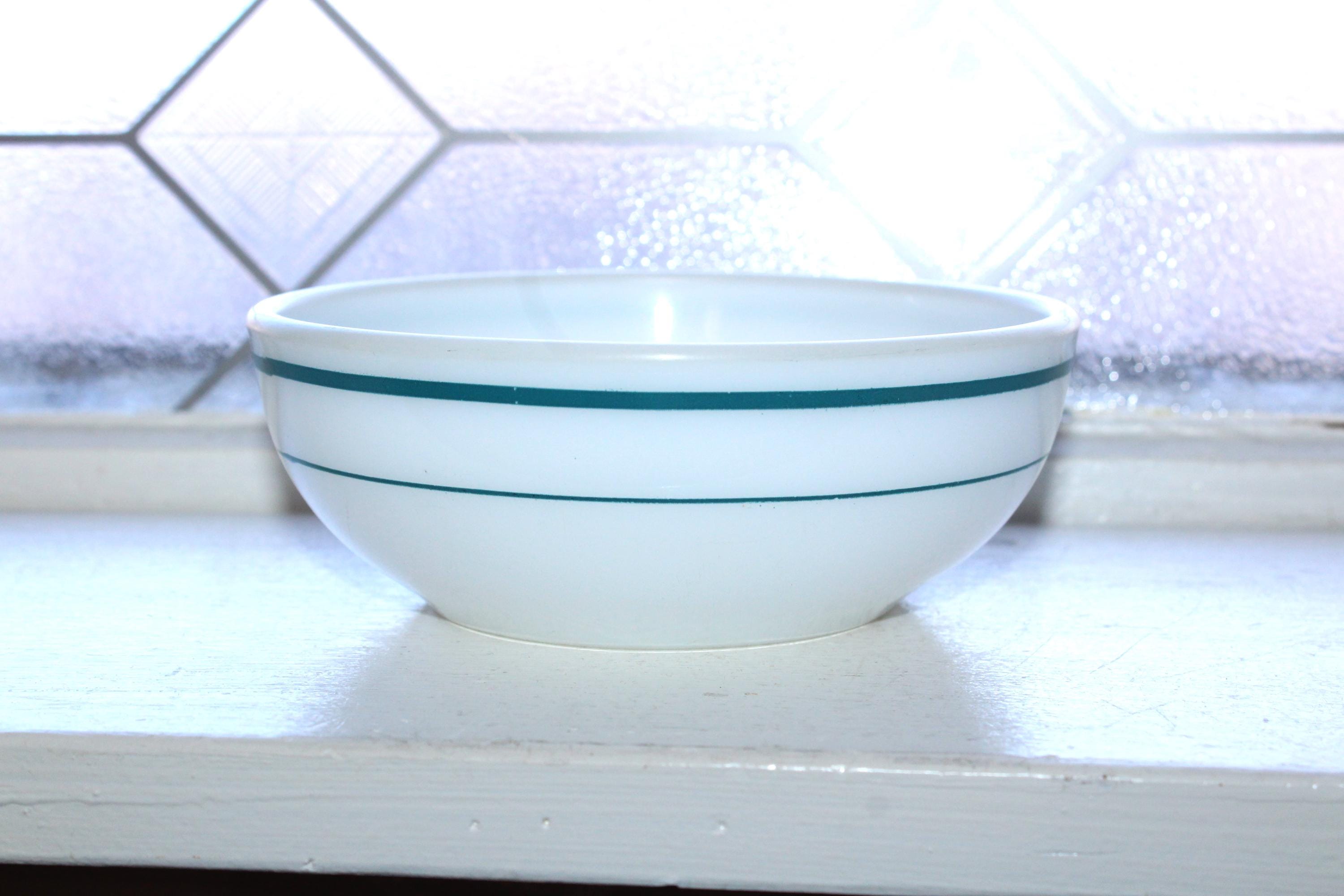Vintage Anchor Hocking Fire King 350 white milk glass cereal bowl 935 with turquoise stripes, in very good condition. The bowl measures 5 1/2" in diameter and 2" high. No chips or cracks, perfect for use or display. Enjoy!