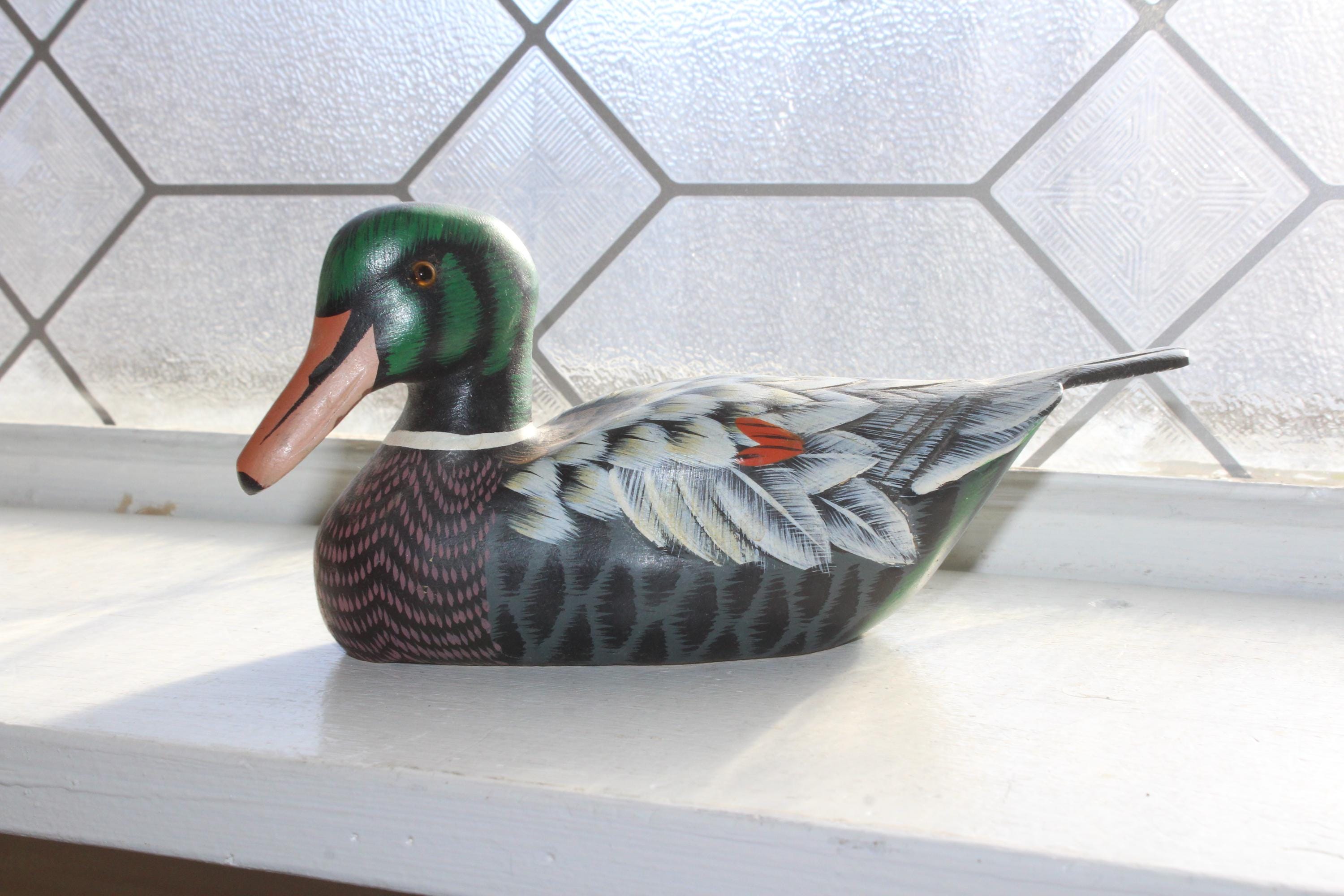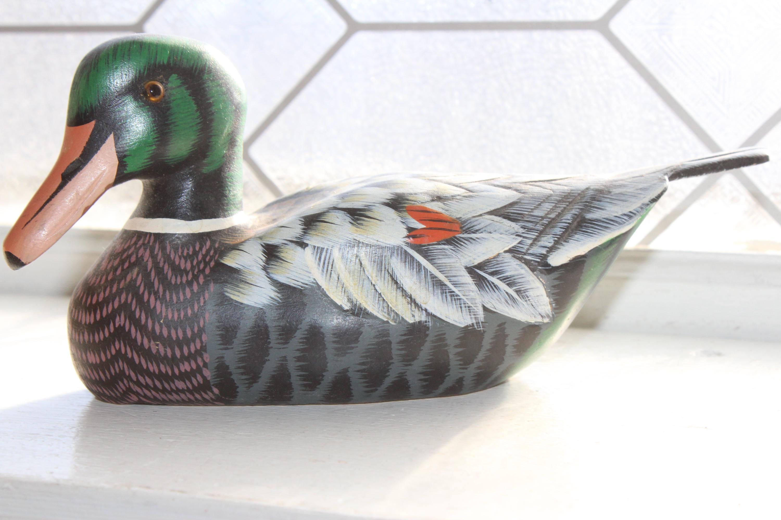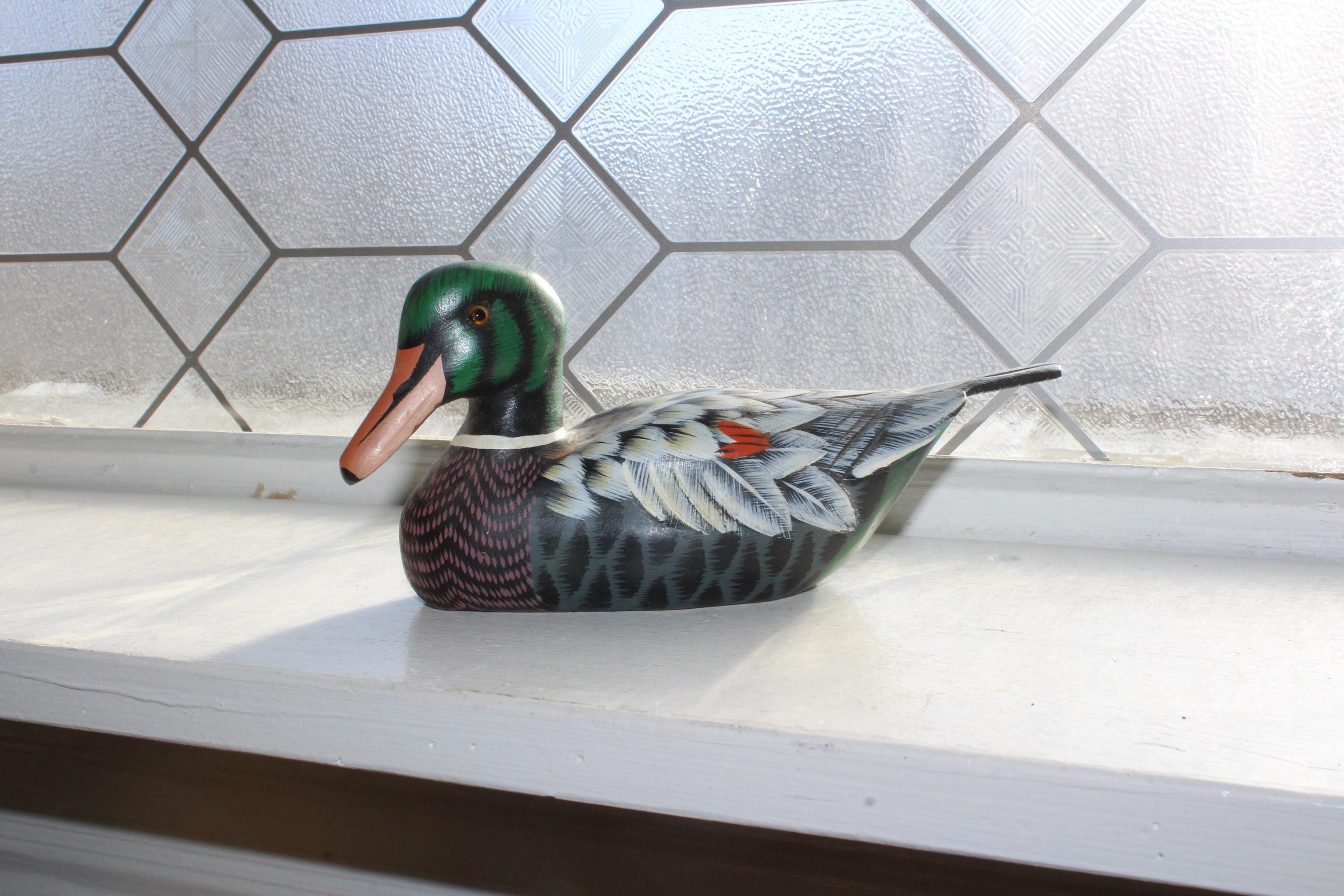 Vintage hand painted carved wood duck with glass eyes, in excellent condition. It measures 7" long and has no damage. Enjoy!