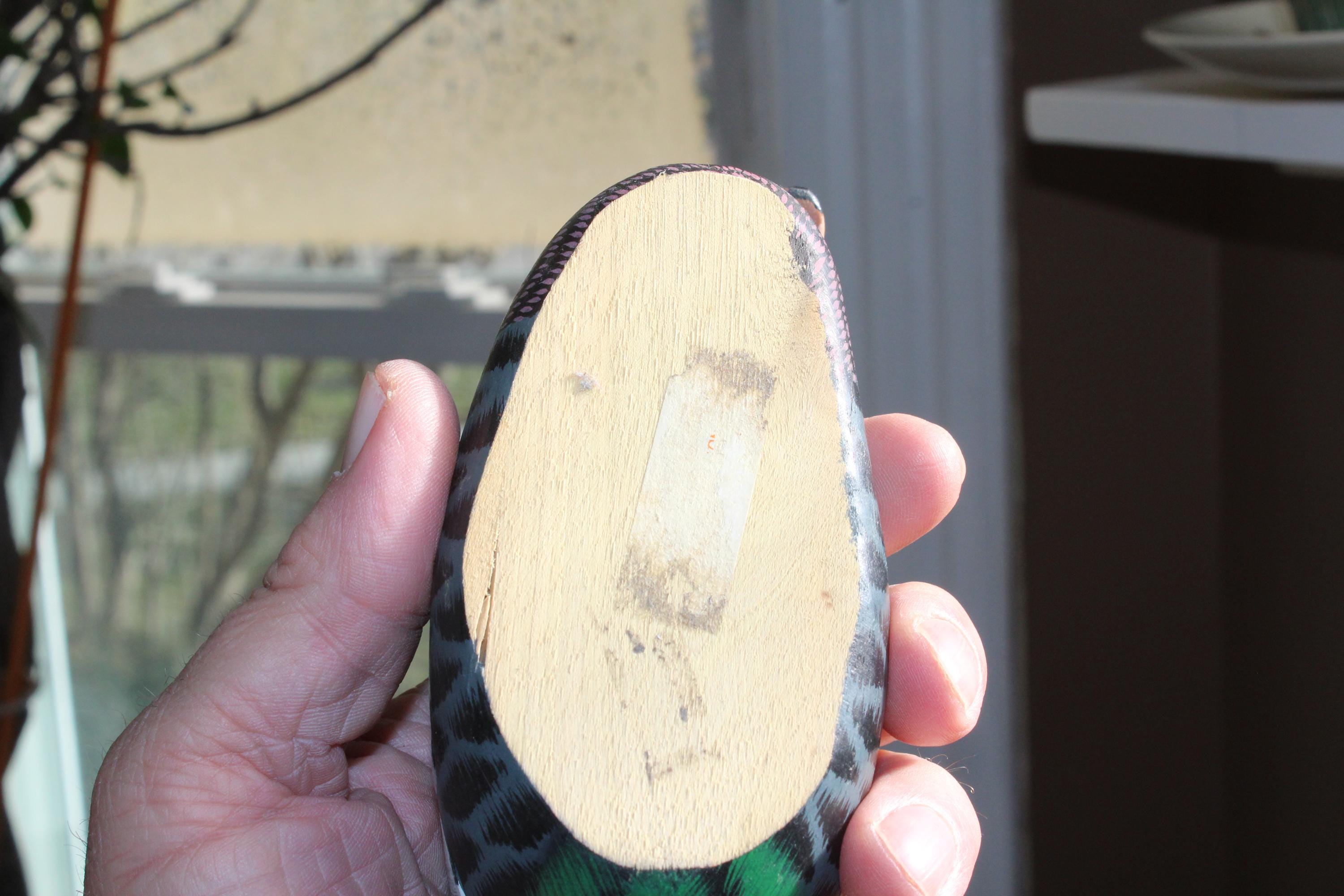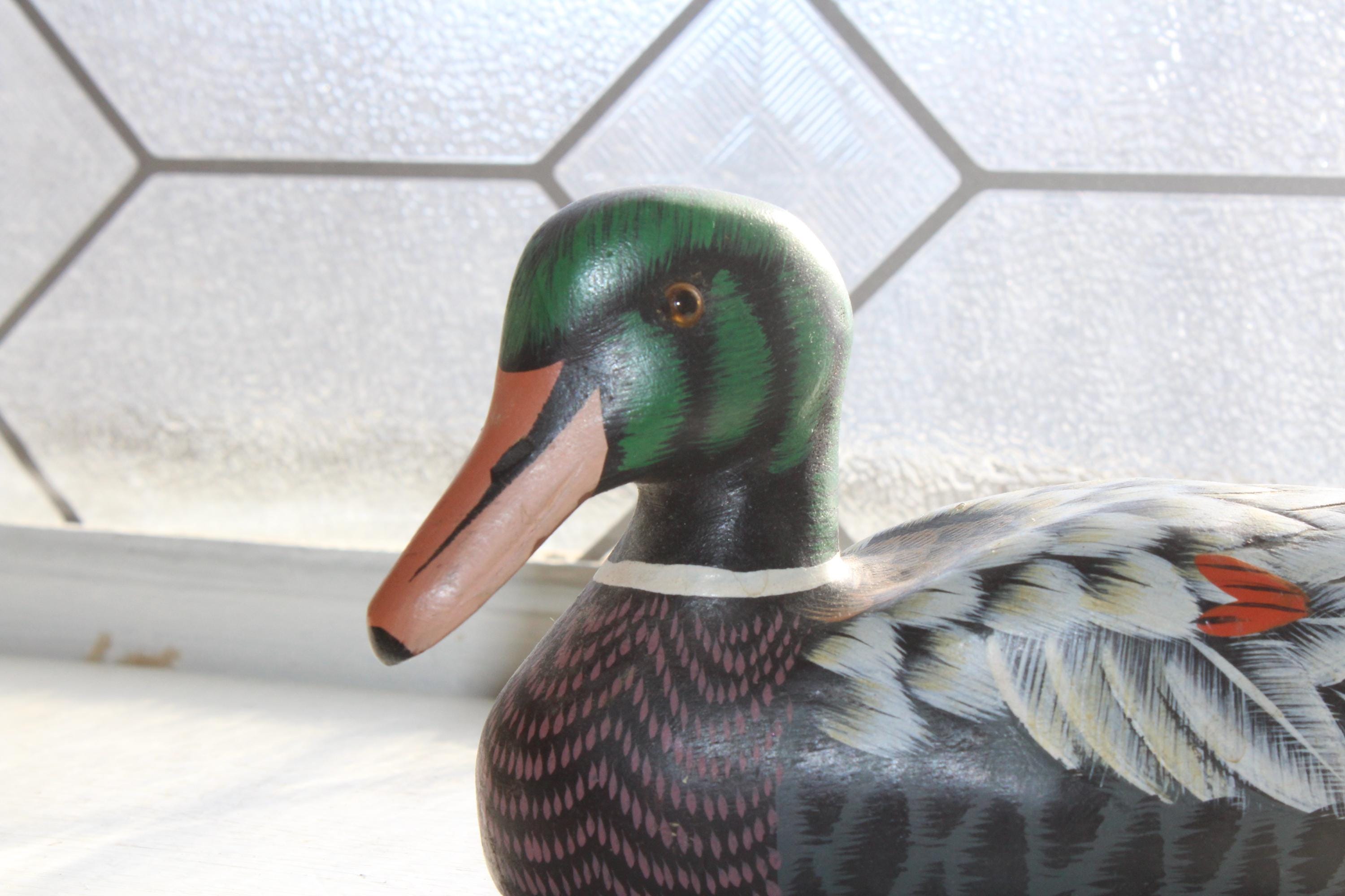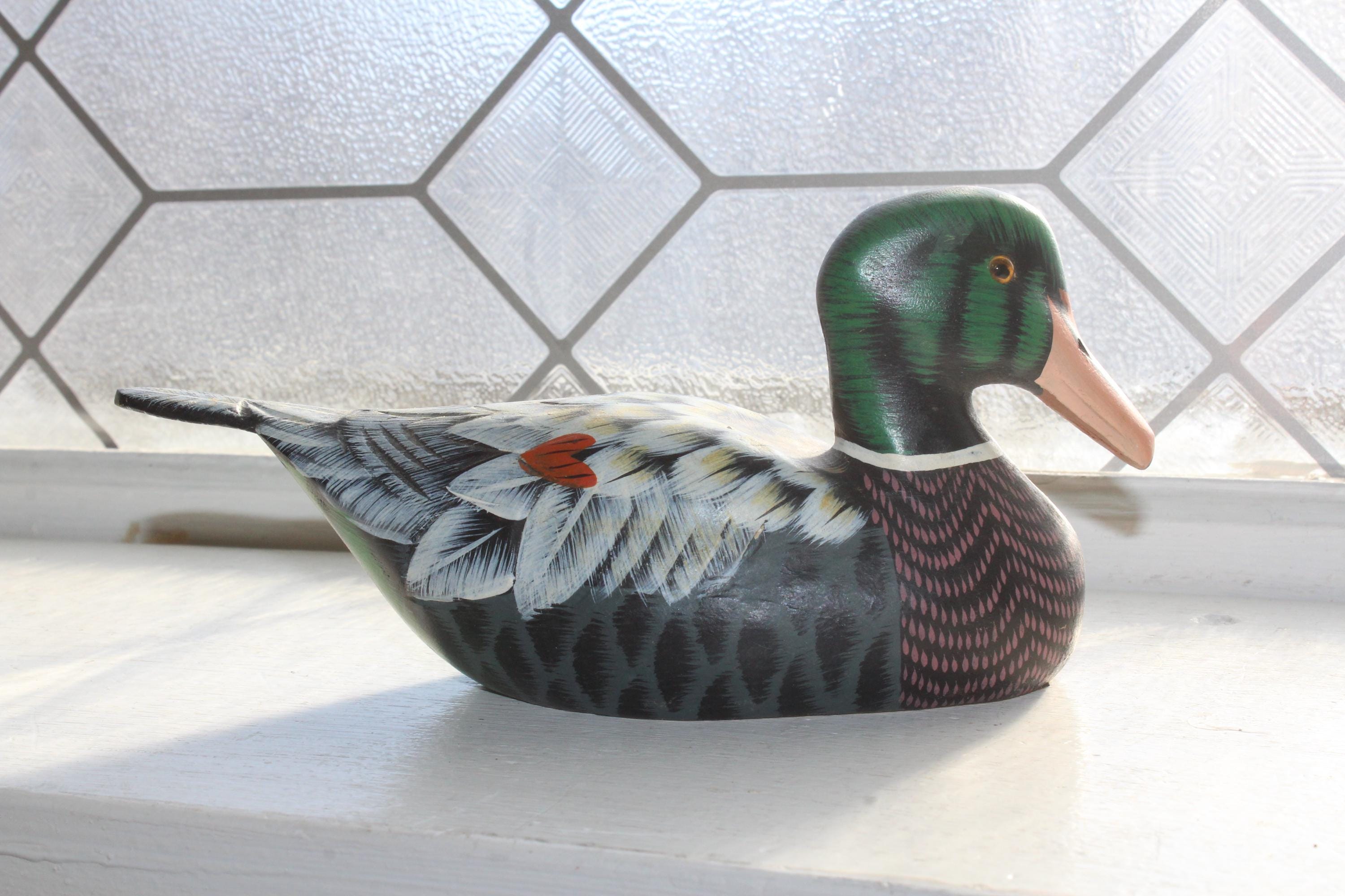 Vintage hand painted carved wood duck with glass eyes, in excellent condition. It measures 7" long and has no damage. Enjoy!