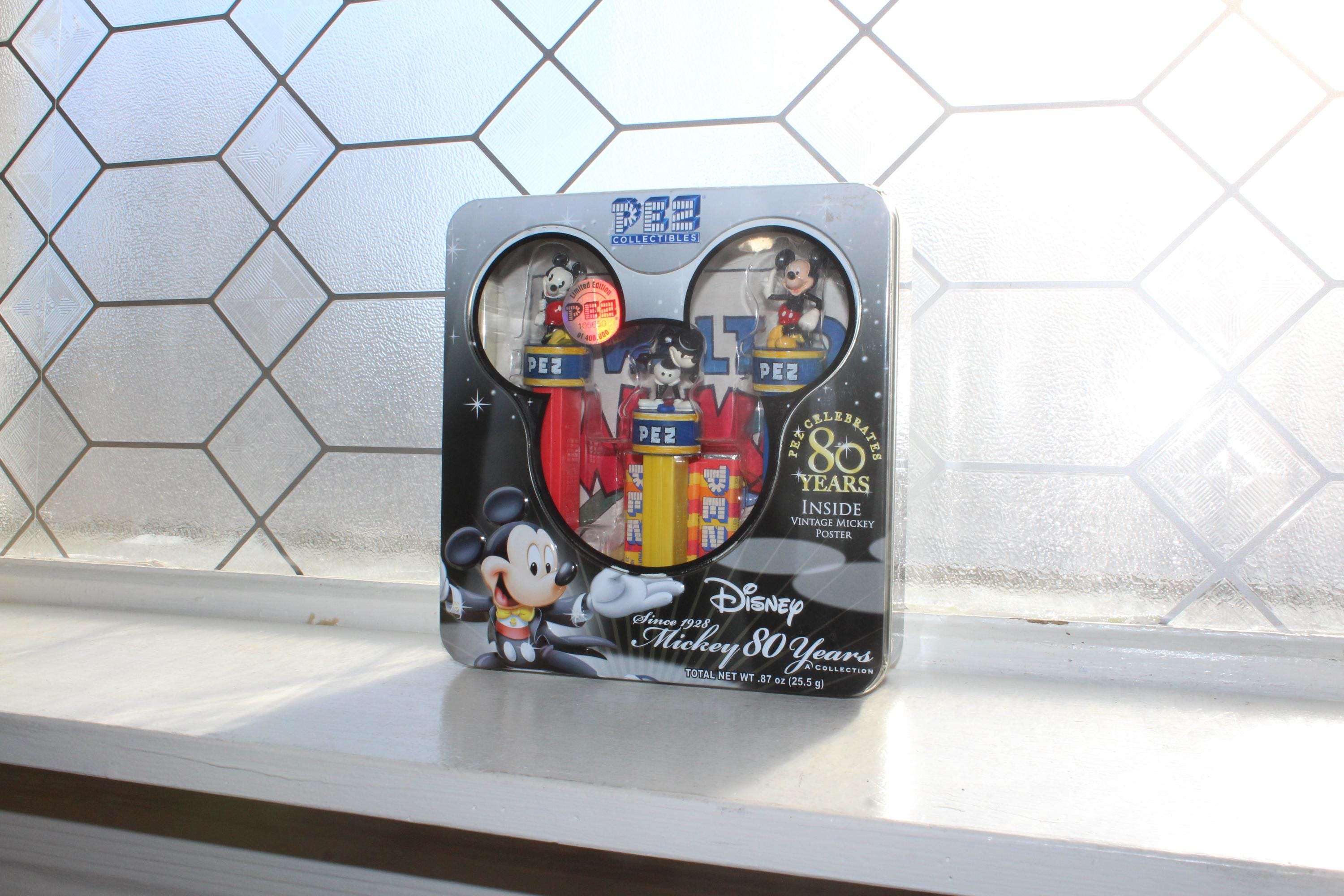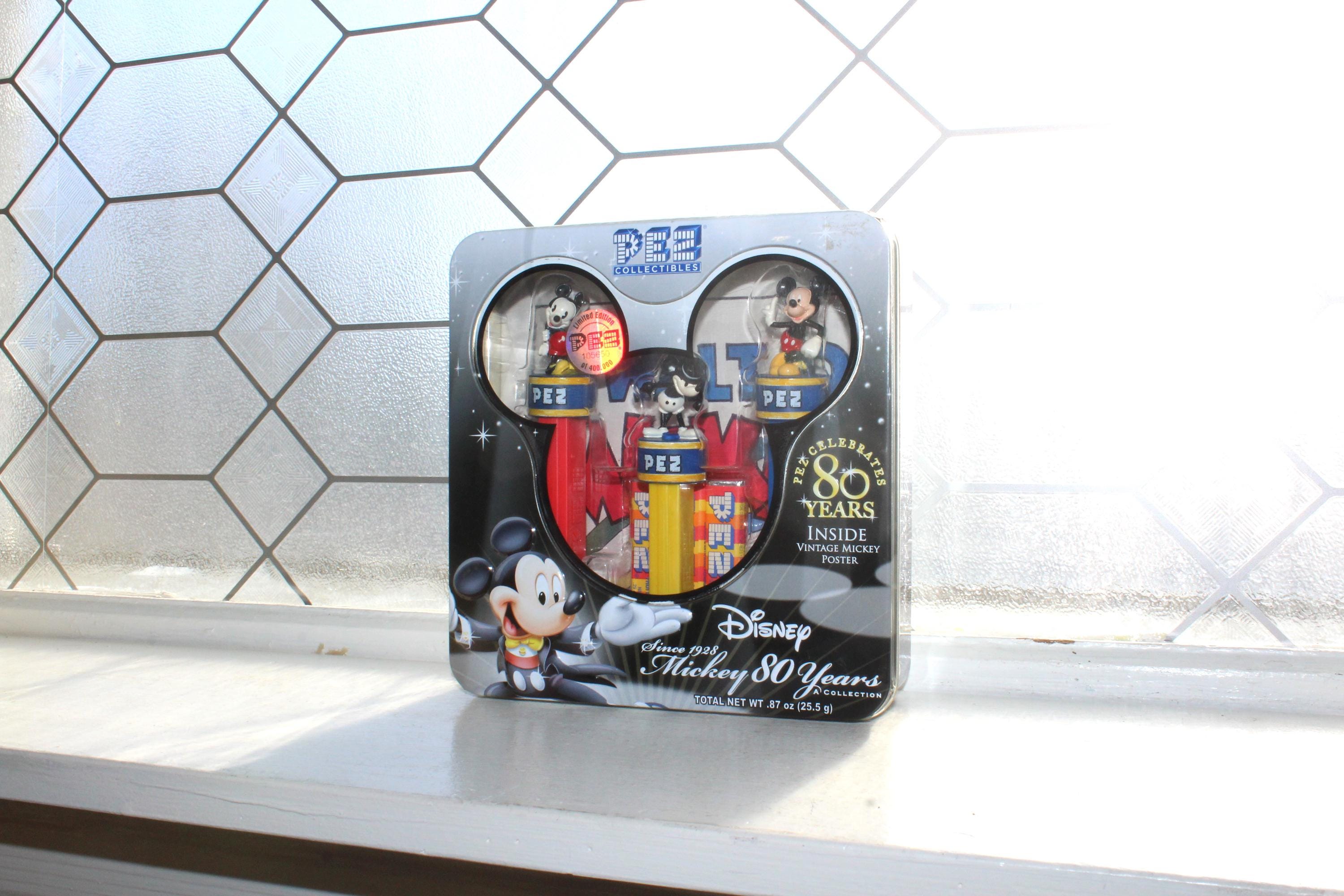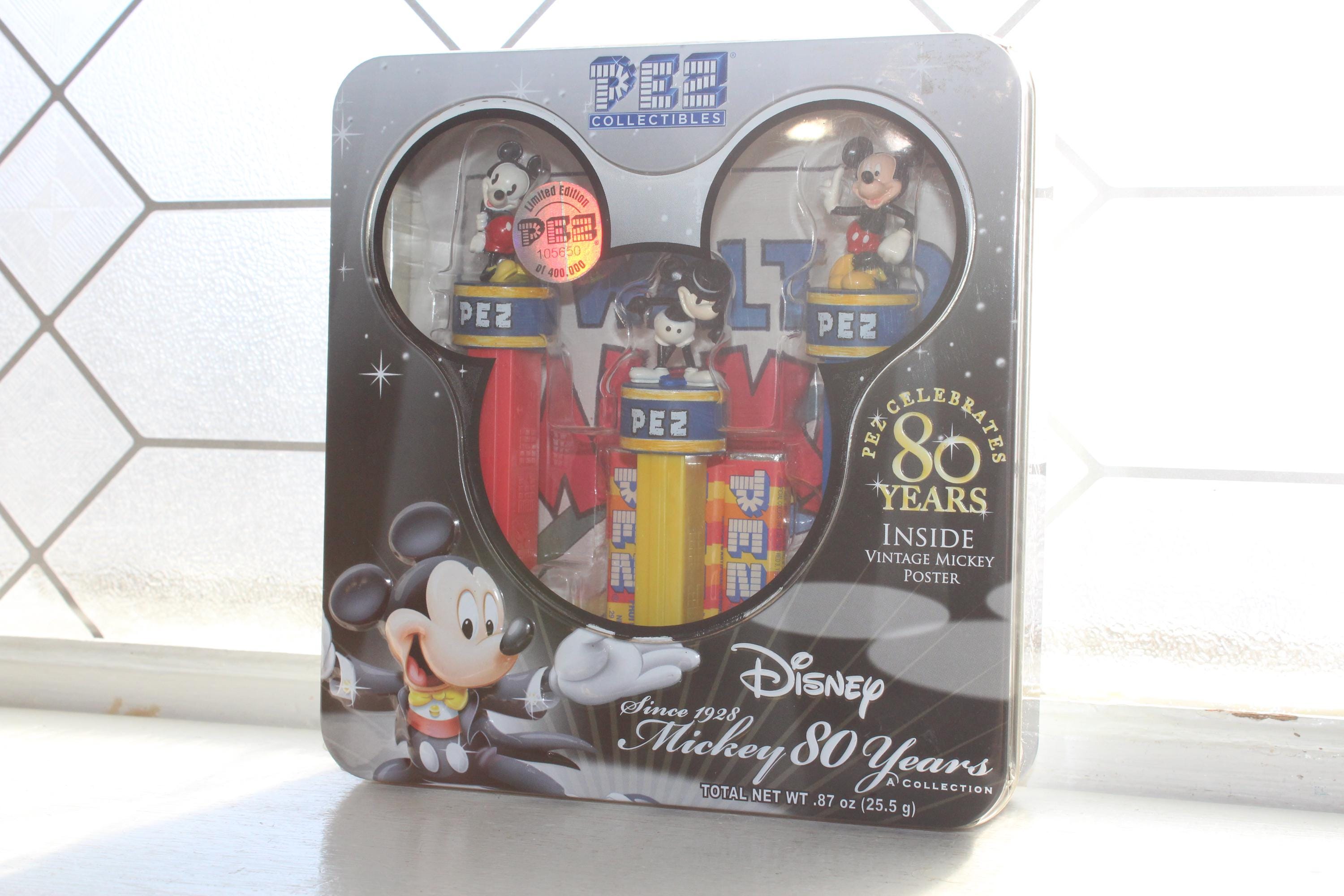Mickey Mouse 80 Years Collectible tin with 3 Pez dispensers and a poster, in excellent unopened condition. It measures 7" wide and displays very well. This piece makes a great addition to a Mickey Mouse collection. Enjoy!