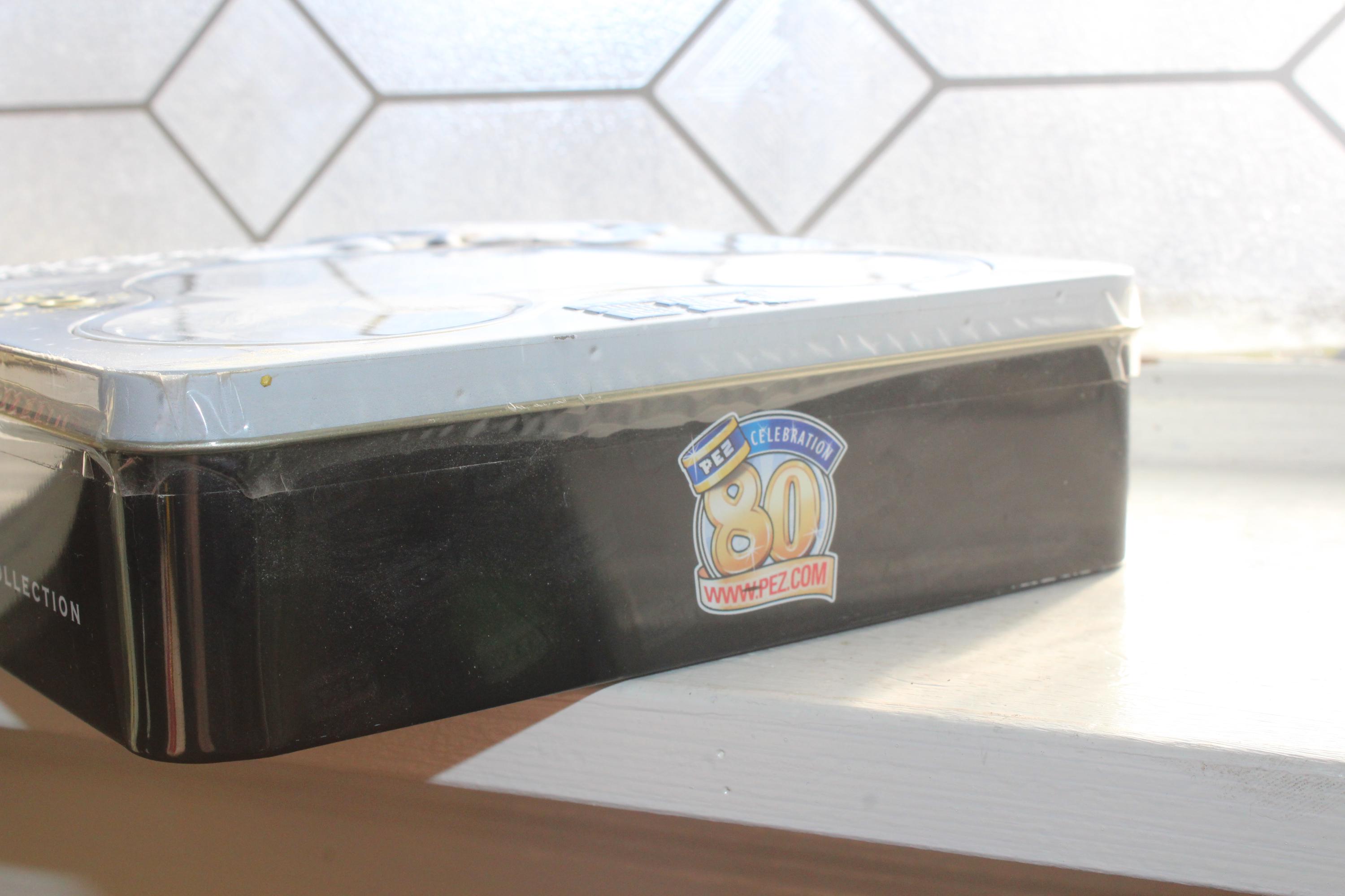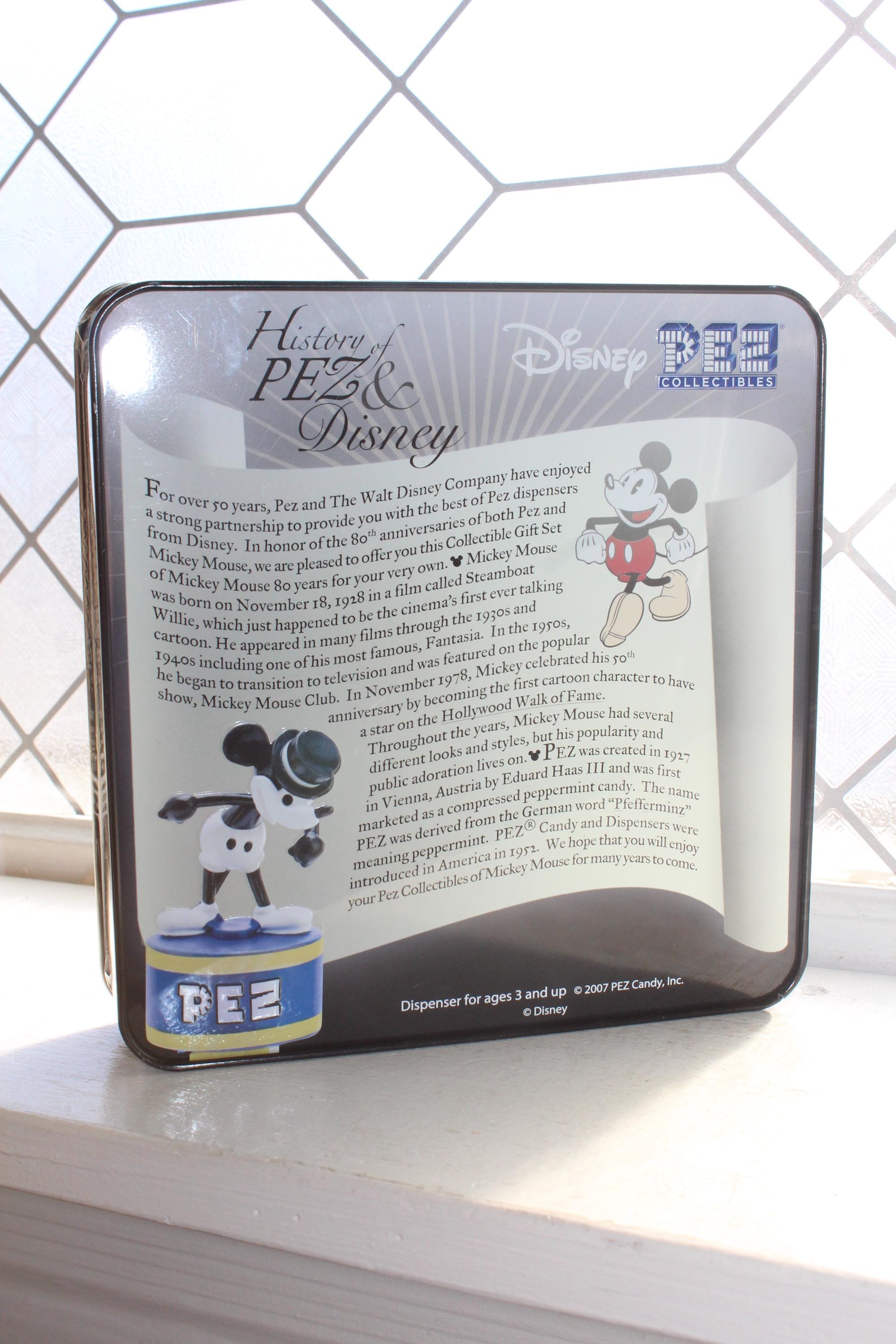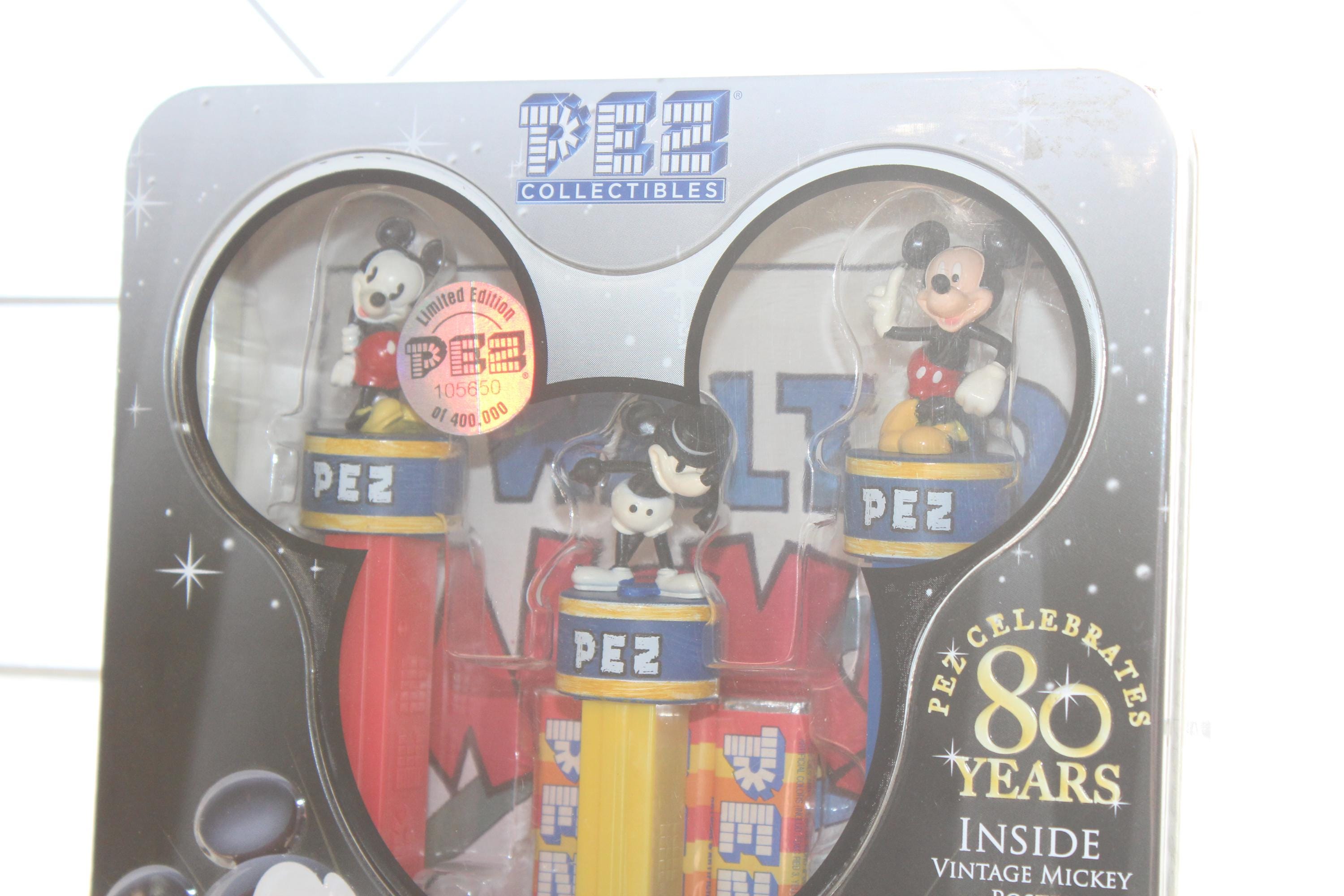 Mickey Mouse 80 Years Collectible tin with 3 Pez dispensers and a poster, in excellent unopened condition. It measures 7" wide and displays very well. This piece makes a great addition to a Mickey Mouse collection. Enjoy!