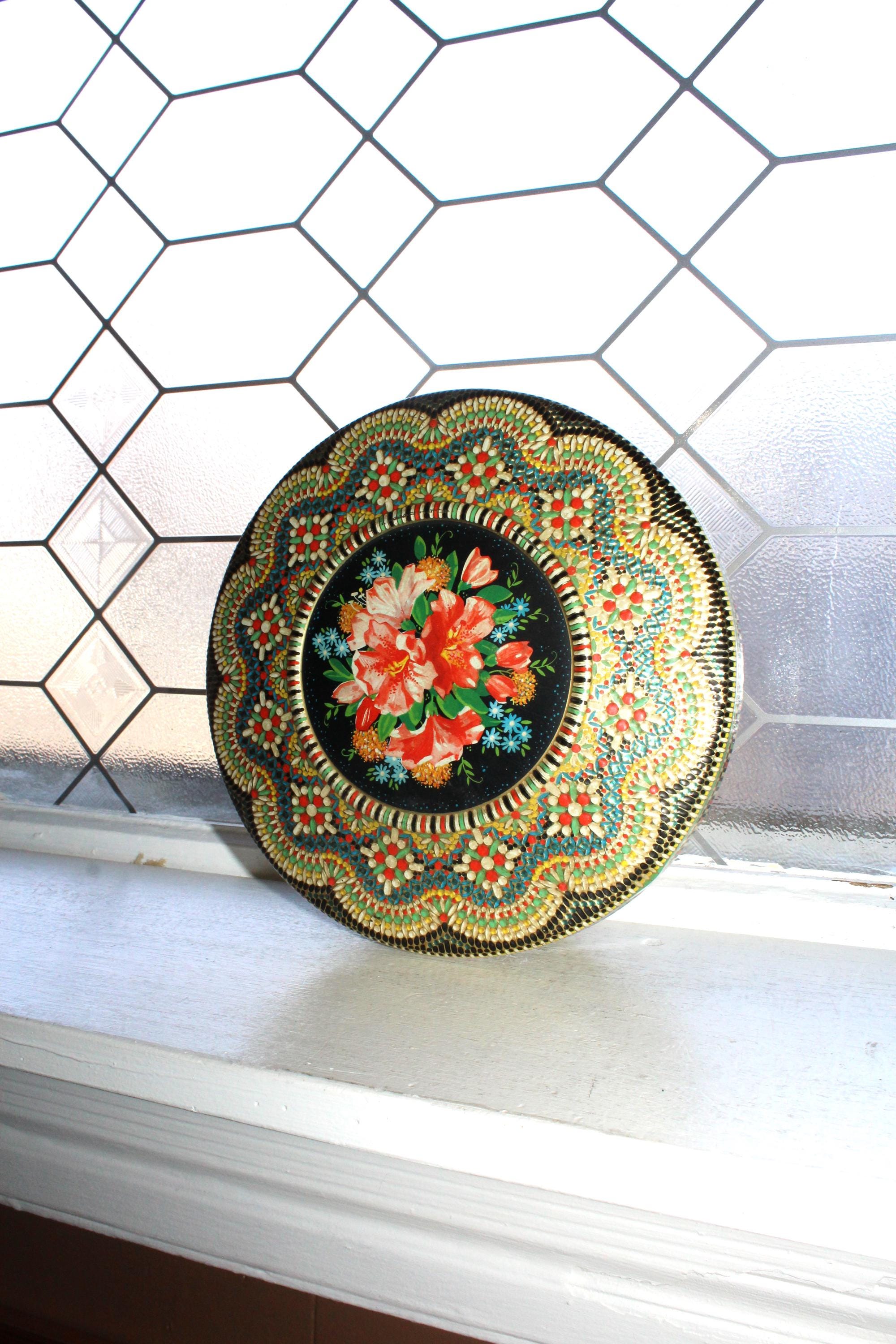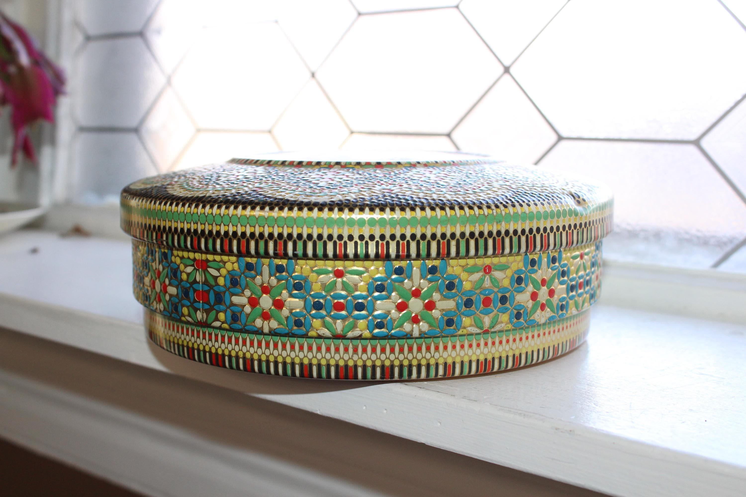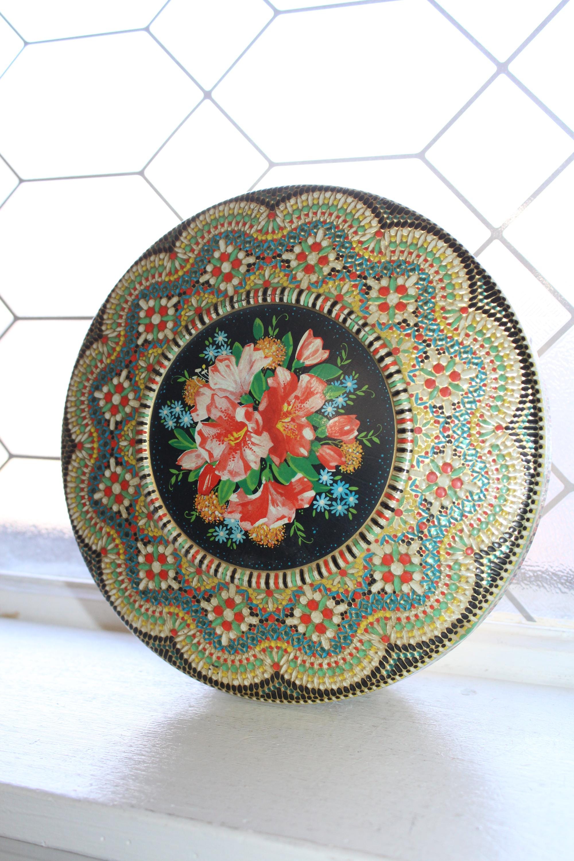 Vintage Mid Century Dutch floral round tin storage/stash box featuring colorful flowers, made in Holland, in very good condition. It measures 8 1/4" wide x 3" high. Great for use or display. Enjoy!