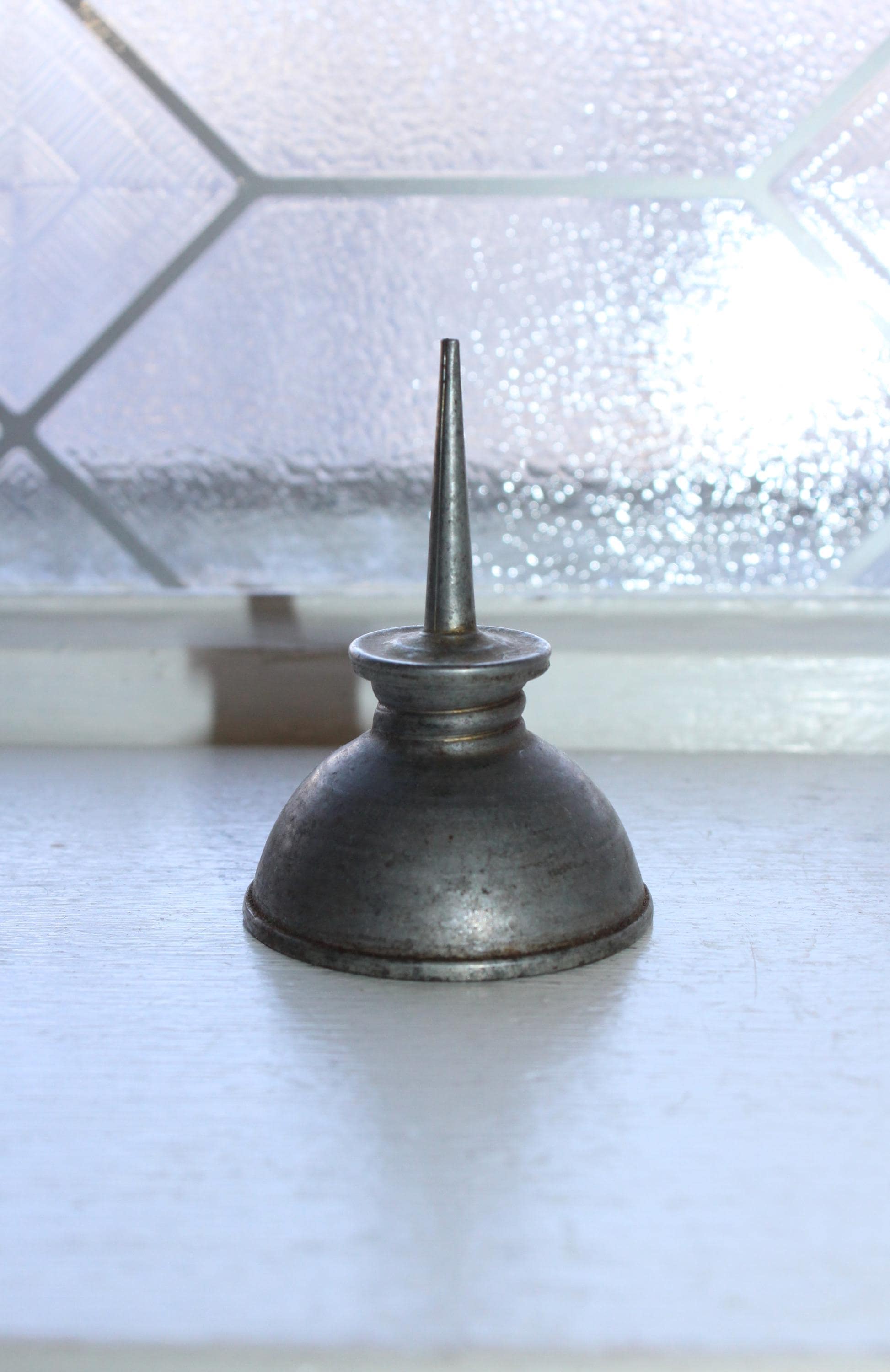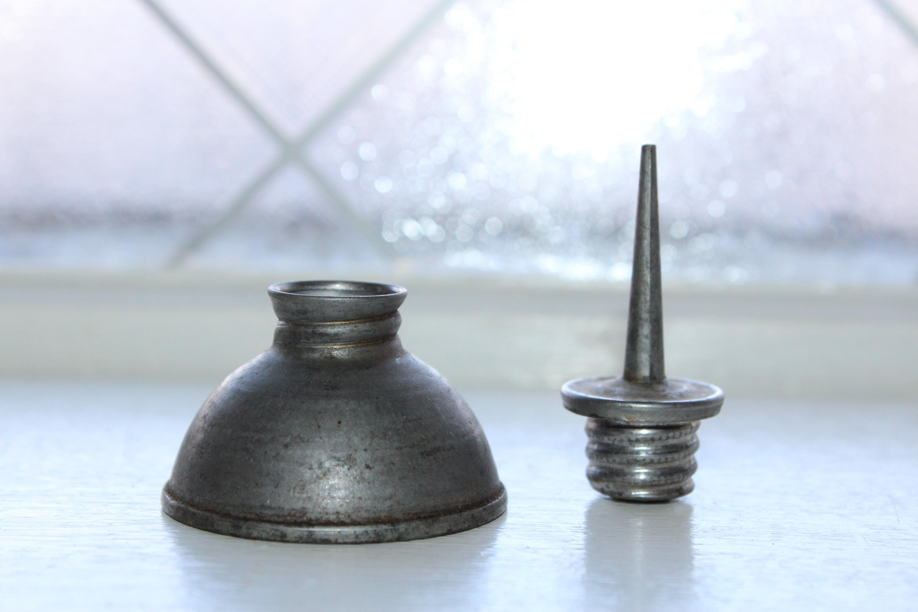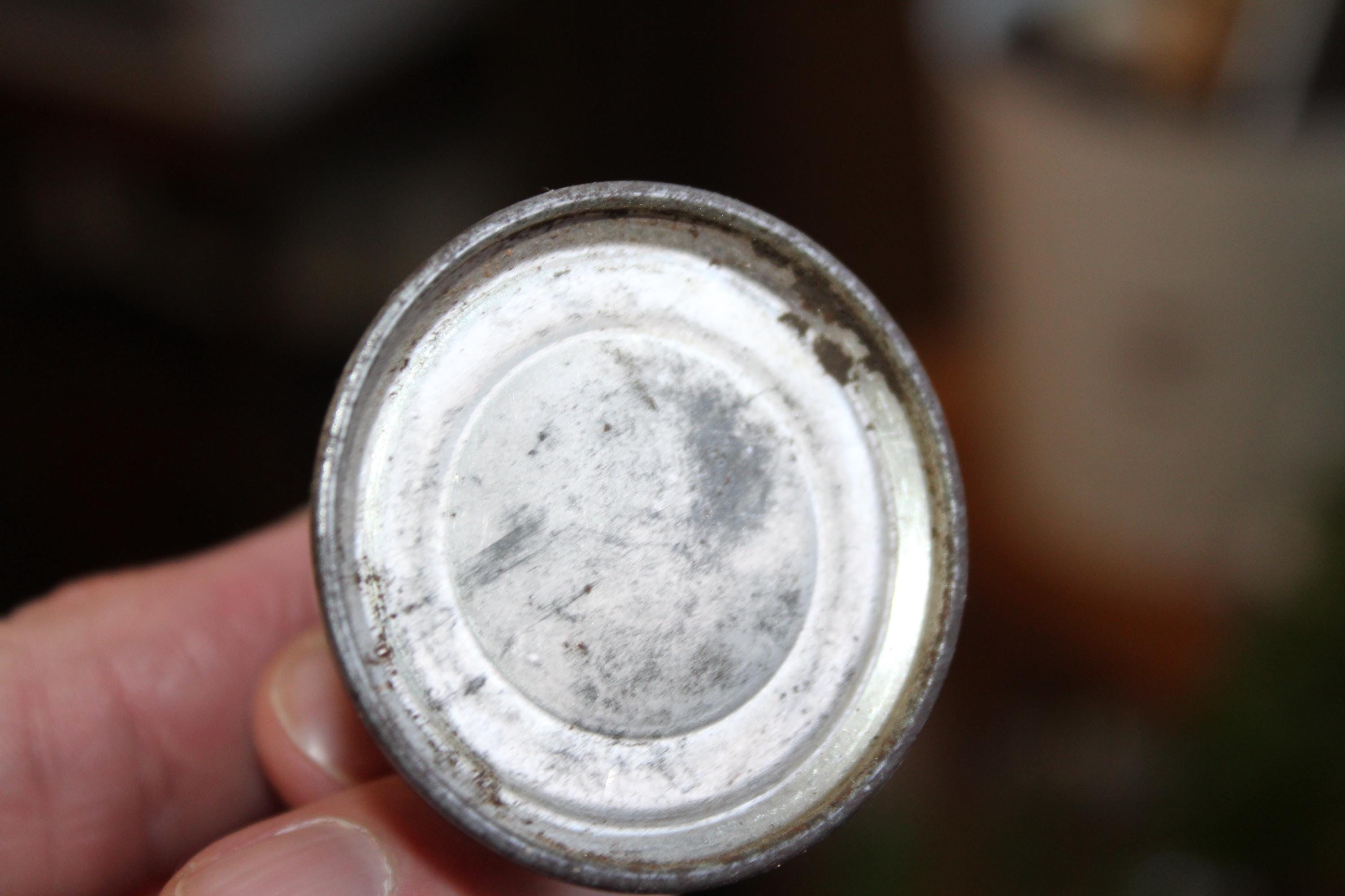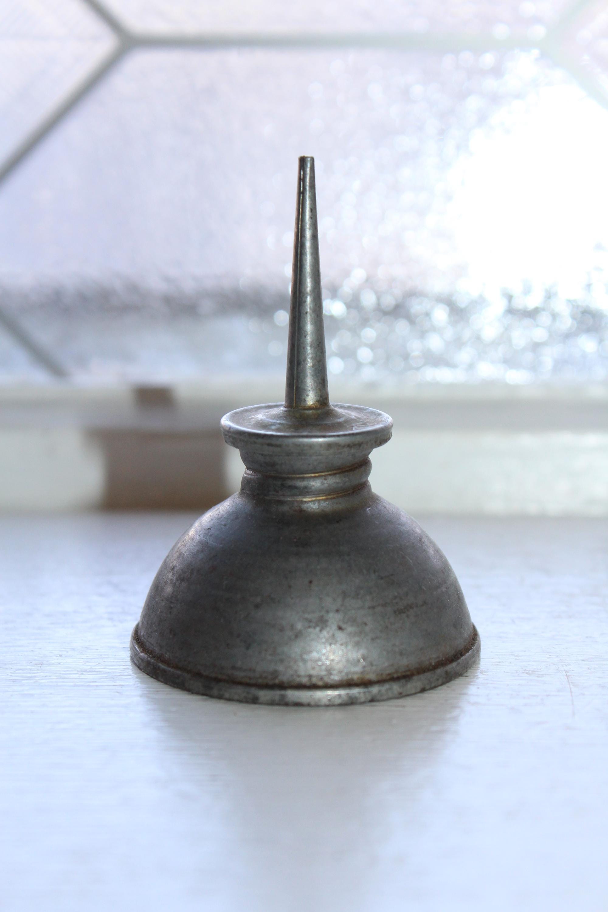 Vintage 1940s tin thumb pump oil can, in good condition. The can measures 2 3/4" high and 2" wide at the bottom. Enjoy!