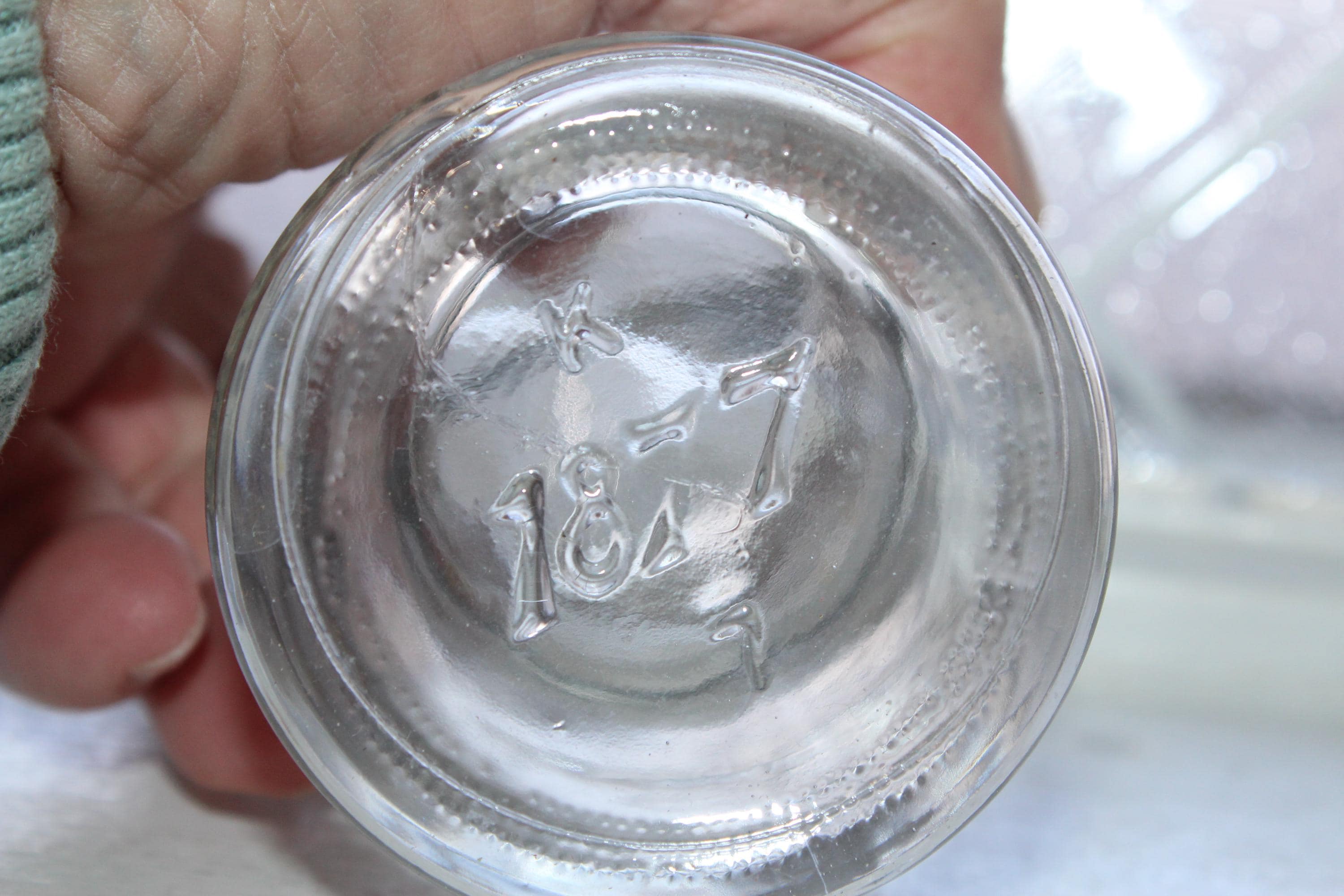 Vintage 1877 clear glass half pint stash jar with lid, made by the Kearns Glass Company, in excellent condition with no chips or cracks. The jar measures 5 1/4" high. Enjoy!