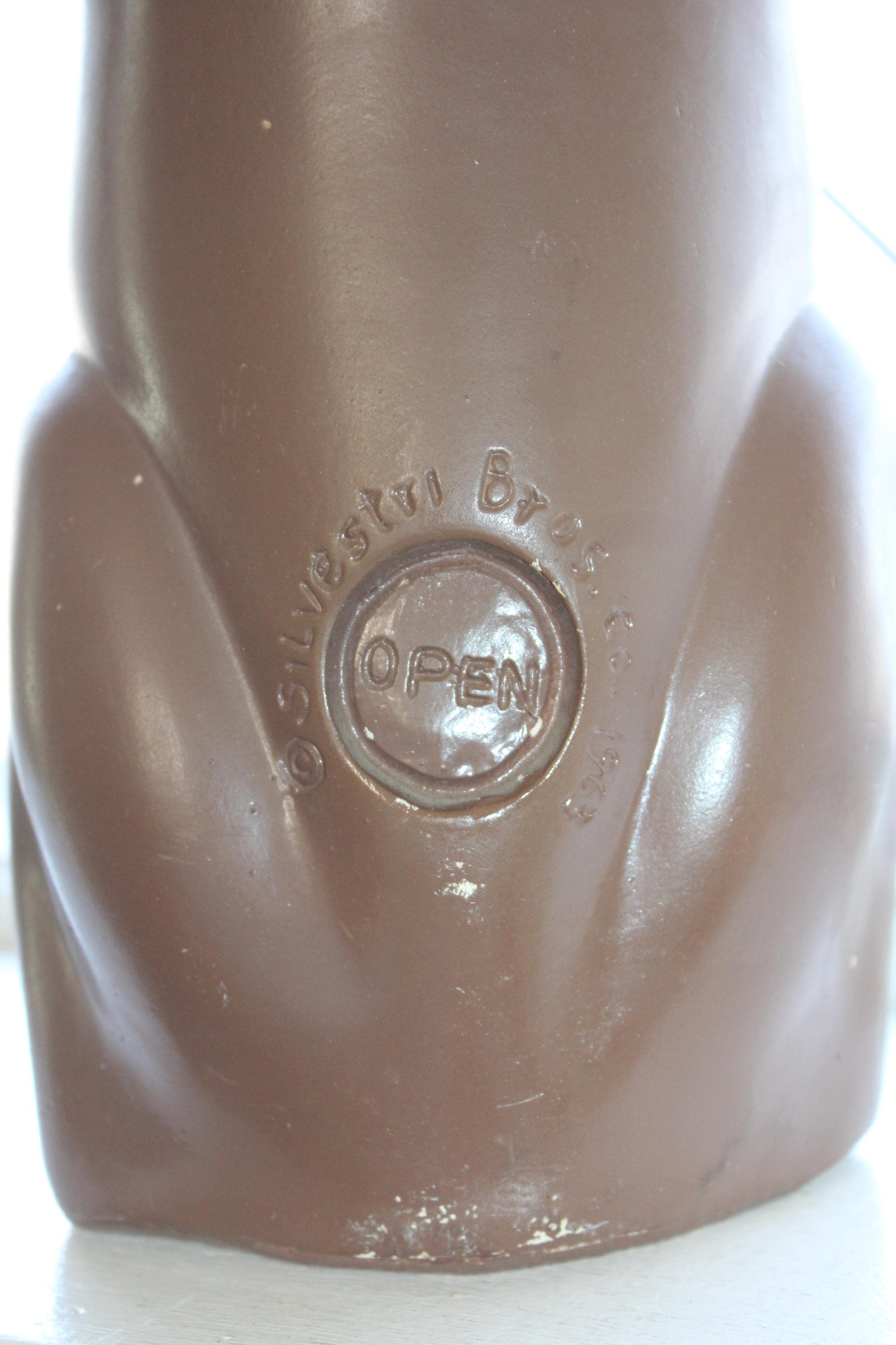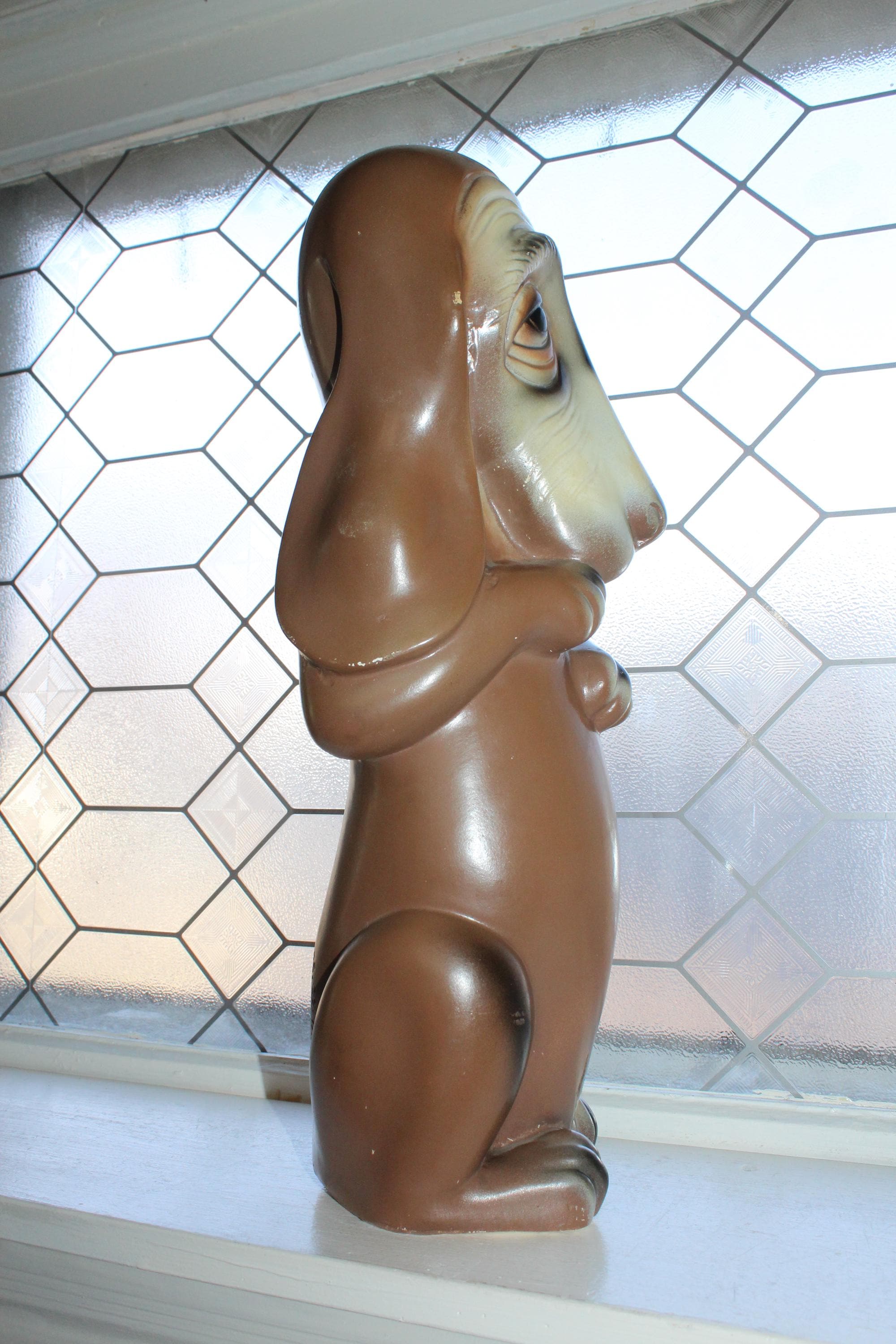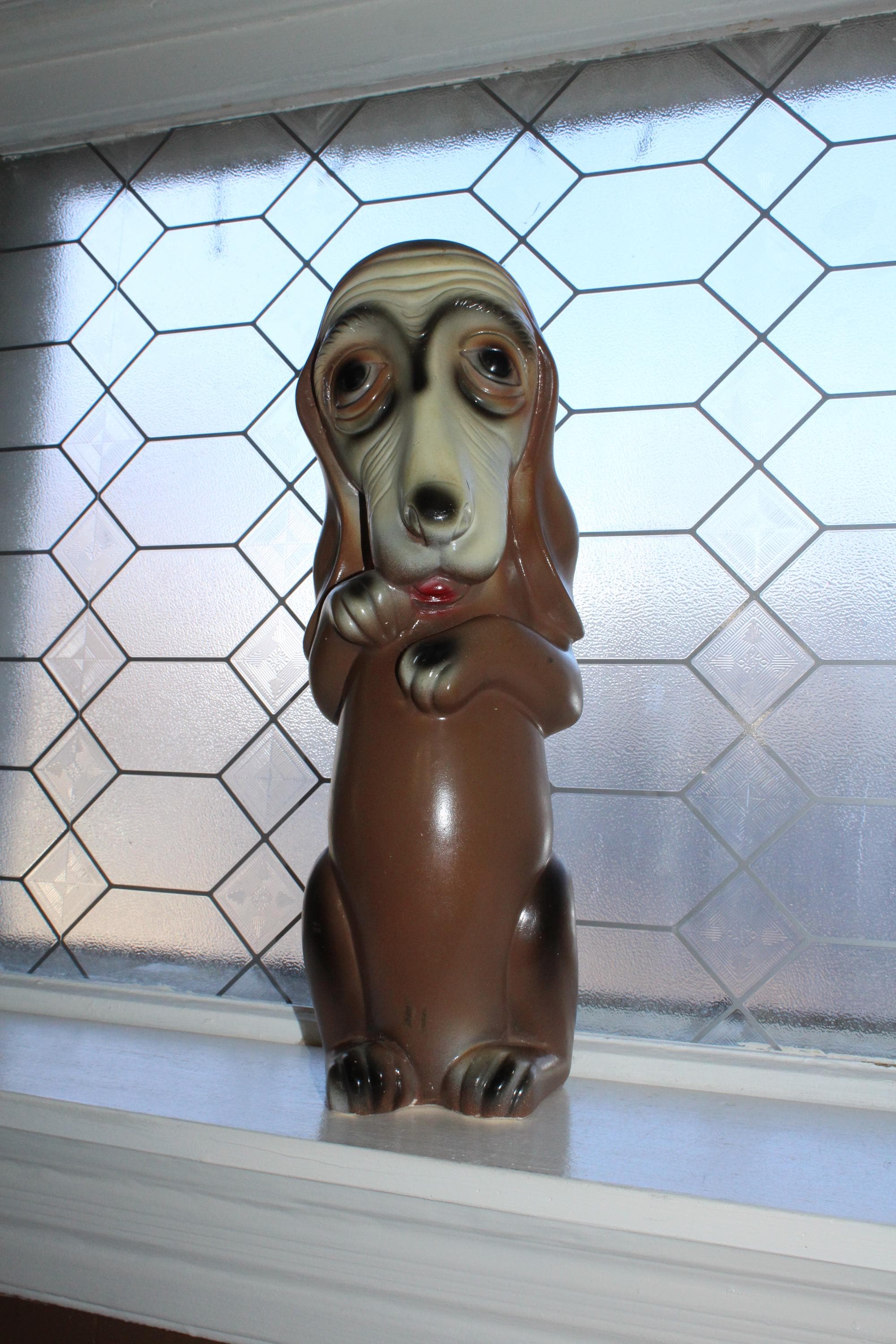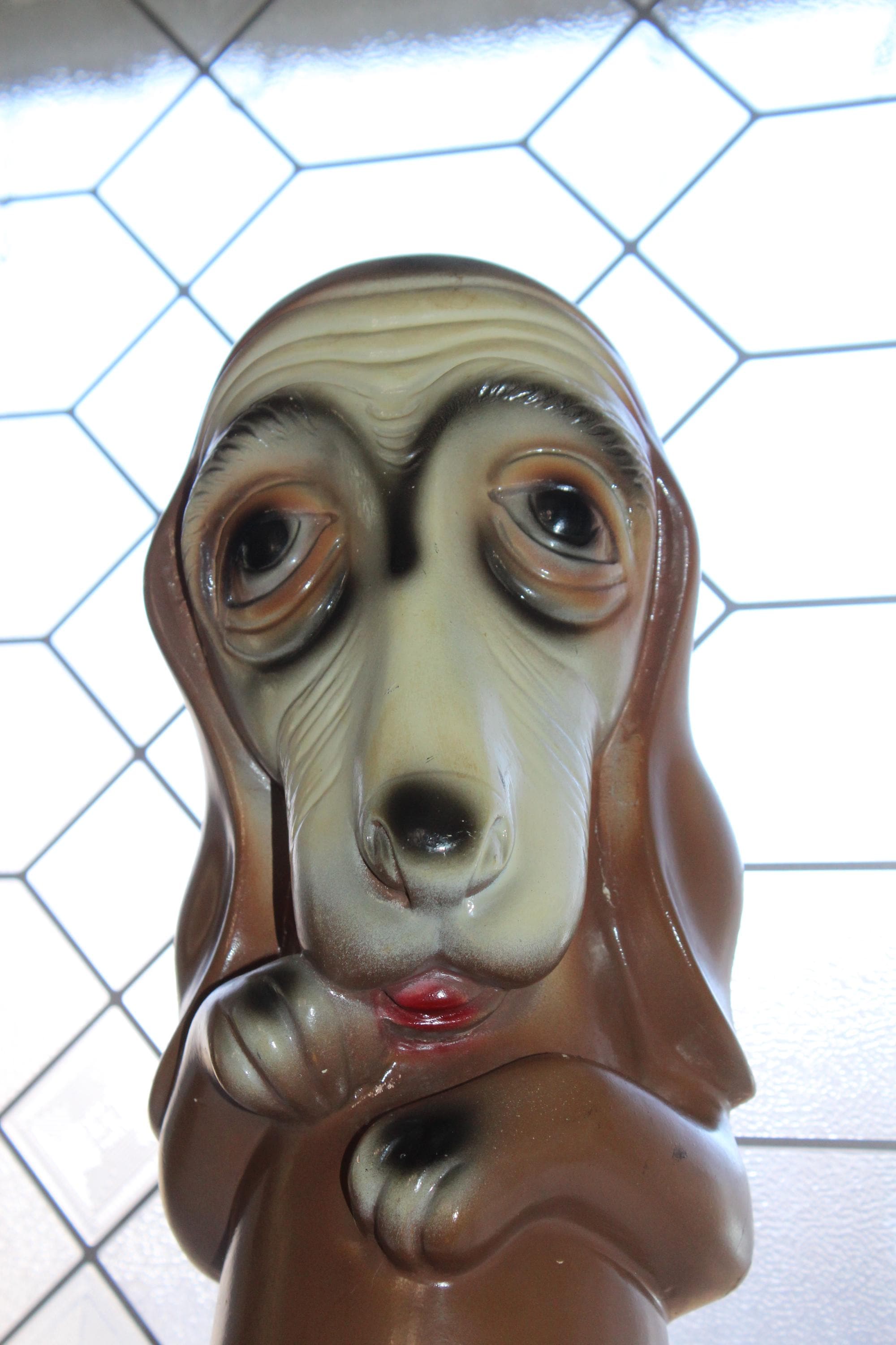 This is a large vintage 1963 Silvestri Brothers chalkware basset hound bank with original paint, in good condition with the original plug intact. The bank measures 17 1/2" high. No damage other than minor paint wear, great for display. Enjoy!