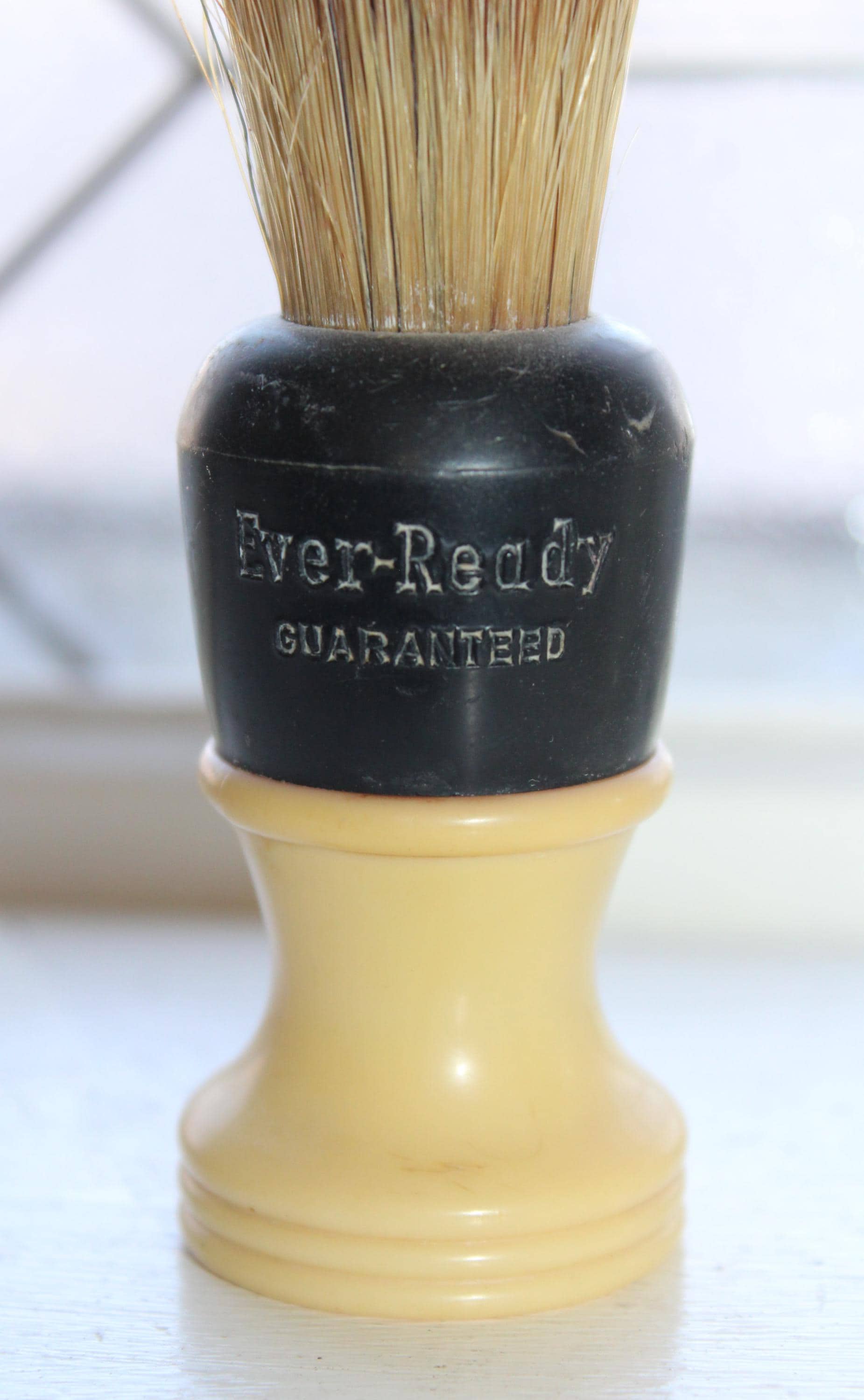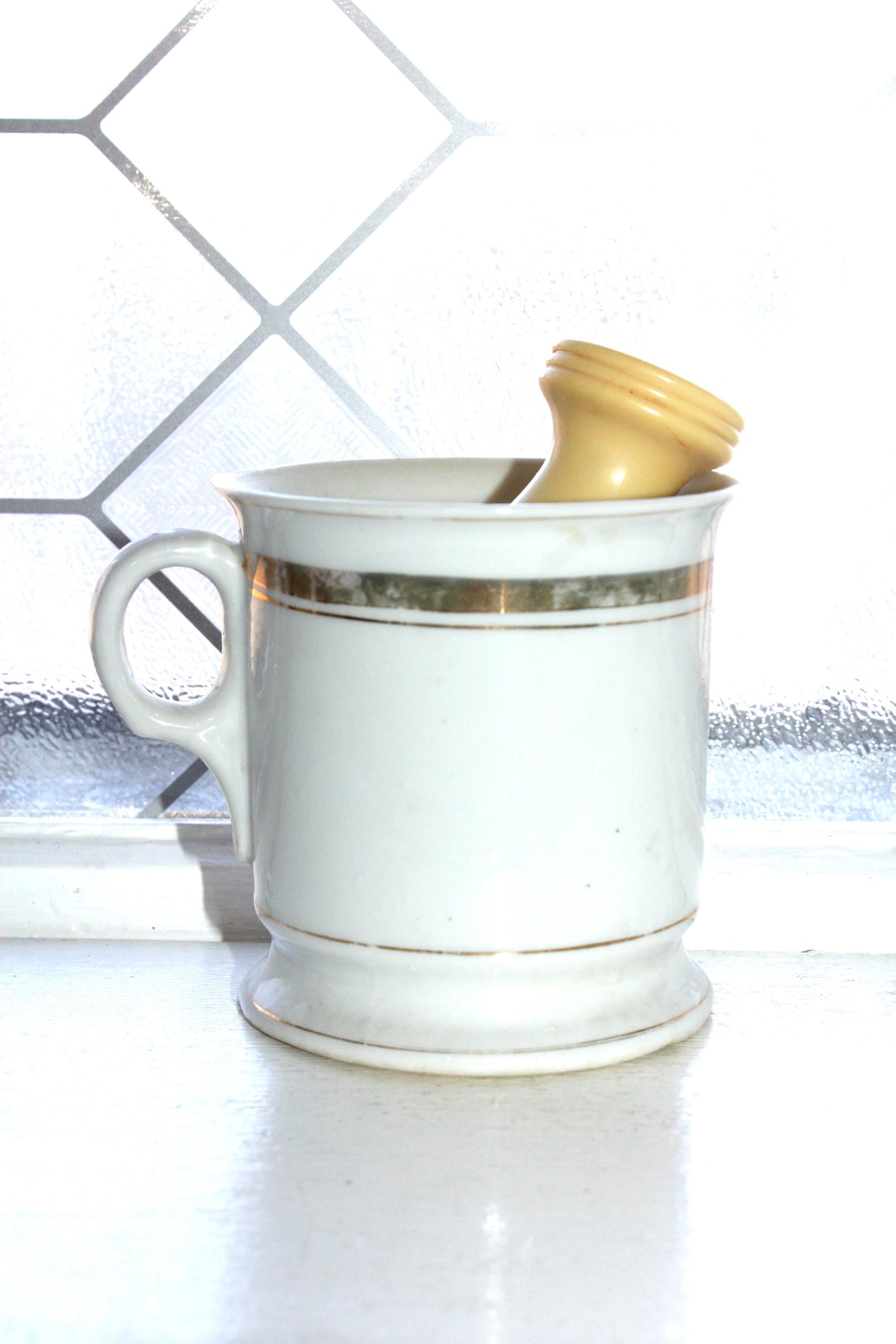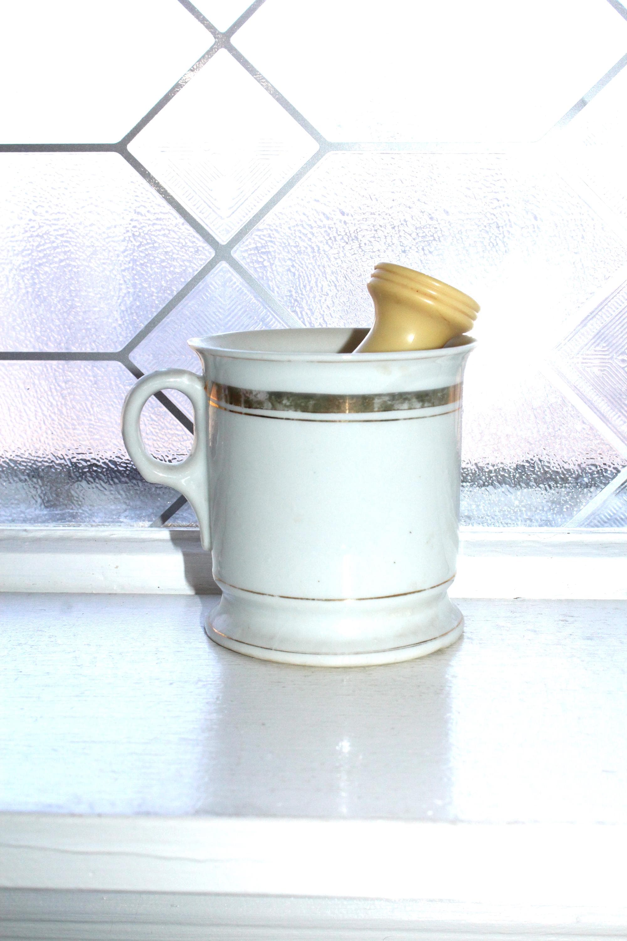 Antique stoneware shaving mug featuring gold stripes and an Ever-Ready shaving brush. The mug measures 3 5/8" high. Well loved but no cracks, great as a gift for your favorite guy or gal. Enjoy!