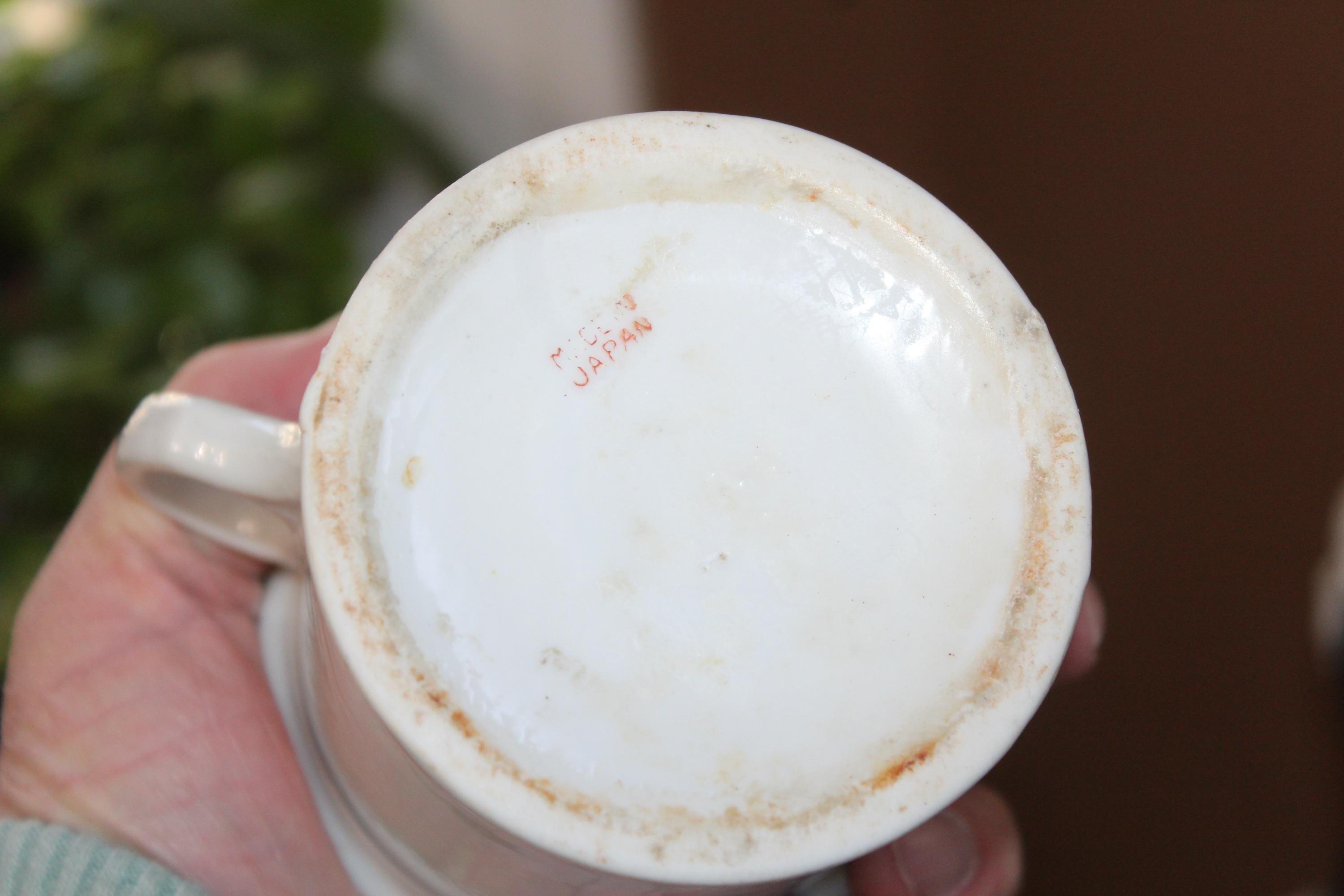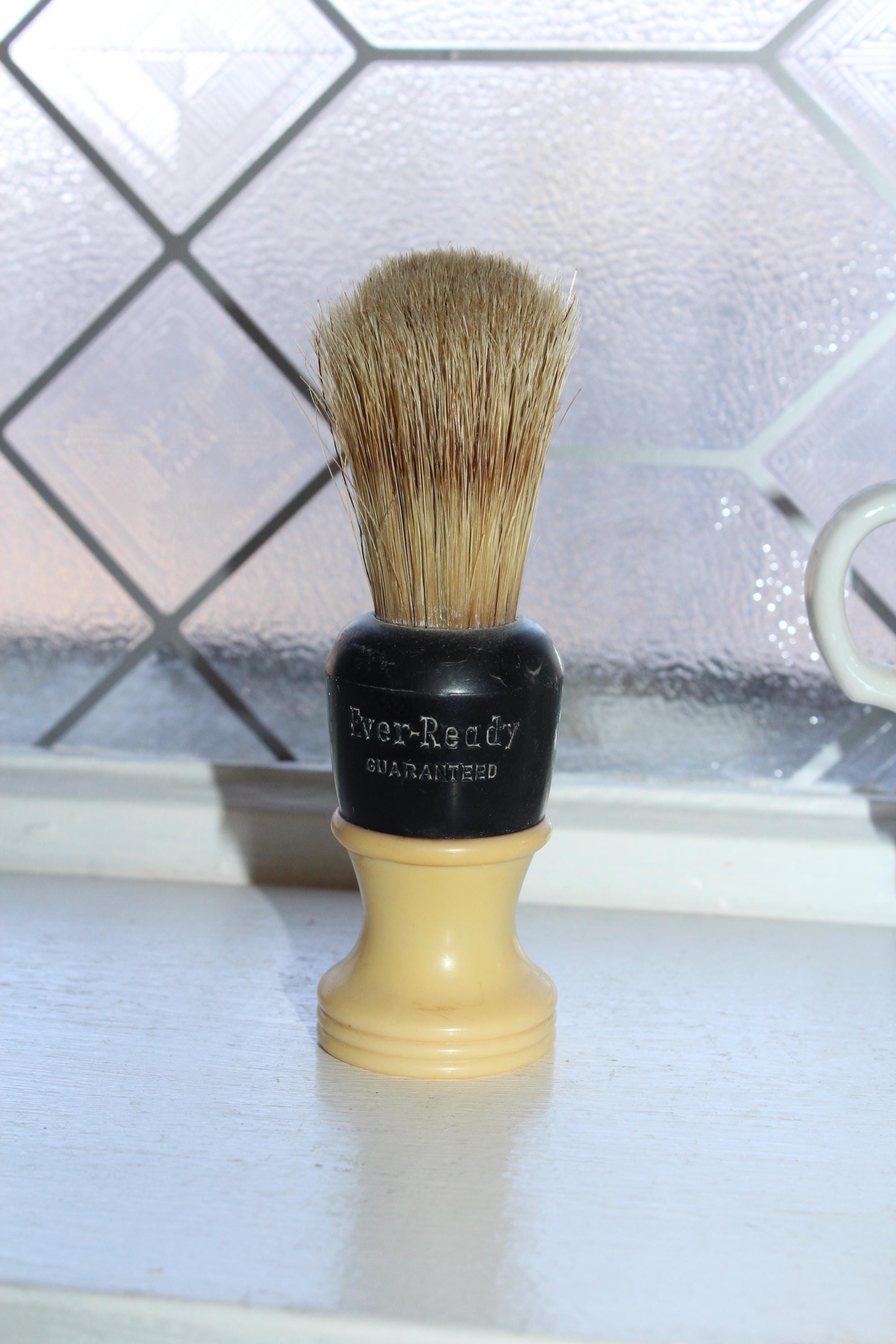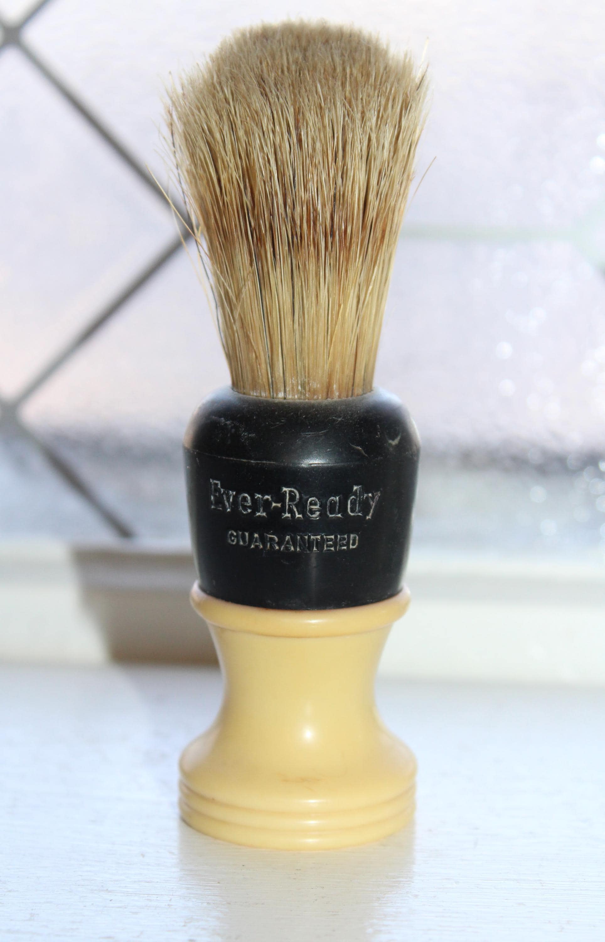 Antique stoneware shaving mug featuring gold stripes and an Ever-Ready shaving brush. The mug measures 3 5/8" high. Well loved but no cracks, great as a gift for your favorite guy or gal. Enjoy!