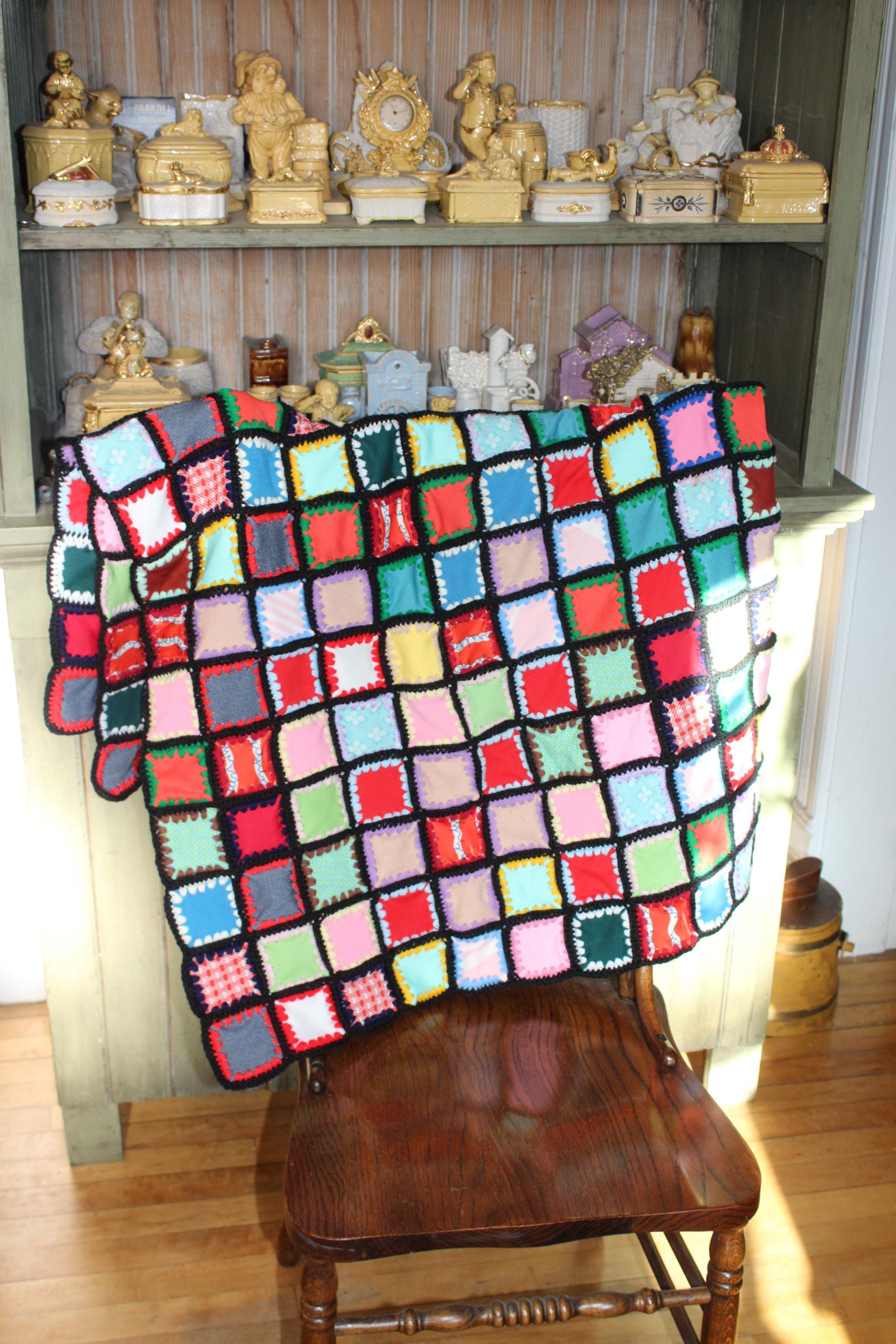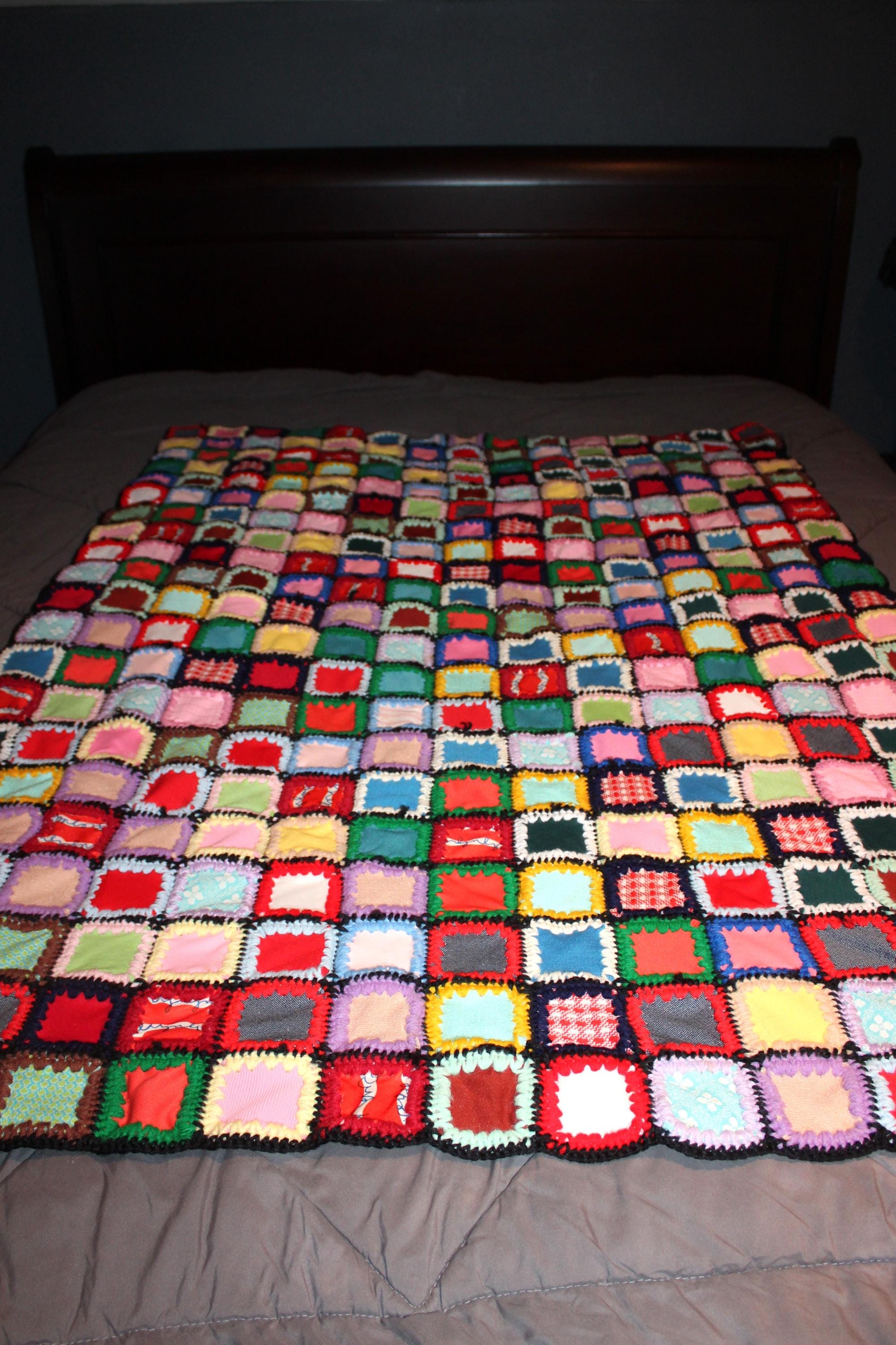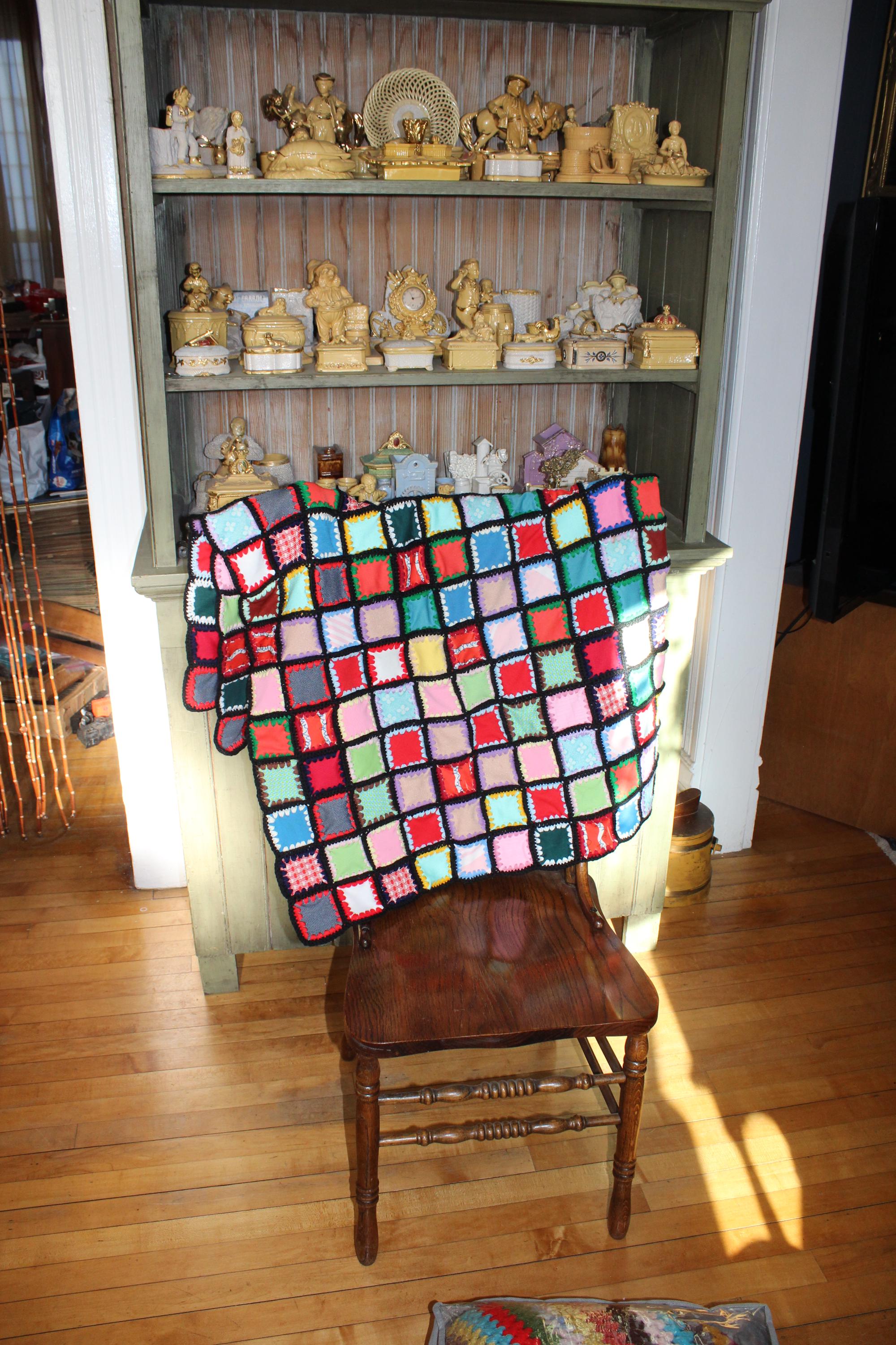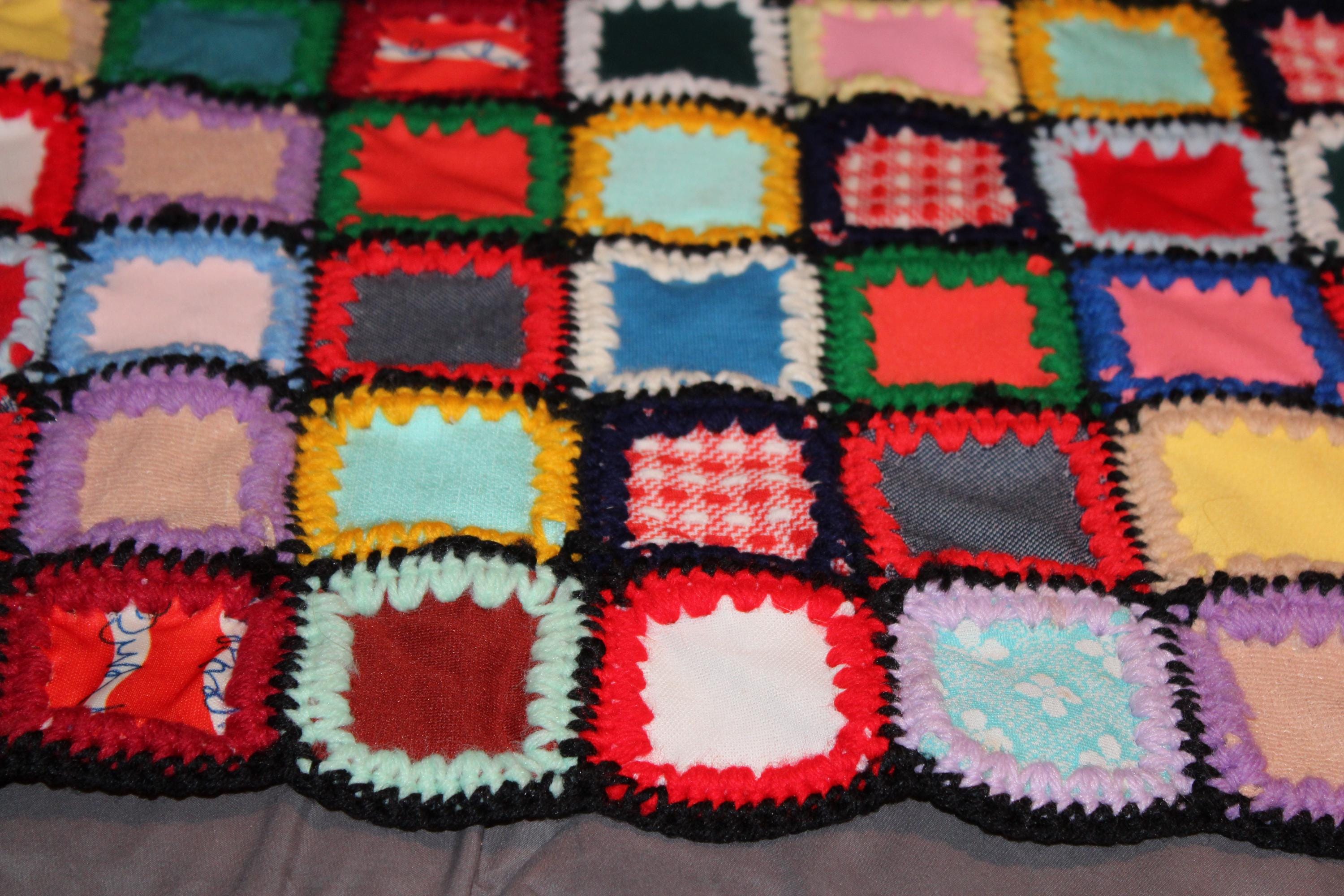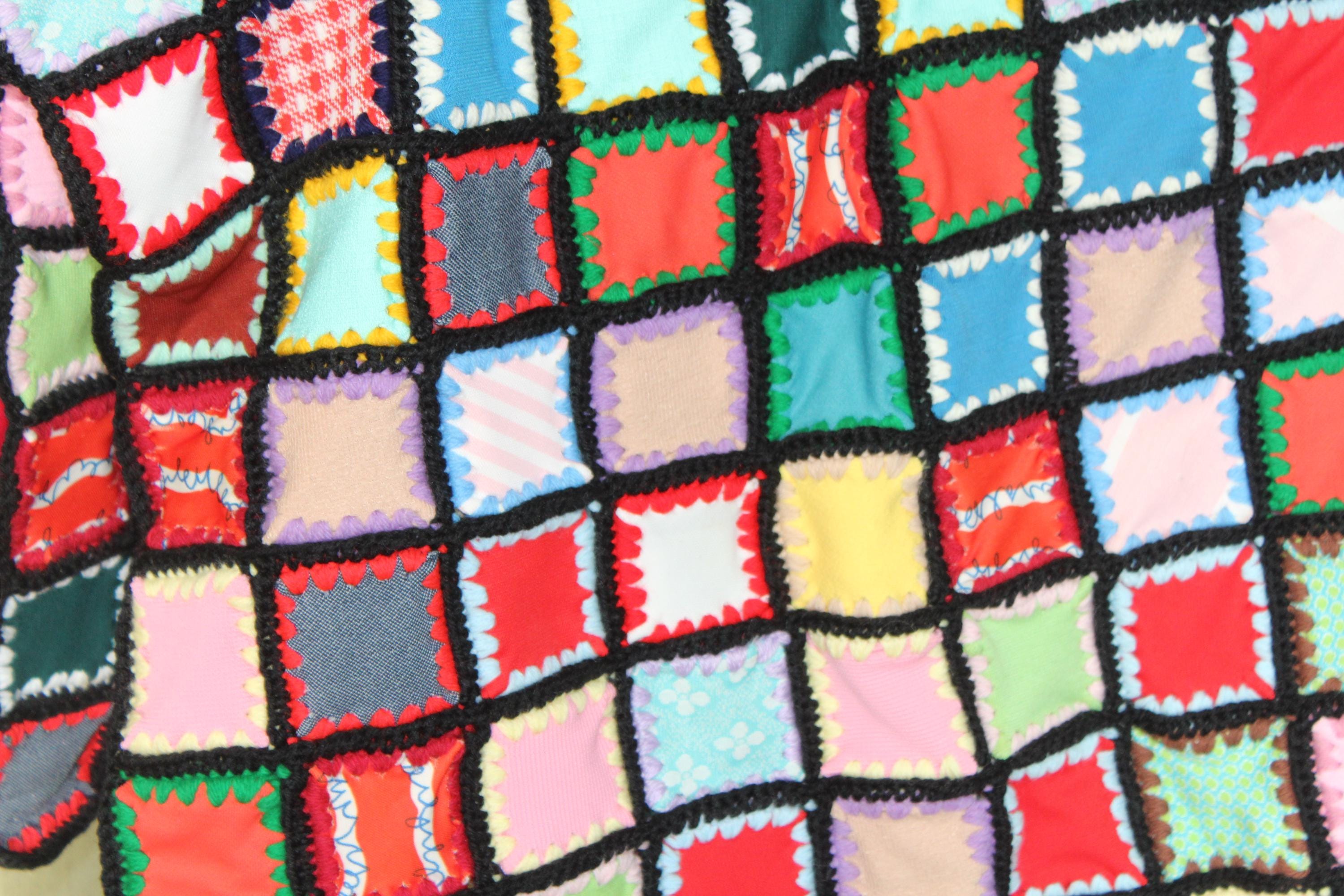 This is a vintage 1960s handmade crocheted Granny Square afghan quilt, bright and colorful, in very good condition with no damage. It measures 62" x 44". The colors are bright and not faded. Really a great display piece with no damage. Photos taken on a queen sized bed. Enjoy!
