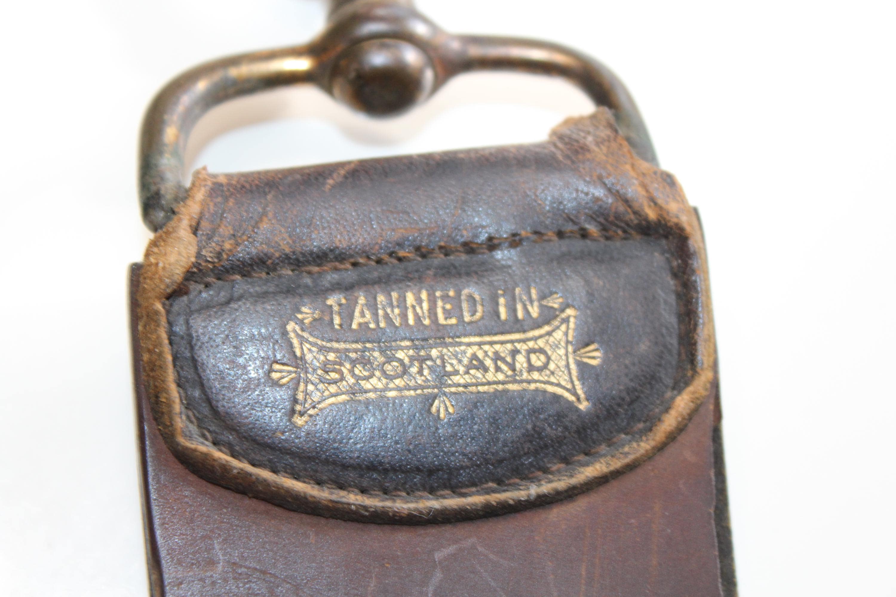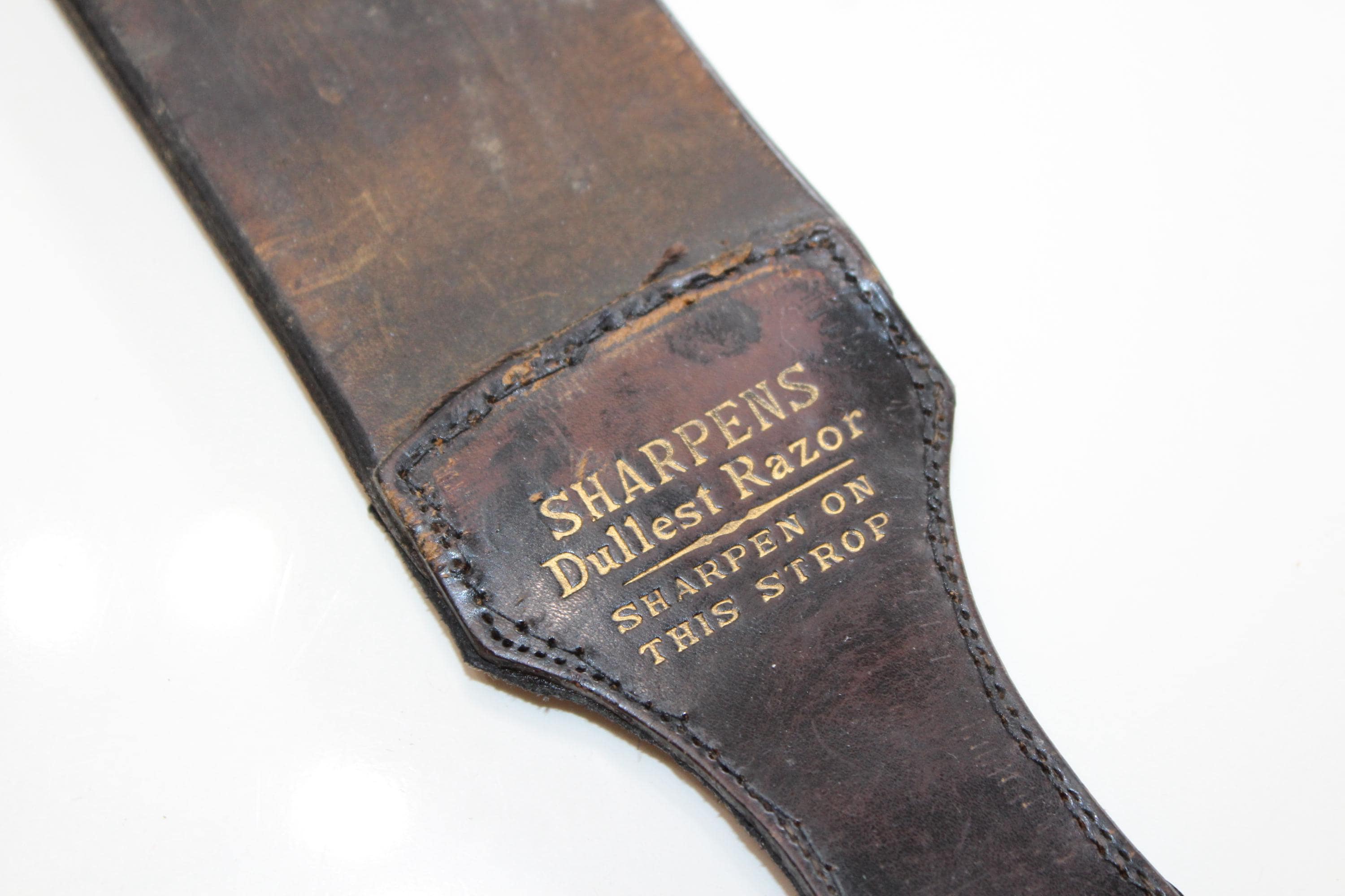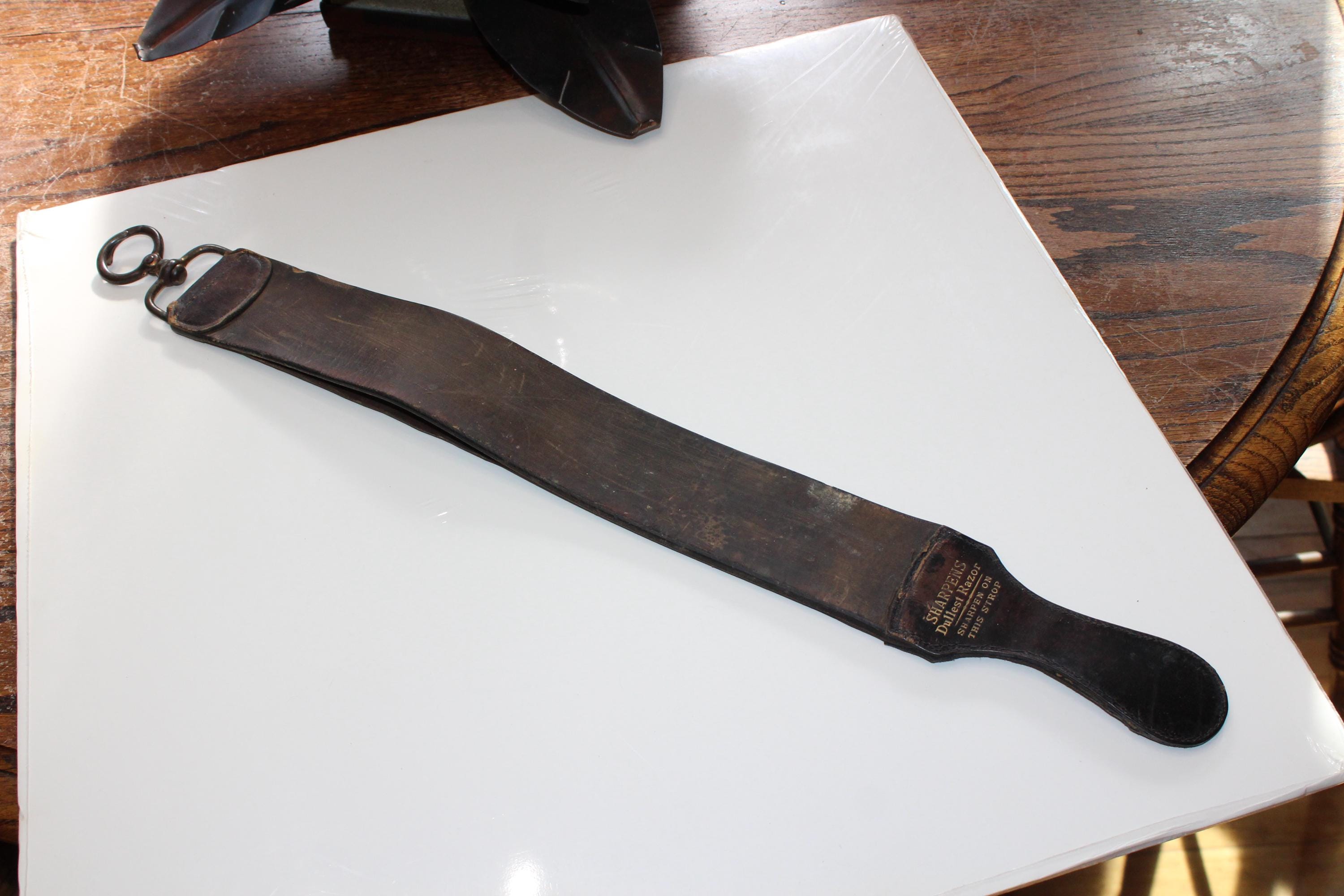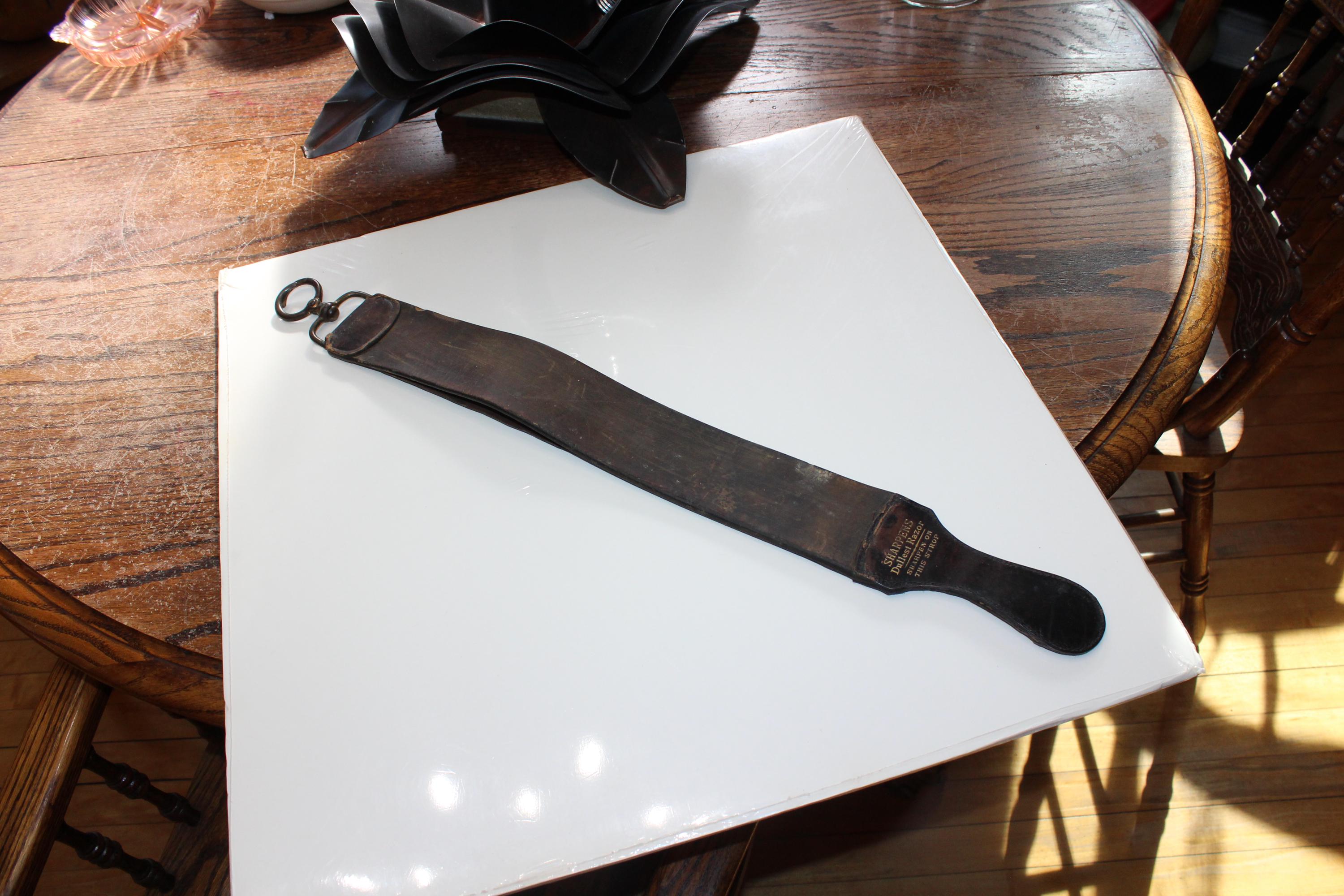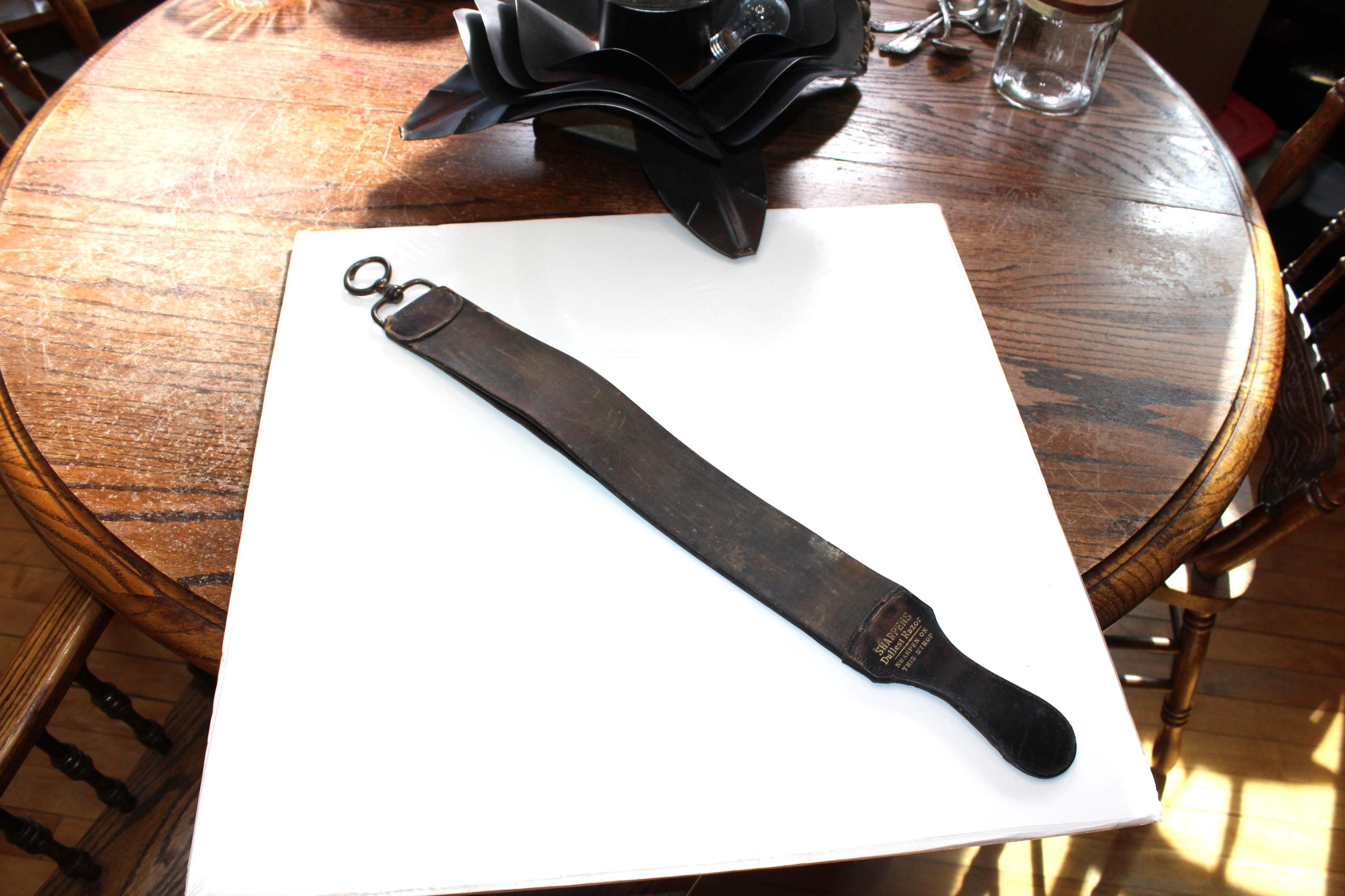 This is an antique barbershop leather razor strop for sharpening razors, made in Scotland. It is in very good used condition and measures 25 1/2" long. Enjoy!
