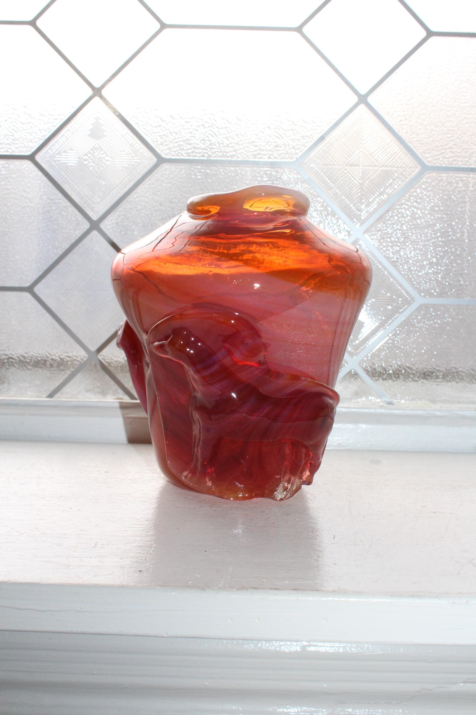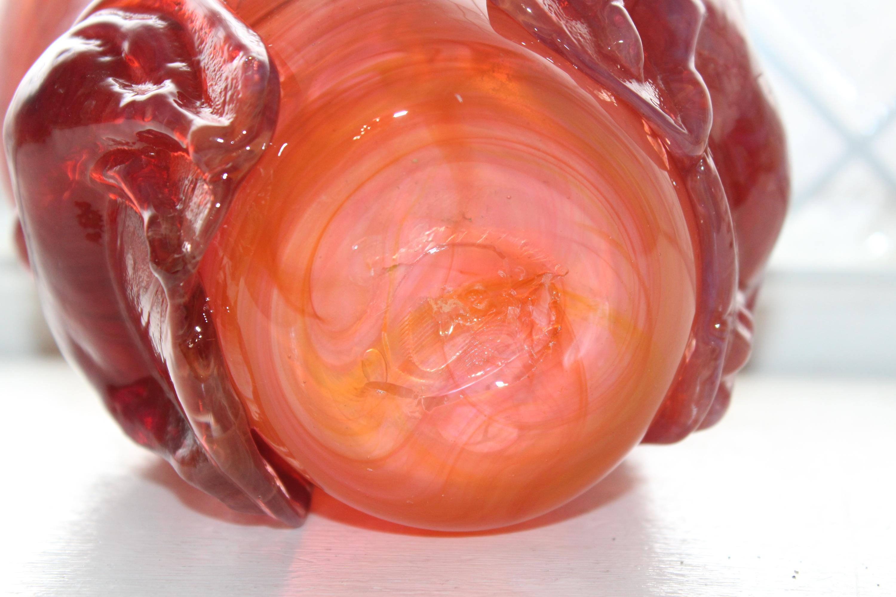 Gorgeous studio art glass vase featuring a molded cow and horse, all in beautiful orange, in excellent condition. The vase measures 5 1/2" high and has no chips or cracks, perfect for use or display. This piece came from a large collection of unique art glass in western Minnesota. Enjoy!