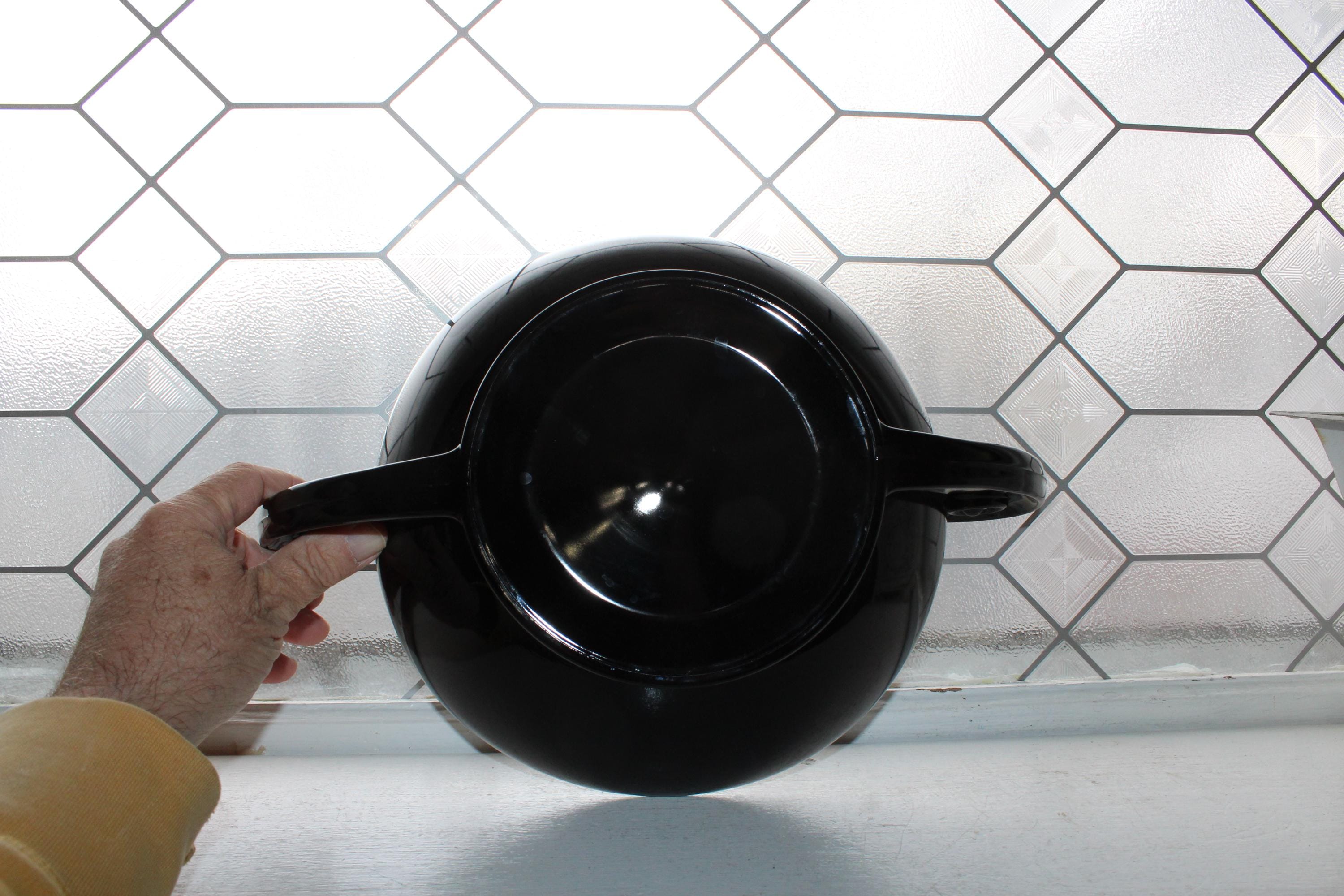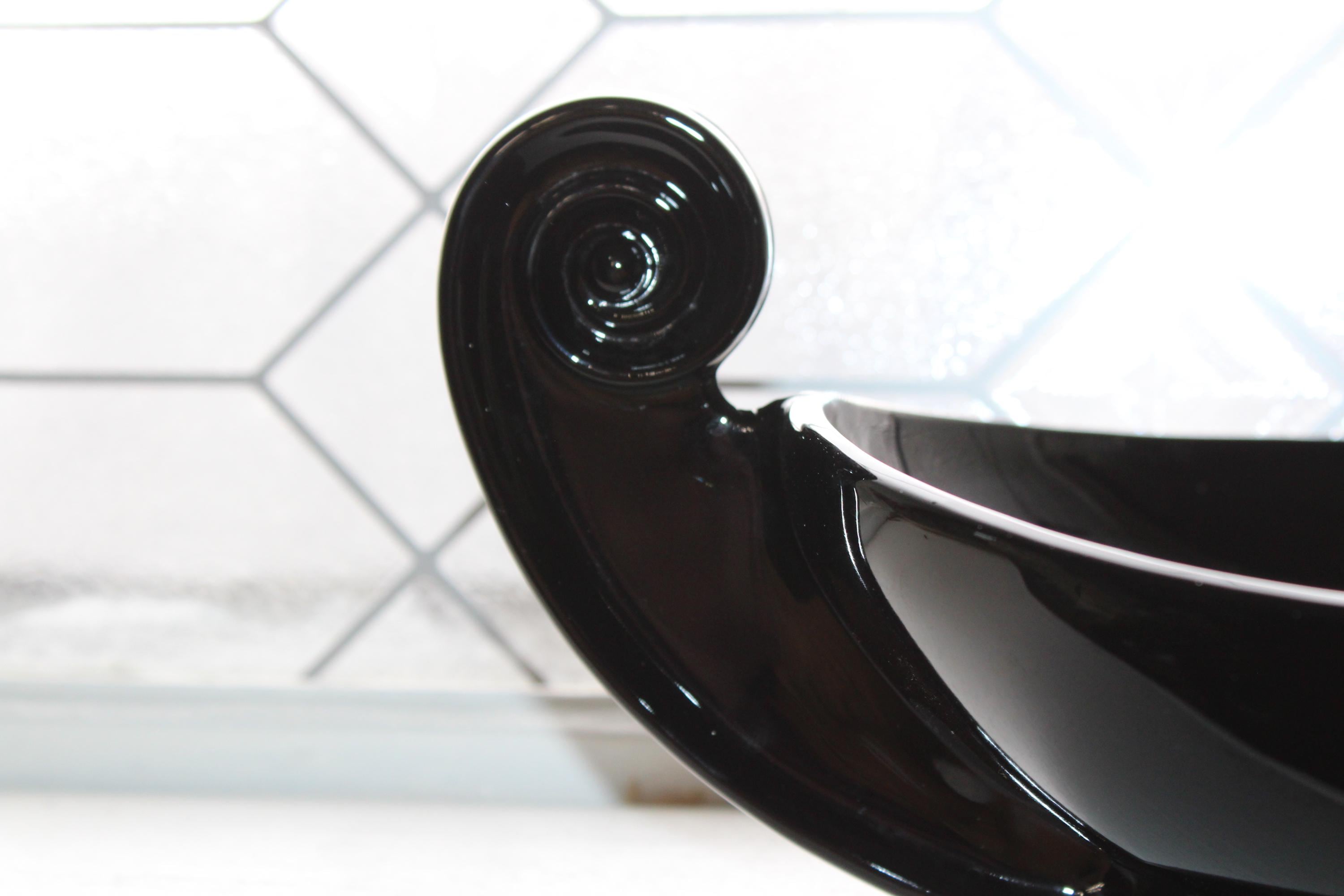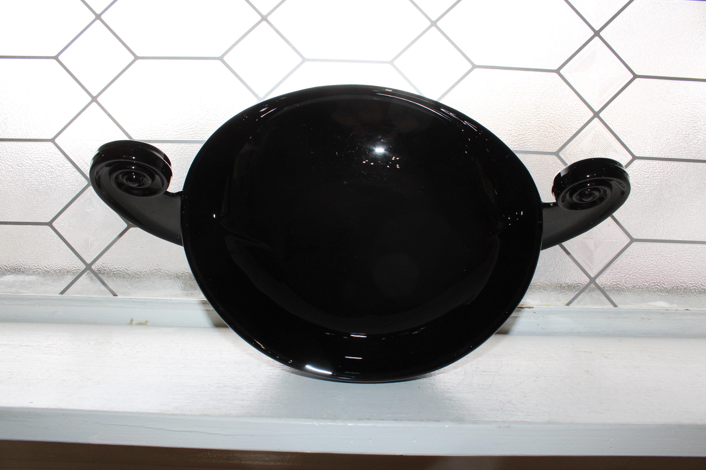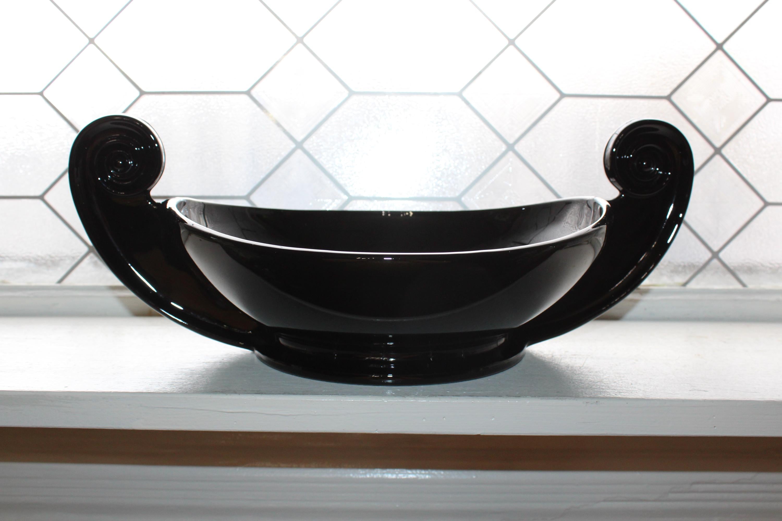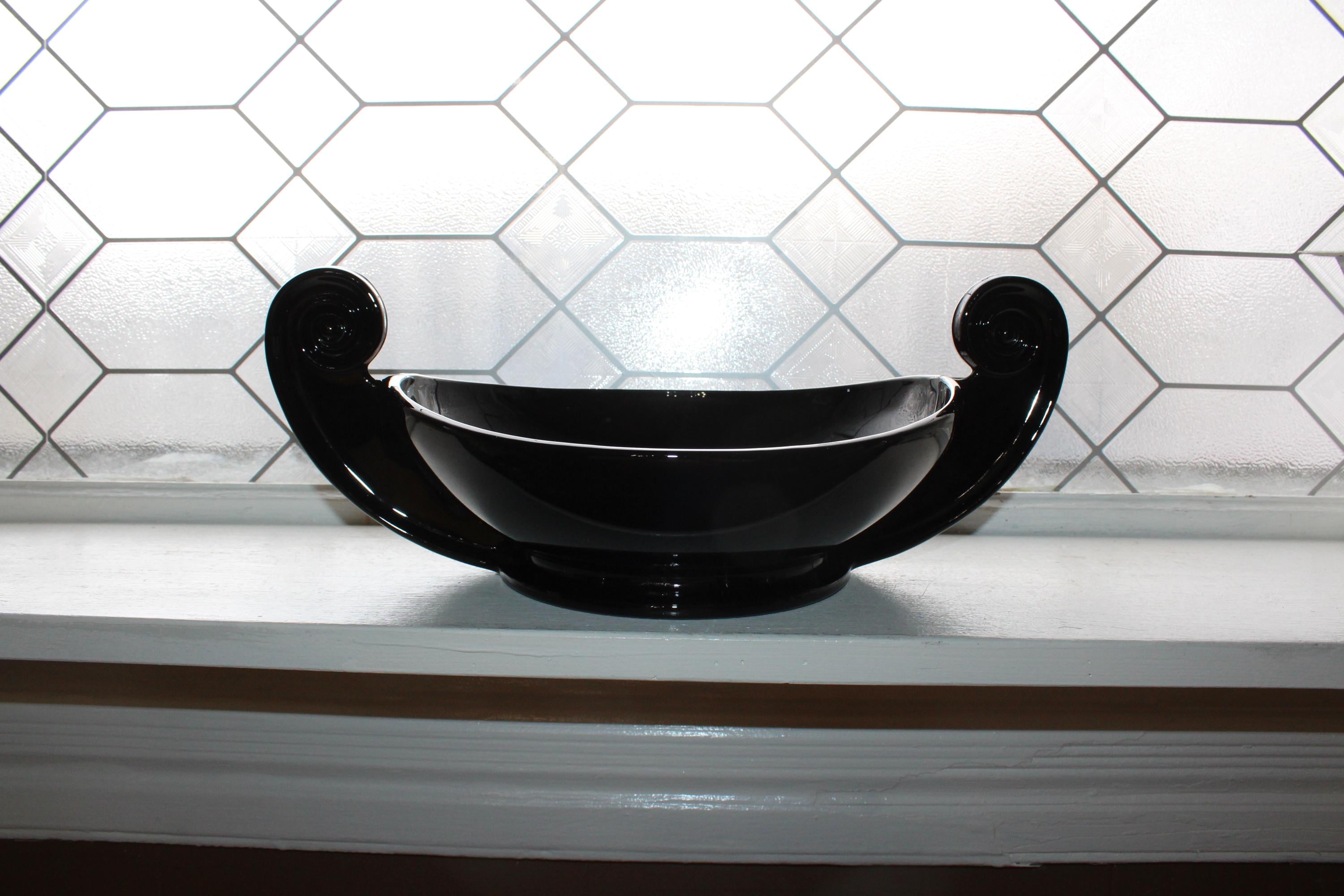 Vintage 1930s Art Deco Fostoria ebony black glass handled Grecian Scroll console bowl designed by George Sakier, in very good condition. The bowl measures 14 1/4" wide x 5 1/2" high. No chips or cracks, just minor interior scratching, perfect for use or display. Enjoy!