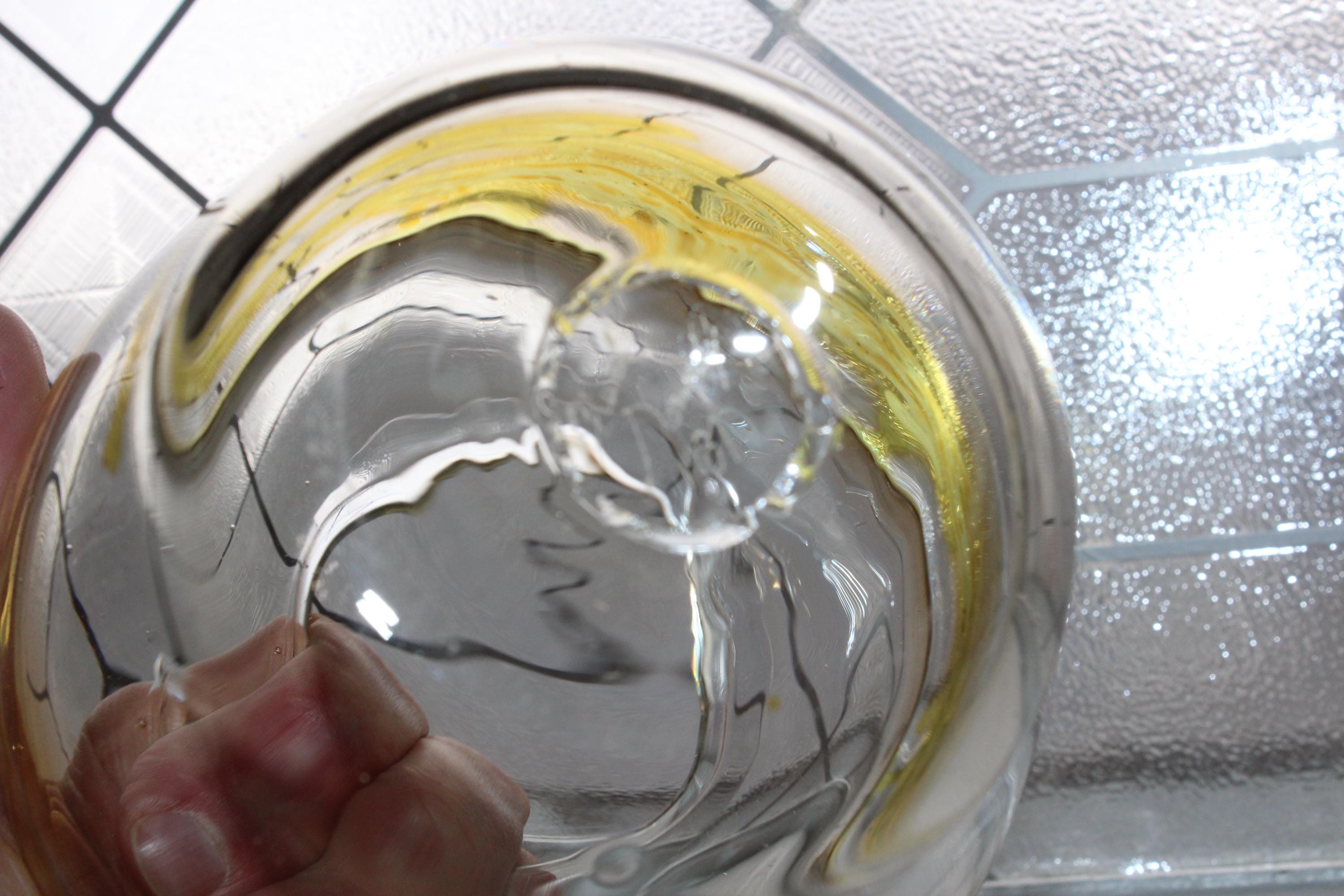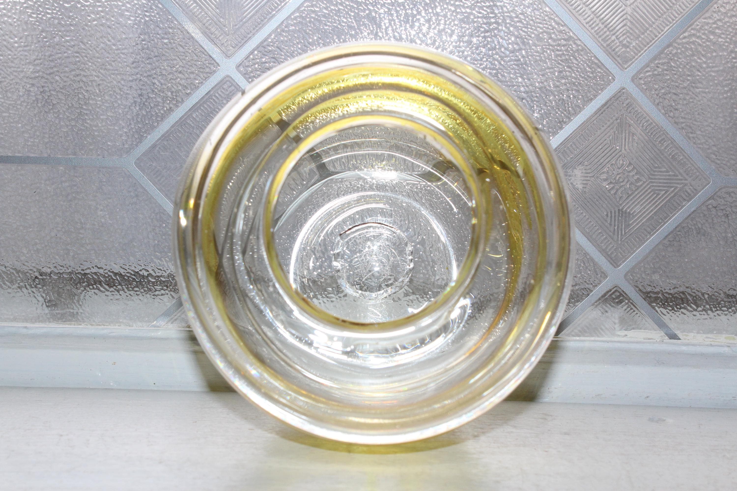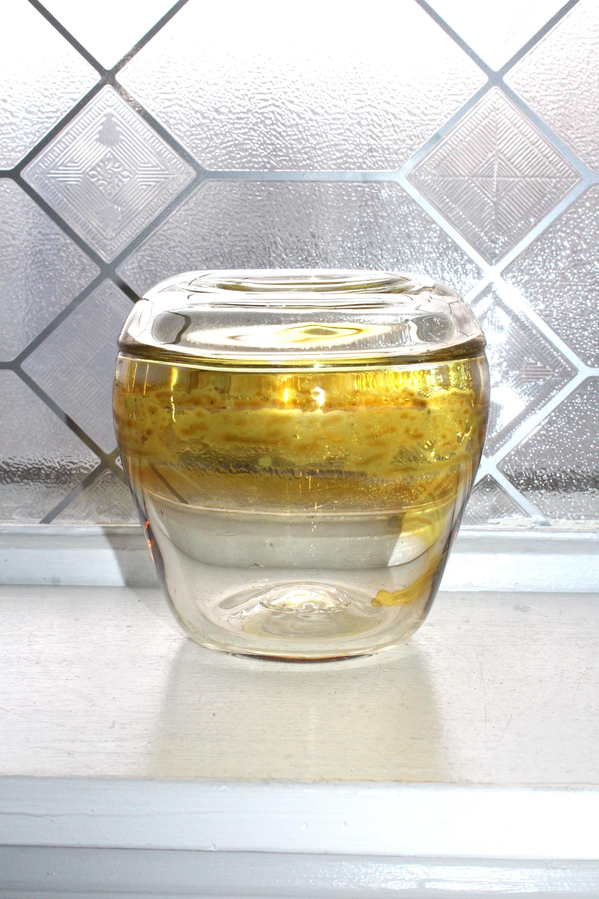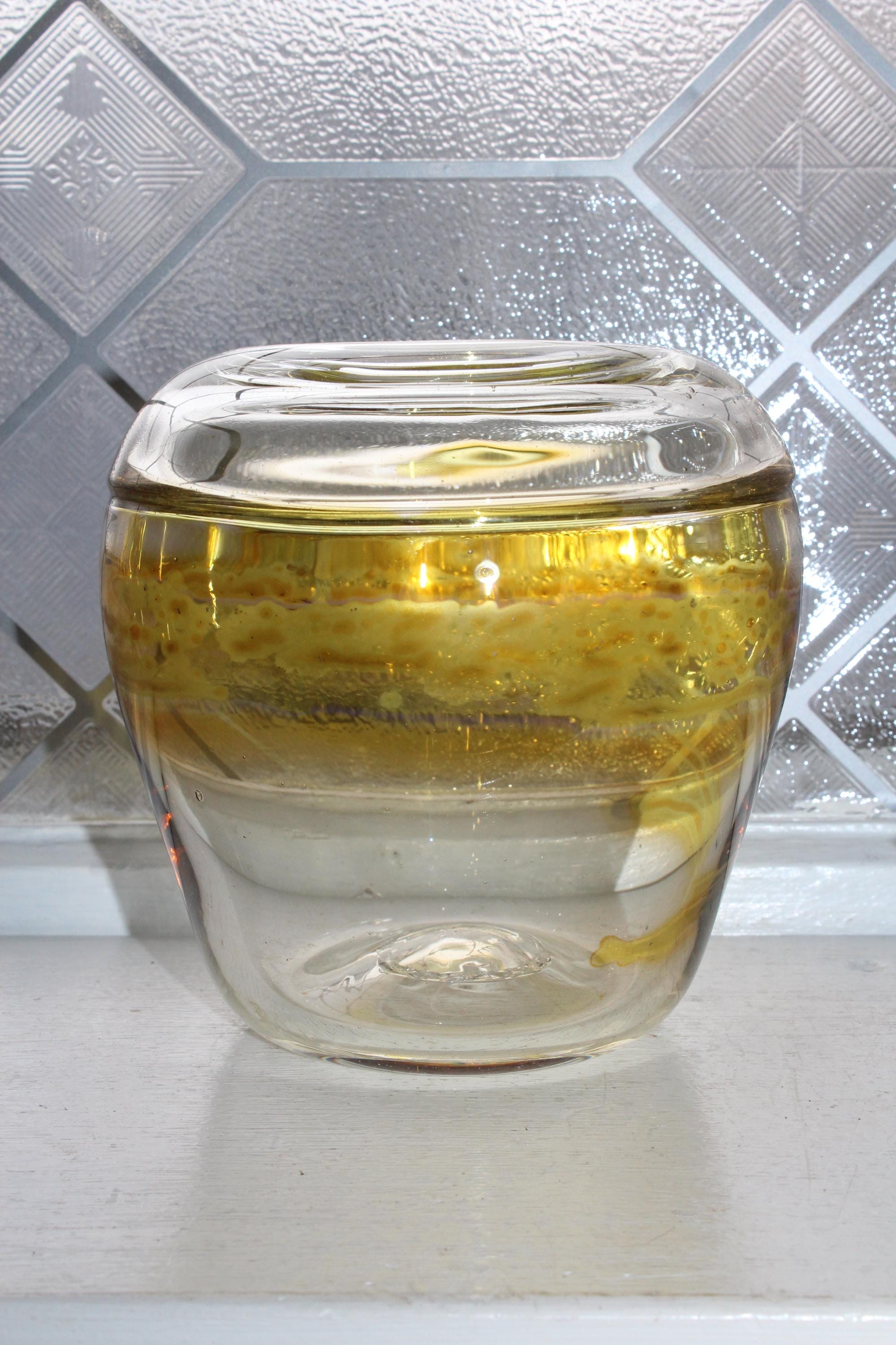 Vintage studio art glass clear vase with yellow stripe/swirl, signed by Chuck Donnelly 1987, in excellent condition. It measures 4 3/4" high and has no chips or cracks, perfect for display. Enjoy!