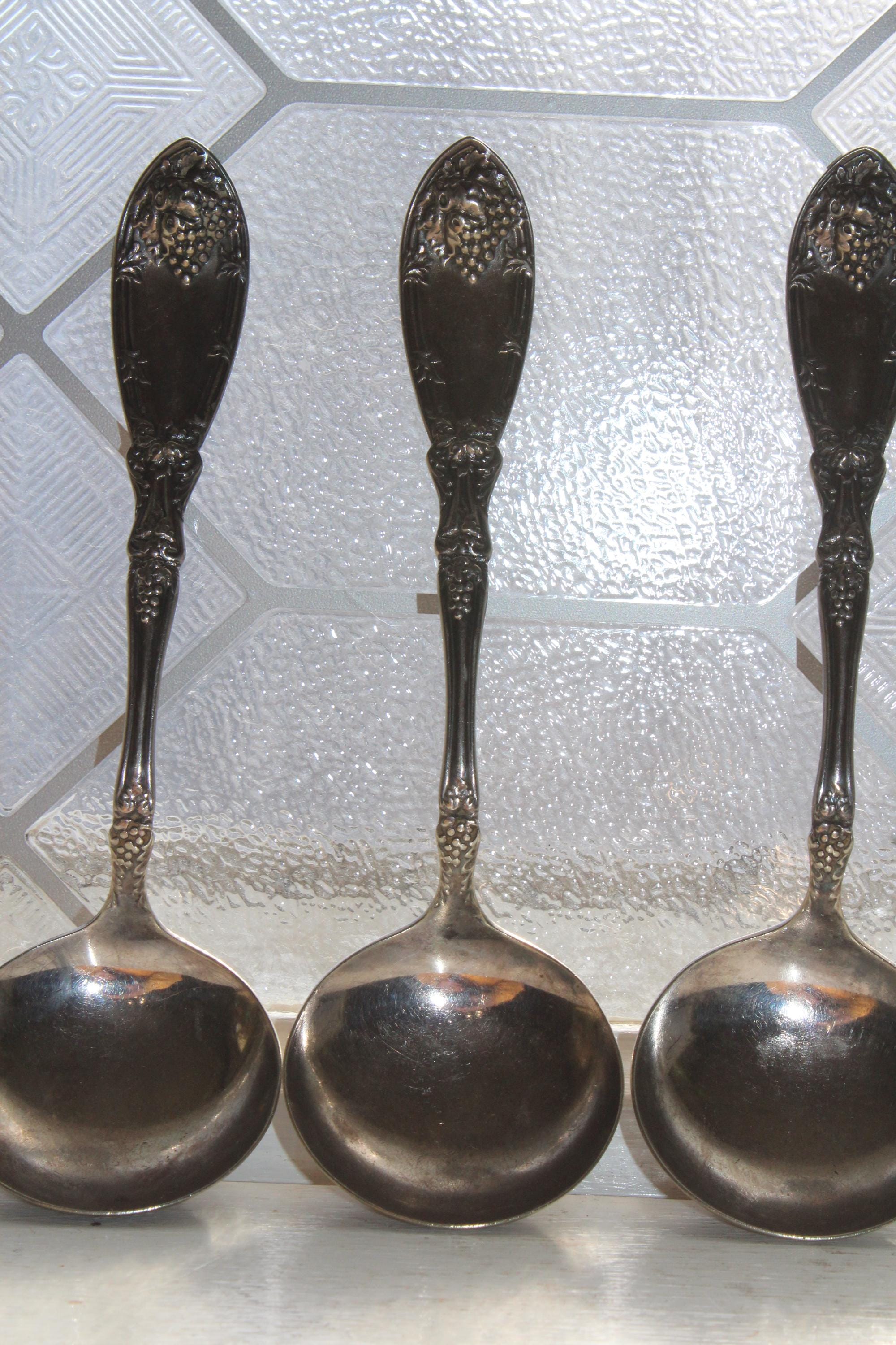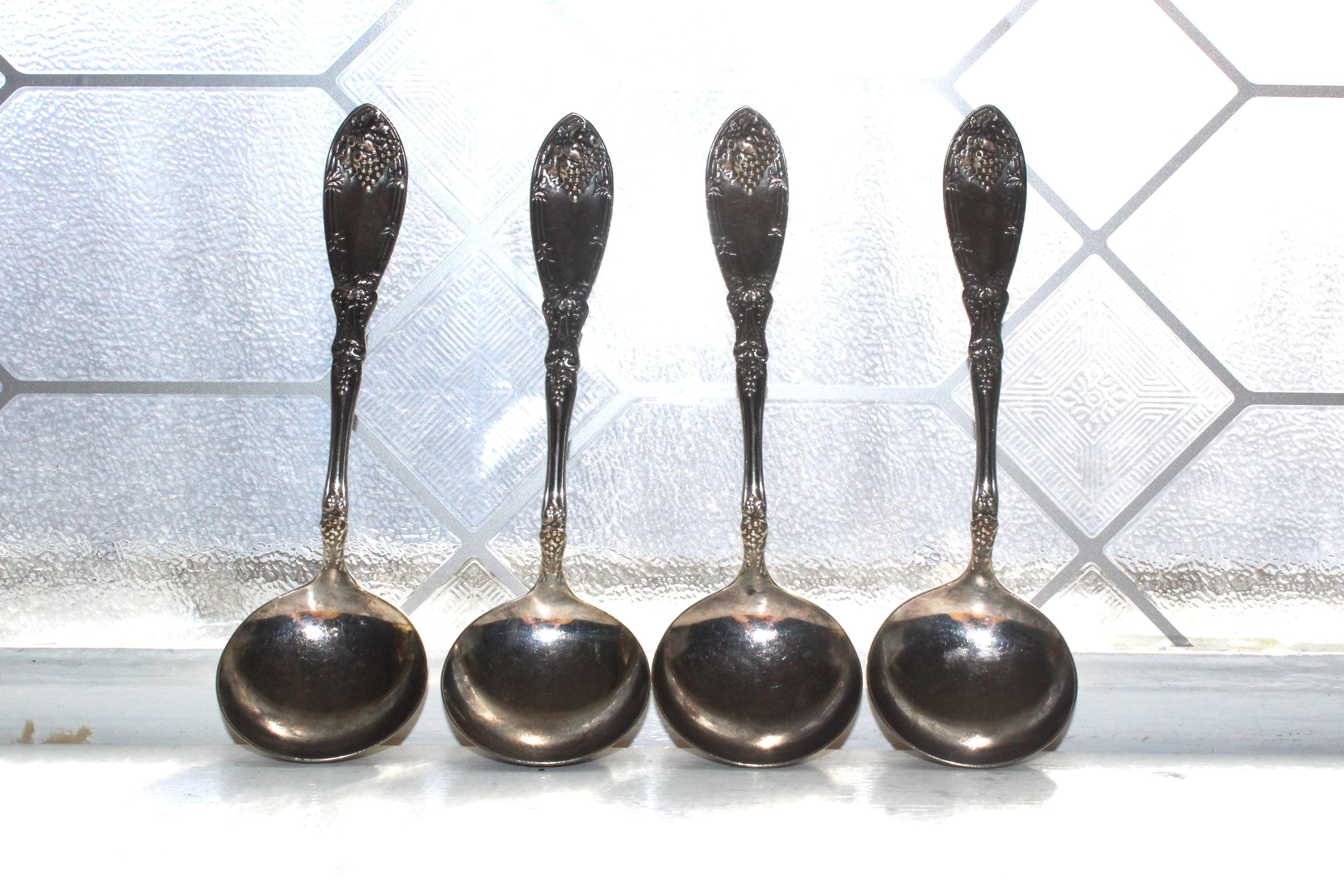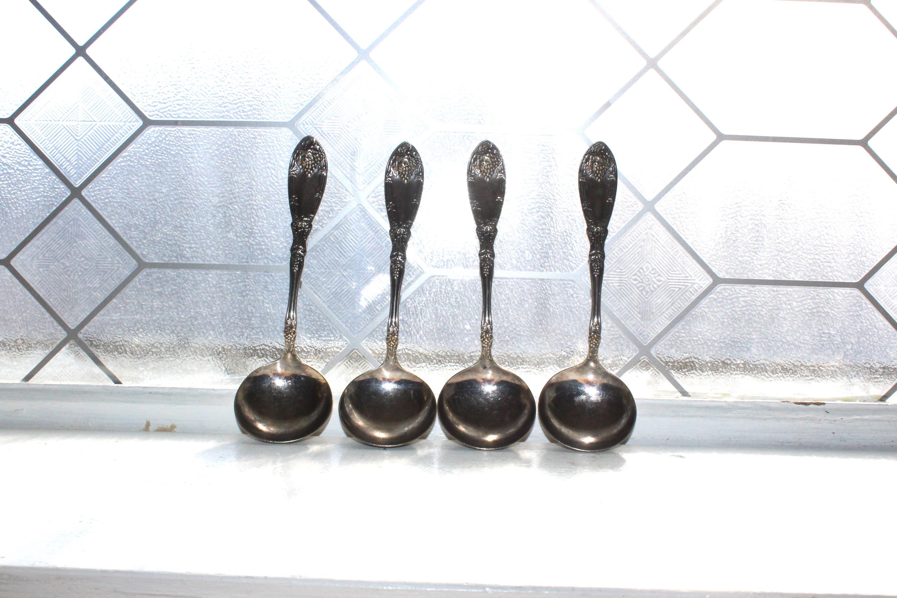 4 antique 1881 Rogers silverplate round bowl cream soup spoons. They are 6 1/4" long and good for use or display. Enjoy!
