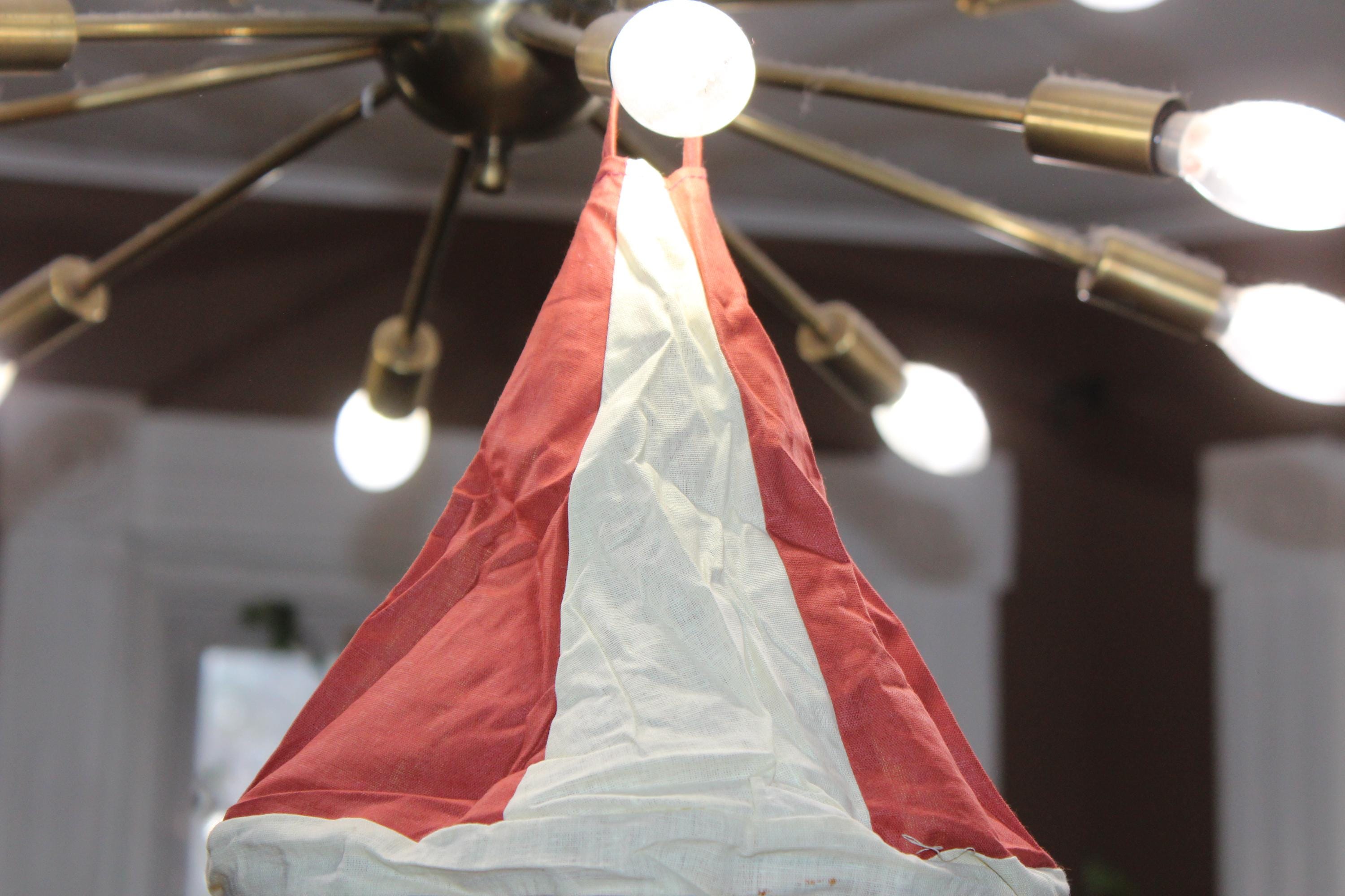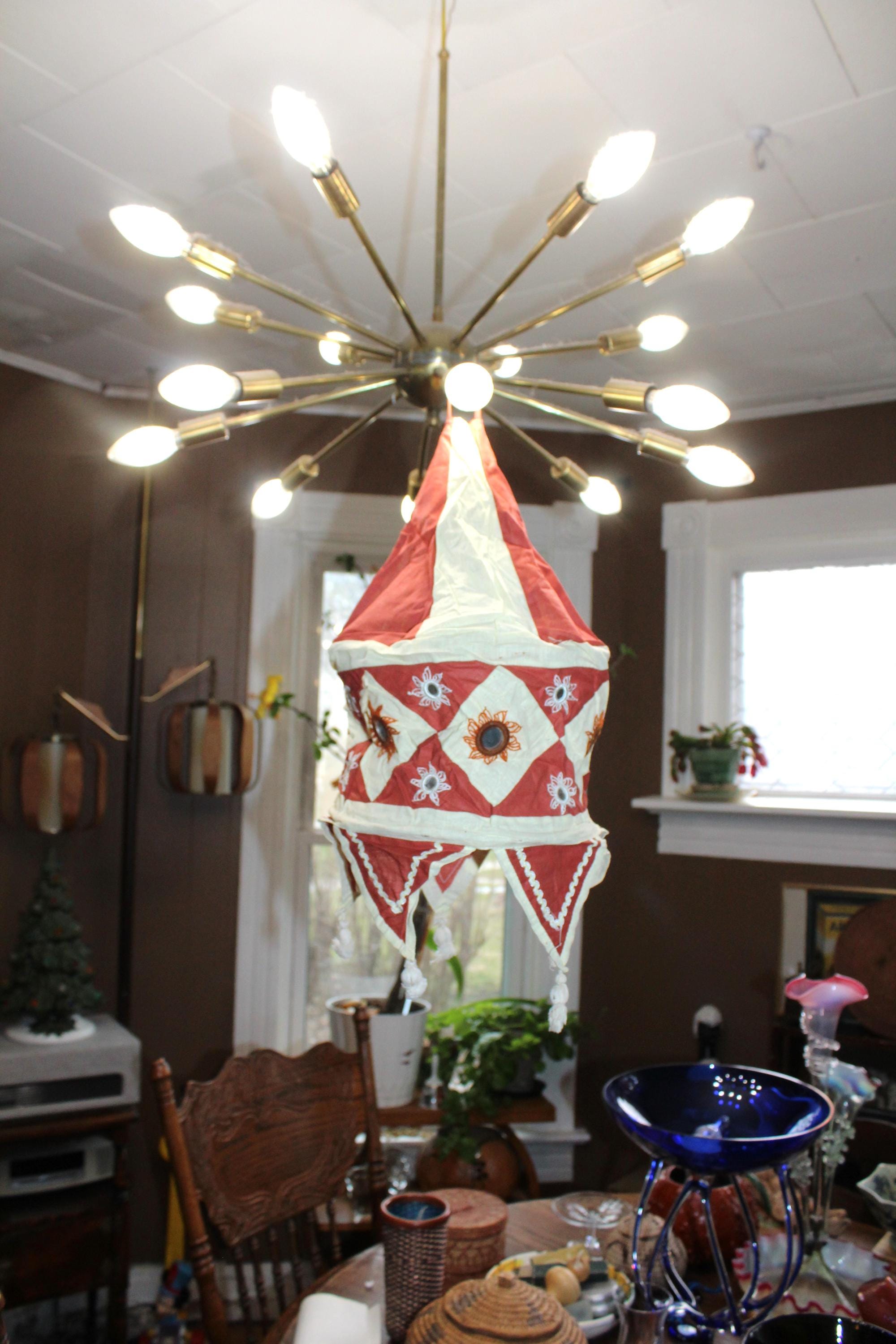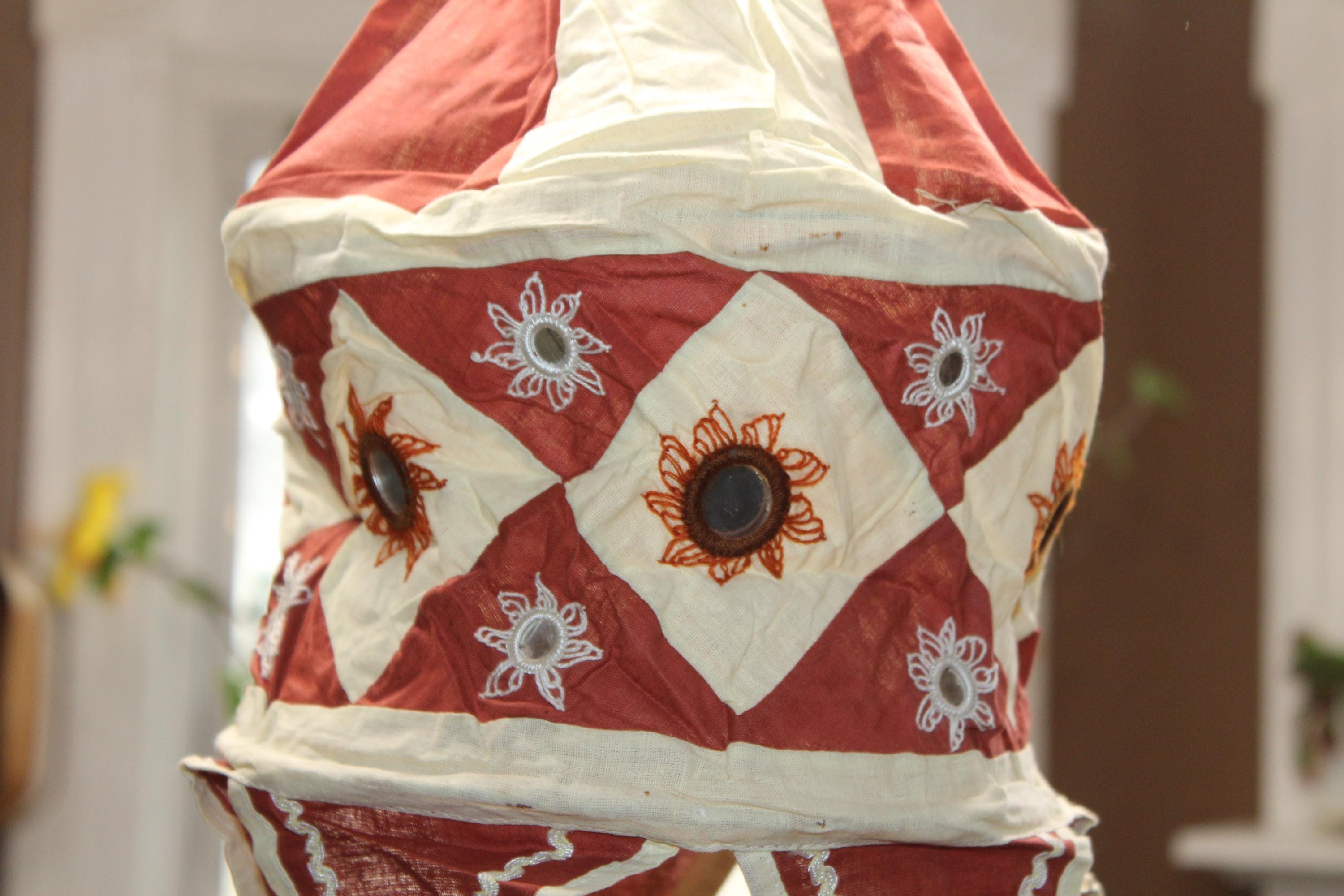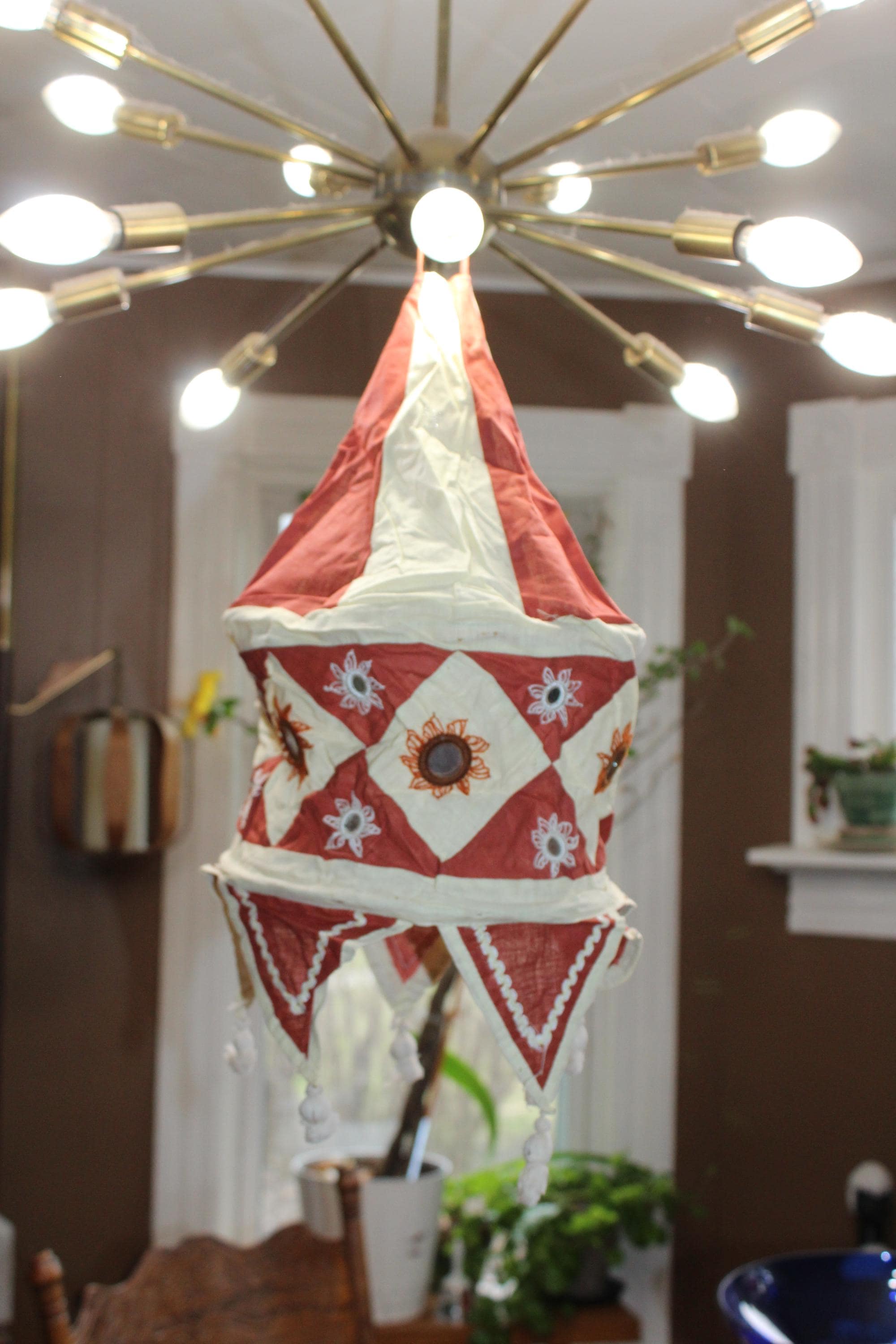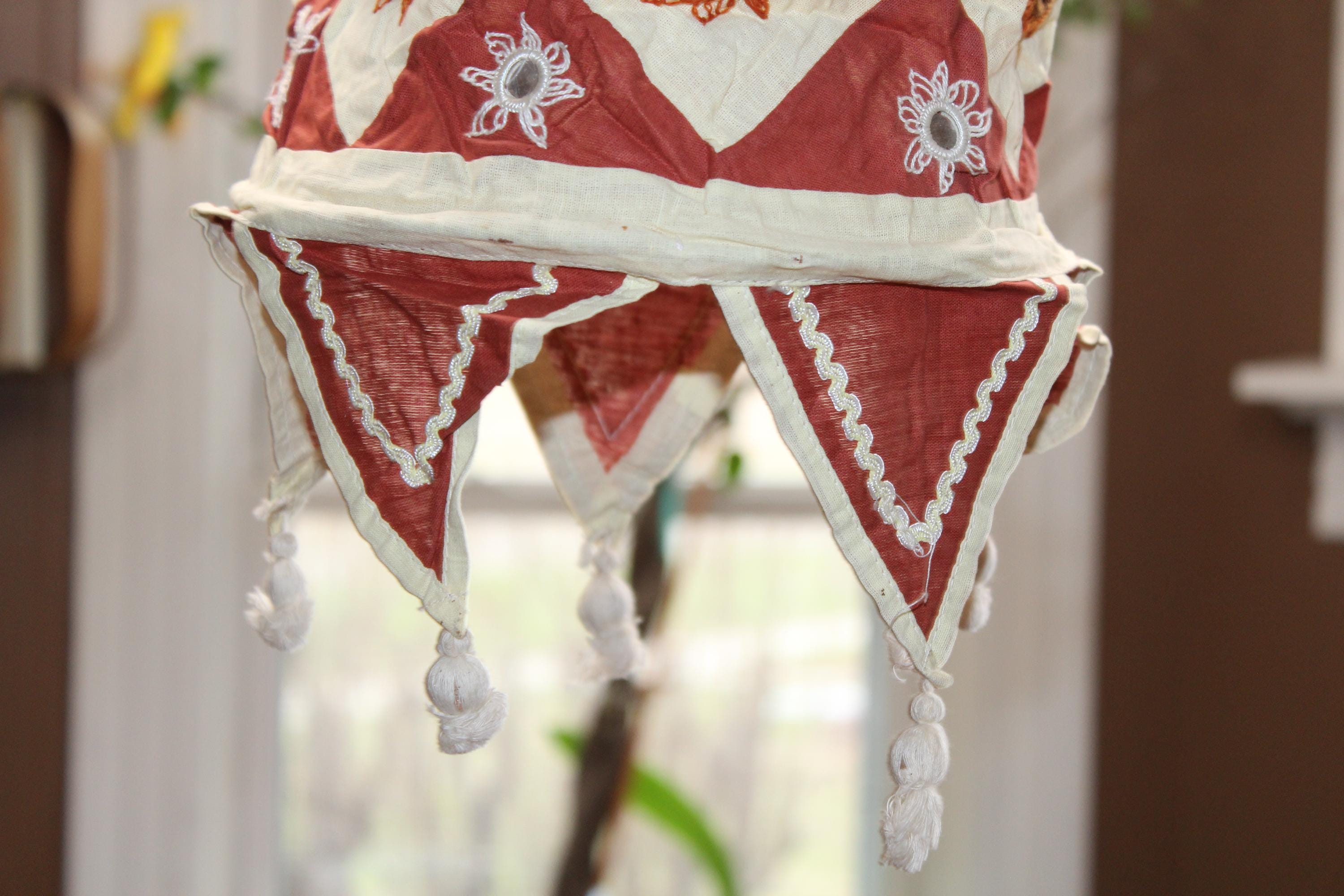 This is a vintage handmade Indian fabric lantern in red and white with round mirror tiles. The colors are bright and vibrant, and it measures 20" high x 8" wide. Collapsible for storage. It's in very good condition and displays well. Enjoy!