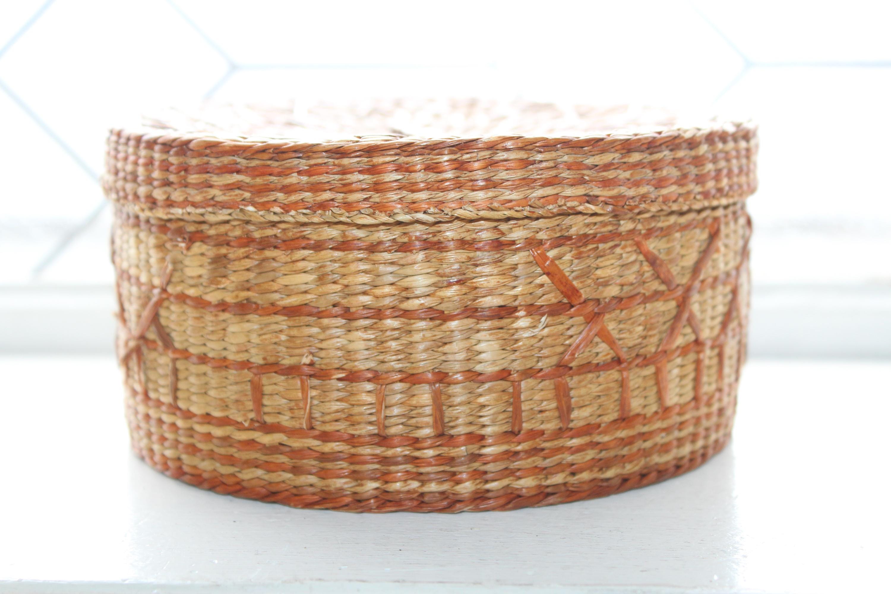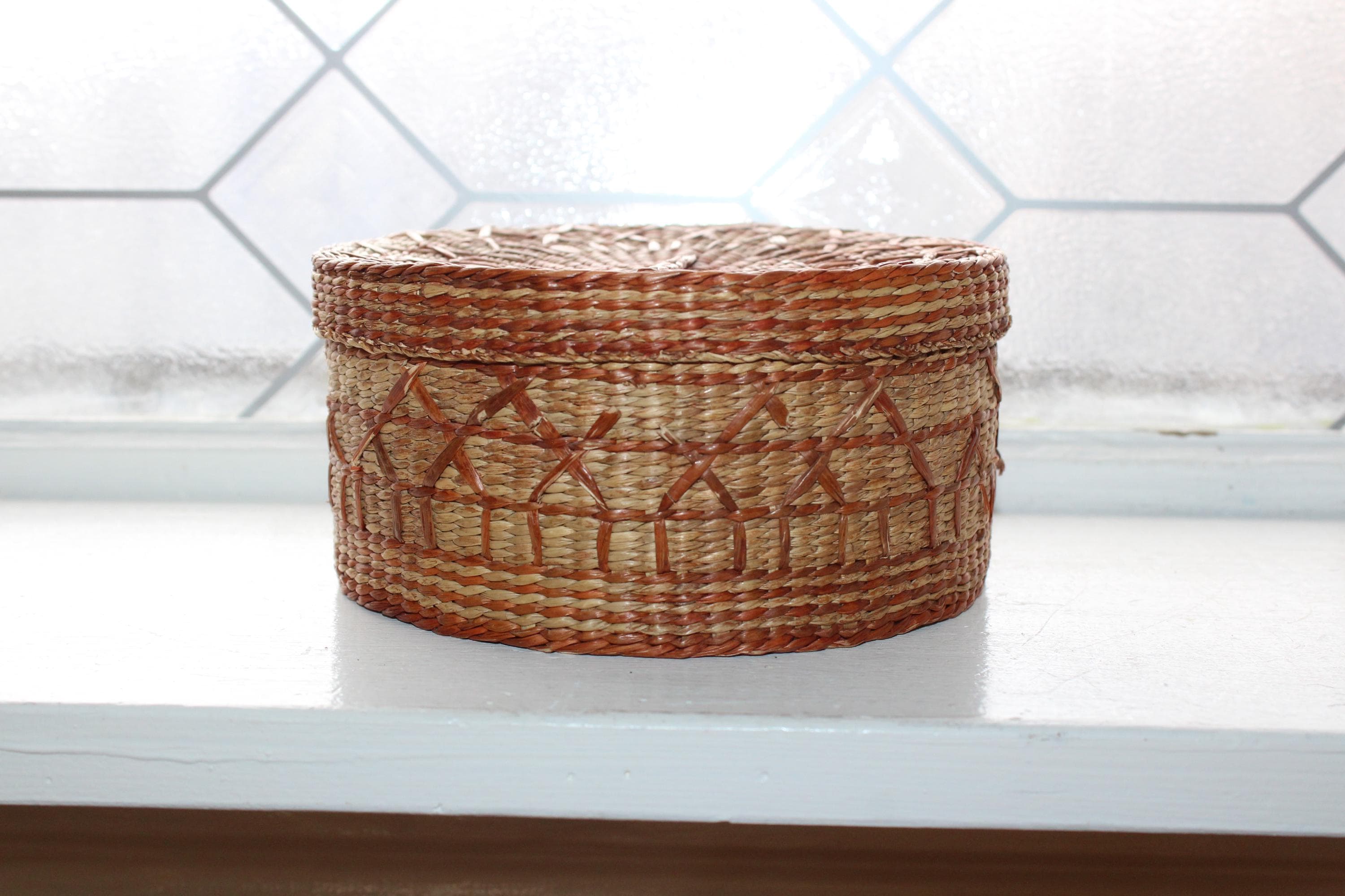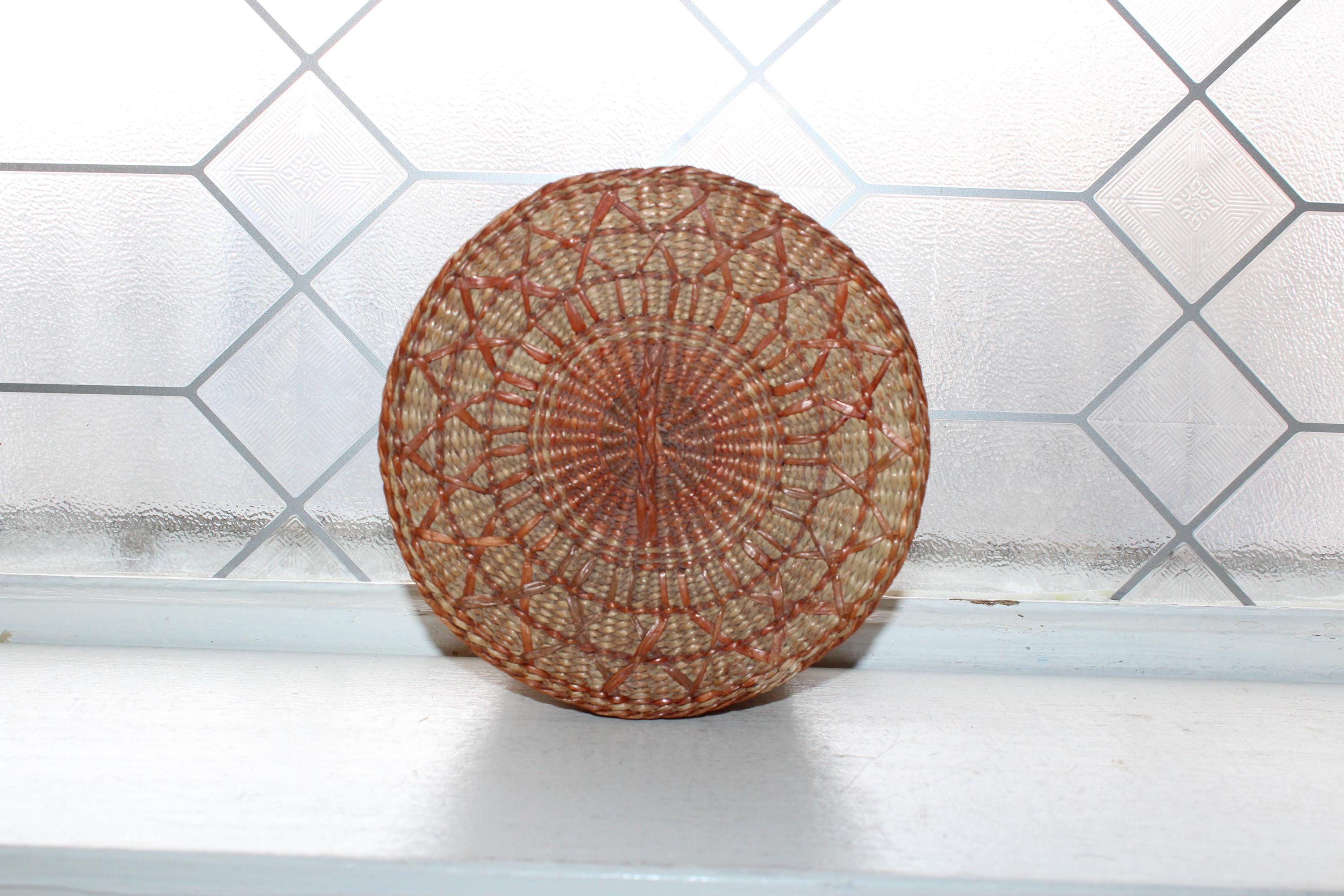 This is a vintage handwoven sweet grass basket with lid. It measures 6" wide x 3". Condition as shown in photos, the lid fits nicely, great for use or display. Enjoy!