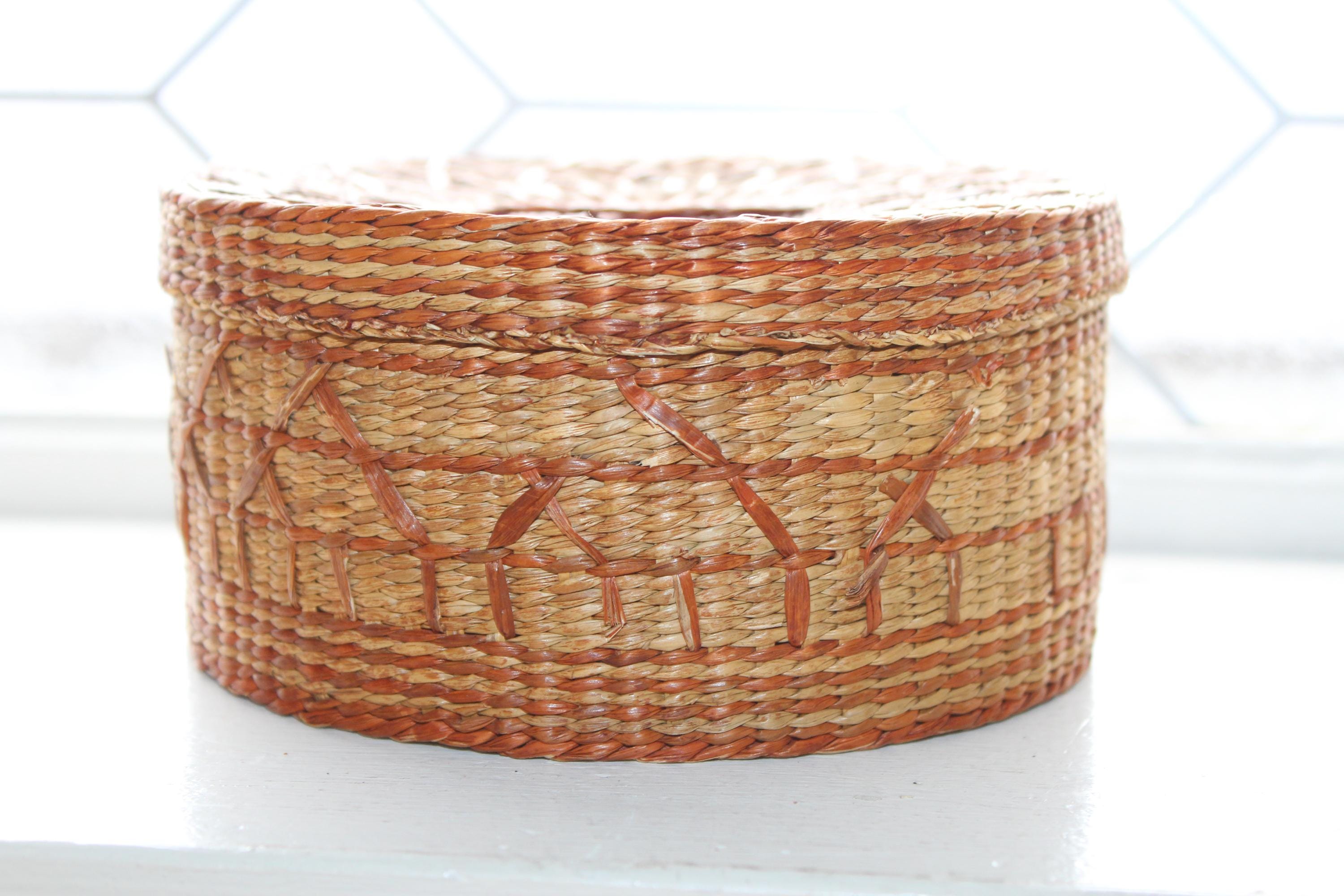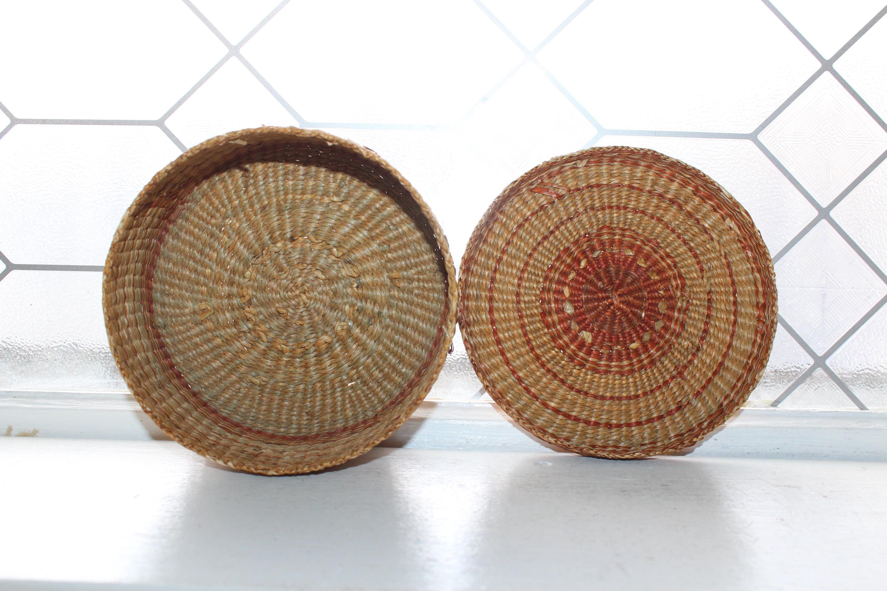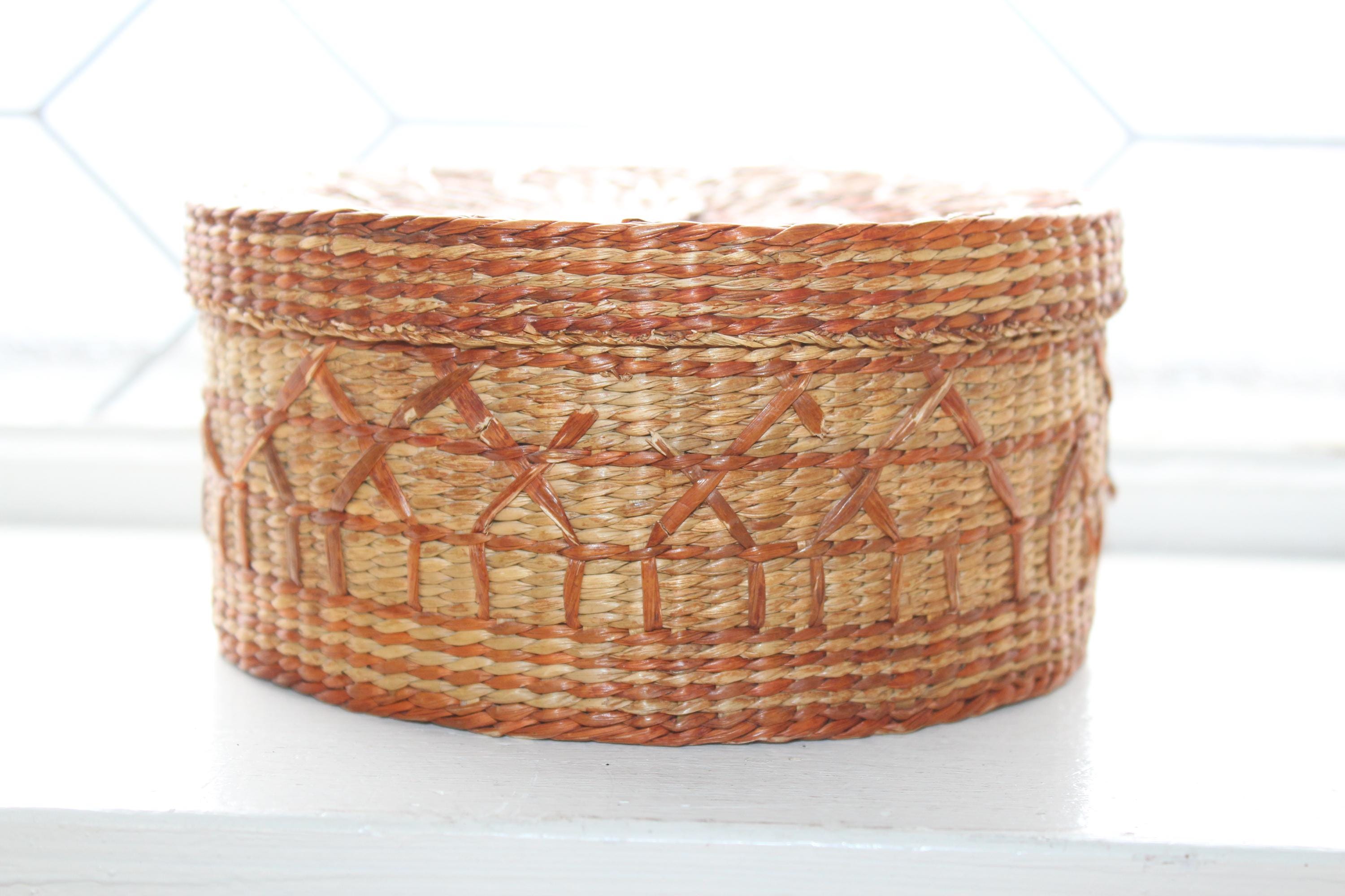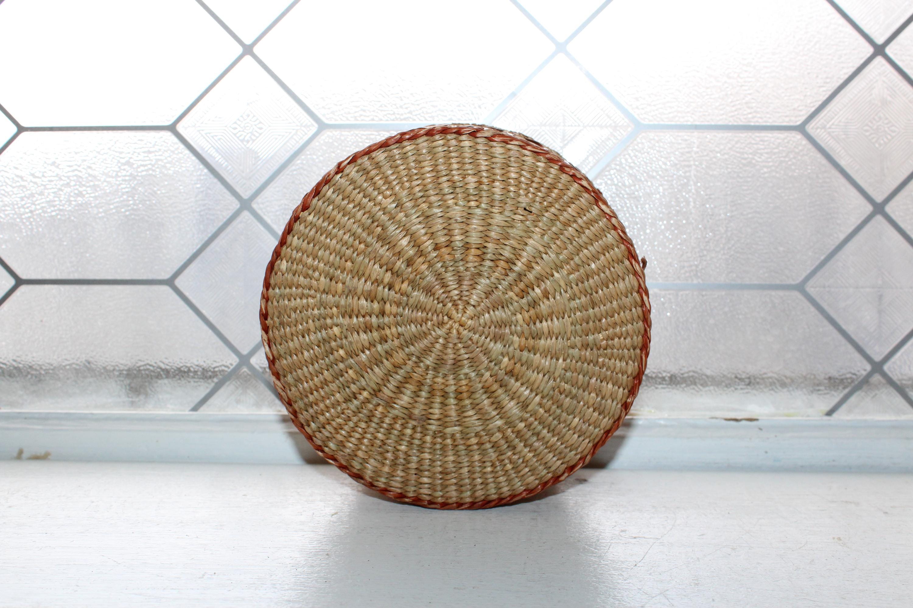 This is a vintage handwoven sweet grass basket with lid. It measures 6" wide x 3". Condition as shown in photos, the lid fits nicely, great for use or display. Enjoy!